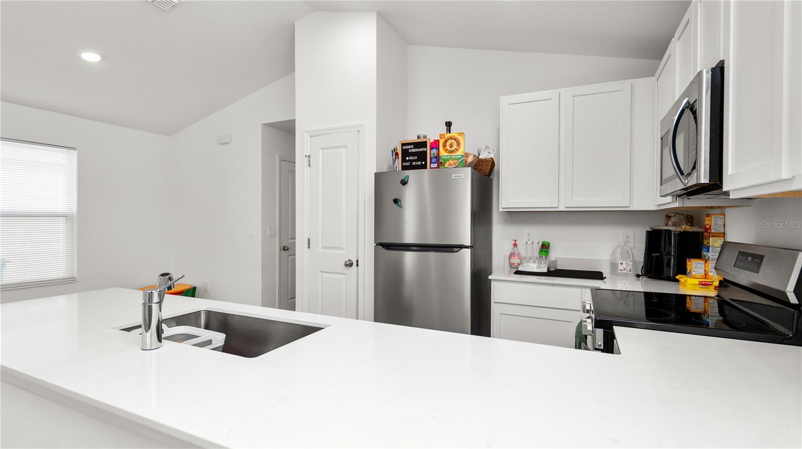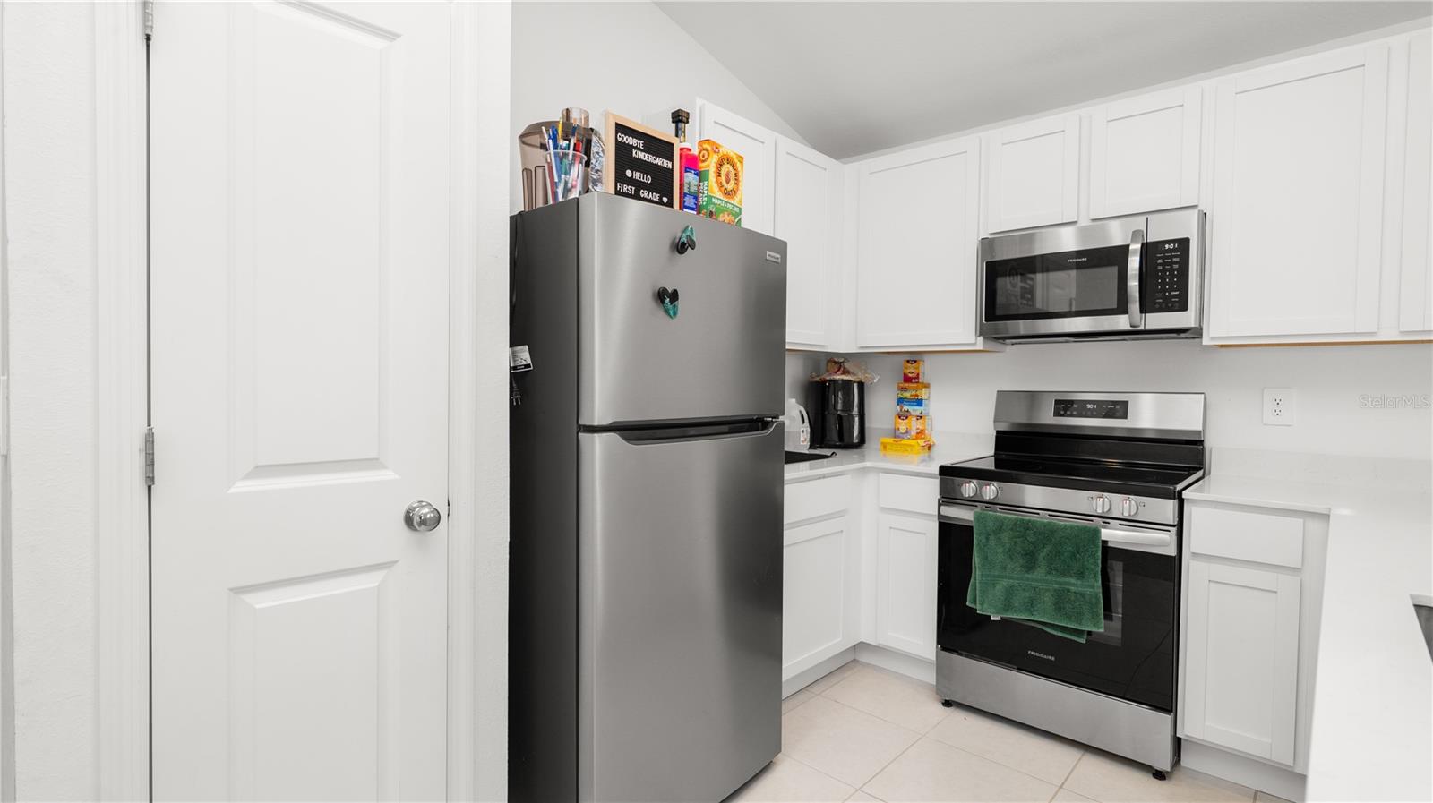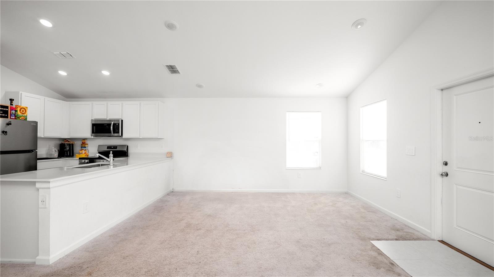 Welcome to this inviting 3-bedroom, 2-bathroom home located in a quiet, well-kept Winter Haven community. The interior showcases a bright, open-concept layout with neutral finishes and clean lines that create a warm, modern feel throughout the main living areas. The kitchen is thoughtfully designed with stainless steel appliances, contemporary cabinetry, sleek countertops, and a functional layout that opens directly to the living and dining spaces—ideal for entertaining or everyday living. Large windows allow for abundant natural light and the vaulted ceilings and recessed lighting give that open feeling. The primary suite offers a comfortable retreat, featuring a private en-suite bath with modern fixtures and finishes, while the additional bedrooms are well-sized and versatile for guests, work-from-home needs, or hobbies. The home comes ready with blinds and a washer and dryer included for convenience. Outside, enjoy a low-maintenance yard and a neighborhood with sidewalks and a peaceful residential setting, perfect for evening walks or relaxed outdoor living. Conveniently located near shopping, dining, and local amenities—and close to South Pointe Elementary School—this move-in-ready home blends modern finishes, functional design, and a desirable location.