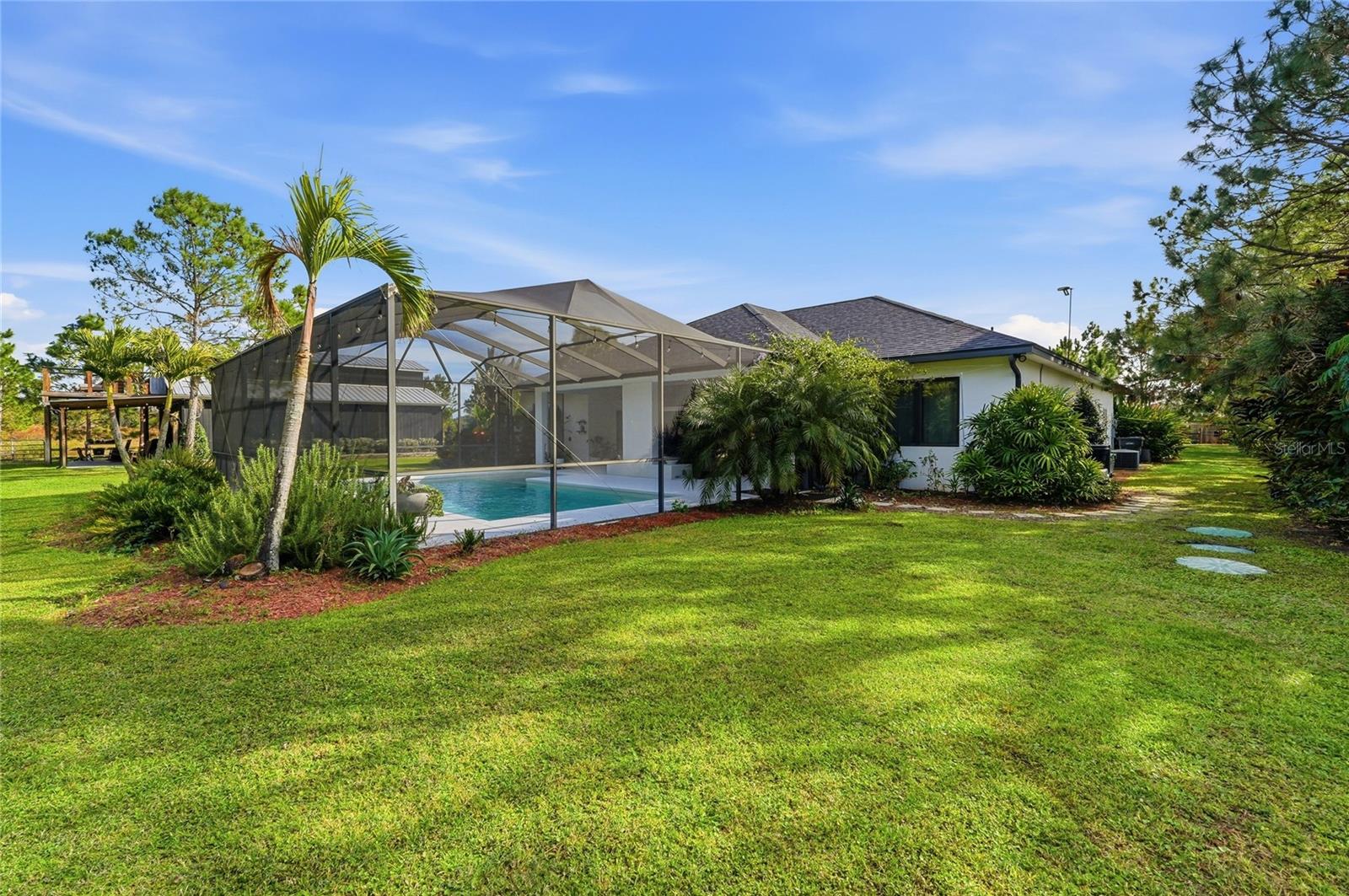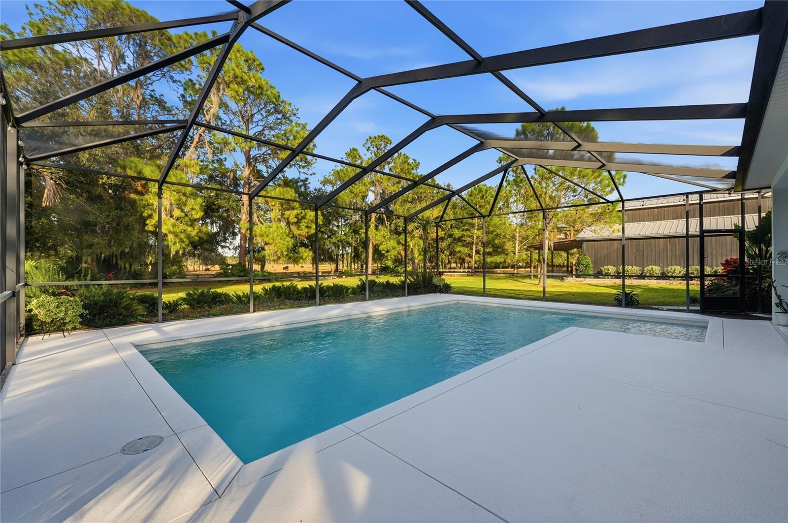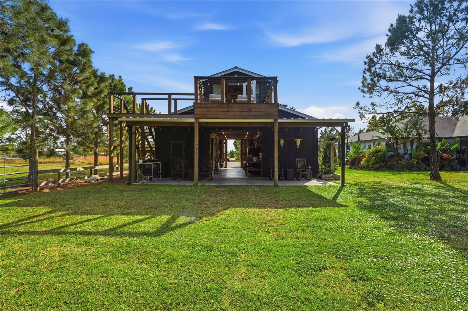 Tucked behind a private gated entry, this extraordinary 30+ acre estate delivers an exceptional blend of luxury, privacy, and purposeful design—perfectly suited for an equestrian farm, cattle ranch, or refined country retreat with no HOA. The property features a custom-built pool home, a 30'x40' barn with a furnished apartment and a detached climate-controlled building, all thoughtfully designed to provide flexible options for multi-generational living, guest accommodations, or income potential within a refined yet highly functional setting. The 2014 custom-built residence offers an open layout with a great room, dining area, spacious kitchen, split bedrooms, primary suite with an office, expansive laundry room, oversized lanai and a 2-car garage. The great room is a stunning focal point, highlighted by an electric fireplace with heat, set against a striking bamboo and tile feature wall with integrated lighting and outlets. Triple stacking sliding glass doors with transom windows flood the home with natural light while showcasing sweeping views of the pool and pasture. The well-appointed kitchen flows seamlessly into the great room and dining area and features custom cabinetry, quartz counters, stainless appliances, double ovens, walk-in pantry and a generous island with gas cooktop and seating for four. The dining area comfortably accommodates eight and opens to the lanai by an additional set of sliders, creating an effortless indoor-outdoor connection for entertaining. The primary suite is a luxurious retreat offering an office space with an 8-foot opening—easy to enclose for privacy. The suite is completed by 2 spacious walk-in closets with built-ins and a spa-inspired bath with a granite counter, dual sinks, a soaking tub, walk-in shower, and private water closet. Secondary bedrooms offer ample space and versatility, including built-in storage and a thoughtfully designed bunk room with integrated study and play areas and a walk-in safe closet. Step outside to the screen-enclosed lanai, where resort-style living takes center stage. Enjoy a salt-filtered, heated pool, an outdoor kitchen with a granite counter, grill, sink, cooktop, fridge, outdoor shower and a gas fireplace—perfect for year-round enjoyment. A backyard fire pit adds an additional gathering space under the stars. The estate continues with an impressive barn offering flexible use for equipment, hobbies, or easy conversion to horse stalls and a tack room, complete with an air-conditioned office. Above the barn, a beautifully finished one-bedroom apartment features a living room, full kitchen, stackable washer and dryer and a private deck overlooking the serene pasture—ideal for guests. The 14'x24' detached, climate-controlled building features a half bath and internet connectivity, making it ideal for a private studio, home office or she-shed. The land includes a cross-fenced pasture with a livestock pen, persimmon trees, greenhouse with electricity, RV electrical hookup and two chicken coops. Additional highlights; a new roof (2024), paved driveway, water softener, irrigation system, two tankless gas water heaters, generator connection and foam insulated panels for energy efficiency. Set in a tranquil country setting yet just 10 minutes from shopping, dining, schools and Bartow Executive Airport and centrally located between Tampa and Orlando, this remarkable estate offers the freedom to ride ATVs, store recreational toys and enjoy wide-open acreage without compromise.