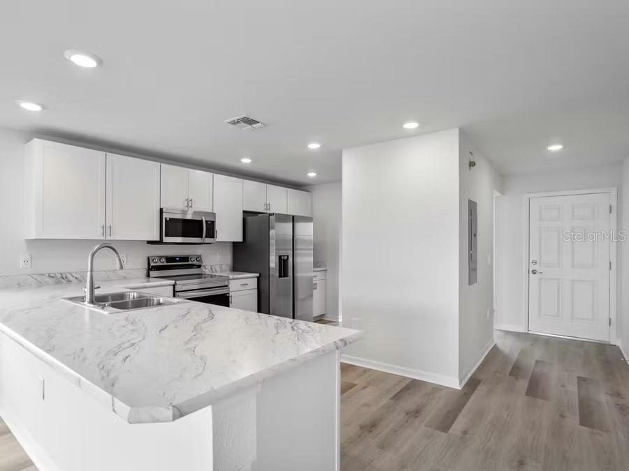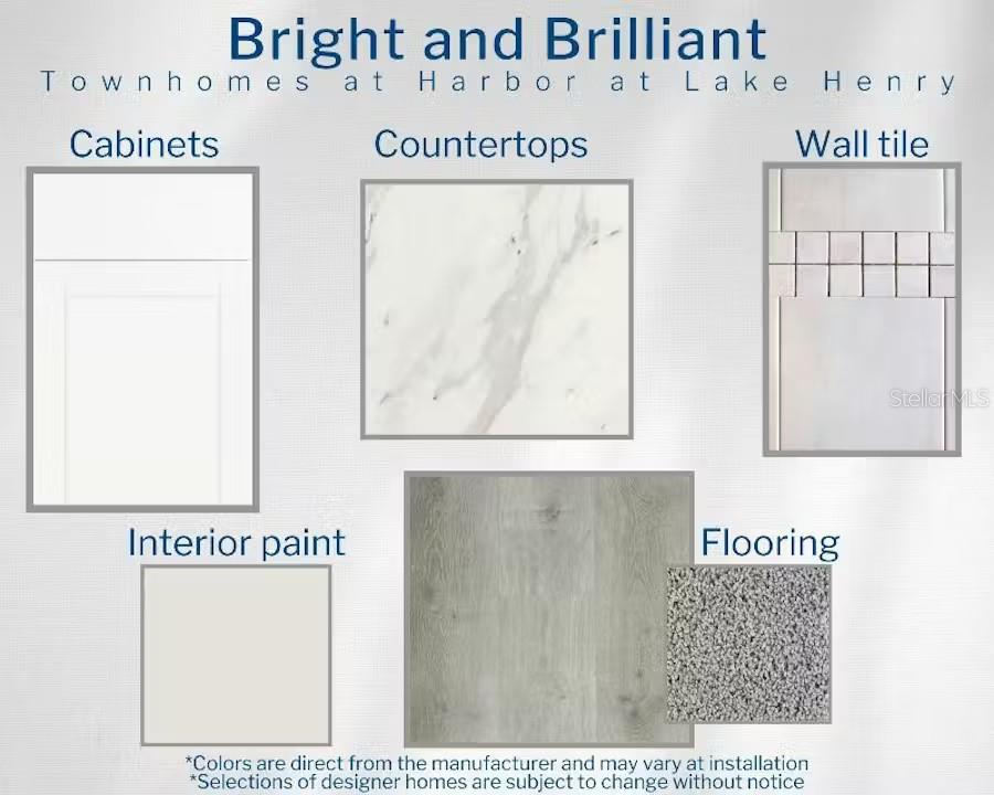 Under Construction. 2-story new construction townhome with 1,604 square feet, 3 bedrooms, and a covered lanai, located in the brand-new Harbor of Lake Henry community. Downstairs, enjoy an open layout(optional first floor layout with den)and a gourmet kitchen with, shaker-style wood cabinets, Samsung stainless steel appliances, including a pantry. The spacious gathering room opens to your covered lanai. The entire lower level and upstairs baths are finished with luxury vinyl plank flooring, with stain-resistant carpet in the bedrooms. Upstairs, you'll find three spacious bedrooms including your owner's suite complete with a walk-in wardrobe, linen closet, and a private en-suite bath with dual vanities and a tiled shower. Additional features for your convenience include a half bath downstairs, upstairs hall bath for the secondary bedrooms, energy-efficient insulation and windows, and a full builder warranty.