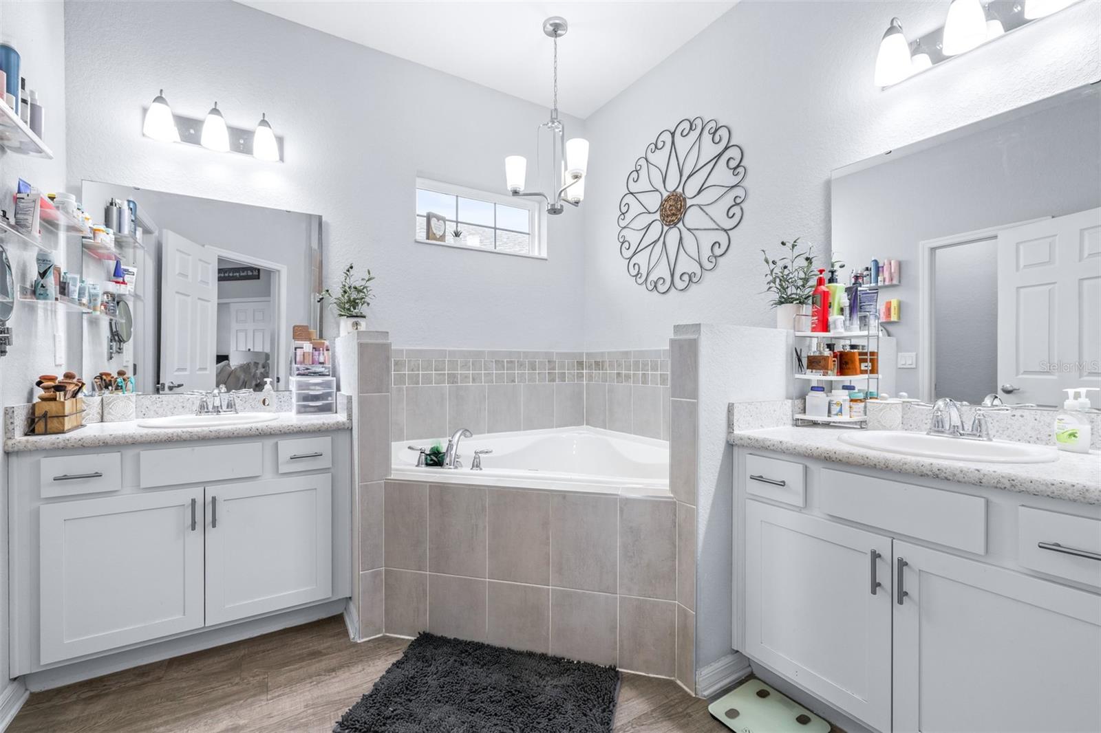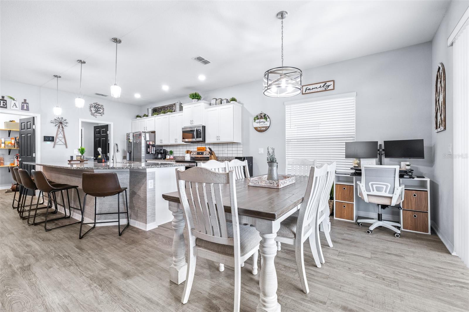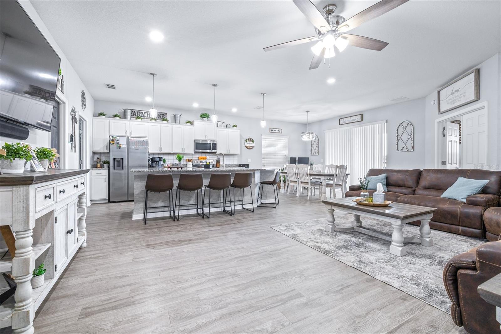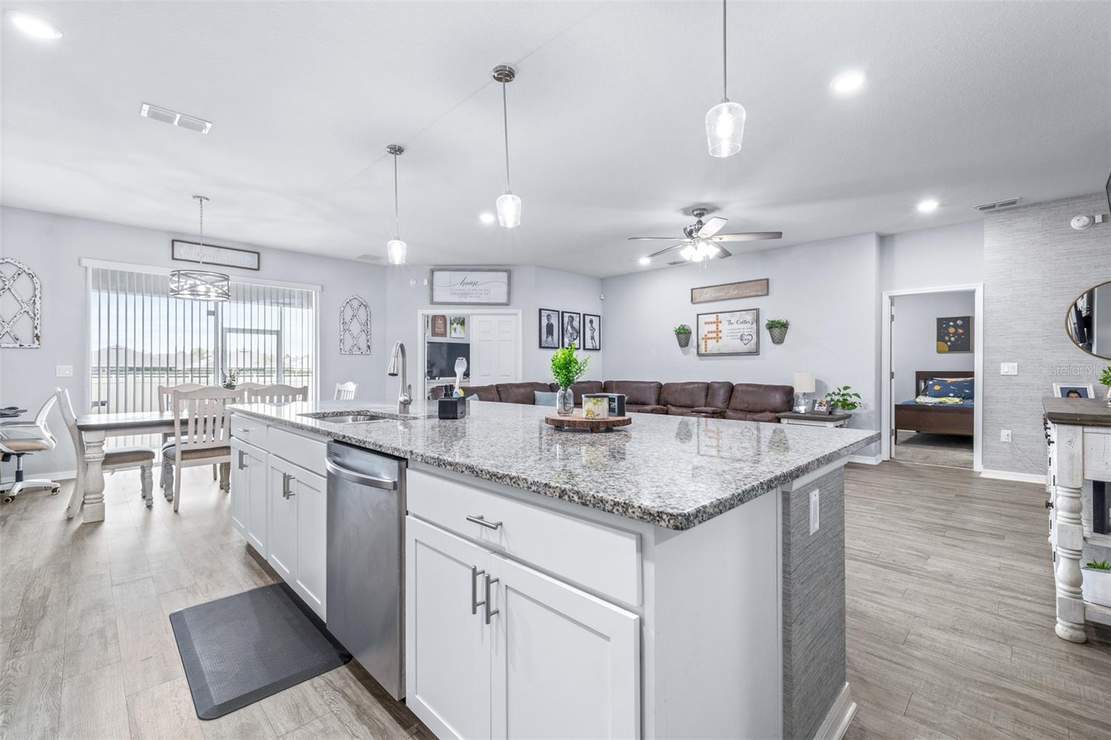 This beautifully maintained 2,049 sq ft home is located in the desirable Villamar community. The open-concept floor plan features a spacious gathering room that flows into the dining area and well-appointed kitchen complete with crown molding, granite countertops, stainless steel appliances, shaker-style cabinets, breakfast bar, and walk-in pantry. The private owner’s suite offers a tray ceiling, large walk-in closet, and spa-like bath with dual vanities, garden tub, tiled shower, and private water closet. Luxury vinyl plank flooring enhances the main living areas, with stain-resistant carpet in the bedrooms. Additional features include a Jack-and-Jill bath, guest powder room, drop zone at garage entry, faux wood blinds, built-in pest control, architectural shingles, and energy-efficient upgrades including R-30 insulation and Low-E tinted windows. Enjoy outdoor living on the covered lanai overlooking beautifully maintained, Florida-friendly landscaping with irrigation. The community resort-style pool is perfect for relaxing in the Florida sun.