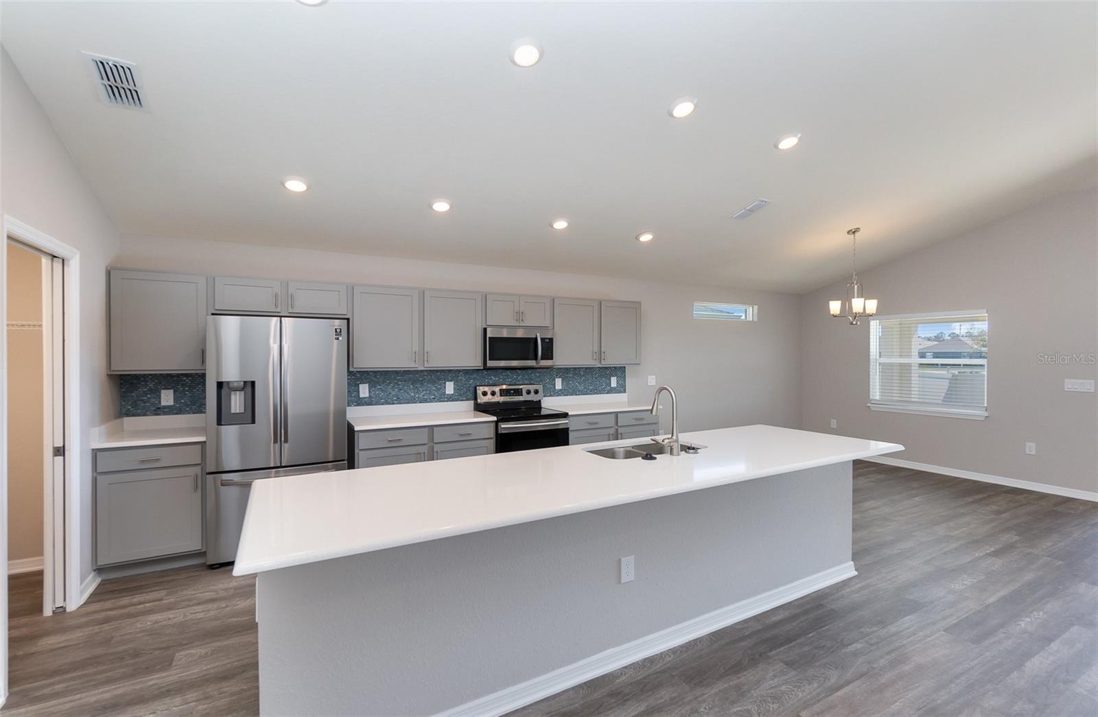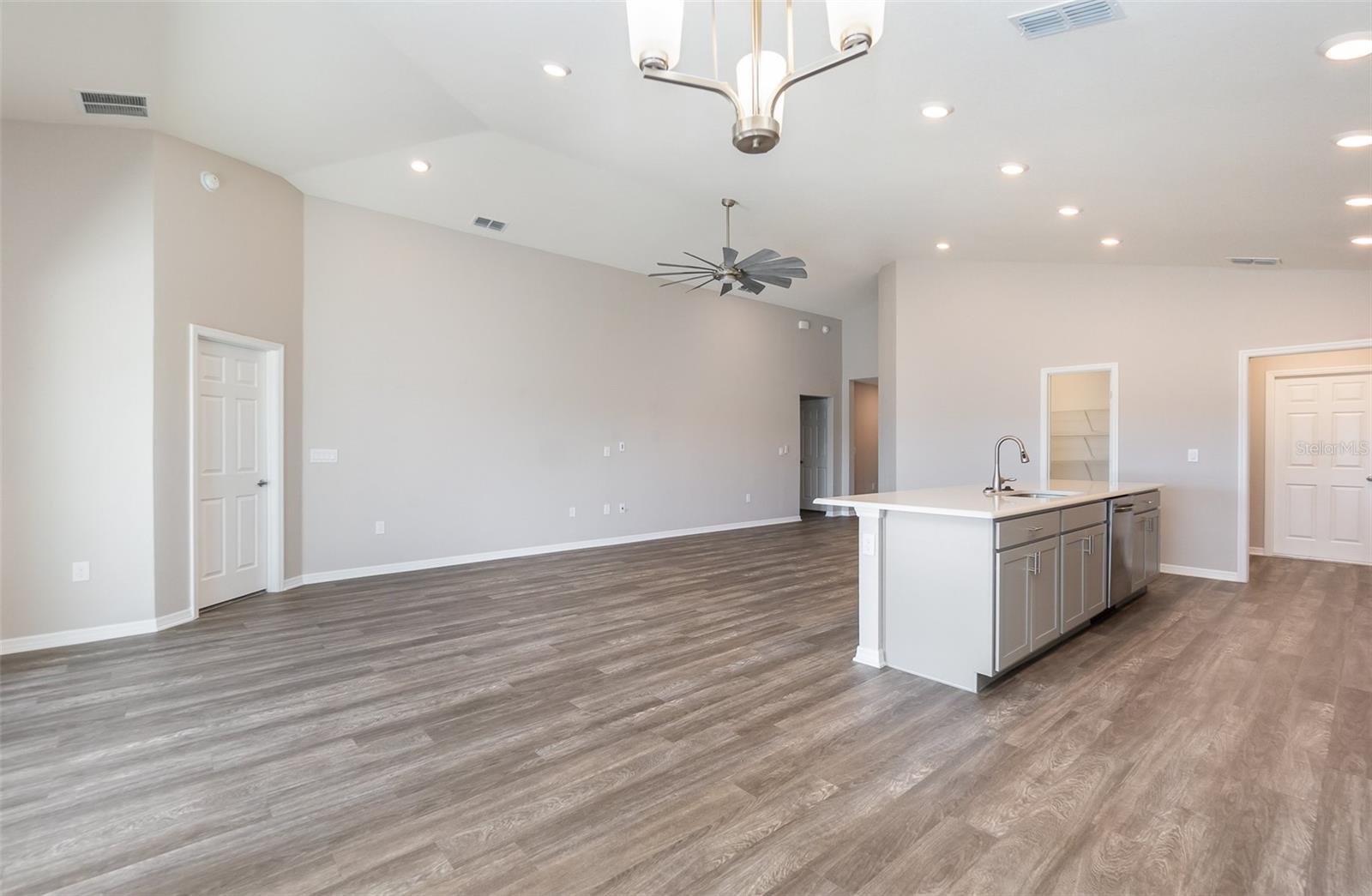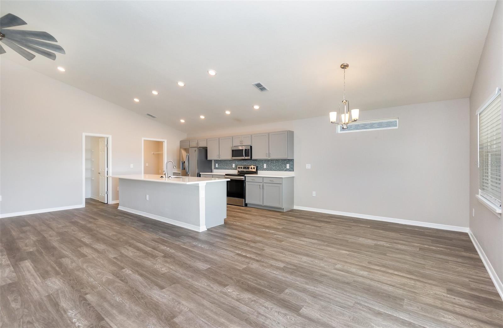Vaulted ceilings, a walk-in pantry, and a flex space perfect for an office or media room are just a few of the features that will impress you in this 3 bedroom/2 bathroom home. The open concept floor plan and large kitchen island ensure you can easily host the next get together. Outside, you can enjoy landscaping and a covered lanai or a short walk to the community pool, amenity center, and playground area. This move-in ready home is ready for you.