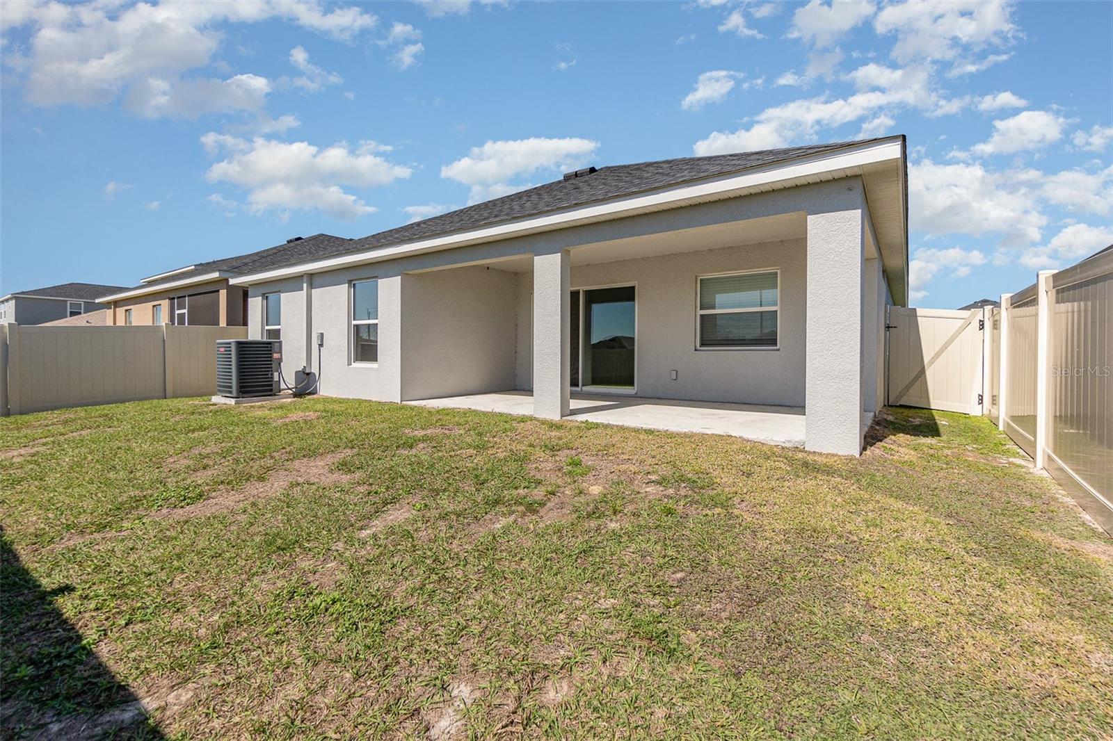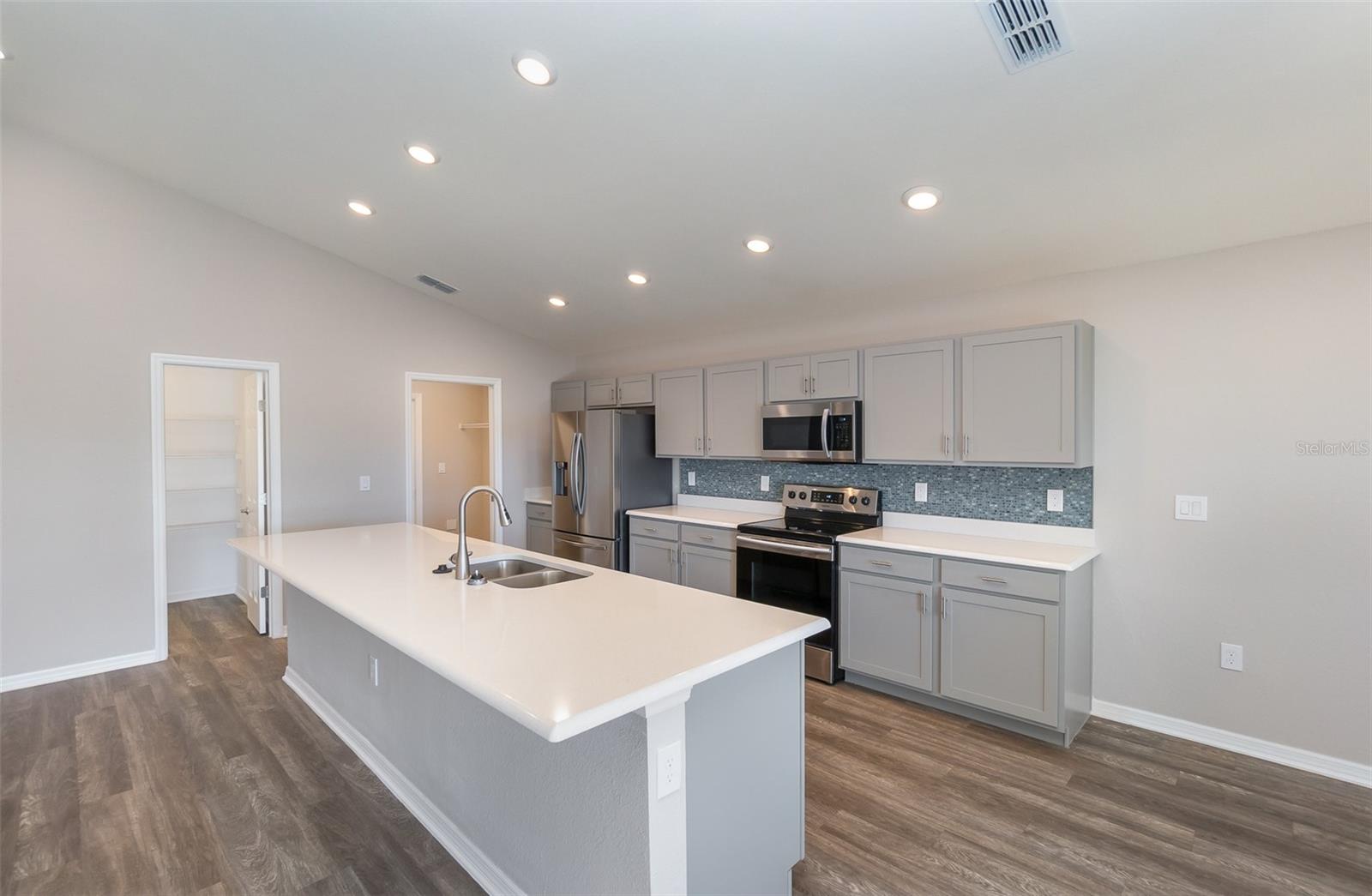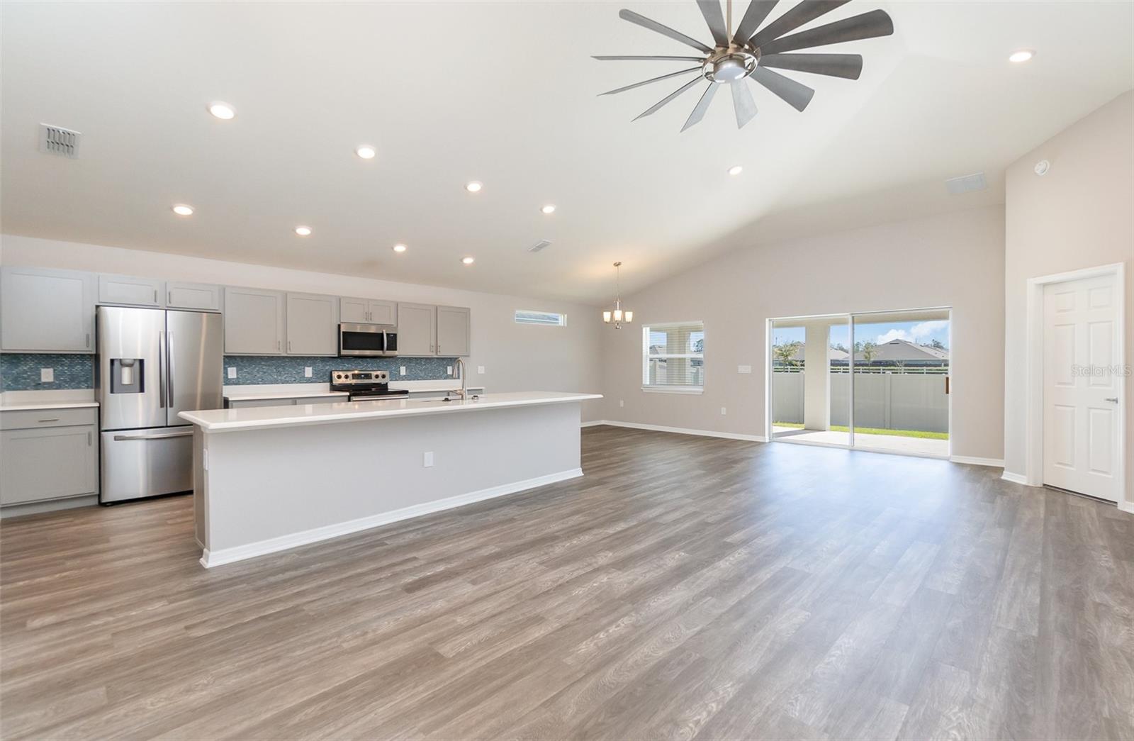 Vaulted ceilings, a walk-in pantry, and a flex space perfect for an office or media room are just a few of the features that will impress you in this 3 bedroom/2 bathroom home. The open concept floor plan and large kitchen island ensure you can easily host the next get together. Outside, you can enjoy landscaping and a covered lanai or a short walk to the community pool, amenity center, and playground area. This move-in ready home is ready for you.