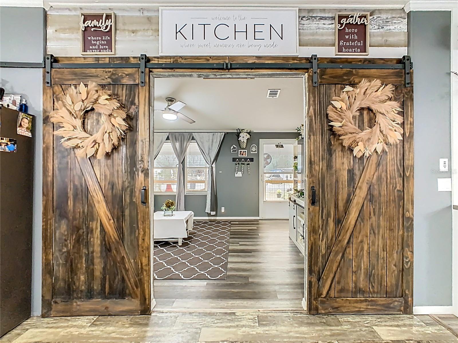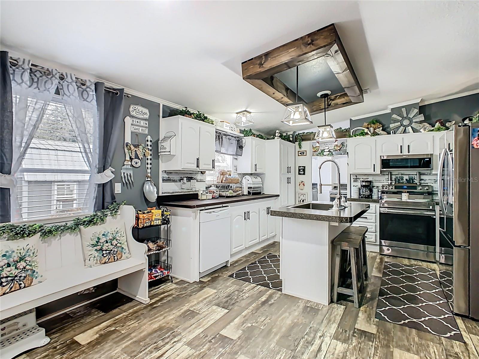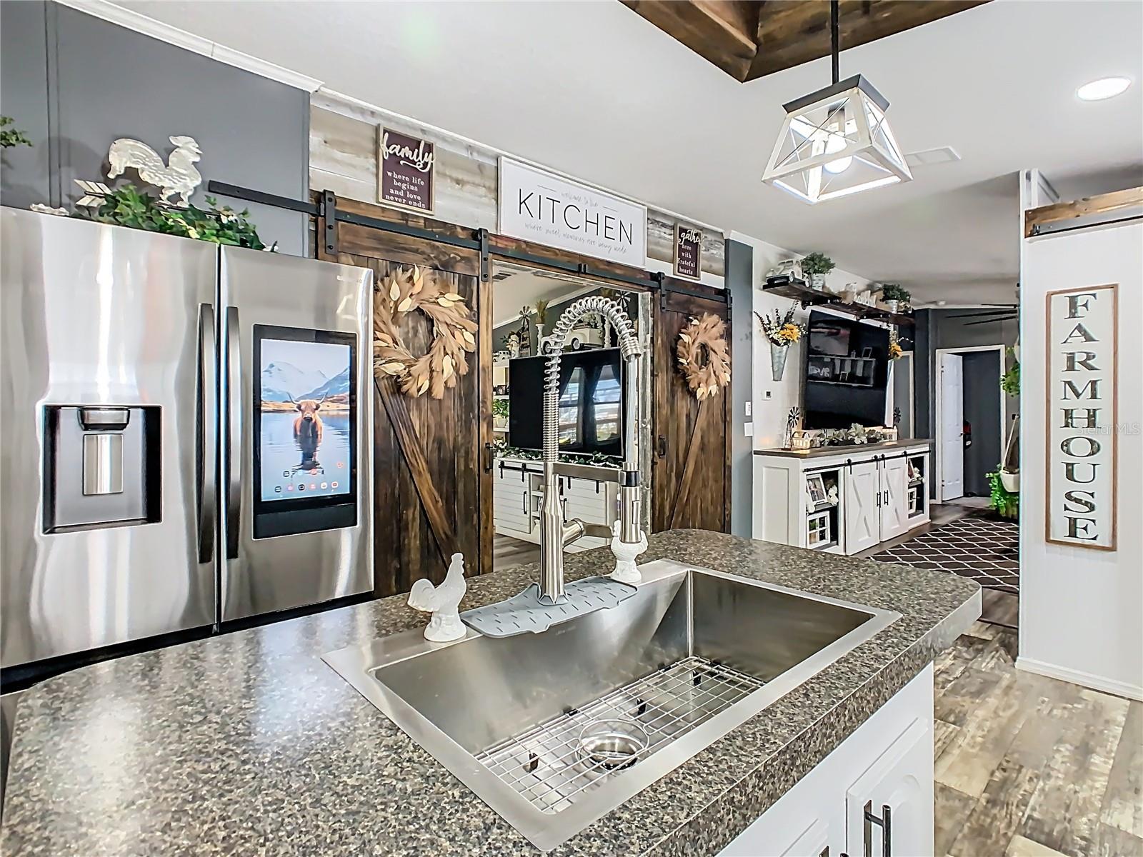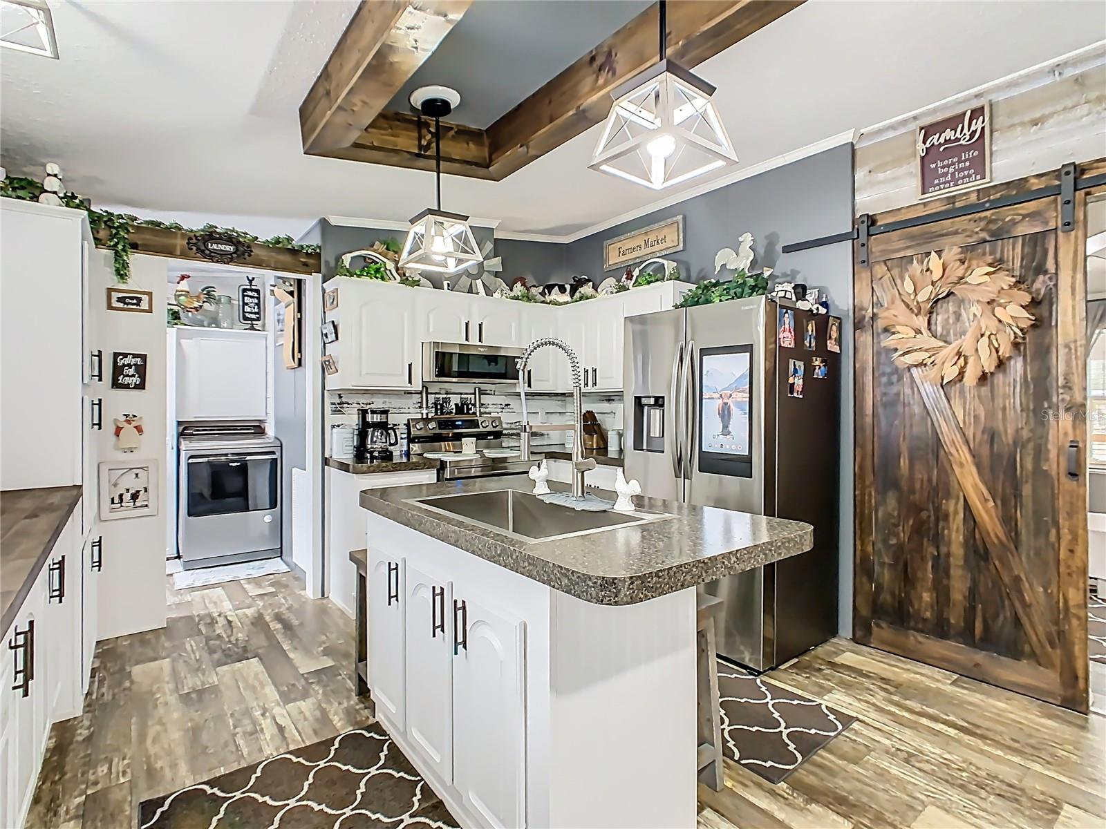 Stunning ranch modern transformation that will take your breath away! Welcome to this 2019 impeccably redesigned modern rustic 4 bed/2 bath retreat on fenced one-third acre lot on cul-de-sac with seamless indoor-outdoor entertaining. Homeownership pride from the front curb to the back fence! As you approach, you are greeted by a New sprawling 13’x46’ covered front porch with ample space for hosting gatherings while you enjoy the beautifully landscaped front yard with extended driveway that includes a tall RV cover. Step inside to the farmhouse chic living room that seamlessly flows through the sliding barn doors into the heart of the home, the custom designed kitchen, featuring wood beam tray ceiling with pendent lighting, white cabinets, butcher block counter, SS appliances including smart fridge w/tv & Alexa, large island with farm sink and breakfast bar, & barn door pantry with luxury vinyl plank flooring throughout and fresh interior paint. Adjacent to the kitchen on one side is the laundry room with built in cabinets that leads to the back yard, and the other side to the spacious family room, with every inch thoughtfully styled that create a warm, inviting atmosphere. Included is the entertainment center with the wide screen tv. The main bedroom has spacious on-suite bathroom that features beadboard panels & stone backsplash, dark matching accent trim, double sinks, garden tub, separate rain head shower with glass sliding door, and storage closet. The 2, 3 ,& 4th bedroom share a convenient 2nd bathroom with shower/tub. The property also includes a large storage shed with electric— perfect for tools, hobbies, or extra storage. Situated in a peaceful area of Winter Haven, this home offers the best of both worlds: quiet suburban living with easy access to shopping, dining, and major highways for commuting throughout Central Florida. Don’t miss your chance to own this move-in-ready home with modern updates, generous space, and outdoor charm — all with no HOA!