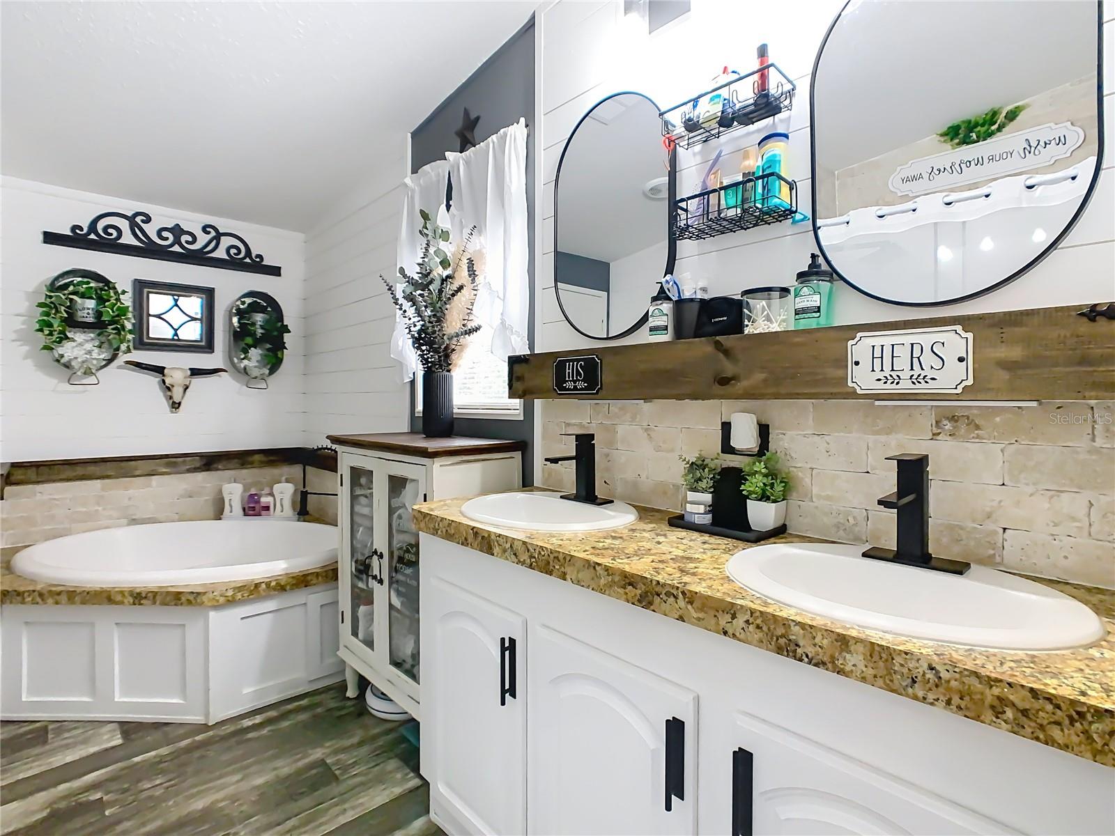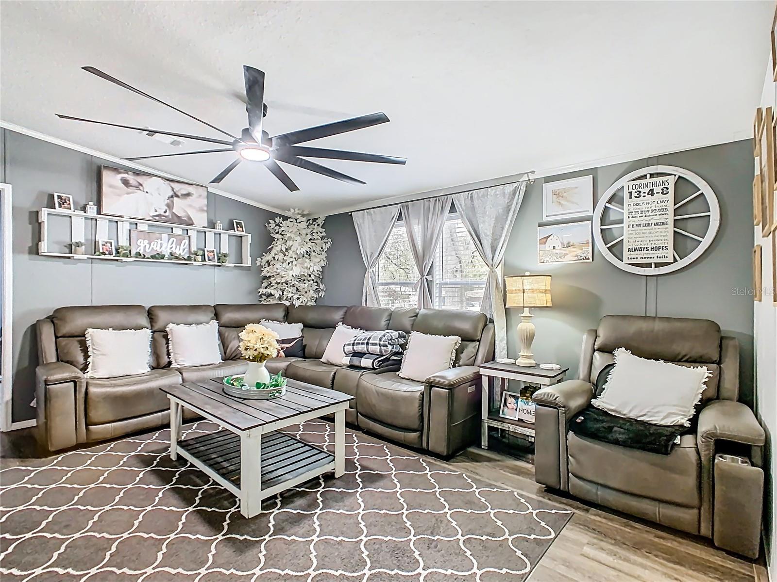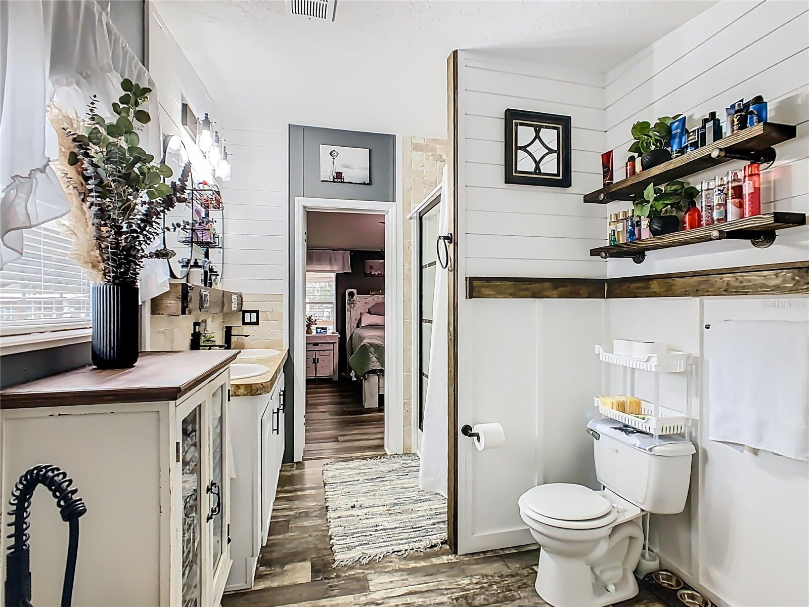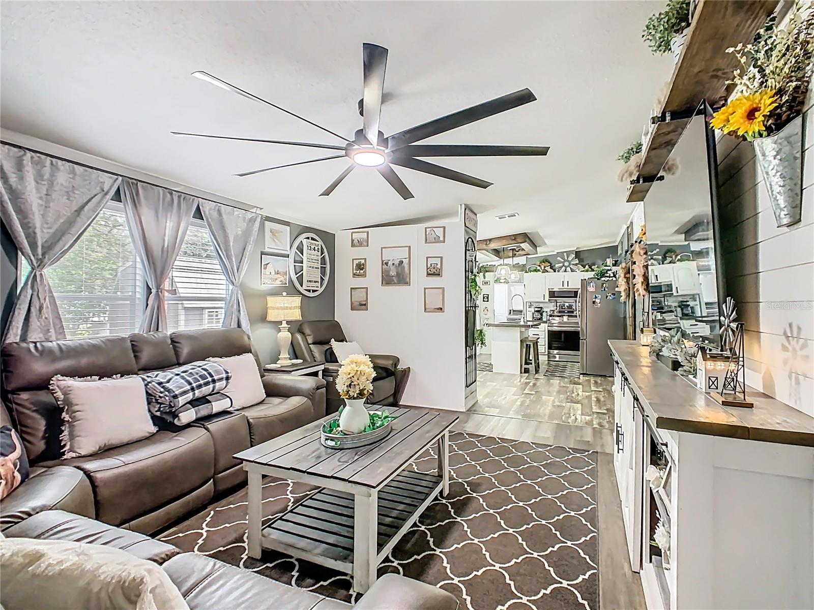 Stunning ranch modern transformation that will take your breath away! Welcome to this 2019 impeccably redesigned modern rustic 4 bed/2 bath retreat on fenced one-third acre lot on cul-de-sac with seamless indoor-outdoor entertaining. Homeownership pride from the front curb to the back fence! As you approach, you are greeted by a New sprawling 13’x46’ covered front porch with ample space for hosting gatherings while you enjoy the beautifully landscaped front yard with extended driveway that includes a tall RV cover. Step inside to the farmhouse chic living room that seamlessly flows through the sliding barn doors into the heart of the home, the custom designed kitchen, featuring wood beam tray ceiling with pendent lighting, white cabinets, butcher block counter, SS appliances including smart fridge w/tv & Alexa, large island with farm sink and breakfast bar, & barn door pantry with luxury vinyl plank flooring throughout and fresh interior paint. Adjacent to the kitchen on one side is the laundry room with built in cabinets that leads to the back yard, and the other side to the spacious family room, with every inch thoughtfully styled that create a warm, inviting atmosphere. Included is the entertainment center with the wide screen tv. The main bedroom has spacious on-suite bathroom that features beadboard panels & stone backsplash, dark matching accent trim, double sinks, garden tub, separate rain head shower with glass sliding door, and storage closet. The 2, 3 ,& 4th bedroom share a convenient 2nd bathroom with shower/tub. The property also includes a large storage shed with electric— perfect for tools, hobbies, or extra storage. Situated in a peaceful area of Winter Haven, this home offers the best of both worlds: quiet suburban living with easy access to shopping, dining, and major highways for commuting throughout Central Florida. Don’t miss your chance to own this move-in-ready home with modern updates, generous space, and outdoor charm — all with no HOA!
