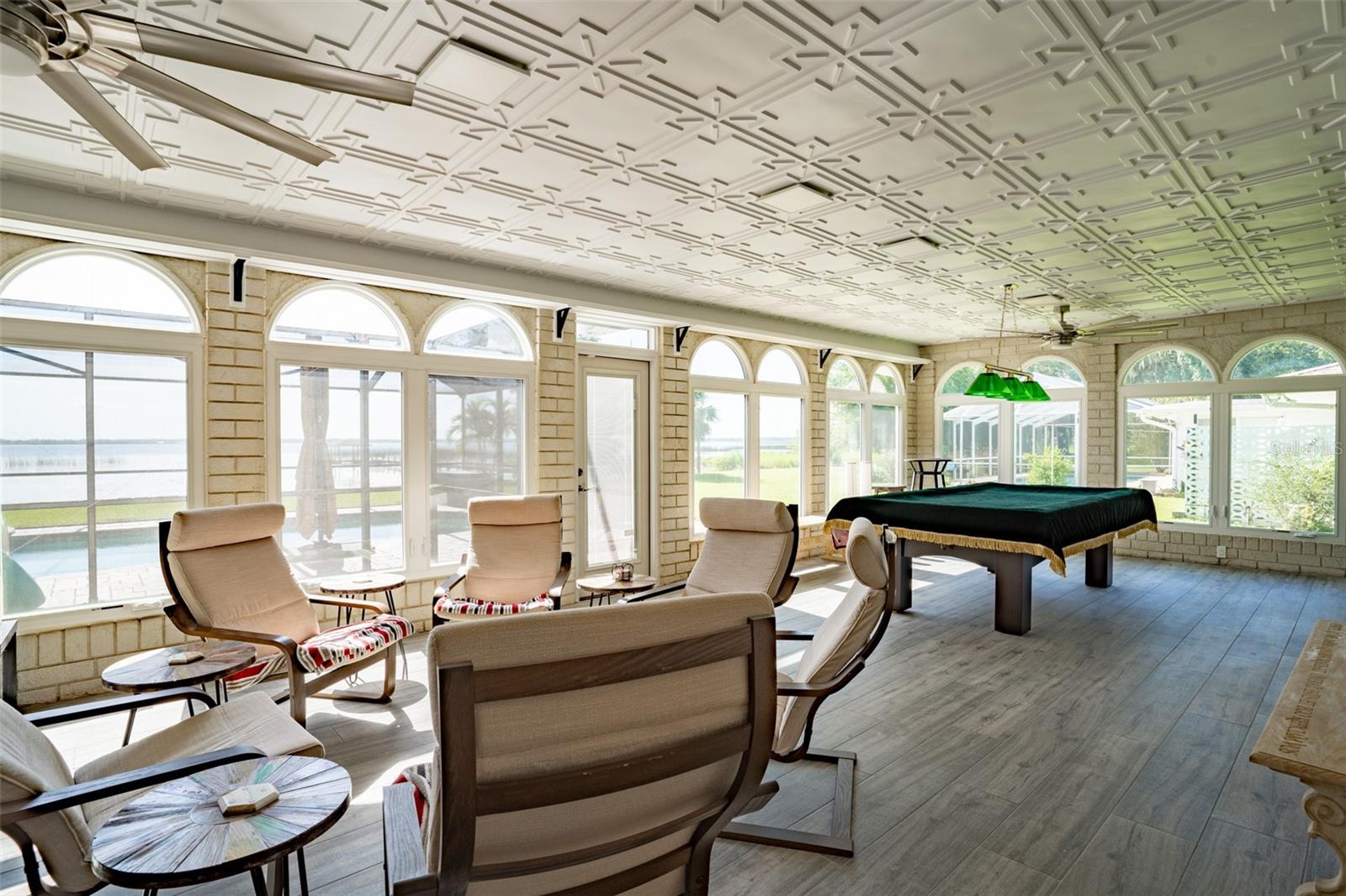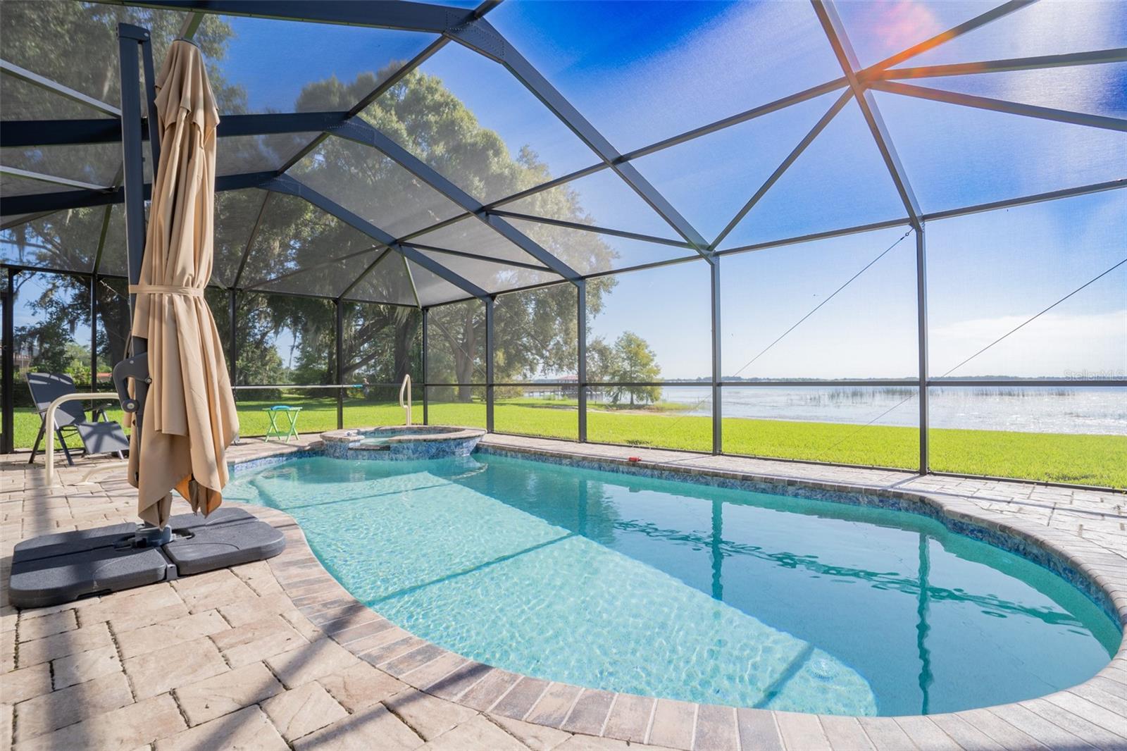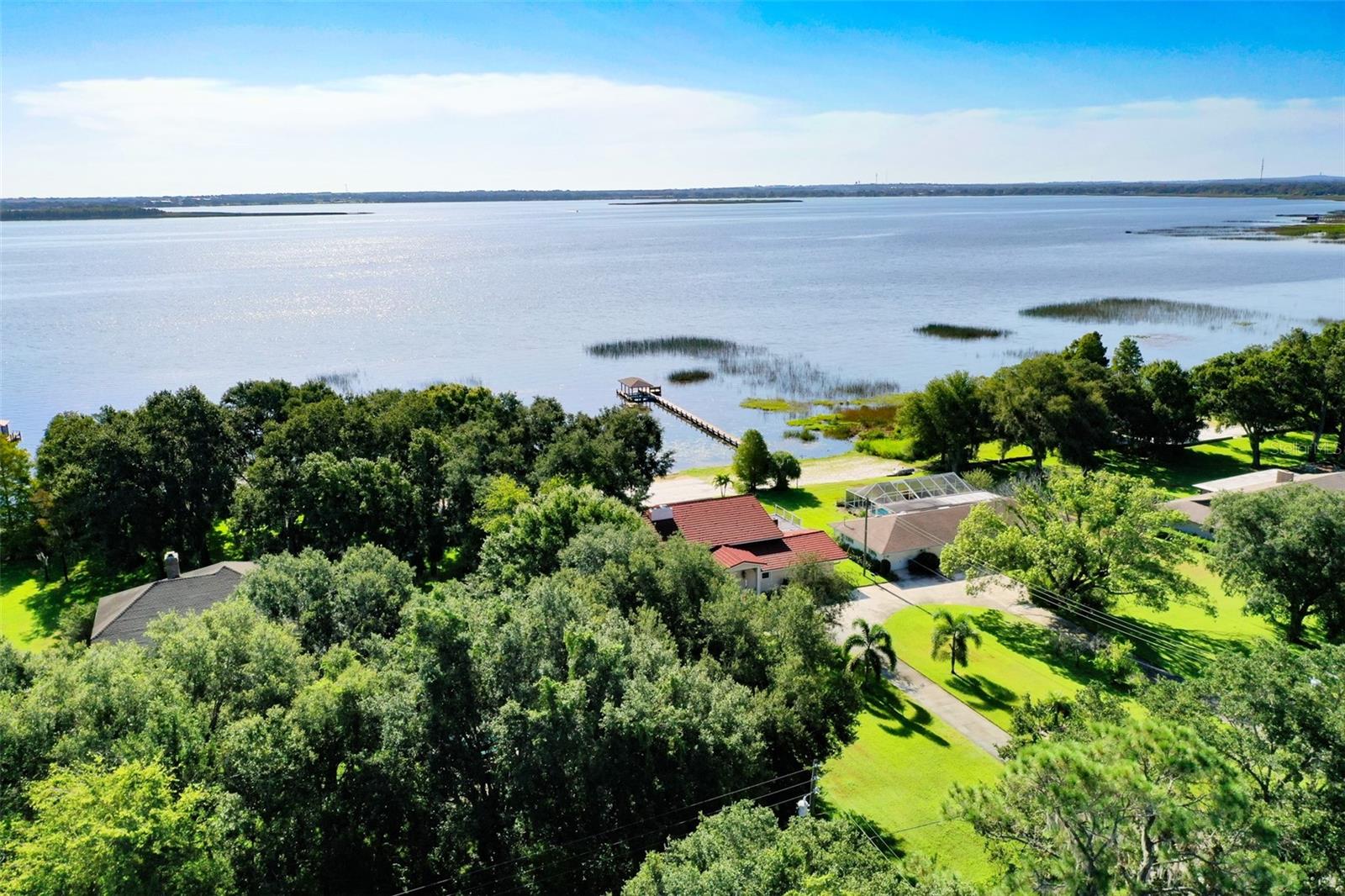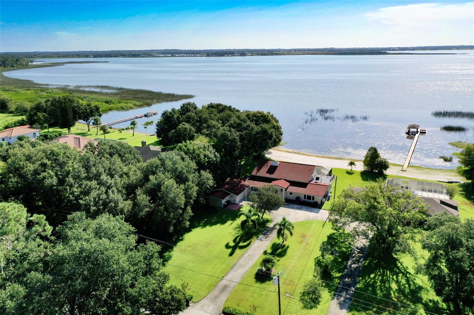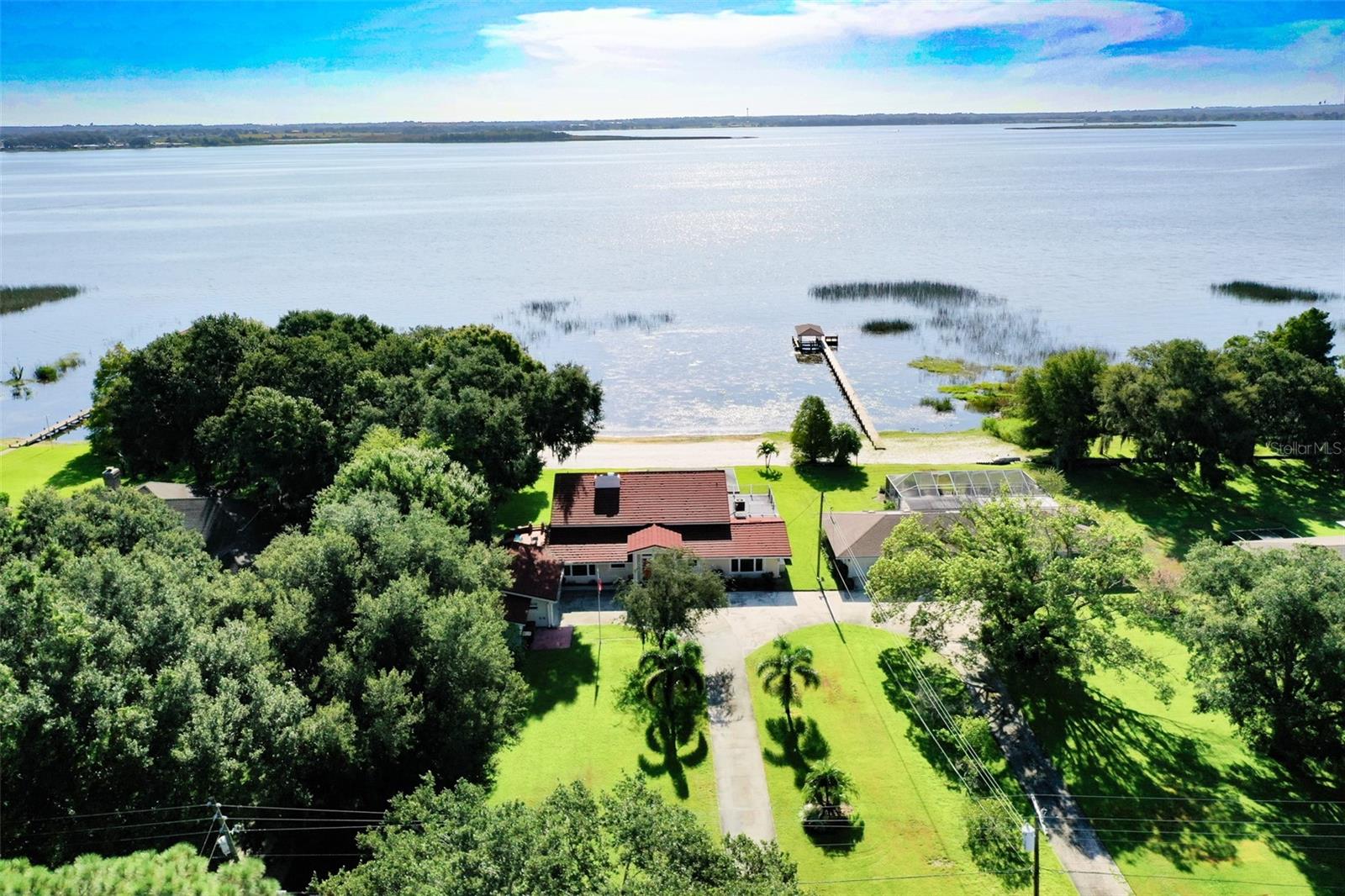 Welcome to elegant lakeside living at its finest! This captivating home offers a metal roof, new windows, new luxury vinyl plank floors, screened-in pool with hot tub and with the lakeside facing East providing a serene backdrop for sunrises over the water and your private beach. Vaulted ceilings accentuate the spacious interior, while the well-appointed kitchen with a large island, high-end granite countertops and stainless appliances is a chef's and entertainers dream. Cozy up by the duel side fireplace in the living area and dining area giving great ambiance in cooler weather. With 2 master bedrooms, one upstairs and one down you can enjoy a lot of privacy from the rest of the home with both having walk in closets. The upstairs master bedroom has its own kitchenette as well as a private living room allowing this to be used as a mother-in-law suite. The other 2 bedrooms on the lower level could easily be turned into another master, as there is a full bathroom that is in the back bedroom and the wall in between is not load bearing. Say goodbye to power outages with a full house generator and all of this in a neighborhood with no HOA, creating a truly exceptional lakeside retreat!!