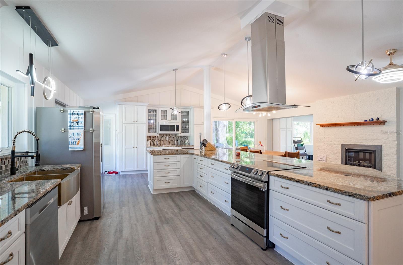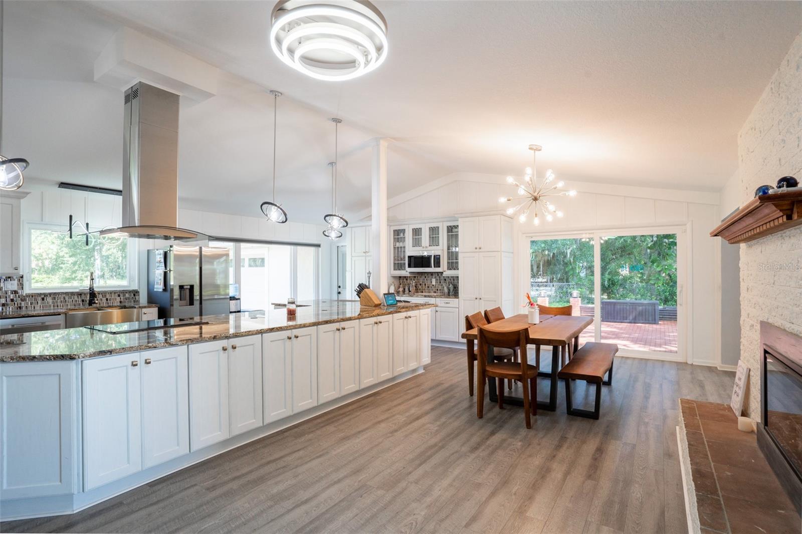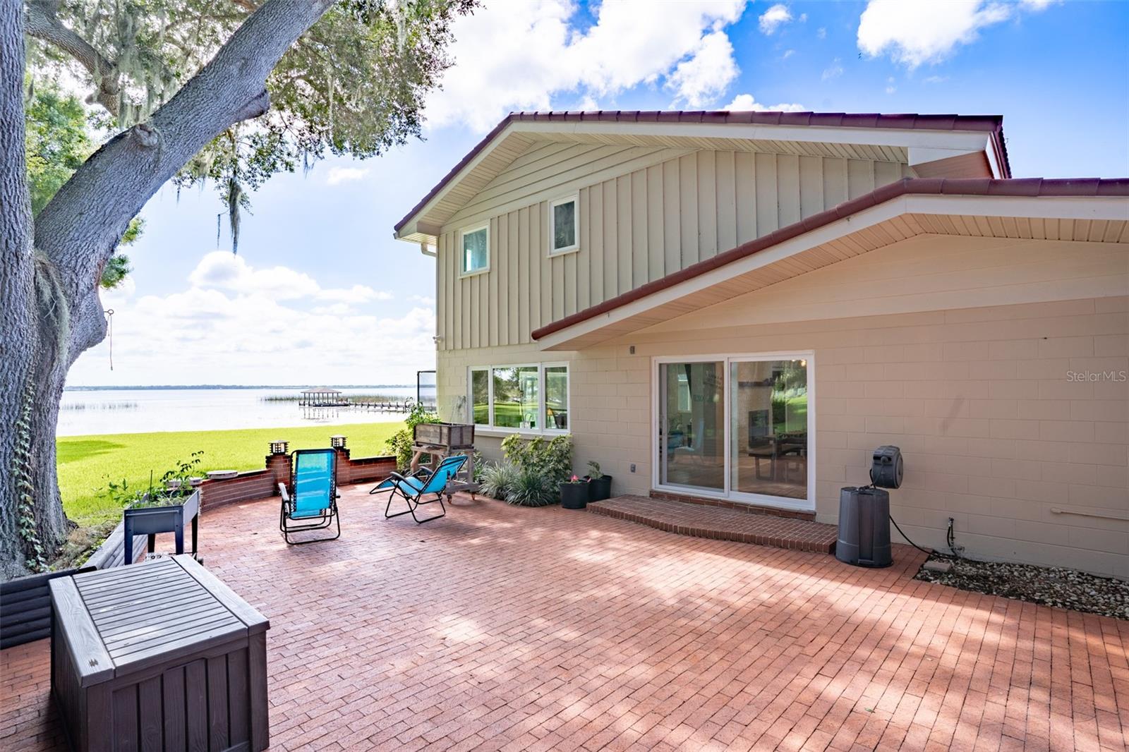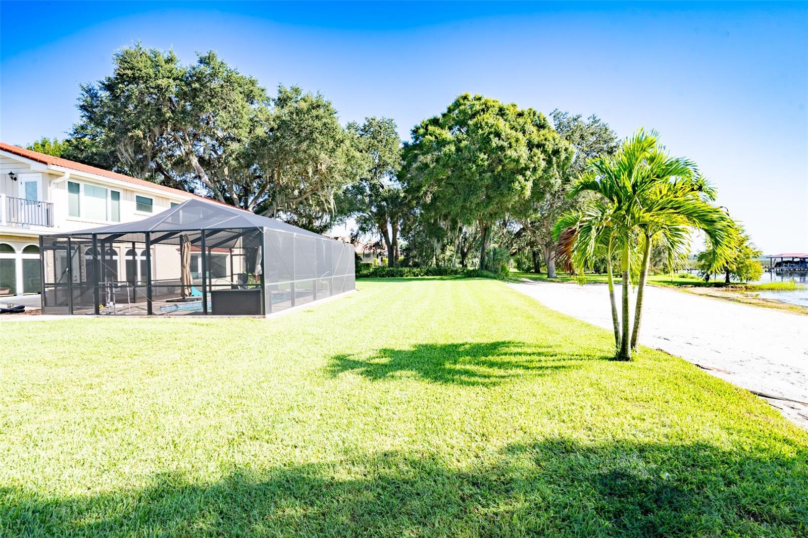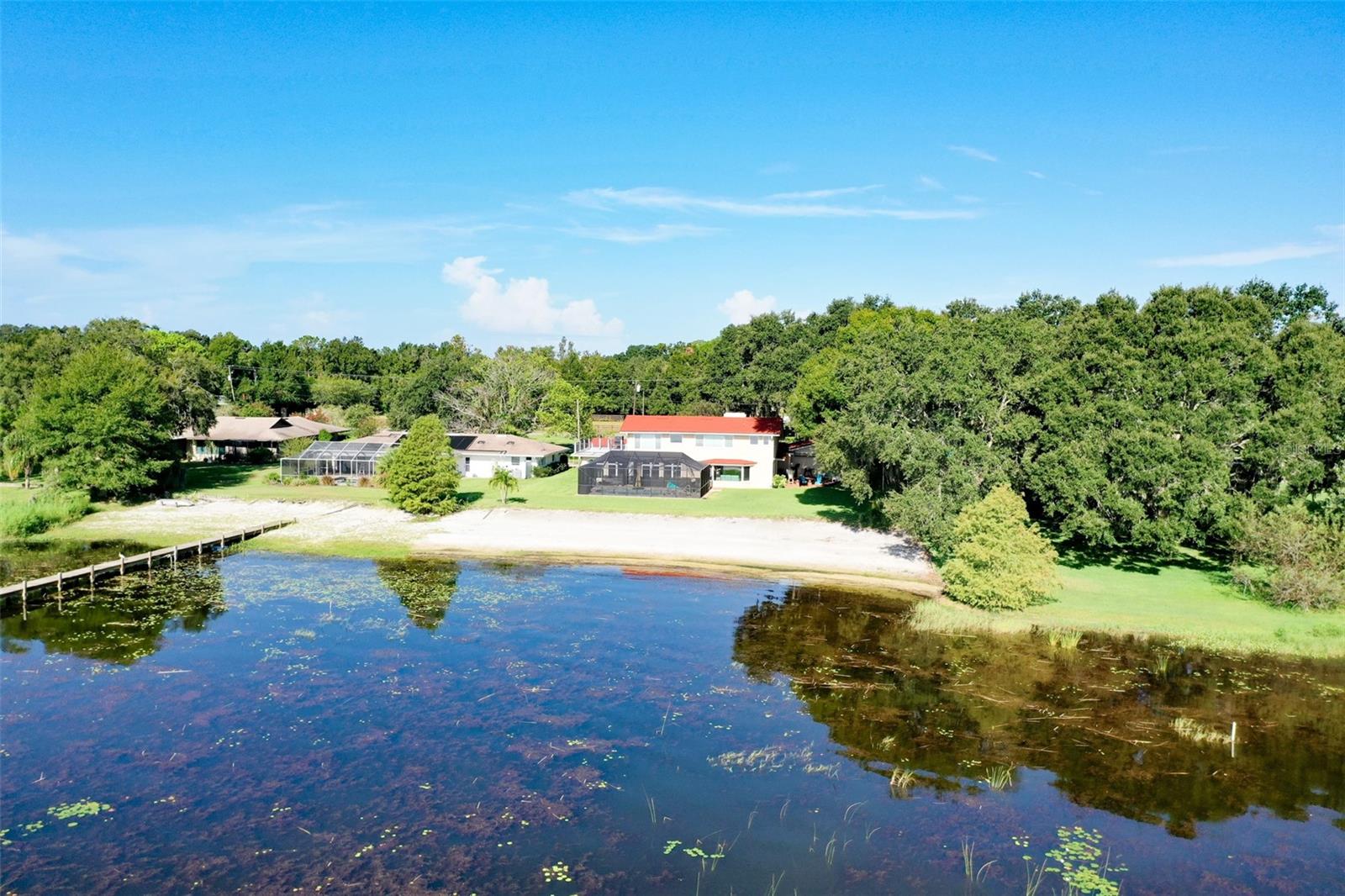 Welcome to elegant lakeside living at its finest! This captivating home offers a metal roof, new windows, new luxury vinyl plank floors, screened-in pool with hot tub and with the lakeside facing East providing a serene backdrop for sunrises over the water and your private beach. Vaulted ceilings accentuate the spacious interior, while the well-appointed kitchen with a large island, high-end granite countertops and stainless appliances is a chef's and entertainers dream. Cozy up by the duel side fireplace in the living area and dining area giving great ambiance in cooler weather. With 2 master bedrooms, one upstairs and one down you can enjoy a lot of privacy from the rest of the home with both having walk in closets. The upstairs master bedroom has its own kitchenette as well as a private living room allowing this to be used as a mother-in-law suite. The other 2 bedrooms on the lower level could easily be turned into another master, as there is a full bathroom that is in the back bedroom and the wall in between is not load bearing. Say goodbye to power outages with a full house generator and all of this in a neighborhood with no HOA, creating a truly exceptional lakeside retreat!!