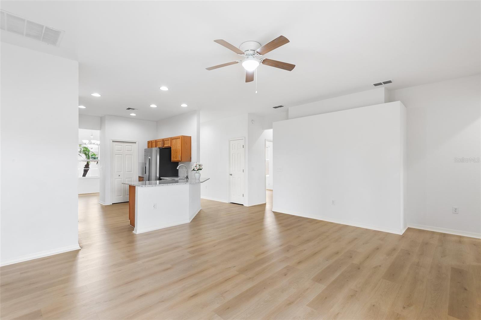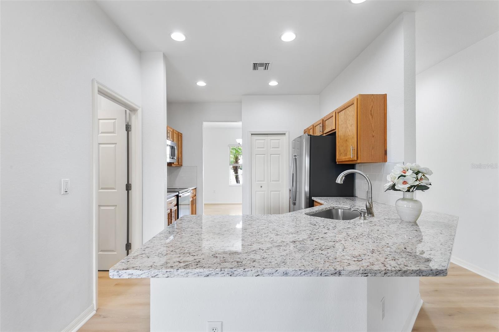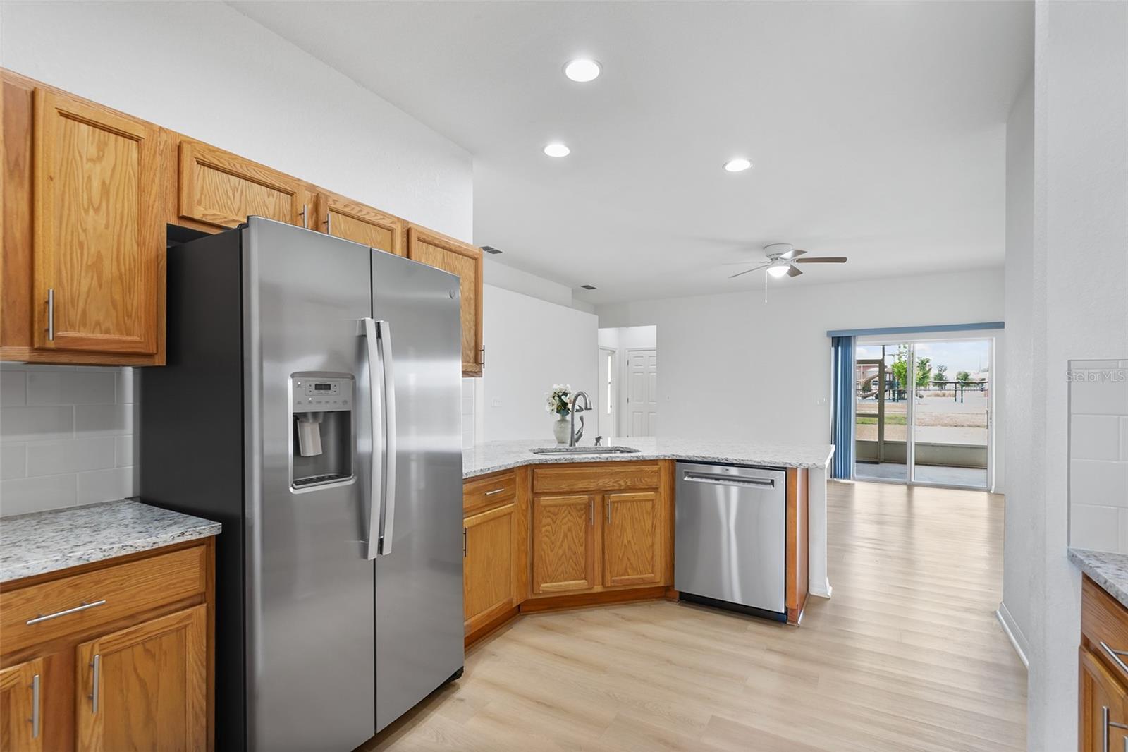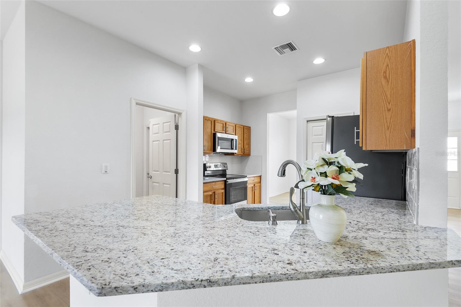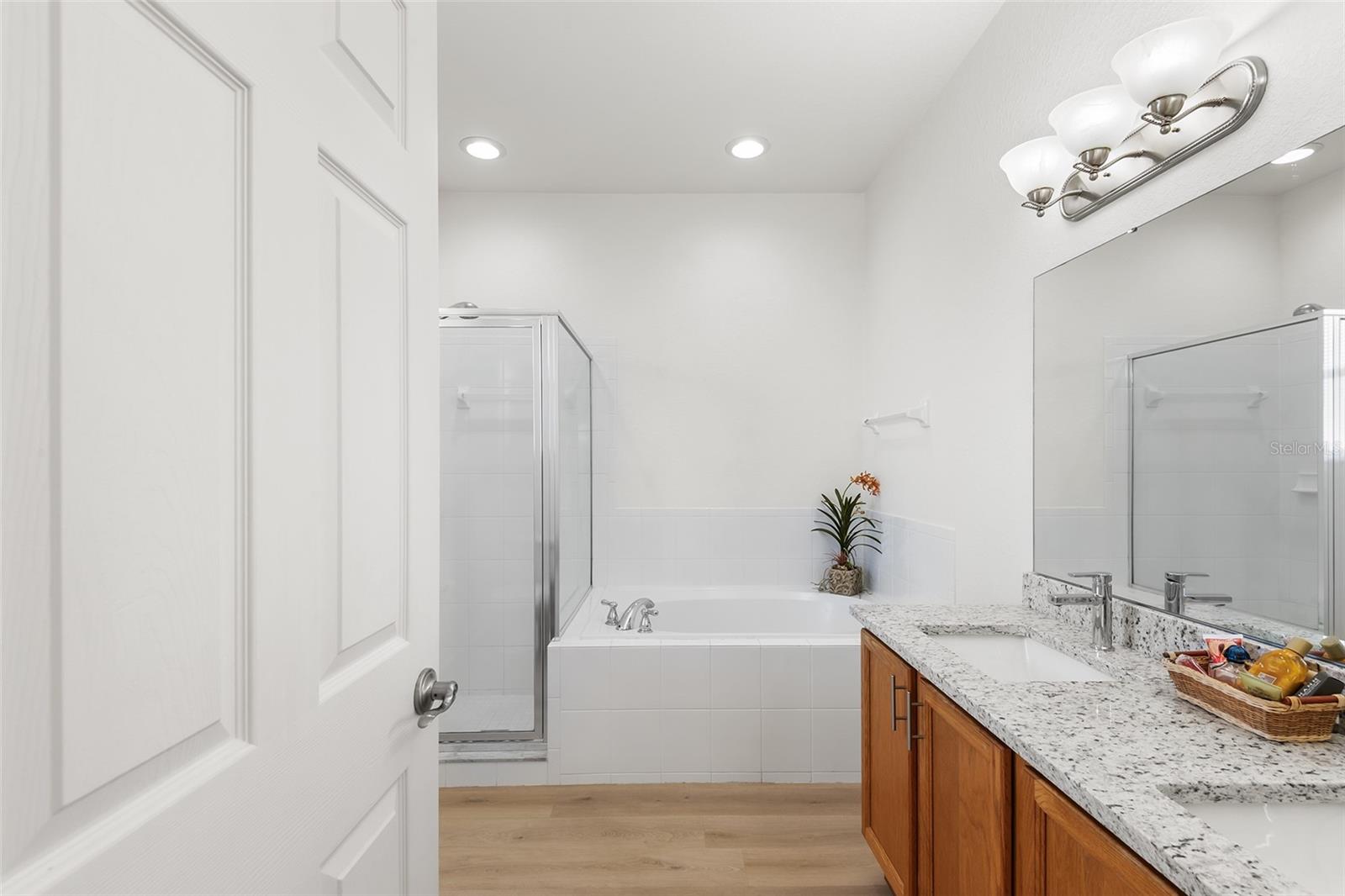 One or more photo(s) has been virtually staged. Welcome to your dream home nestled in a gated community! This stunning 4-bedroom, 3-bathroom home offers an exquisite pool bath design and an open split floor plan, perfect for modern living and entertaining. As you step inside, you'll be greeted by luxury vinyl plank flooring that flows seamlessly throughout the freshly painted home. The spacious living areas are accentuated by elegant plant shelves, ideal for displaying your favorite decor. The heart of the home boasts a beautiful kitchen, complete with granite countertops and brand-new stainless steel appliances, making it a chef's delight. The master suite is a true retreat, featuring a walk-in closet, a garden tub, and sliding glass doors that open to the expansive lanai. Enjoy your morning coffee or unwind in the evening while overlooking the oversized lot, offering ample space for a pool, outdoor activities and potential landscaping projects. Built with quality and care, this home includes a new roof installed in 2022, ensuring peace of mind for years to come. Don't miss this opportunity to own a beautifully appointed home in a secure, sought-after community. Schedule your private tour today and experience the lifestyle you've been dreaming of!