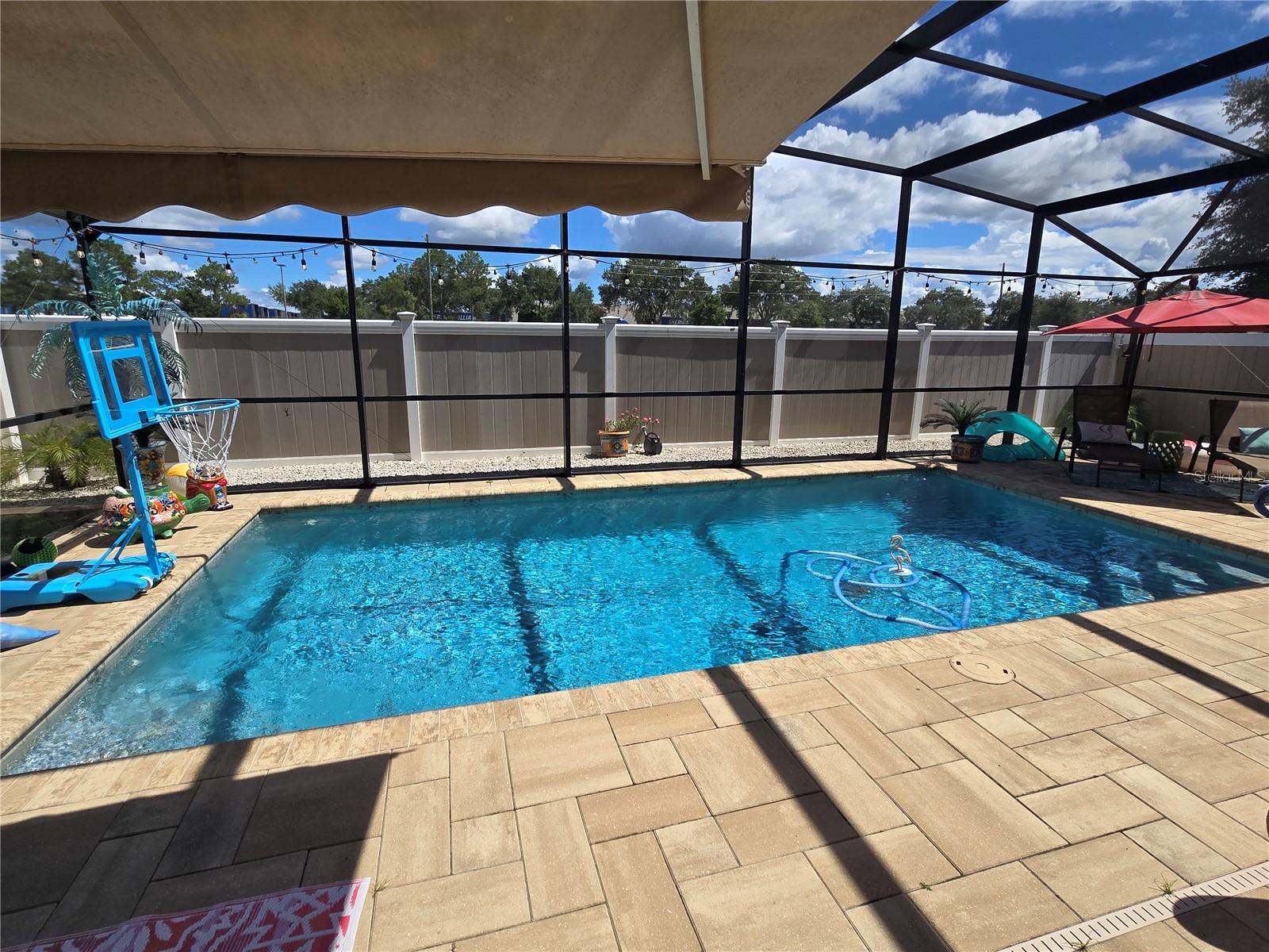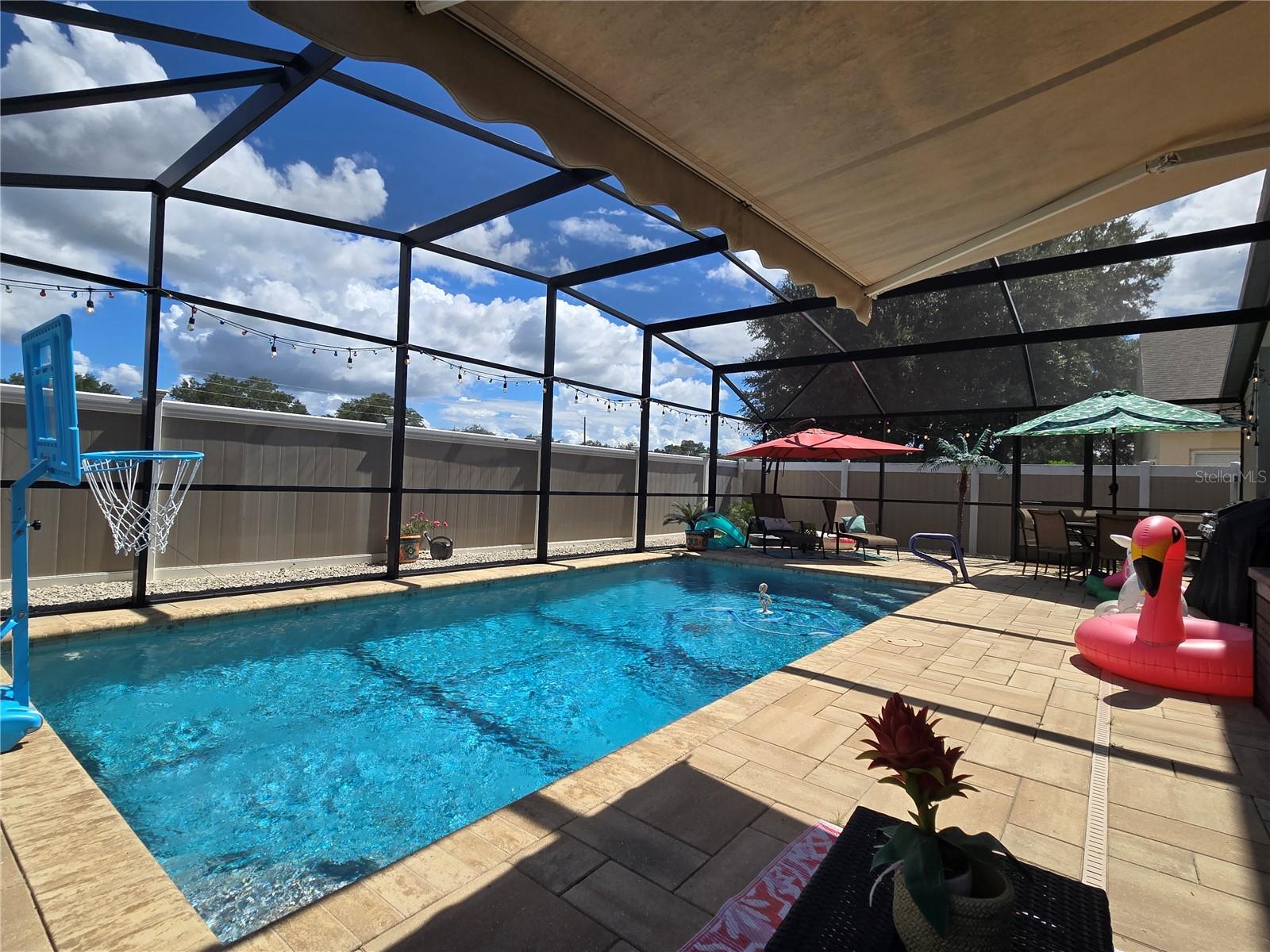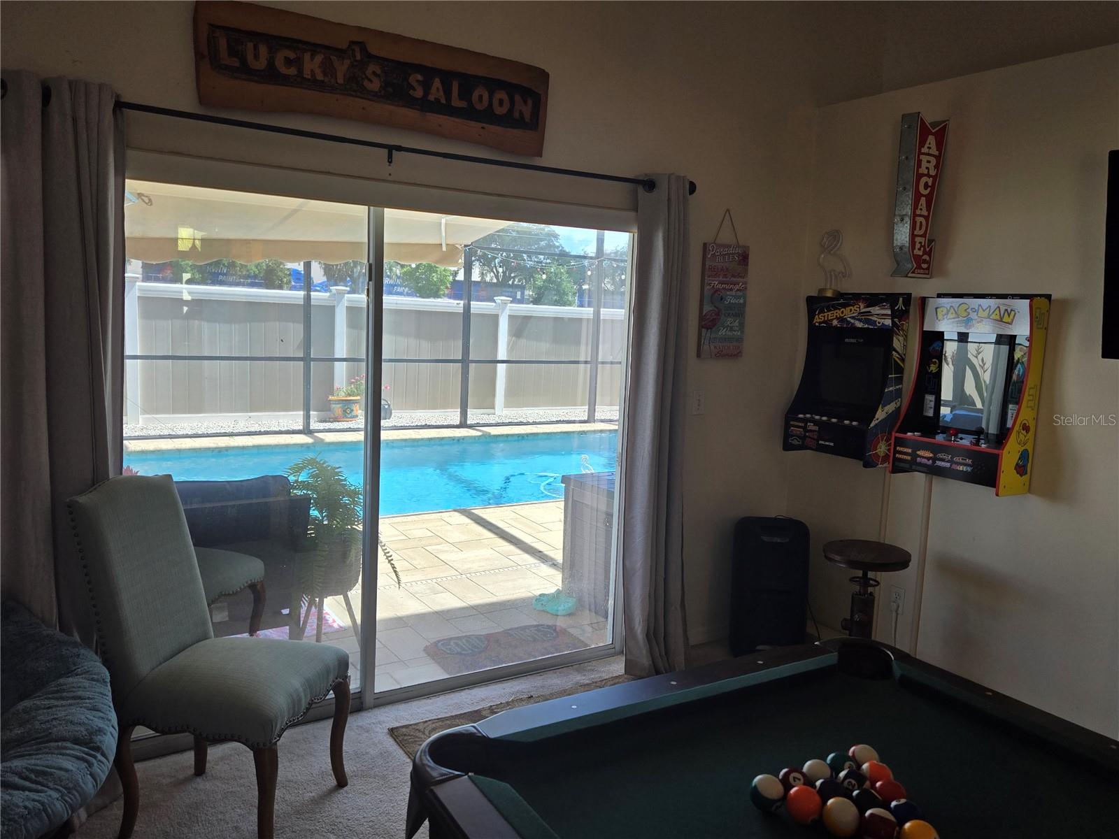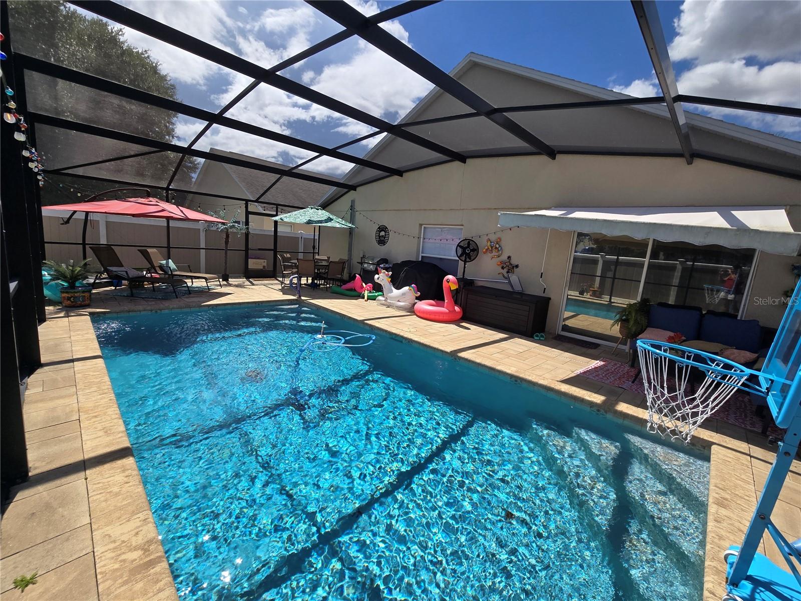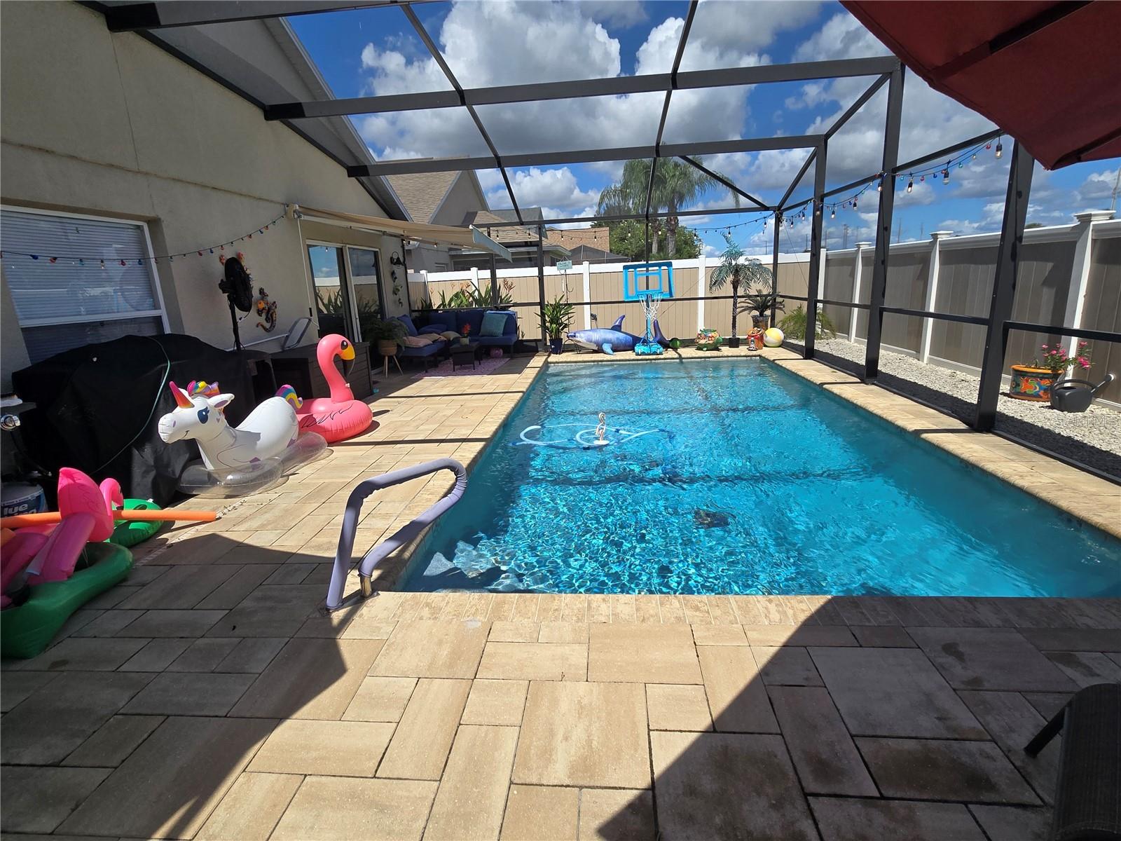 A delightful POOL home in this quiet, stable, popular Neighborhood! What a rare gem! Family Room is a Game Room - and the games and pool table will be included at a full-list offer! 3/2 with open Kitchen to FR and flows right out the door to the new swimming pool that has plenty of deck, umbrella tables, and retractable screen on a 38x51 concrete patio space - Current owners even enjoyed outdoor MOVIE NIGHTS. Open floor plan when you enter the front door brings you into the Formal Dining Room and Living Room. The kitchen and family room is one more step into the house. This is the perfect place to gather all the family or just be the entertainer! You have an attached 2-car garage with overhead door opener. New roof this year, AC 5 years old, and the pool was put in then too. Pool has heater and lights! The retractable shade screen provides peace of mind in Florida's crazy weather. This house has SOLID CONCRETE walls, not cement block. Lots of peace of mind here! The kitchen includes plenty of cabinet space and a breakfast bar, and the open floor plan to the family room makes the place feel so spacious!