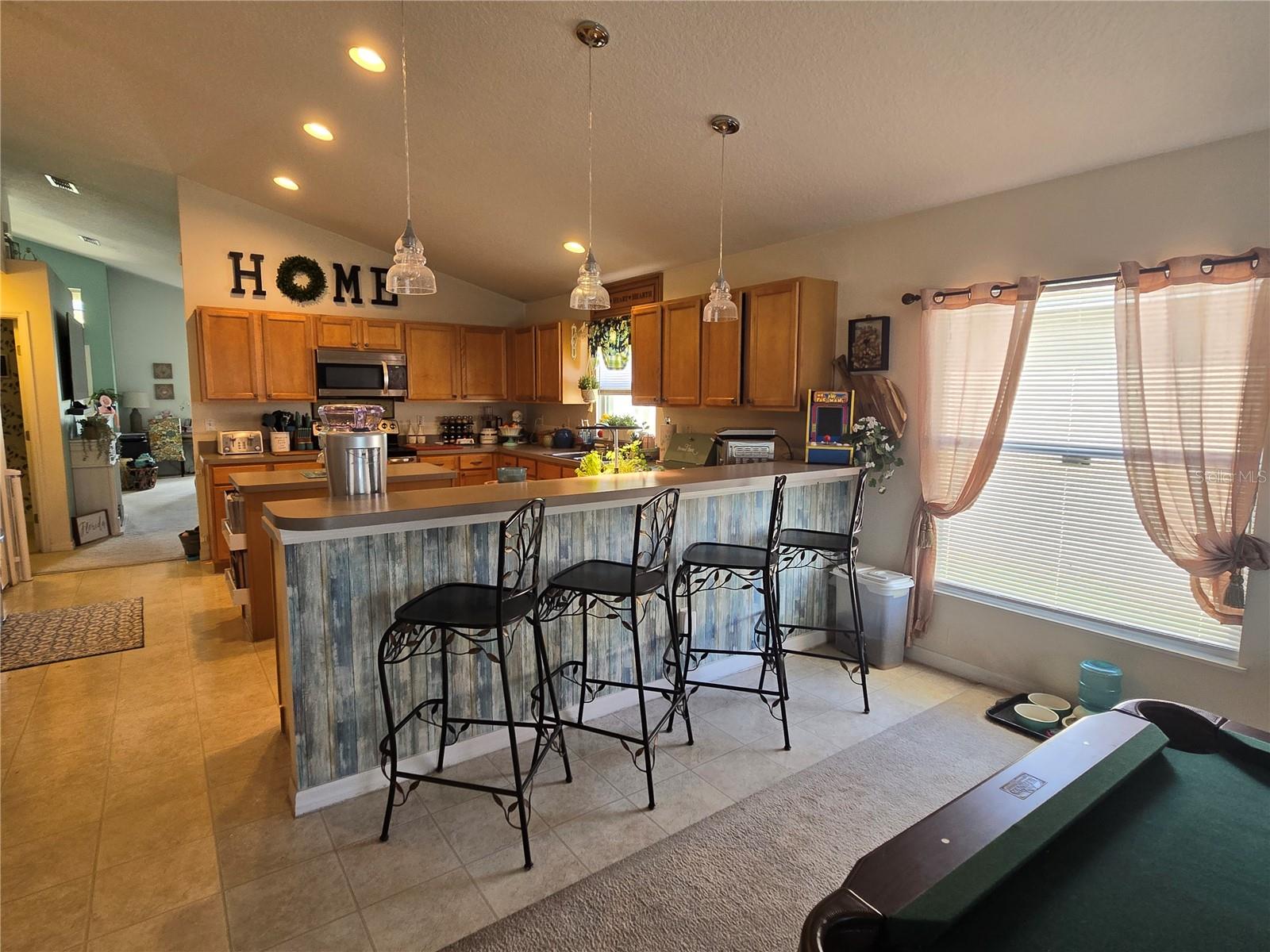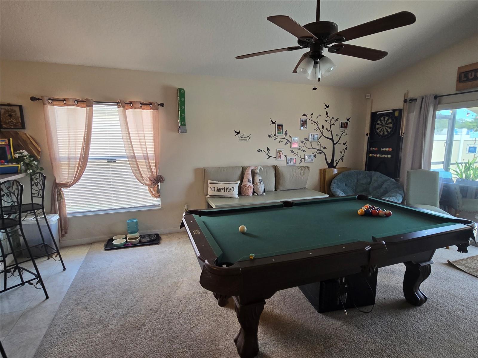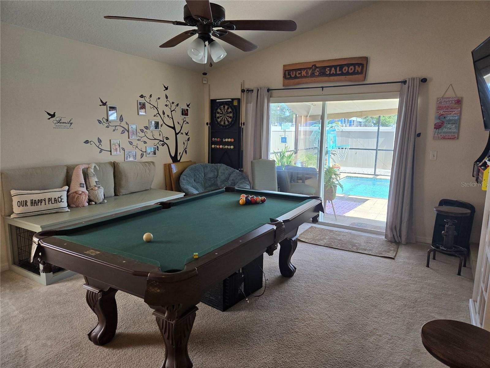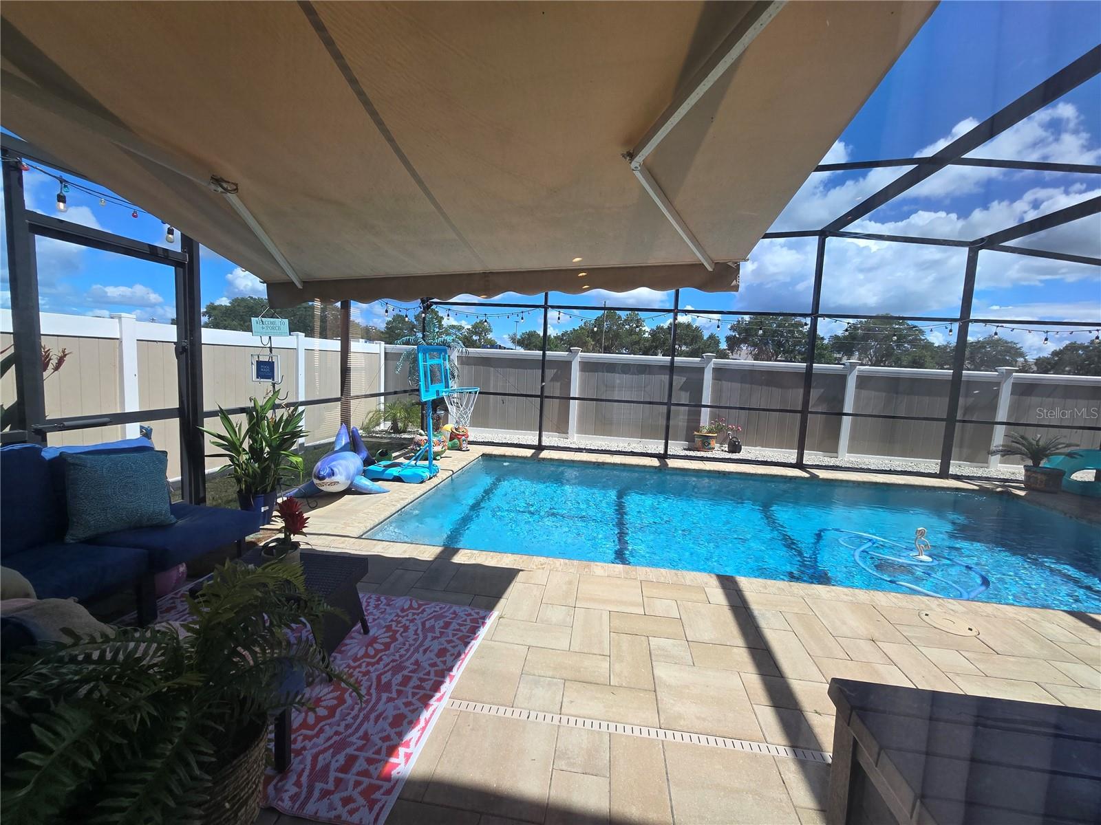 A delightful POOL home in this quiet, stable, popular Neighborhood! What a rare gem! Family Room is a Game Room - and the games and pool table will be included at a full-list offer! 3/2 with open Kitchen to FR and flows right out the door to the new swimming pool that has plenty of deck, umbrella tables, and retractable screen on a 38x51 concrete patio space - Current owners even enjoyed outdoor MOVIE NIGHTS. Open floor plan when you enter the front door brings you into the Formal Dining Room and Living Room. The kitchen and family room is one more step into the house. This is the perfect place to gather all the family or just be the entertainer! You have an attached 2-car garage with overhead door opener. New roof this year, AC 5 years old, and the pool was put in then too. Pool has heater and lights! The retractable shade screen provides peace of mind in Florida's crazy weather. This house has SOLID CONCRETE walls, not cement block. Lots of peace of mind here! The kitchen includes plenty of cabinet space and a breakfast bar, and the open floor plan to the family room makes the place feel so spacious!