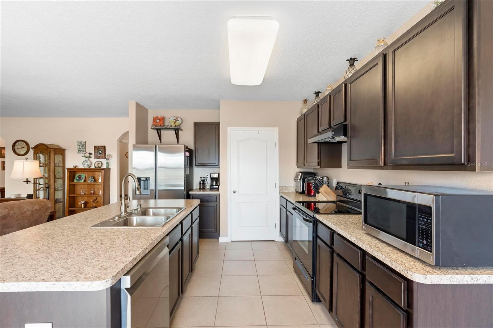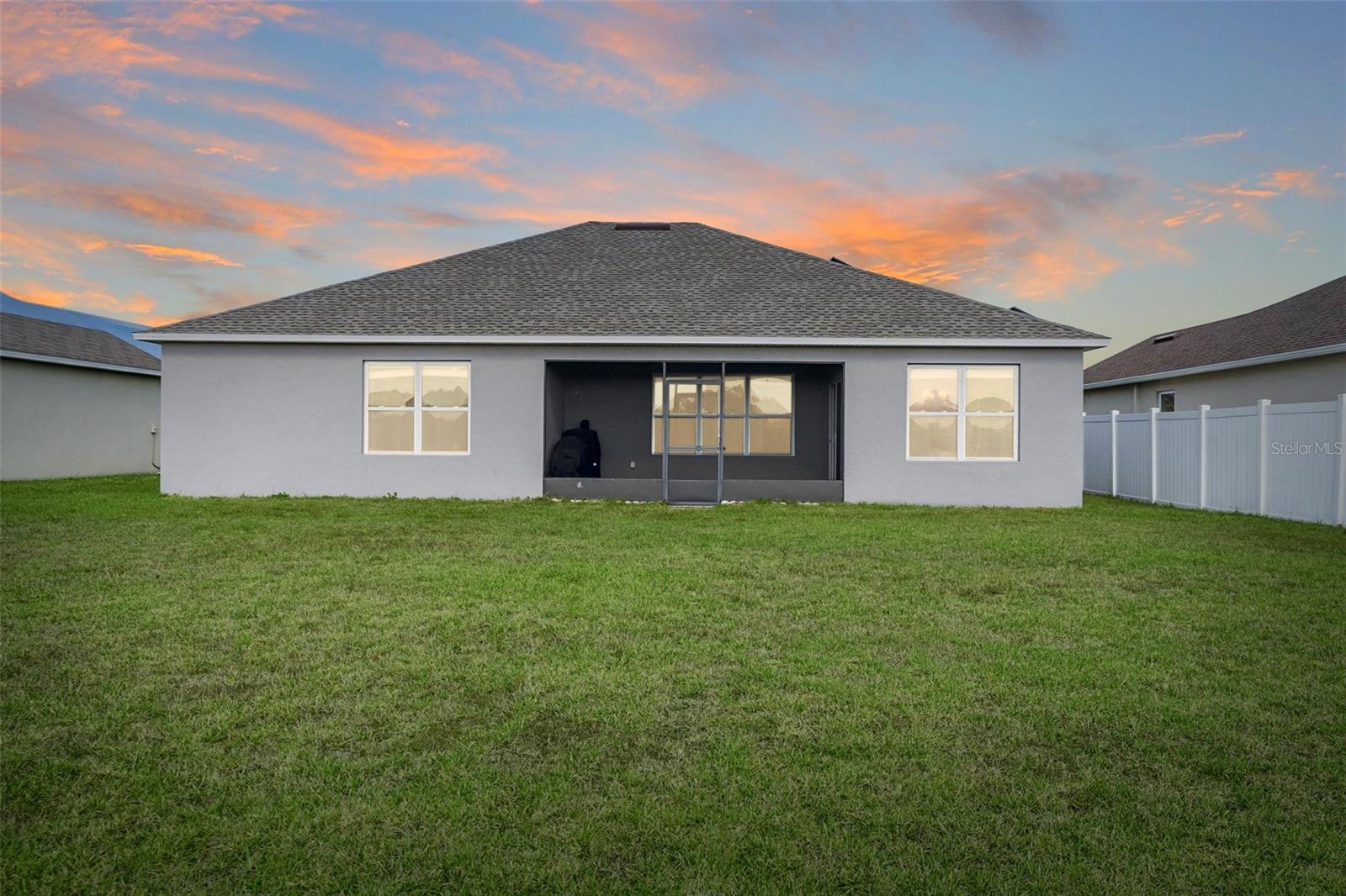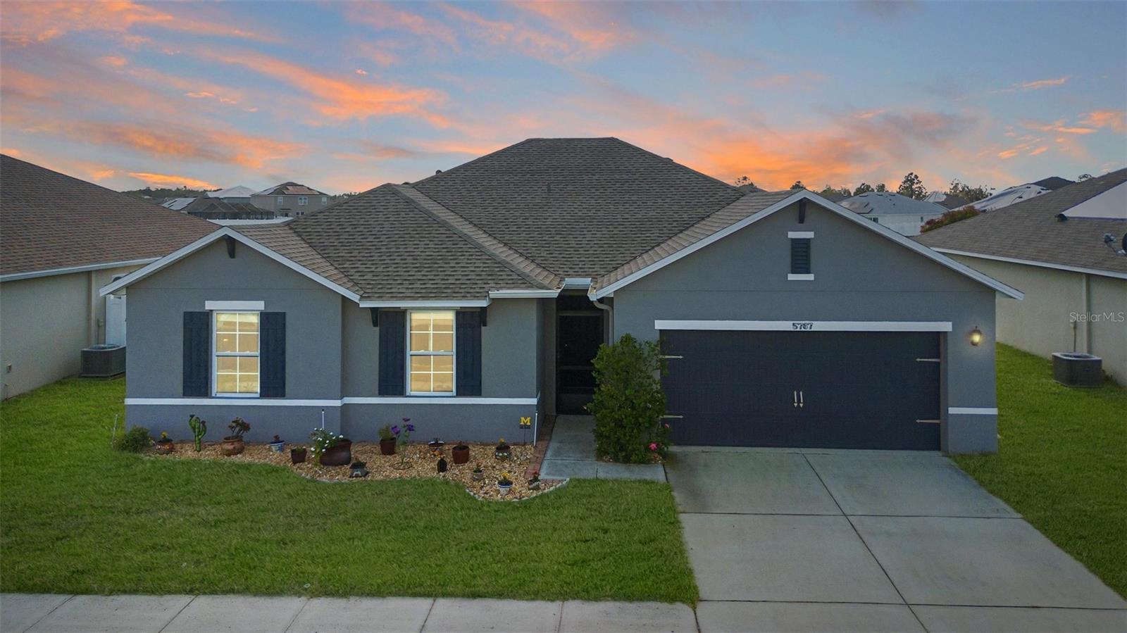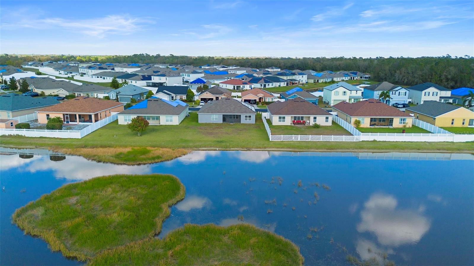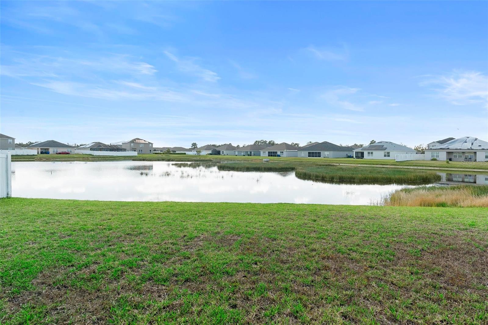 Nestled on a WATERFRONT LOT lot, this charming home offers a SERENE POND VIEW where you'll frequently spot turtles, Florida-native birds, and other wildlife. Unwind at the end of the day while enjoying BREATHTAKING SUNSETS from your SCREENED-IN LANAI. Inside, past the SCREENED-IN ENTRYWAY, the CUSTOM-PAINTED INTERIOR boasts an OPEN LAYOUT that seamlessly blends the SPACIOUS LIVING ROOM, dining room, and kitchen—ideal for entertaining. The kitchen shines with elegant ESPRESSO CABINETS, a nearly NEW REFRIGERATOR and DISHWASHER (both just SIX MONTHS OLD), a CORNER PANTRY, and a LARGE ISLAND with an overhang perfect for meal prep or serving guests. Designed for privacy, the home features a SPLIT FLOOR PLAN with two guest bedrooms on one side, which share a bathroom with a DOUBLE-SINK VANITY, while the primary suite is positioned on the opposite end. The EXPANSIVE PRIMARY BEDROOM offers a STUNNING POND VIEW and an ENSUITE BATH featuring a SEPARATE WATER CLOSET and an IMPRESSIVE WALK-IN CLOSET that spans the full length of the room. Additional features of this exceptional home include multiple LINEN CLOSETS for storage, a FOUR-YEAR-OLD WASHER and DRYER, a THREE-YEAR-OLD HURRICANE-RATED ROOF, a TWO-YEAR-OLD GARAGE DOOR OPENER, a recently PAINTED EXTERIOR, and FULLY PAID-OFF SOLAR PANELS at closing. The community offers a PLAYGROUND, a RESORT-STYLE POOL for relaxation, and a TWO-LANE LAP POOL with a shallow section for young children. CONVENIENTLY LOCATED with easy access to countless RESTAURANTS, SHOPPING, and ATTRACTIONS such as LEGOLAND, DISNEY WORLD, and UNIVERSAL STUDIOS. Come experience all this home has to offer—an opportunity you WON'T WANT TO MISS!