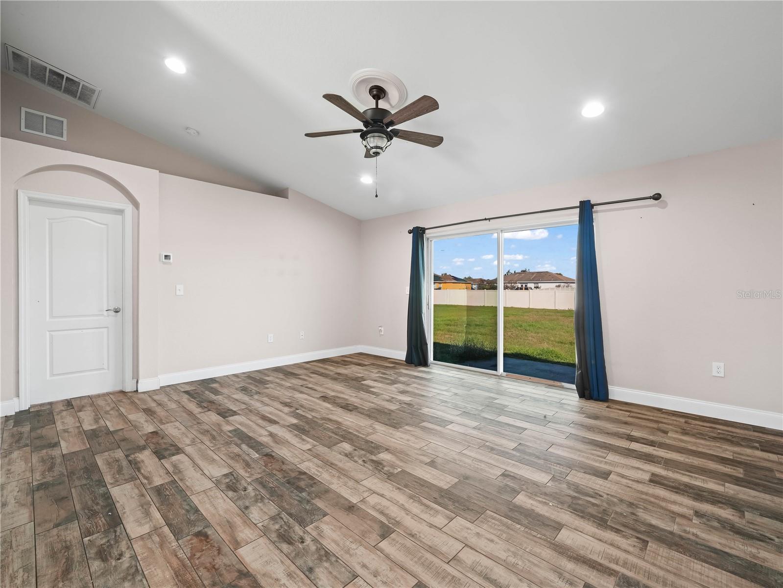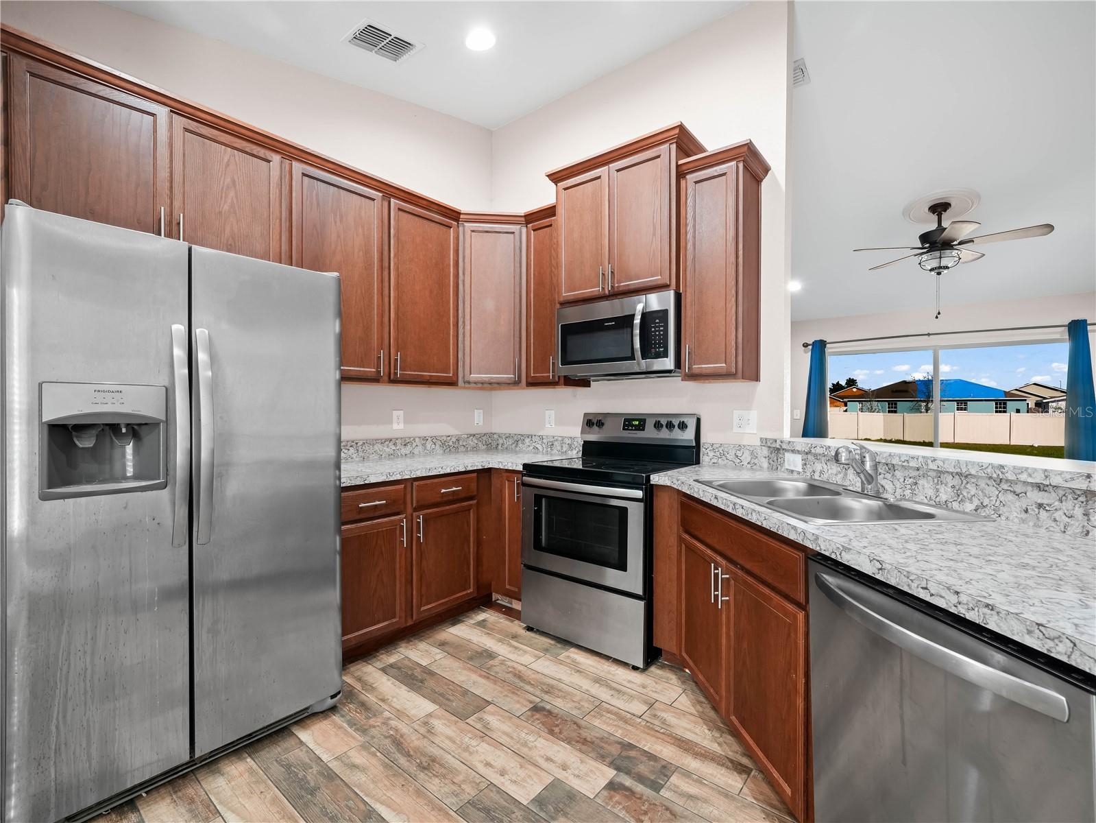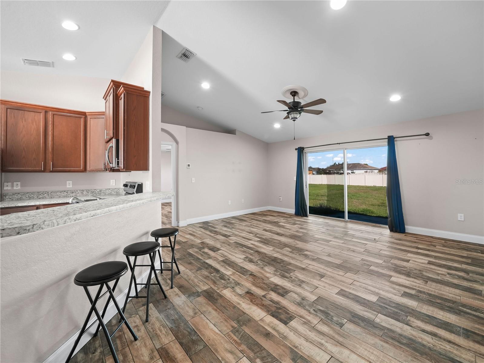 Charming 3-Bedroom Home with Open Floor Plan & Modern Upgrades! Step into this beautifully designed home featuring an open-concept layout with elegant wood-look tile flooring throughout. The spacious living area is bright and airy, with large sliding glass doors leading to the backyard, perfect for indoor-outdoor living. A stylish ceiling fan adds comfort and charm to the space. The kitchen is a chef’s dream, boasting rich wood cabinetry, sleek stainless steel appliances, granite countertops, and a breakfast bar with seating—ideal for casual dining and entertaining. The adjacent dining and living areas create a seamless flow for family gatherings. Retreat to the generously sized bedrooms, each offering ample natural light and ceiling fans for year-round comfort. The primary bedroom is a private oasis, with a soothing color palette and large windows overlooking the backyard. This home is a perfect blend of style and functionality, offering modern upgrades in a warm and inviting setting. Don’t miss this opportunity—schedule a showing today!
