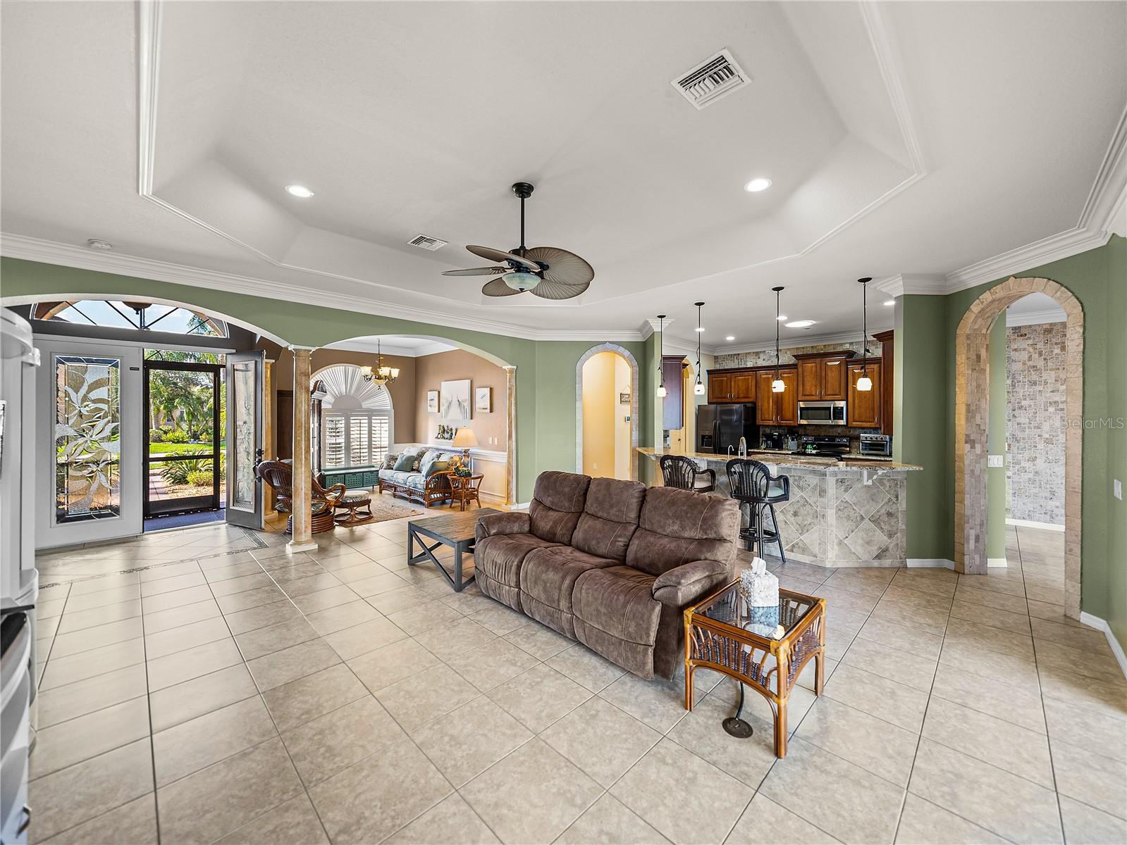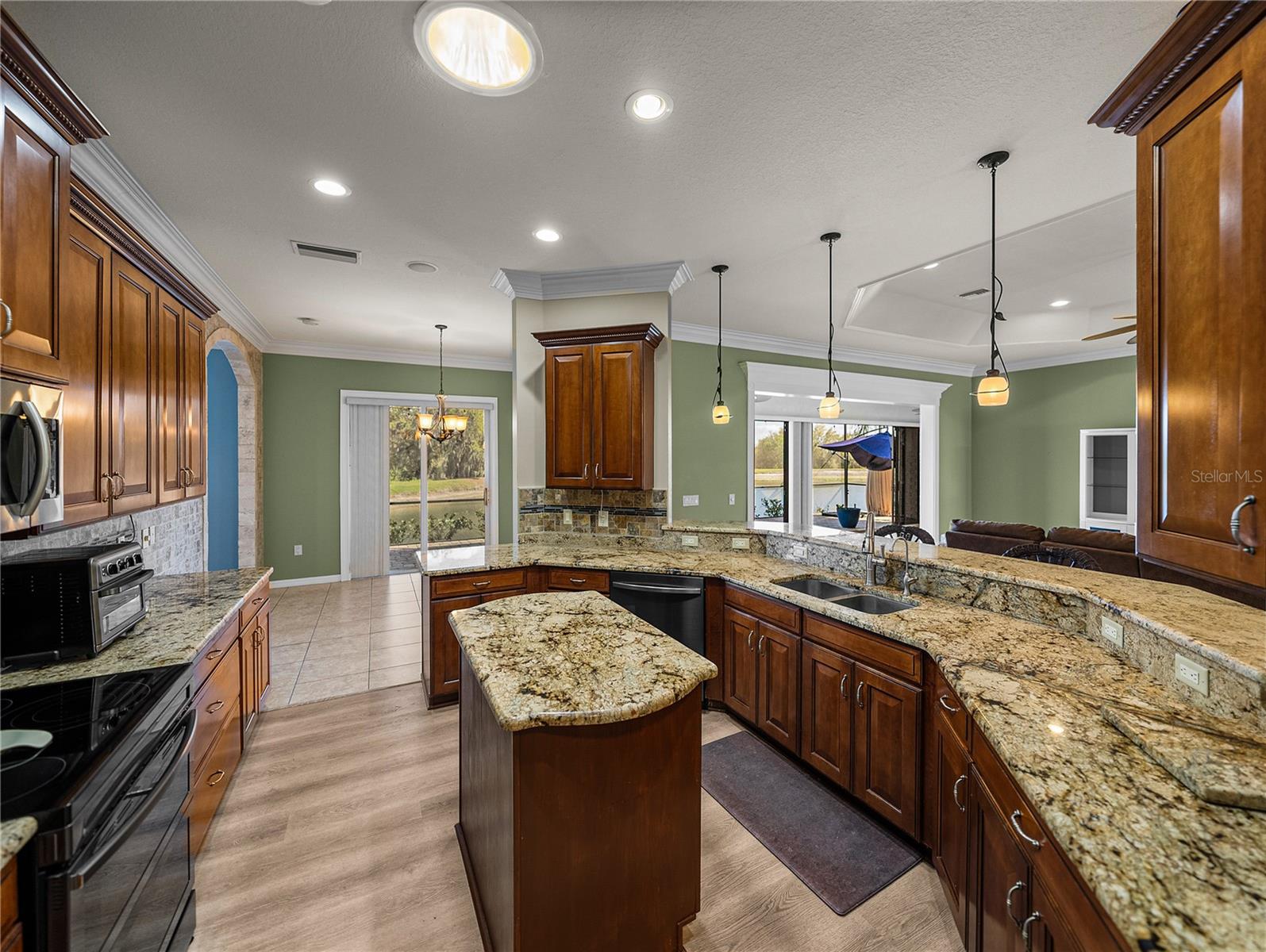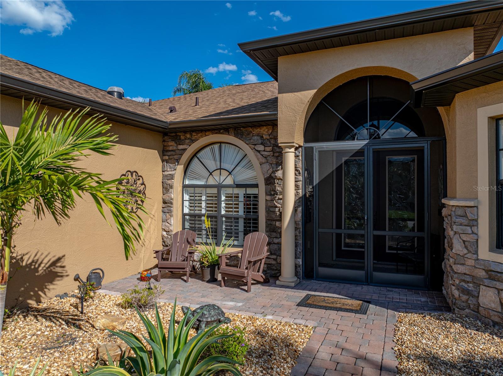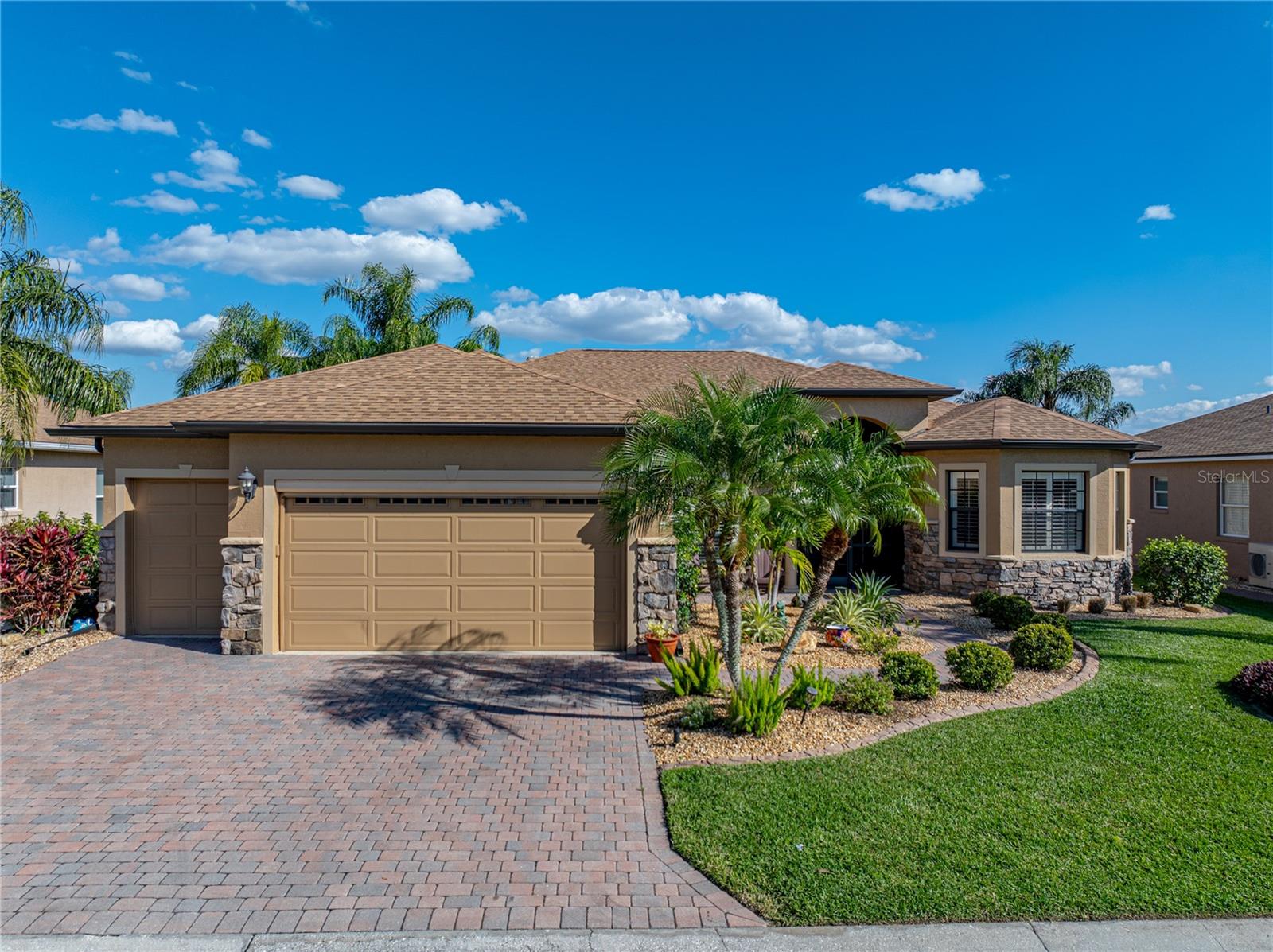 PRICE REDUCTION on this Stunning St John Floor Plan with Water and Nature views, featuring 3 bedrooms PLUS a den and 2 bathrooms with an enclosed Florida room and extended screened in Lanai. This Custom-built floor plan has so many upgrades you must see to appreciate. To Start, the front of the house has custom stacked stone, power screen on garage door, lush landscaping, front paver patio, enclosed screen entrance and beautiful beveled double glass doors. When you enter there are round columns that set off the dining room area from the Great room and raised stone archways that lead you to the kitchen and breakfast nook area. Coffered ceilings with recessed lighting and ceiling fan will also be found in the Great room and double crown molding is throughout the entire home. This custom built chefs kitchen has bank of drawers, beautiful raised panel 42" custom cabinets with crown molding, stainless steel appliances, large island for prepping with additional storage, pendant lighting over breakfast bar and Granite countertops. In the primary bedroom you have sliding doors leading to the enclosed lanai and a wonderful view to wake up to. The en-suite bathroom has two walk in closets, a walk in shower, double vanities, linen closet and a large soaking tub. The guest bedrooms are on the opposite side of the home giving guests privacy with a guest bathroom between them both. You will find a large walk in pantry, a large laundry room with washer and dryer that convey with the home. UPGRADES ALSO INCLUDE; New roof 2024, New AC 2022, New Kinetico whole house water softener, New refrigerator 2025, New Dishwasher and Stove 2022, New additional screened room with pavers 2022, & upgraded landscaping 2022. CDD BOND DEBT PAID IN FULL. Don’t miss out on this amazing home with views of the pond, woods, and Lake. The community offers tons of amenities with two clubhouses, two 18 hole golf courses, bowling alley, movie theatre, craft rooms, card rooms, billiards, pickleball, tennis, bocce and so much more you have to visit to appreciate it.