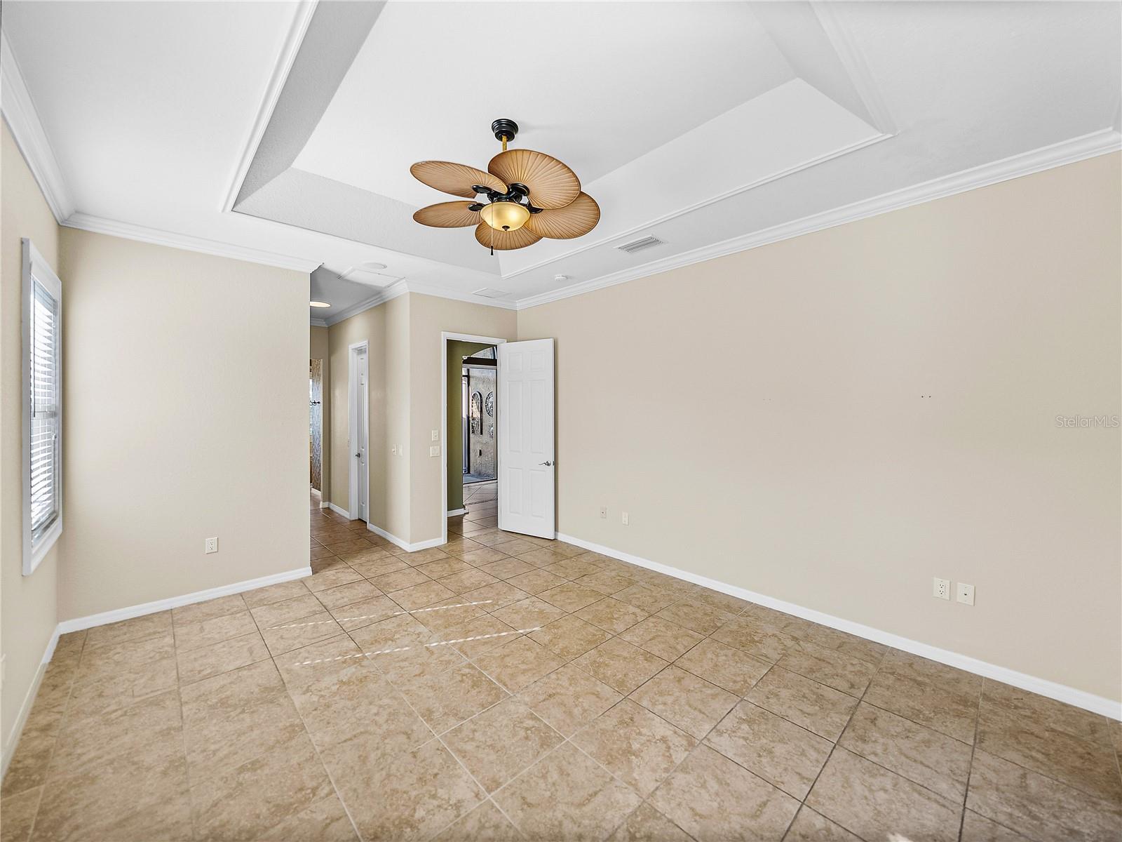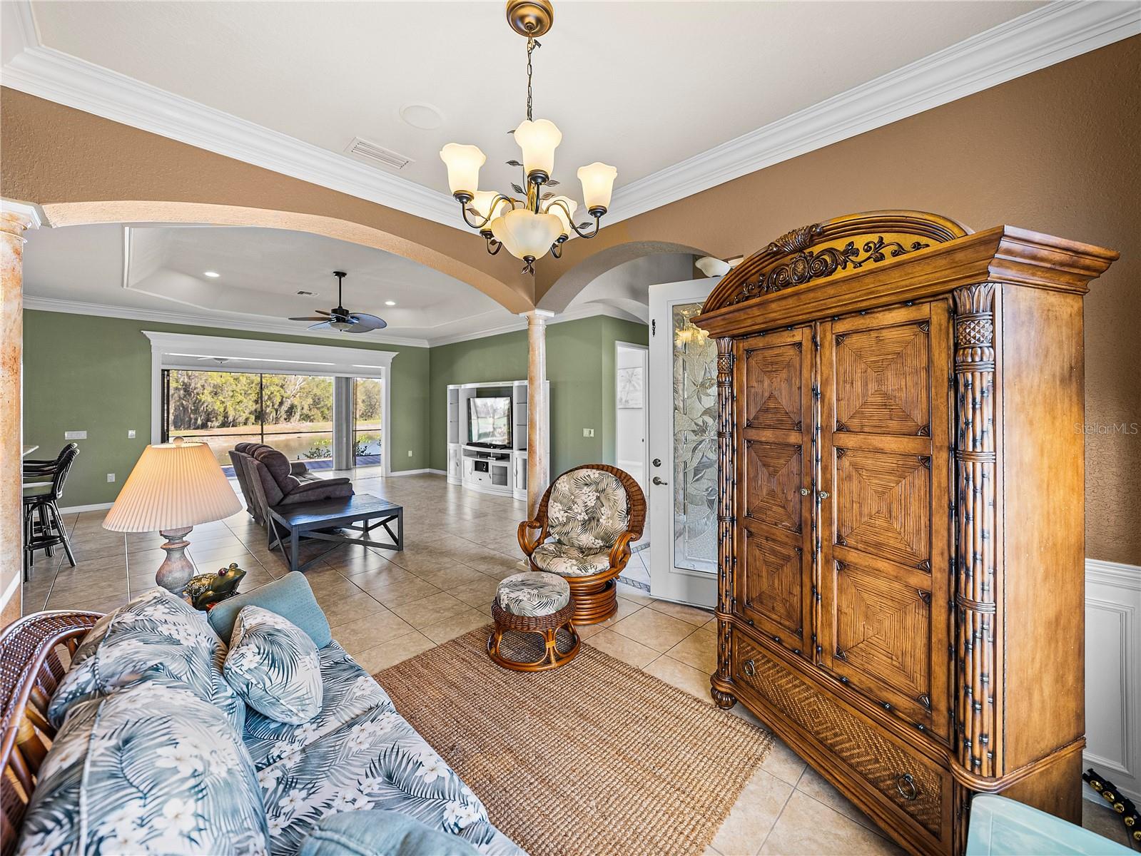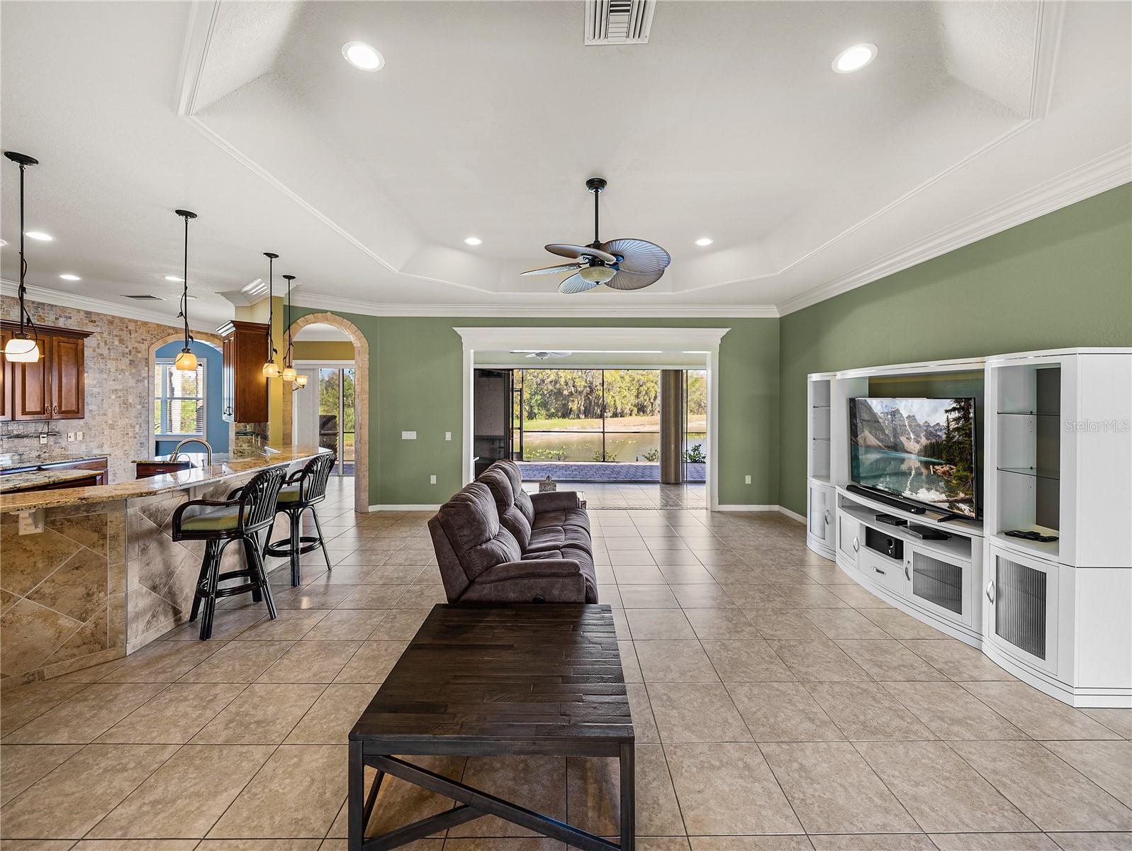 PRICE REDUCTION on this Stunning St John Floor Plan with Water and Nature views, featuring 3 bedrooms PLUS a den and 2 bathrooms with an enclosed Florida room and extended screened in Lanai. This Custom-built floor plan has so many upgrades you must see to appreciate. To Start, the front of the house has custom stacked stone, power screen on garage door, lush landscaping, front paver patio, enclosed screen entrance and beautiful beveled double glass doors. When you enter there are round columns that set off the dining room area from the Great room and raised stone archways that lead you to the kitchen and breakfast nook area. Coffered ceilings with recessed lighting and ceiling fan will also be found in the Great room and double crown molding is throughout the entire home. This custom built chefs kitchen has bank of drawers, beautiful raised panel 42" custom cabinets with crown molding, stainless steel appliances, large island for prepping with additional storage, pendant lighting over breakfast bar and Granite countertops. In the primary bedroom you have sliding doors leading to the enclosed lanai and a wonderful view to wake up to. The en-suite bathroom has two walk in closets, a walk in shower, double vanities, linen closet and a large soaking tub. The guest bedrooms are on the opposite side of the home giving guests privacy with a guest bathroom between them both. You will find a large walk in pantry, a large laundry room with washer and dryer that convey with the home. UPGRADES ALSO INCLUDE; New roof 2024, New AC 2022, New Kinetico whole house water softener, New refrigerator 2025, New Dishwasher and Stove 2022, New additional screened room with pavers 2022, & upgraded landscaping 2022. CDD BOND DEBT PAID IN FULL. Don’t miss out on this amazing home with views of the pond, woods, and Lake. The community offers tons of amenities with two clubhouses, two 18 hole golf courses, bowling alley, movie theatre, craft rooms, card rooms, billiards, pickleball, tennis, bocce and so much more you have to visit to appreciate it.