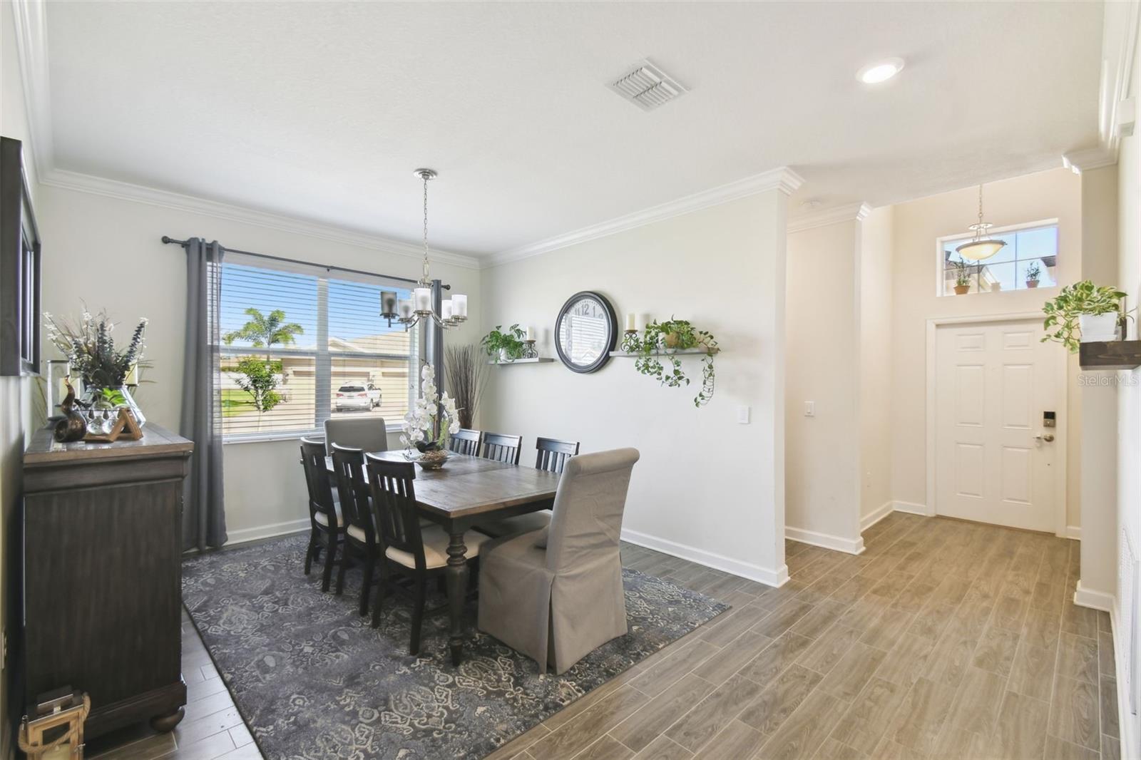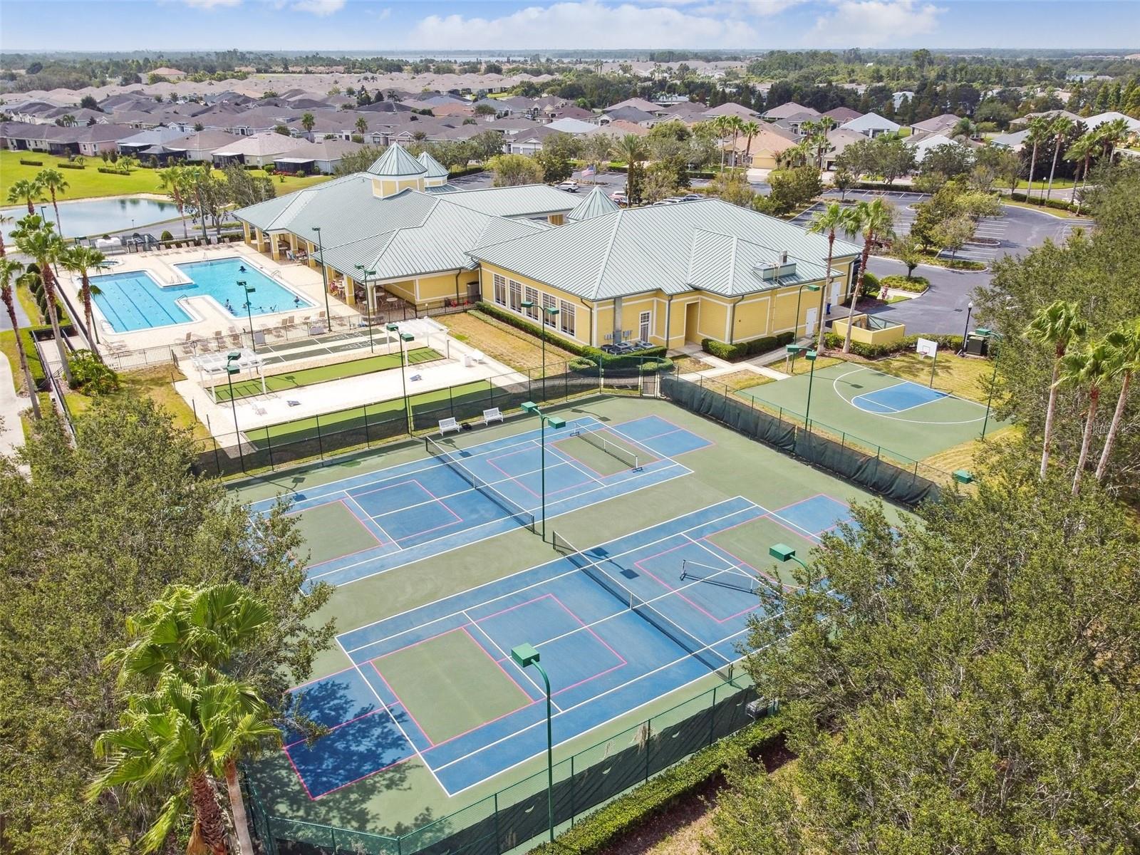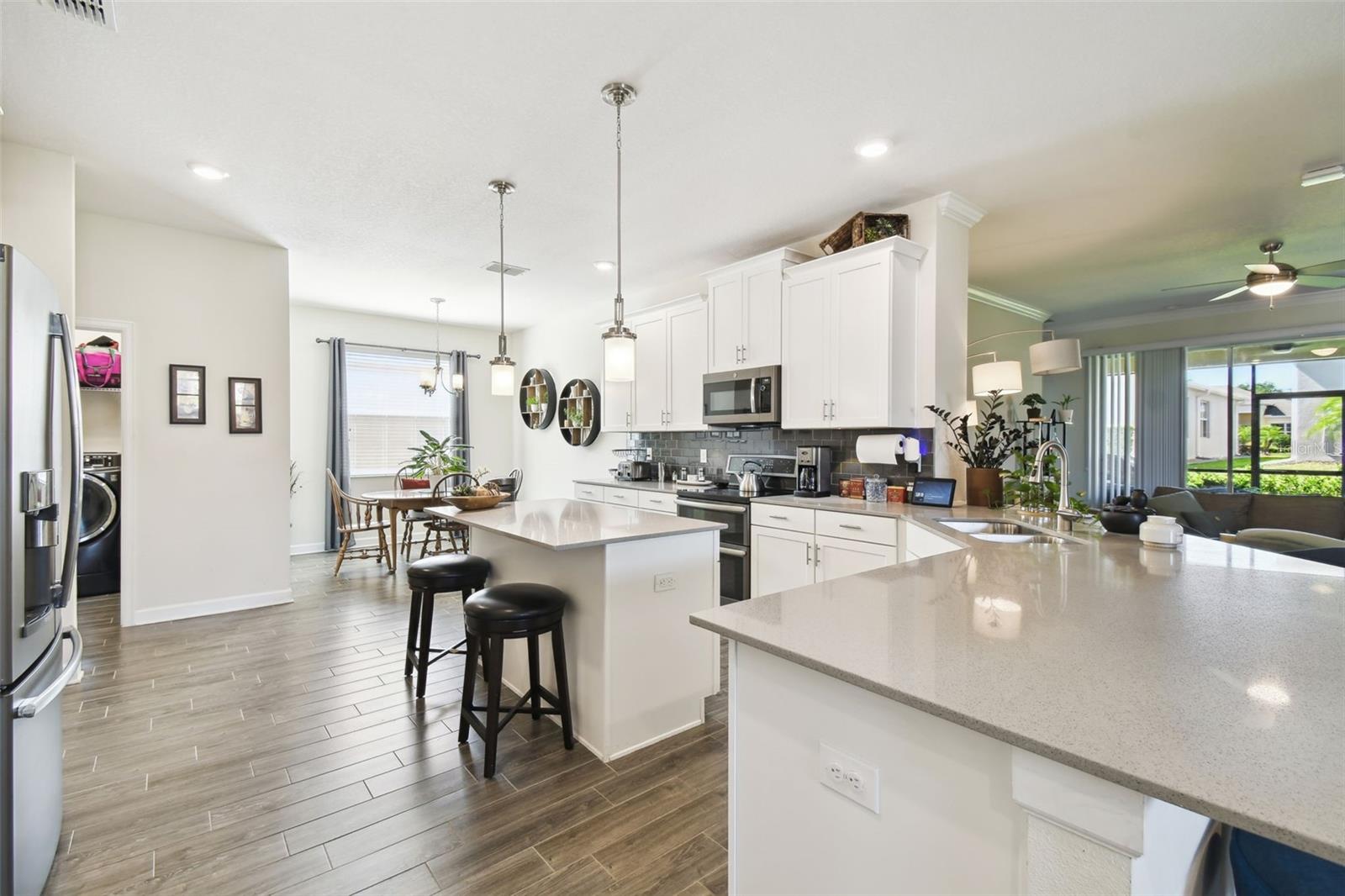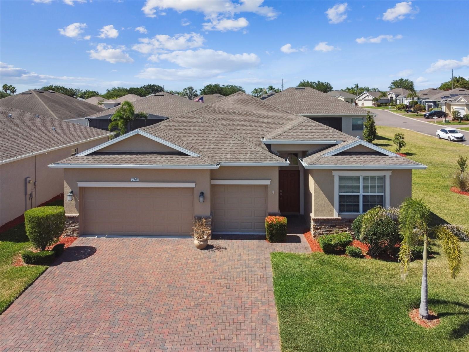 Welcome to maintenance-free living in Traditions at Lake Ruby, one of Central Florida’s premier 55+ communities. Enjoy private lake access, a 19,000 square-foot clubhouse, heated pool and spa, tennis and pickleball, fitness center, dog park, boat slips, and a full calendar of events, all just minutes from shopping, dining, and medical care. Set on a prime corner lot, this four-bedroom, three-bath home offers over 2,300 square feet of bright, open living space and is impeccably maintained. High ceilings, tile flooring, crown molding, and hurricane-rated windows create a comfortable and secure interior. The gourmet kitchen features quartz countertops, 42-inch solid wood cabinets, stainless steel appliances, and a cheerful breakfast nook all flowing into the spacious great room and formal dining area. The split floor plan includes a generous primary suite with spa-style bath and walk-in closet, a front guest suite with private bath, and two additional guest rooms with a shared full bath. The screened lanai offers a peaceful place to relax outdoors, and the oversized three-car garage provides plenty of room for vehicles, storage, or hobbies. Smart home features and optional furnishings make this an easy, move-in-ready choice for year-round or seasonal living. HOA dues include lawn care, annual mulch replacement, exterior painting every 5 years, cable, internet, and full access to community amenities.