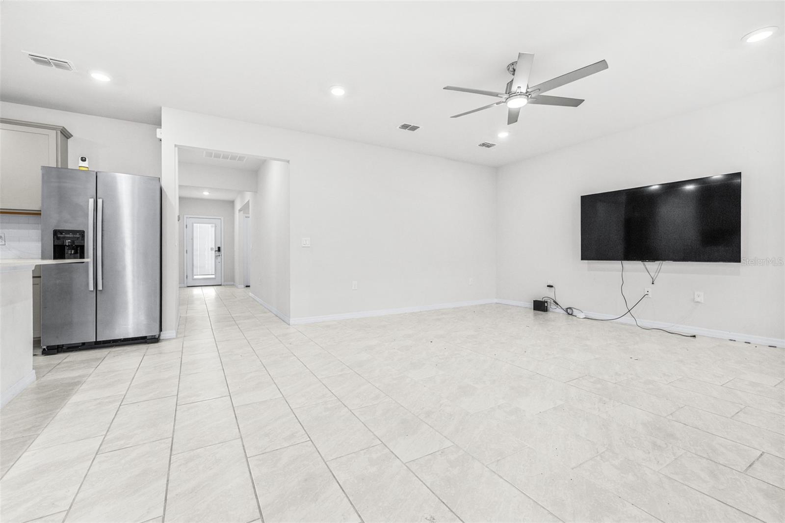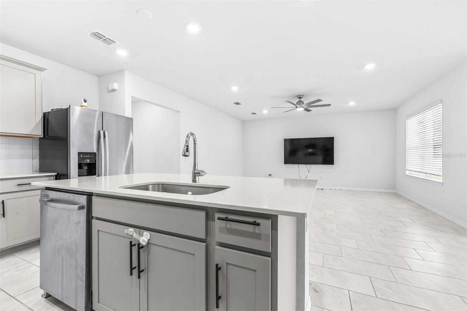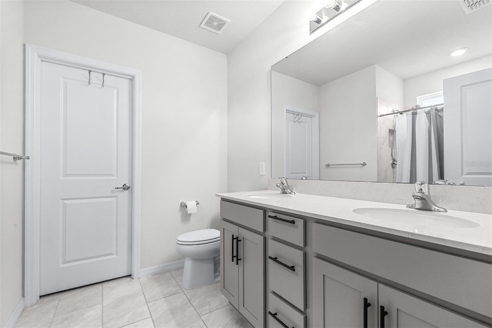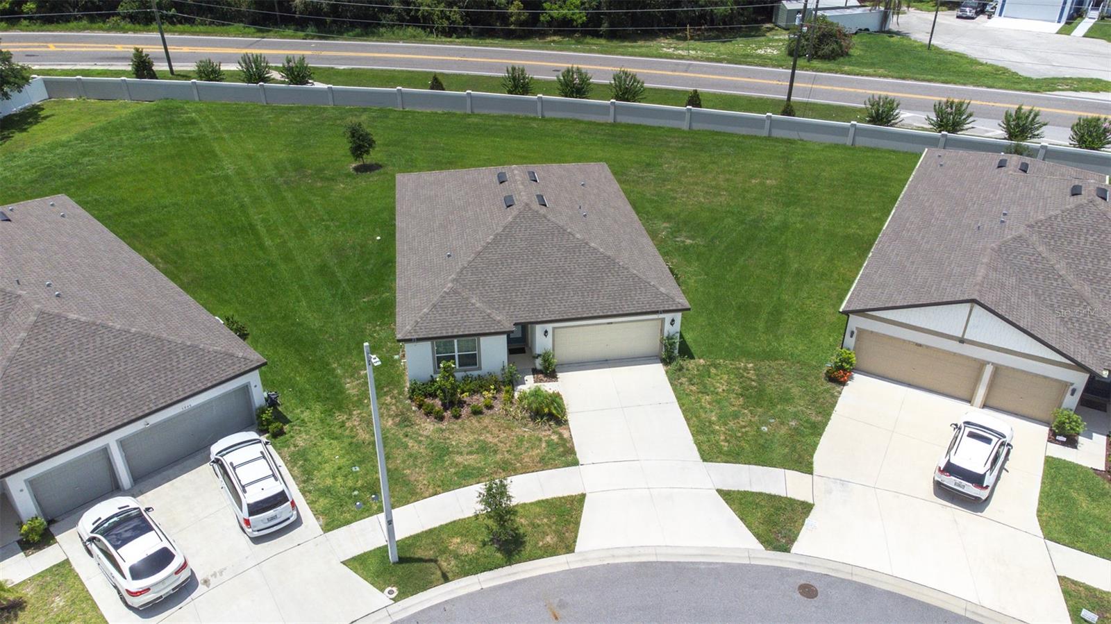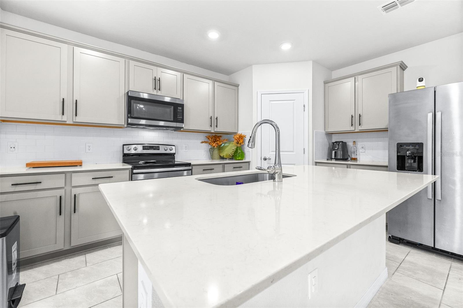 This 3-bedroom, 2-bathroom home features gray cabinets, quartz countertops in the kitchen and bathrooms, and ceramic tile flooring in all main areas. The owner's suite includes a large walk-in closet. The kitchen has an integrated island and a walk-in pantry. Located on an oversized wedge lot. 13,874 SqFt Over 1/4 acre of land, Huge lot.