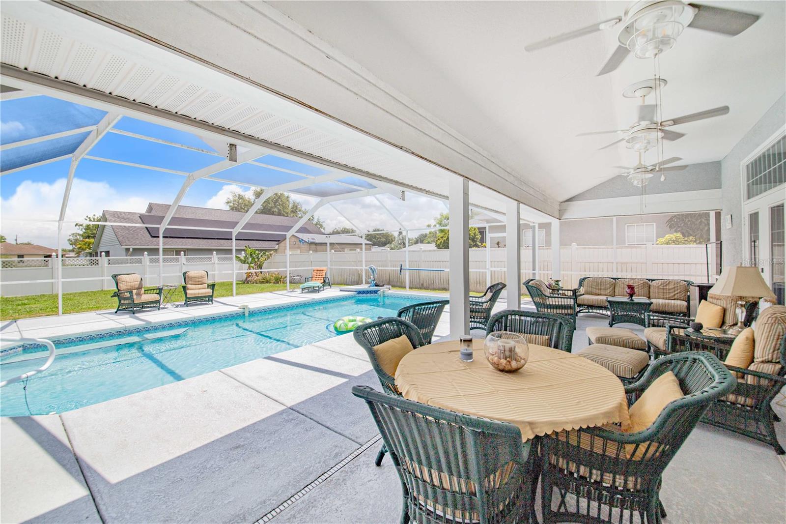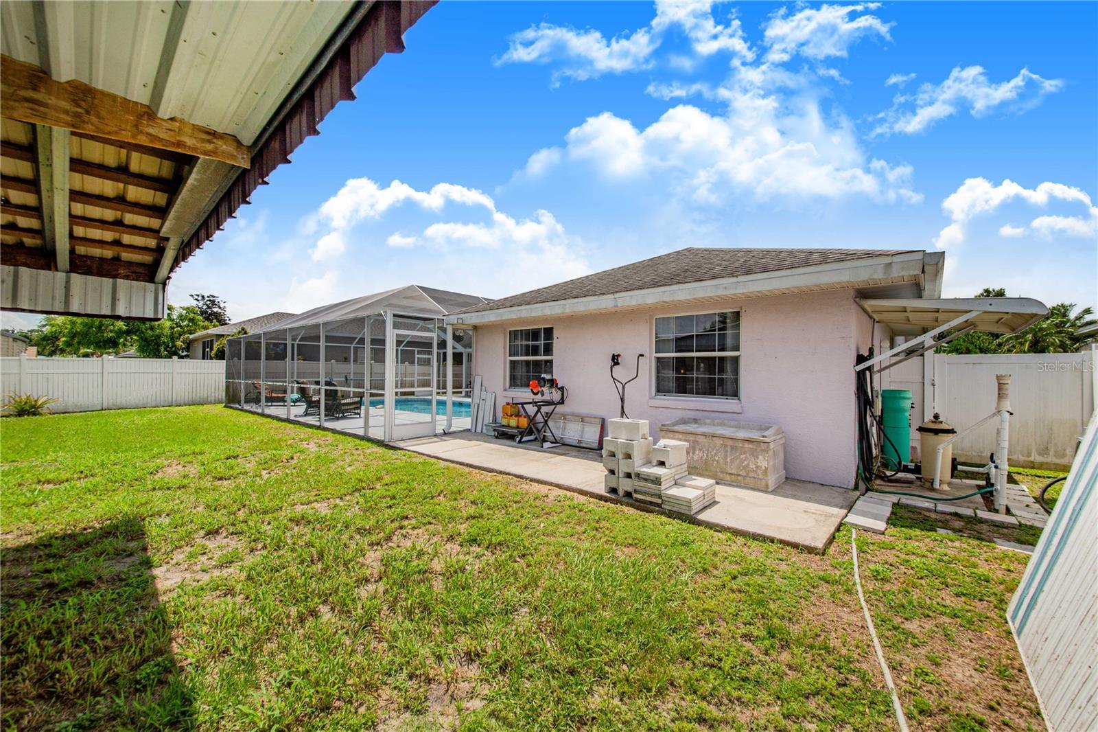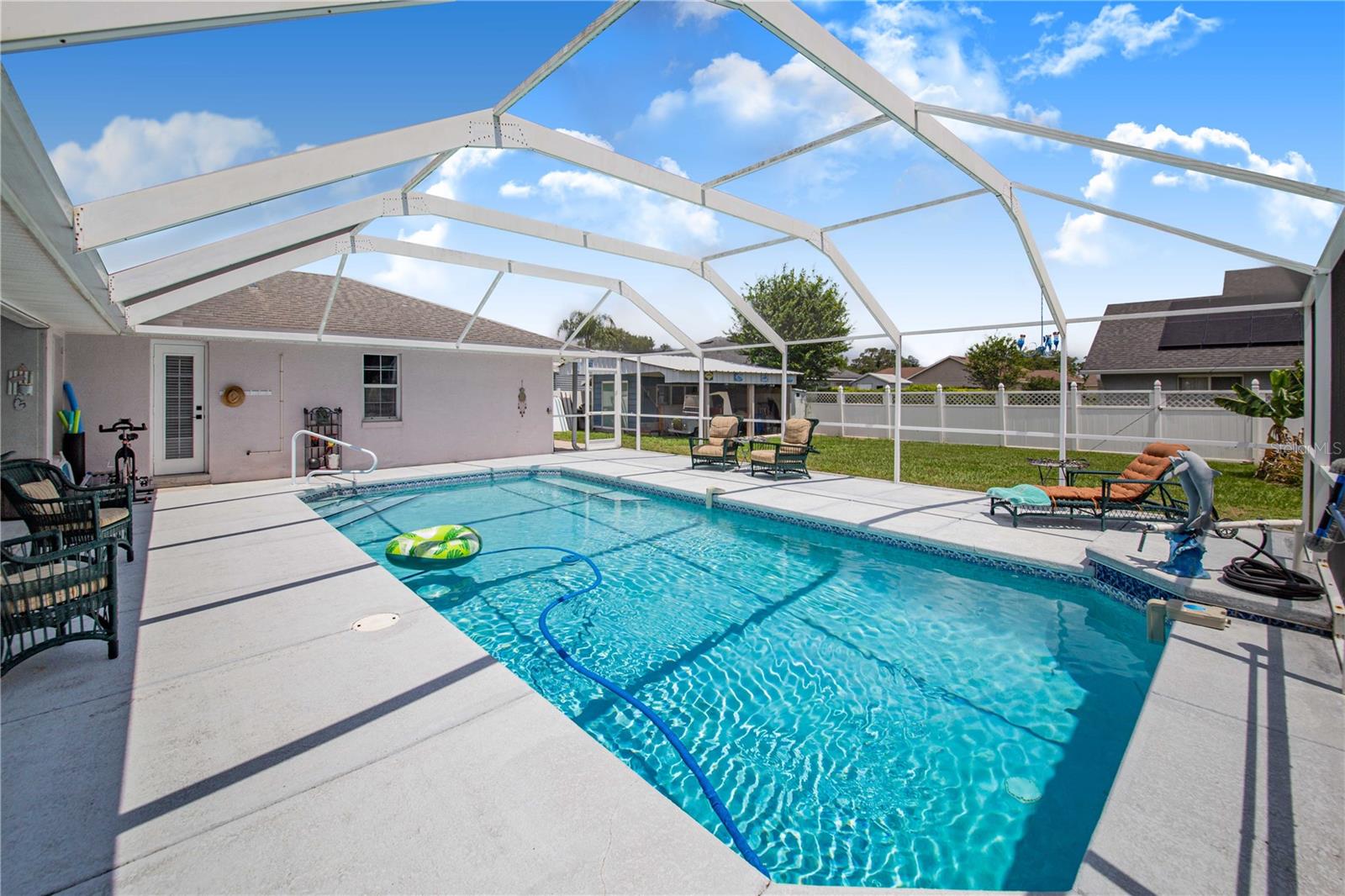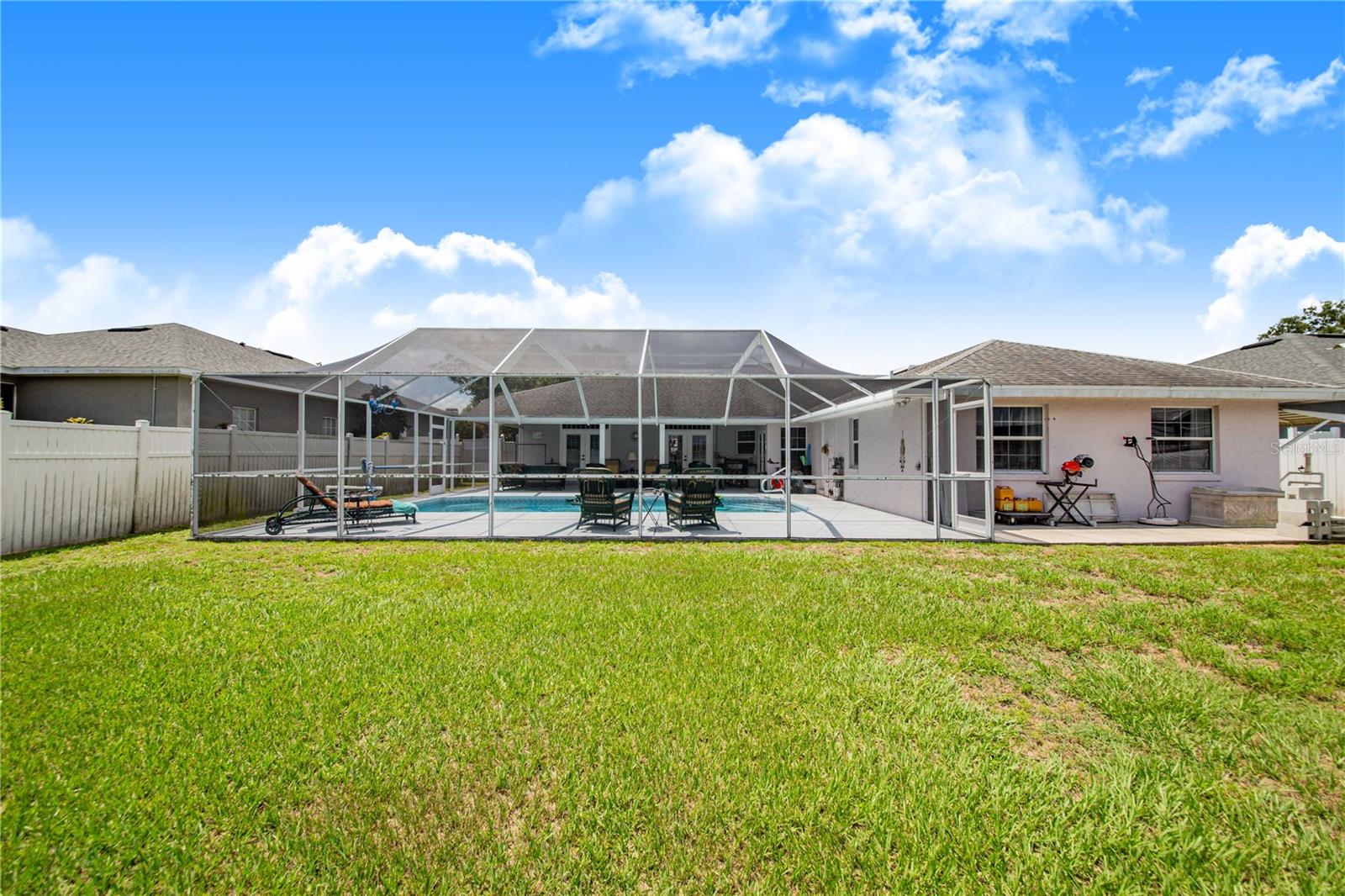 Welcome to this spacious and beautifully designed pool home, perfect for entertaining and family living! As you step through the front door, you’re welcomed by a tiled foyer leading to a formal dining room with elegant wood laminate flooring and a cozy den that overlooks the pool area. The kitchen features tile flooring, a gas stove, abundant cabinetry, and a farmhouse sink with views of the pool and backyard. A charming breakfast nook also looks out onto the lanai, making mornings bright and relaxing. The indoor laundry room includes built-in cabinetry for added convenience. The home boasts a split floor plan with three bedrooms located on one side, offering privacy and space for a growing family. The master suite features wood flooring, a walk-in closet, and a luxurious en-suite bath with tile flooring, a garden tub, walk-in shower, dual sinks, a linen closet, and decorative barn door-style shutters on a picturesque window above the tub. The spacious living room with wood flooring is ideal for relaxing or entertaining. A guest bathroom offers direct access to the pool area for added convenience. Outside, enjoy the screened chlorine pool, covered lanai with ceiling fans, and a dedicated cooking area—an entertainer’s dream! The backyard is fully enclosed with vinyl fencing for added privacy.C Additional highlights include a detached workshop—perfect for hobbies or extra storage—and a prime Central Florida location just minutes from major highways and theme parks.