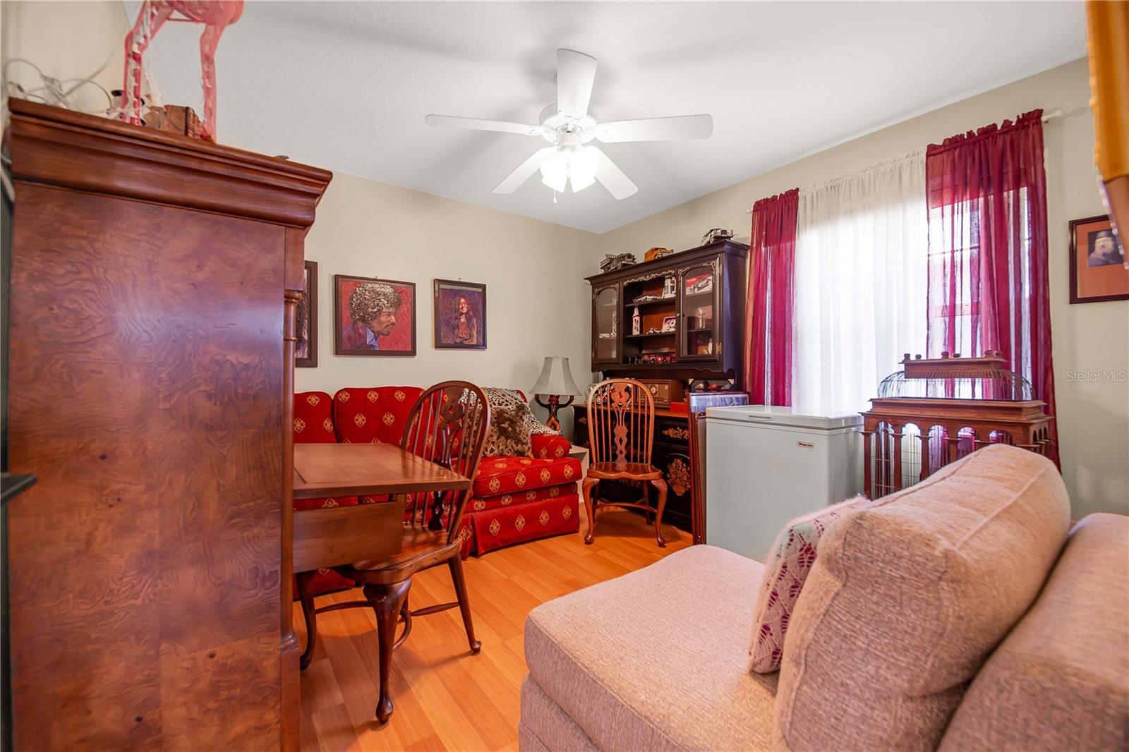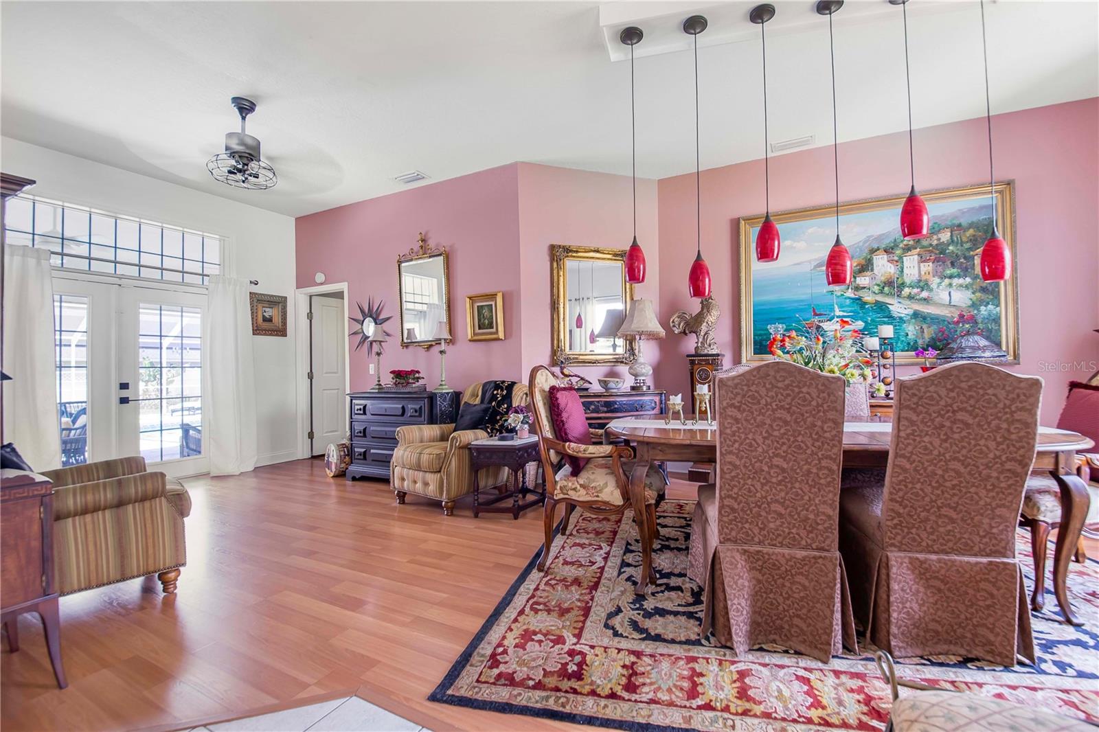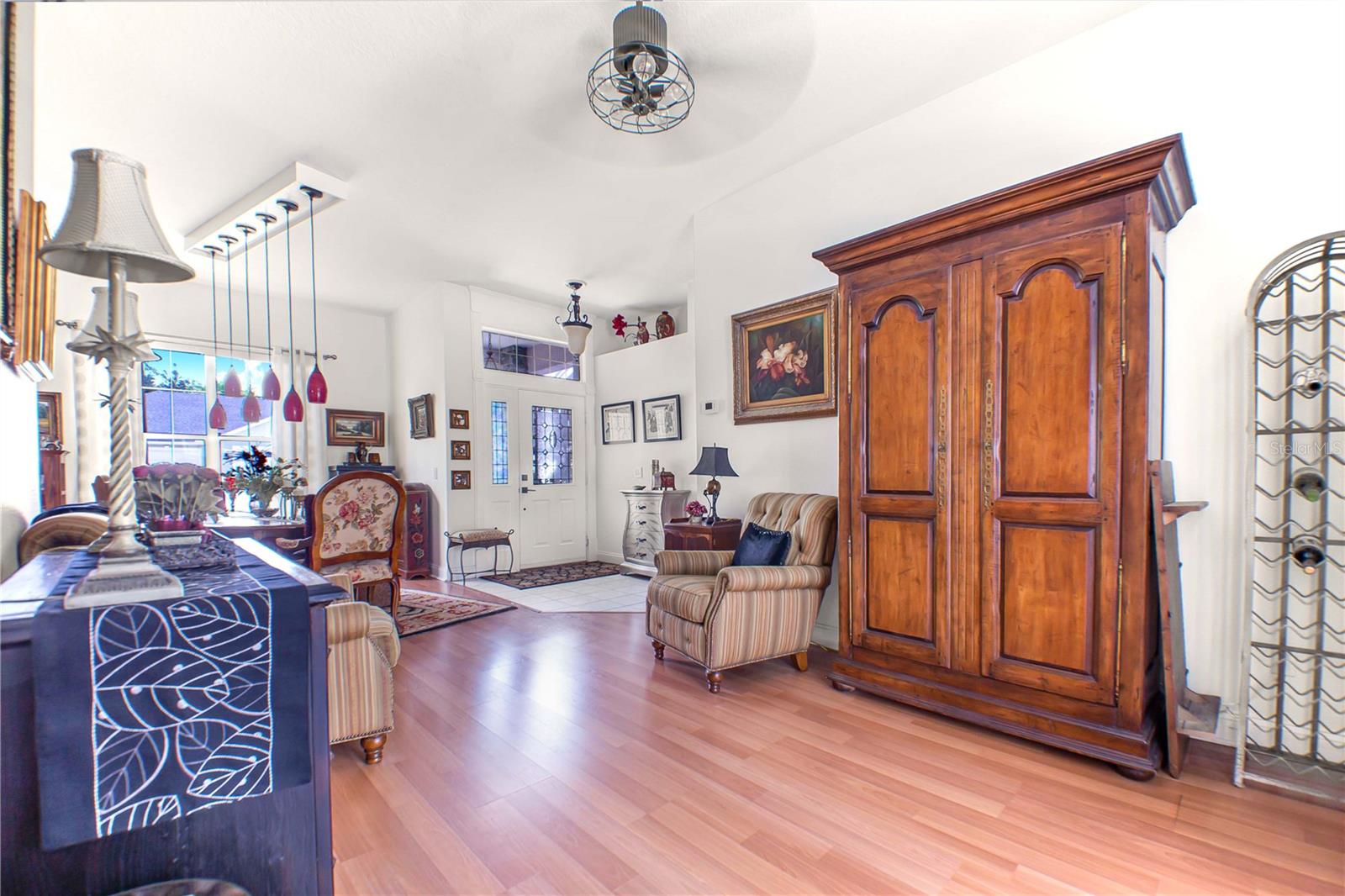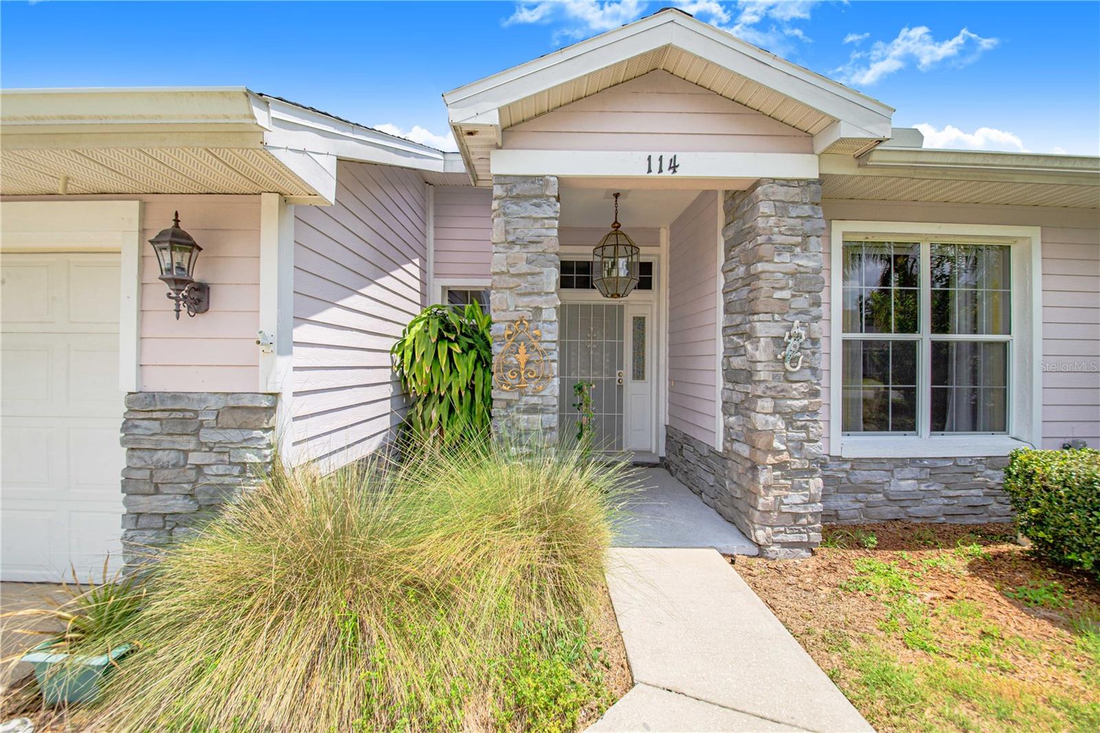 Welcome to this spacious and beautifully designed pool home, perfect for entertaining and family living! As you step through the front door, you’re welcomed by a tiled foyer leading to a formal dining room with elegant wood laminate flooring and a cozy den that overlooks the pool area. The kitchen features tile flooring, a gas stove, abundant cabinetry, and a farmhouse sink with views of the pool and backyard. A charming breakfast nook also looks out onto the lanai, making mornings bright and relaxing. The indoor laundry room includes built-in cabinetry for added convenience. The home boasts a split floor plan with three bedrooms located on one side, offering privacy and space for a growing family. The master suite features wood flooring, a walk-in closet, and a luxurious en-suite bath with tile flooring, a garden tub, walk-in shower, dual sinks, a linen closet, and decorative barn door-style shutters on a picturesque window above the tub. The spacious living room with wood flooring is ideal for relaxing or entertaining. A guest bathroom offers direct access to the pool area for added convenience. Outside, enjoy the screened chlorine pool, covered lanai with ceiling fans, and a dedicated cooking area—an entertainer’s dream! The backyard is fully enclosed with vinyl fencing for added privacy.C Additional highlights include a detached workshop—perfect for hobbies or extra storage—and a prime Central Florida location just minutes from major highways and theme parks.
