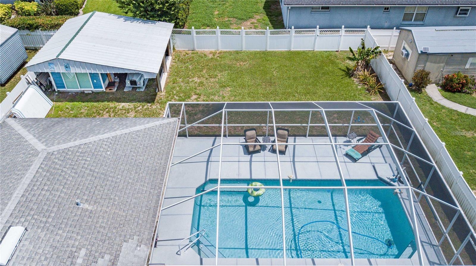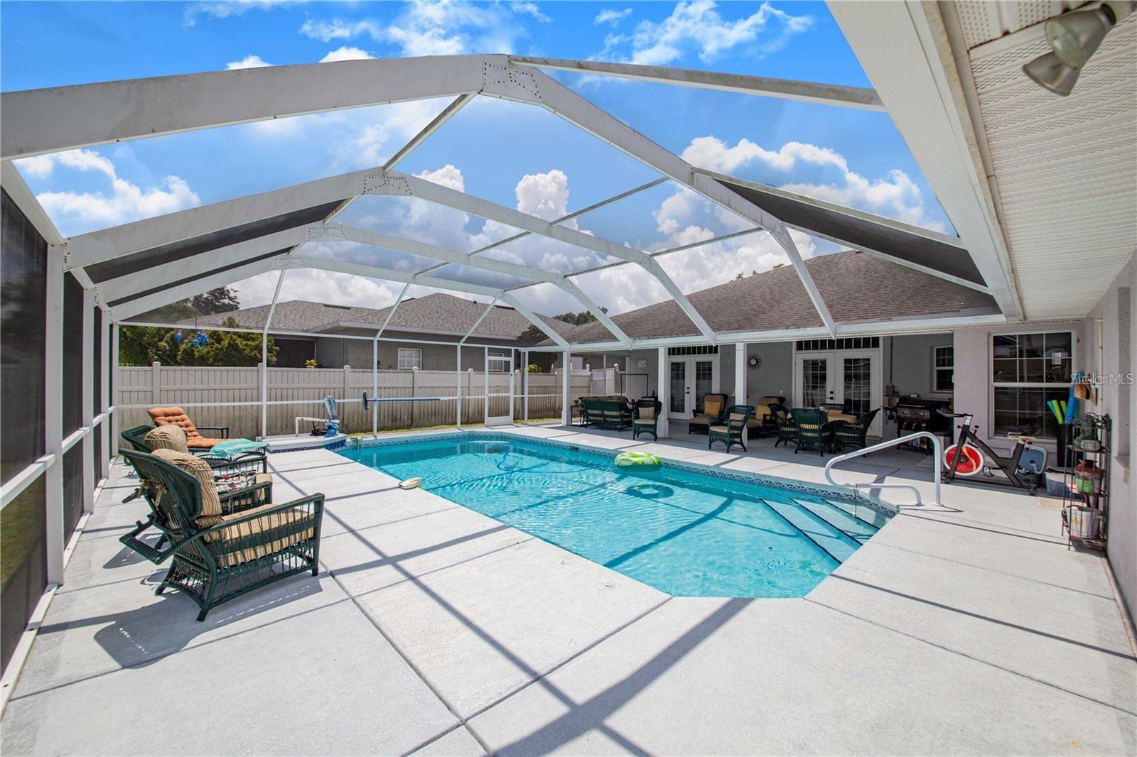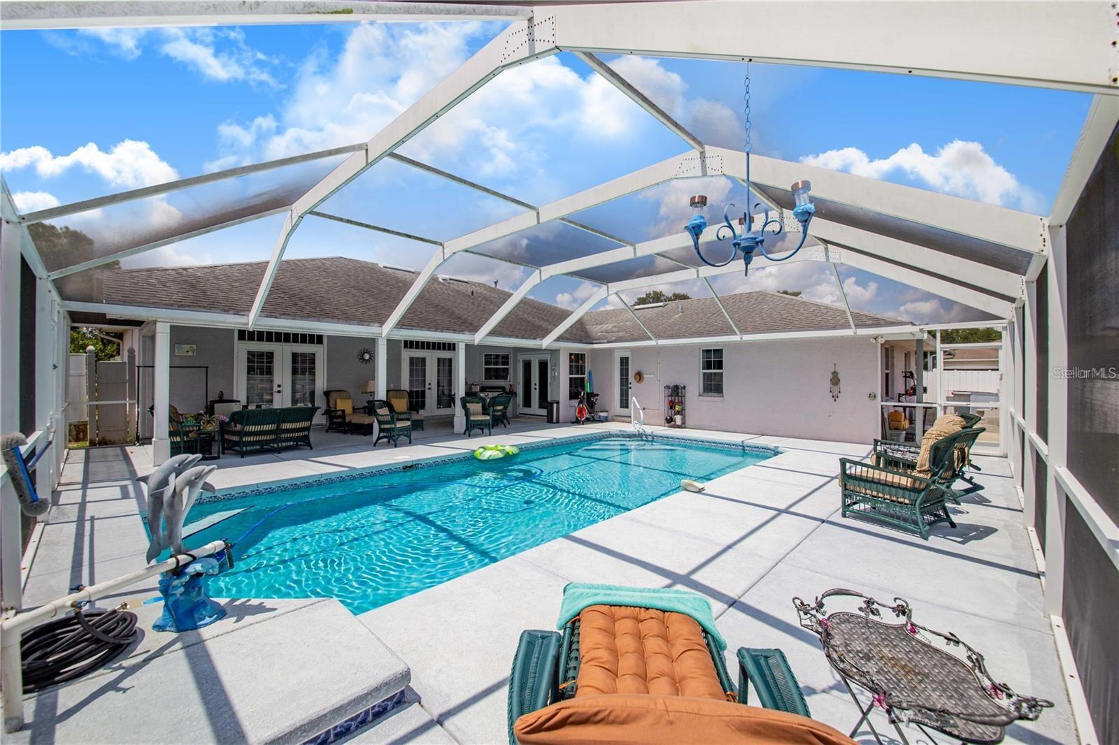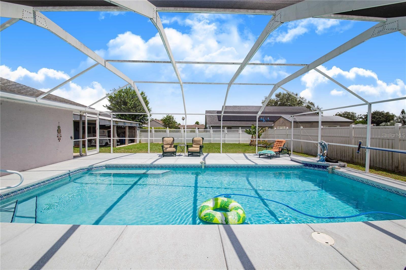 Welcome to this spacious and beautifully designed pool home, perfect for entertaining and family living! As you step through the front door, you’re welcomed by a tiled foyer leading to a formal dining room with elegant wood laminate flooring and a cozy den that overlooks the pool area. The kitchen features tile flooring, a gas stove, abundant cabinetry, and a farmhouse sink with views of the pool and backyard. A charming breakfast nook also looks out onto the lanai, making mornings bright and relaxing. The indoor laundry room includes built-in cabinetry for added convenience. The home boasts a split floor plan with three bedrooms located on one side, offering privacy and space for a growing family. The master suite features wood flooring, a walk-in closet, and a luxurious en-suite bath with tile flooring, a garden tub, walk-in shower, dual sinks, a linen closet, and decorative barn door-style shutters on a picturesque window above the tub. The spacious living room with wood flooring is ideal for relaxing or entertaining. A guest bathroom offers direct access to the pool area for added convenience. Outside, enjoy the screened chlorine pool, covered lanai with ceiling fans, and a dedicated cooking area—an entertainer’s dream! The backyard is fully enclosed with vinyl fencing for added privacy.C Additional highlights include a detached workshop—perfect for hobbies or extra storage—and a prime Central Florida location just minutes from major highways and theme parks.