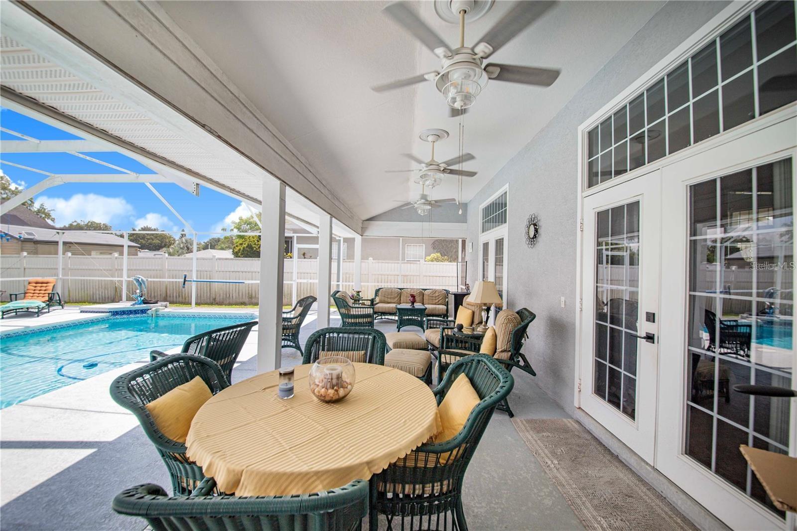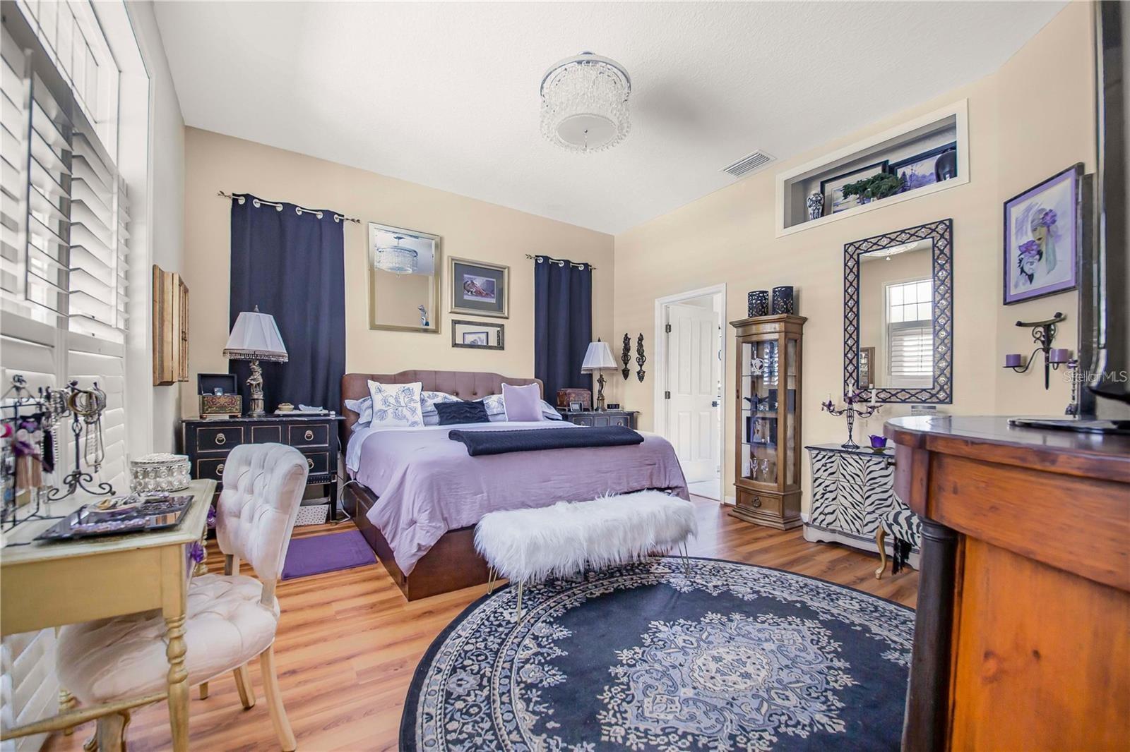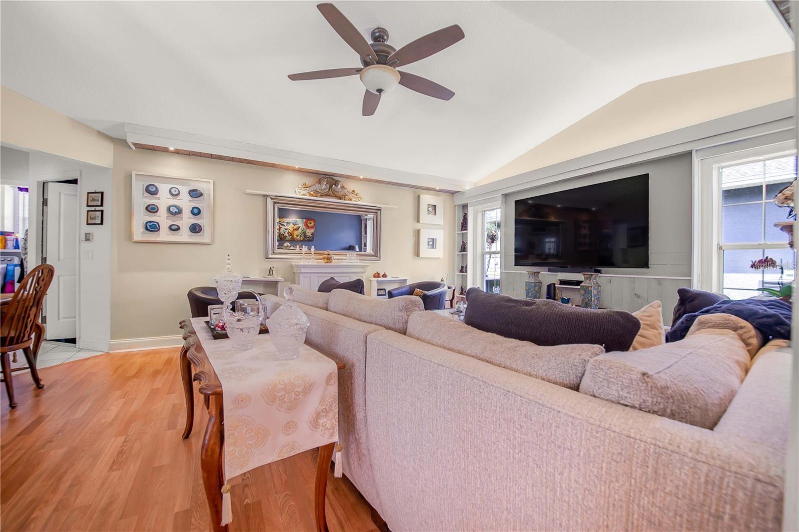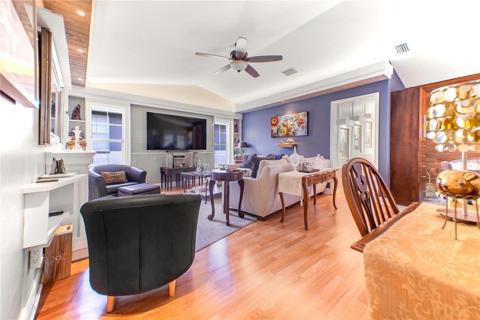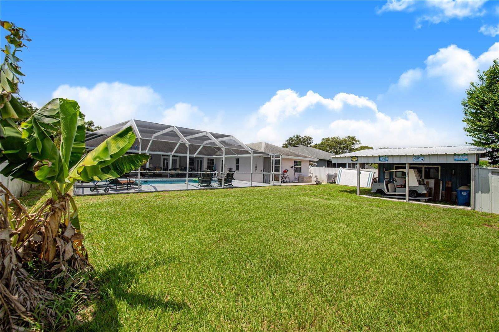 Welcome to this spacious and beautifully designed pool home, perfect for entertaining and family living! As you step through the front door, you’re welcomed by a tiled foyer leading to a formal dining room with elegant wood laminate flooring and a cozy den that overlooks the pool area. The kitchen features tile flooring, a gas stove, abundant cabinetry, and a farmhouse sink with views of the pool and backyard. A charming breakfast nook also looks out onto the lanai, making mornings bright and relaxing. The indoor laundry room includes built-in cabinetry for added convenience. The home boasts a split floor plan with three bedrooms located on one side, offering privacy and space for a growing family. The master suite features wood flooring, a walk-in closet, and a luxurious en-suite bath with tile flooring, a garden tub, walk-in shower, dual sinks, a linen closet, and decorative barn door-style shutters on a picturesque window above the tub. The spacious living room with wood flooring is ideal for relaxing or entertaining. A guest bathroom offers direct access to the pool area for added convenience. Outside, enjoy the screened chlorine pool, covered lanai with ceiling fans, and a dedicated cooking area—an entertainer’s dream! The backyard is fully enclosed with vinyl fencing for added privacy.C Additional highlights include a detached workshop—perfect for hobbies or extra storage—and a prime Central Florida location just minutes from major highways and theme parks.