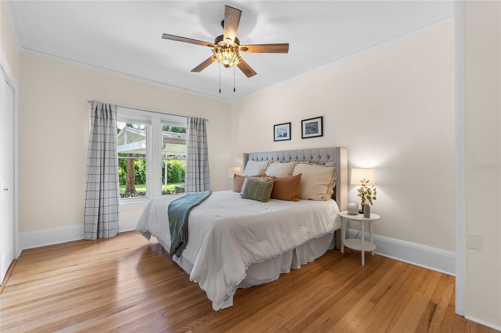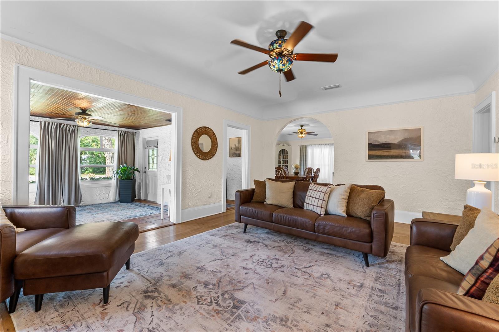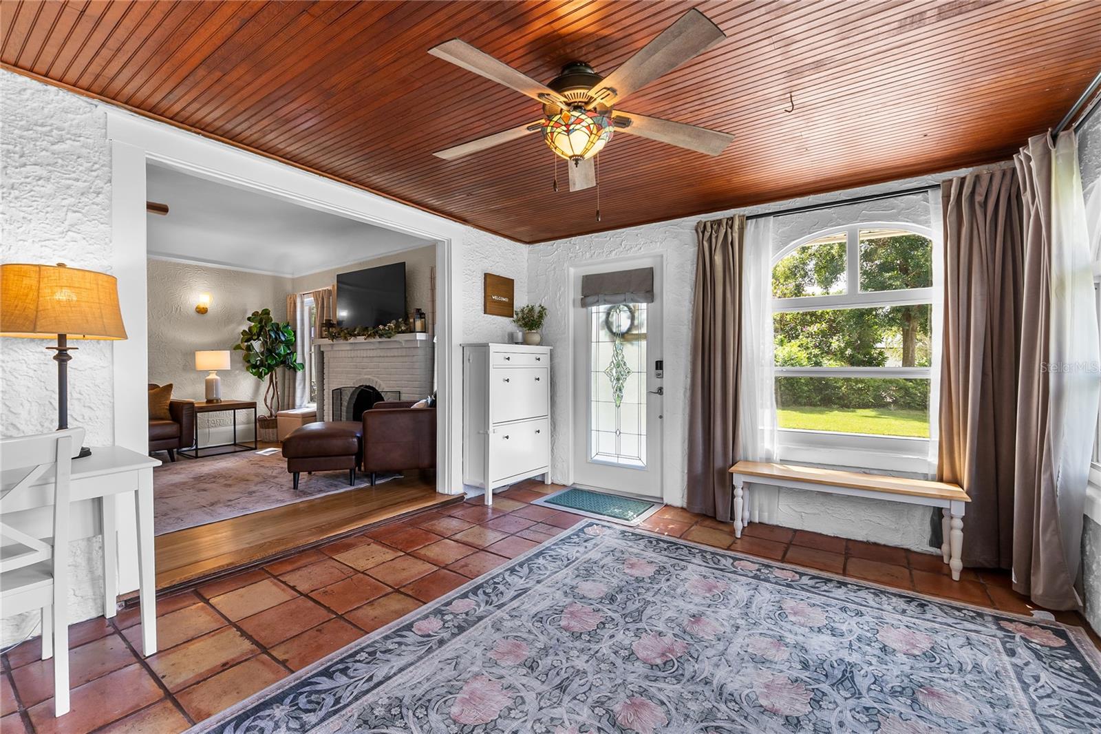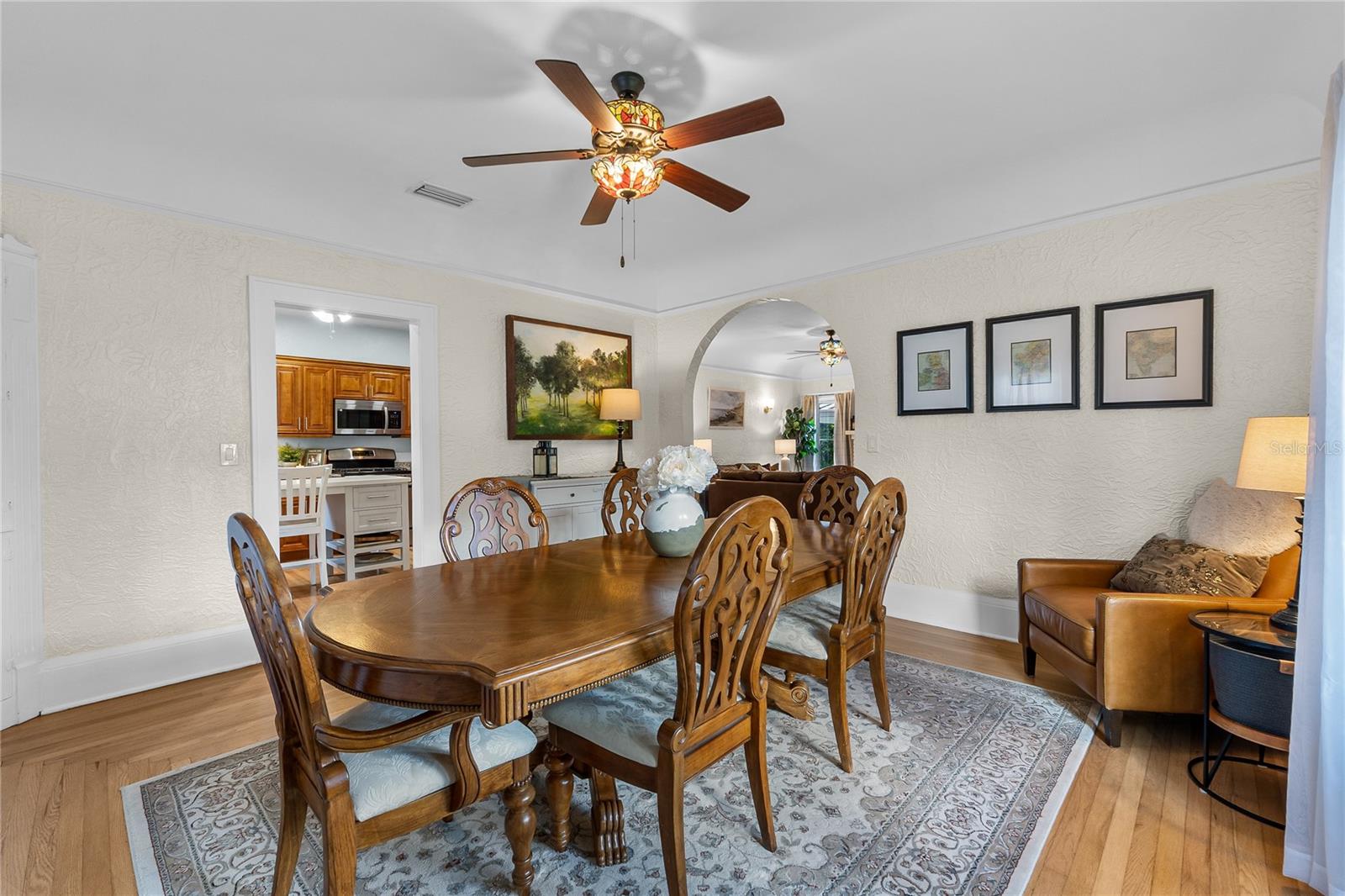 Beautifully restored and extensively renovated in 2021–2022, this Mediterranean Revival residence combines historic charm with modern comfort. Major system upgrades include a new roof, new electrical, new plumbing, new HVAC systems with new ductwork, and a well-fed sprinkler system—rare peace of mind for a historic home. Additional improvements include refinished hardwood floors, replastered and retextured walls, remodeled kitchen and baths, fresh interior/exterior paint, Tiffany-style fans, and period-inspired lighting. With city water and city sewer, this home lives effortlessly while retaining its timeless Spanish bungalow character. Ideally positioned across from Lake Cannon and near Lake Mirror on the scenic Winter Haven Chain of Lakes, the property is surrounded by tree-lined streets, beautifully preserved older homes, and refreshing lake breezes. Curb appeal shines with a textured stucco exterior, arched windows, mature palms, and an oversized double lot. A covered two-car carport, new concrete driveway, detached workshop, and professional landscaping complete the exterior. Inside, the home offers warm, inviting spaces filled with architectural detail. The formal living room features Saltillo tile floors, beadboard ceilings, and arched windows overlooking lush gardens. Nearby, the family room showcases original hardwood floors, a coved ceiling, and a gas-burning brick fireplace. A cozy computer nook provides a convenient work or study area. The formal dining room highlights softly curved ceilings, arched transitions, and charming glass-front corner built-ins. The updated kitchen blends vintage styling with modern function—wood cabinetry, soft-close drawers, granite counters, stainless steel appliances, and a walk-in pantry with laundry connections. Three bedrooms and two beautifully remodeled baths include a primary suite with French doors opening directly to the rear patio. Outdoor living is exceptional, with a private patio and a large backyard ideal for entertaining, gardening, or relaxing. The detached 18x19 workshop—complete with roll-up door, electricity, and concrete slab—offers space for woodworking, storage, or hobby use. Just minutes from downtown Winter Haven, shopping, dining, medical facilities, and major highways, this move-in-ready historic home provides quick access to public boat ramps and the full Chain of Lakes lifestyle. A rare opportunity to own a thoughtfully restored Spanish bungalow where character and modern updates blend seamlessly.