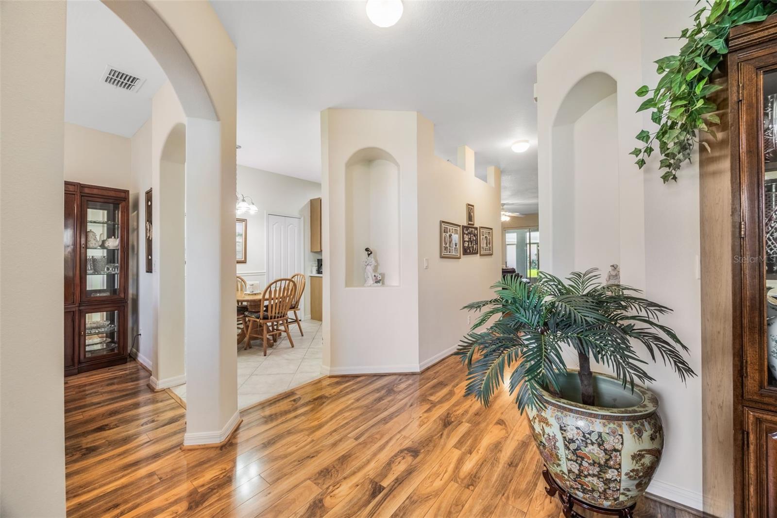 Located in the premier active adult gated community of Traditions at Lake Ruby, this exceptional home sits on a premium lot with picturesque pond views. Featuring a desirable split-bedroom floor plan with 3 bedrooms and 2 baths, this property offers the perfect blend of luxury, functionality, and tranquil living. Upon arrival, you’re welcomed by a large covered entrance enhanced with a leaded glass door and transom window. Step inside to find a thoughtfully designed interior that seamlessly combines comfort and elegance. The eat-in kitchen is beautifully appointed with 42" maple wood cabinetry accented by rain glass inserts, Corian countertops, and a convenient closet pantry. A breakfast bar and cozy breakfast nook provide ample seating—ideal for everyday dining or entertaining. The spacious great room showcases triple glass sliding doors that frame stunning views of the pond and lead to the oversized Florida room, expanding your living space and inviting the outdoors in. Additional gathering areas include a formal dining room and a formal living room, both enhanced with high ceilings and stylish laminate flooring. The primary suite is a true retreat, complete with a cozy sitting area overlooking the water and private access to the Florida Room, through sliding glass doors. The primary suite features dual walk-in closets with overhead luggage shelving and a luxurious en-suite bathroom offering, a Comfort-height double-sink vanity, Linen closet, Seated walk-in shower, Private water closet and Spacious garden tub Enjoy year-round indoor/outdoor living in the generously sized Florida room, where tranquil pond views and the soothing sound of a cascading fountain create a peaceful ambiance. Additional Features Include: Laundry room with washer, dryer, and utility sink, Updated roof (2021), AC unit (2024), Water heater (2018), Solid Surface Flooring thru out, Gutters, Security system, Paved driveway and walkway, Carriage-style exterior lighting, Two-car garage with door opener and an additional refrigerator. Traditions at Lake Ruby offers resort-style living with access to a lakefront clubhouse, dock, and boat ramp, as well as a heated swimming pool and spa. Residents enjoy a wide array of activities and amenities, including: Ballroom, Billiards, Meeting and craft rooms, Library and computer center, Dog park, Tennis and pickleball courts, Basketball and bocce ball, Shuffleboard, Fitness center and aerobics studio and more. Conveniently located near shopping, dining, major highways, and Legoland, this home provides an exceptional lifestyle. Monthly HOA fees include exterior house painting, cable, internet, lawn service, and full access to all clubhouse amenities -offering a truly worry-free living experience.