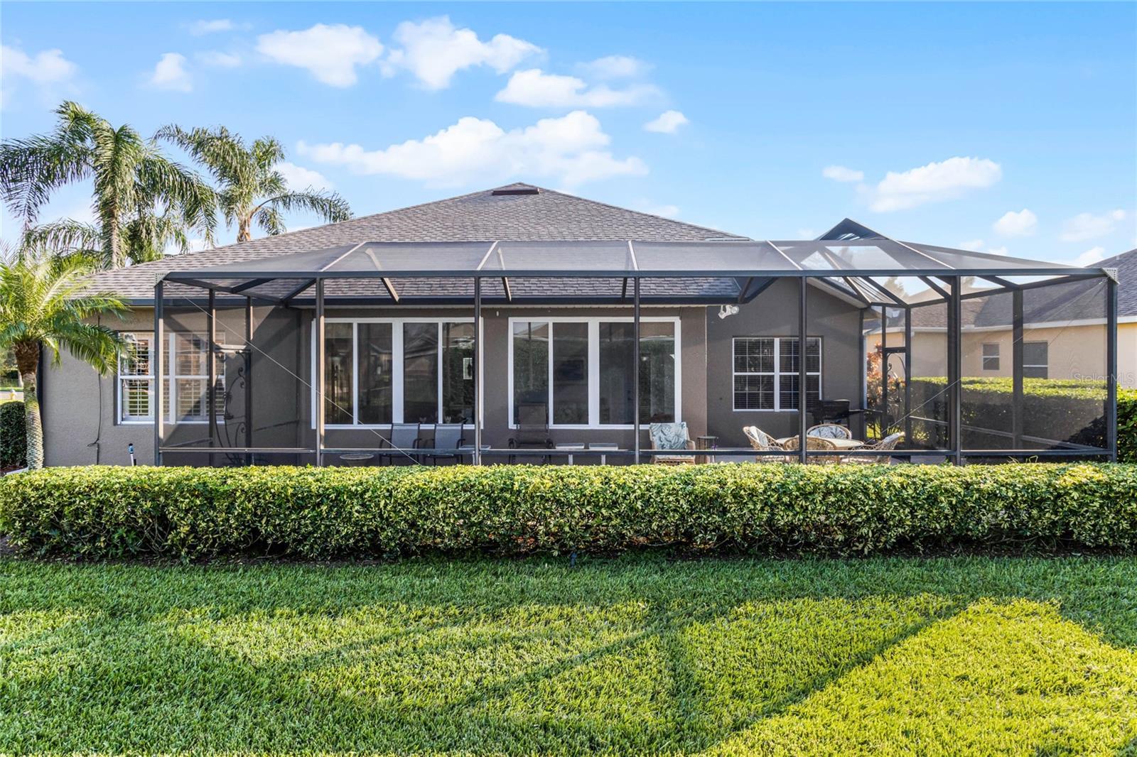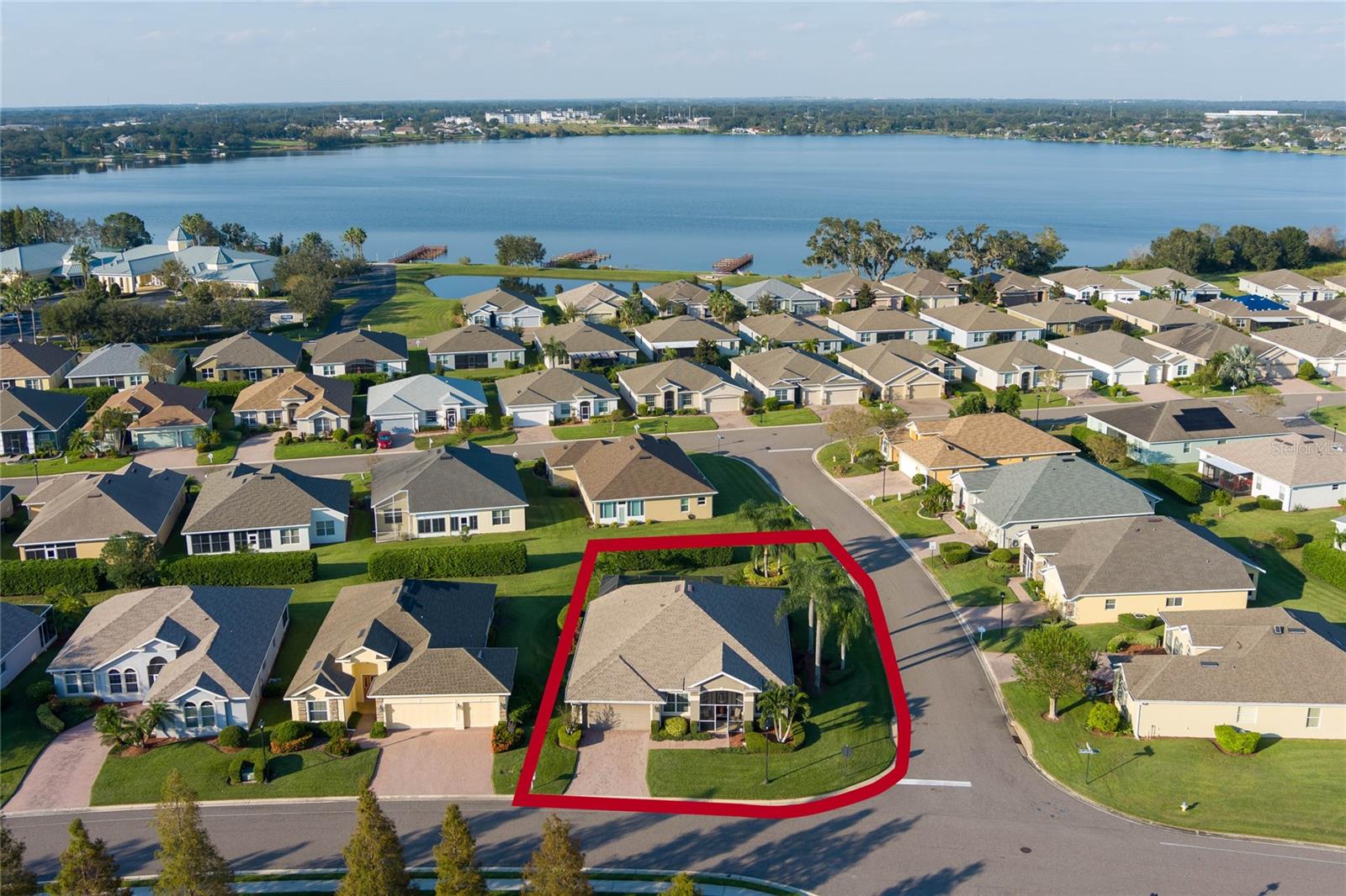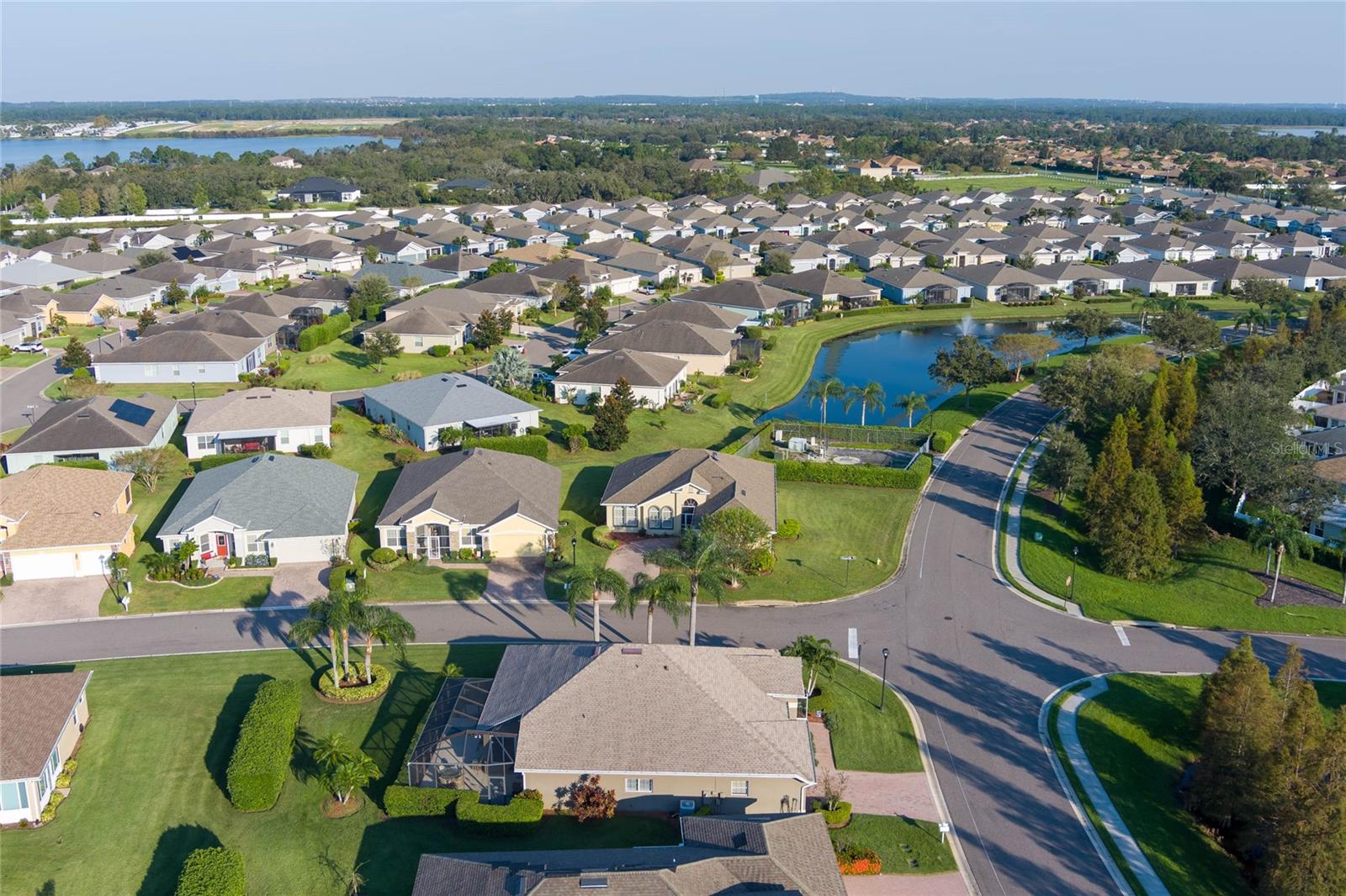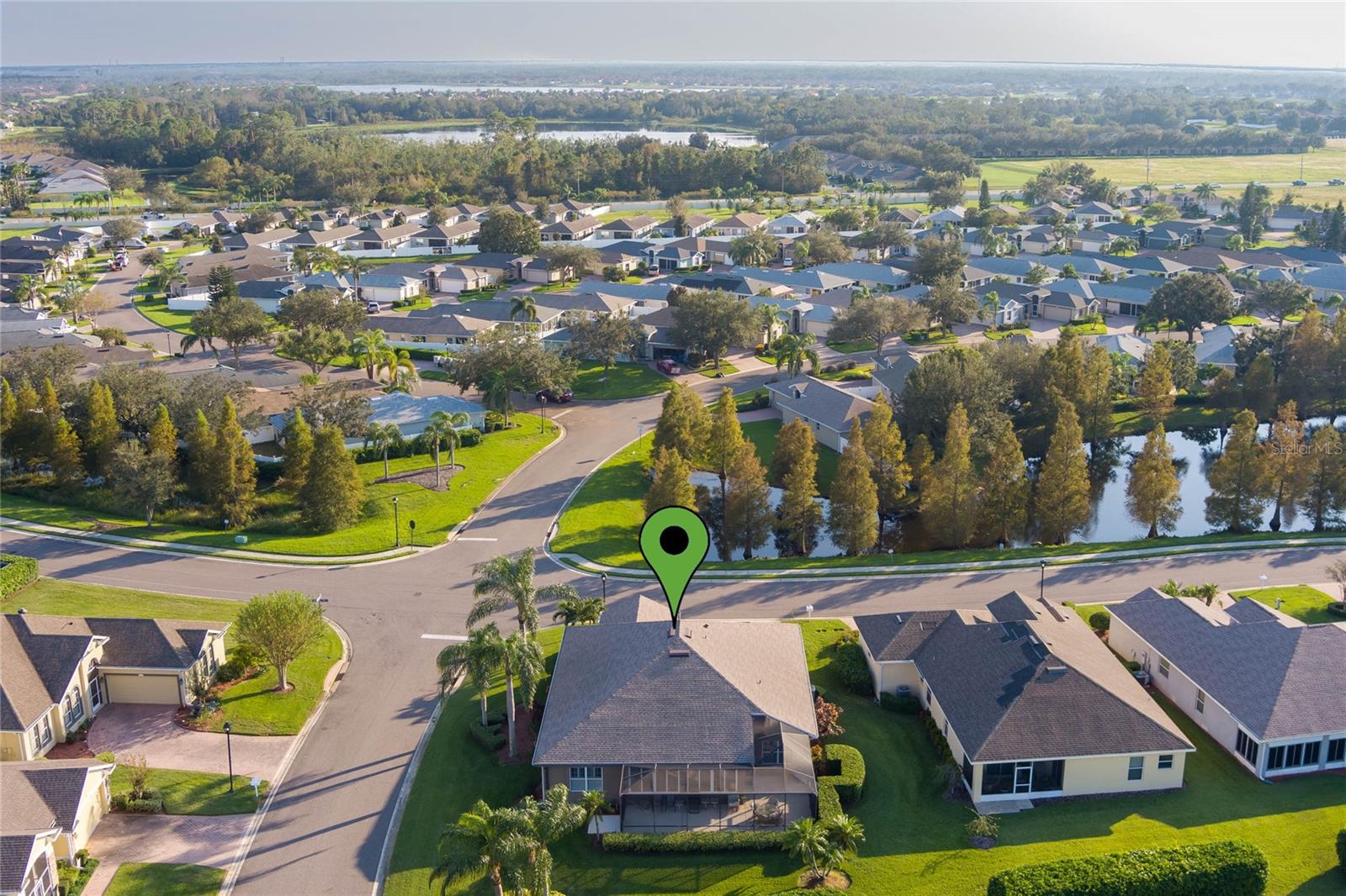 This stunning property is situated on a premium lot, offering picturesque views of the pond. Featuring a highly desirable split-bedroom floor plan, this partially furnished home includes three bedrooms and two baths. As you step inside, you're welcomed by a charming screened-in front porch with a leaded glass door and transom window. The kitchen boasts 42" upper maple wood cabinetry, accented with braided trim, crown molding, and convenient pull-out drawers. Recent updates include a new refrigerator and microwave, along with a closet pantry. Enjoy casual meals at the breakfast bar or in the cozy breakfast nook. The open-concept design seamlessly connects the formal dining room and living room, both of which showcase stunning pond views. The spacious great room is bright and inviting, featuring high ceilings and vinyl plank flooring. Architectural details like arched entryways, crown molding, and decorative niches enhance the home's elegant atmosphere. The four-seasons room, lined with large windows, allows you to enjoy the scenic views year-round. The generously sized primary bedroom suite serves as a private retreat, complete with plantation shutters and a cozy sitting area. Dual walk-in closets with overhead luggage shelves offer ample storage. The primary bathroom features a comfort-height vanity with double sinks, a linen closet, a seated walk-in shower, a water closet, and a luxurious garden tub. For outdoor enjoyment, the expansive screened-in lanai provides a peaceful space to relax. Additional features include a laundry room with a washer, dryer, utility sink, and extra cabinetry, solid surface flooring throughout, a water heater (installed in 2024), an upgraded HVAC system with an Aprilaire electronic filtration system, custom window treatments, an invisible dog fence, and a five-zone irrigation system with an irrigation meter. The home also boasts an architectural shingle roof (installed in 2019), professionally landscaped corner lot, pull-down attic stairs, alarm system, gutters, exterior lighting, paved walkway and driveway, and a two-car garage with shelving and a garage door opener. Residents of Traditions enjoy a wealth of amenities, including a lakefront clubhouse with a dock and boat ramp, heated swimming pool and spa, ballroom, billiards, meeting rooms, library, computer room, craft room, dog park, and courts for tennis, pickleball, basketball, bocce ball, and shuffleboard. The community also offers a fitness center, aerobics studio, and more. Conveniently located near shopping, dining, major routes, and Legoland, this home offers an exceptional lifestyle. The monthly HOA fee covers exterior house painting, cable, internet, lawn service, and clubhouse amenities, ensuring a maintenance-free living experience.