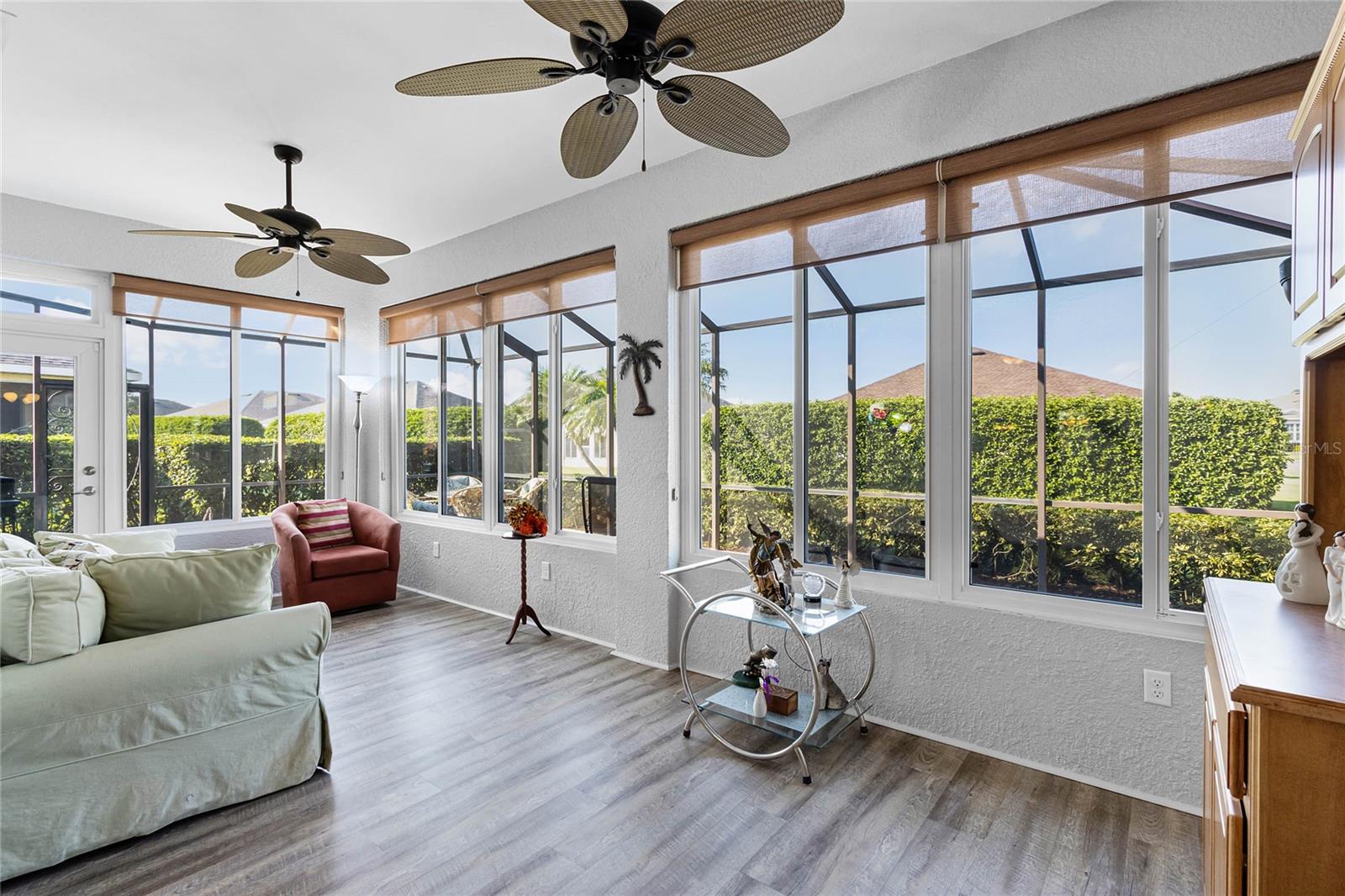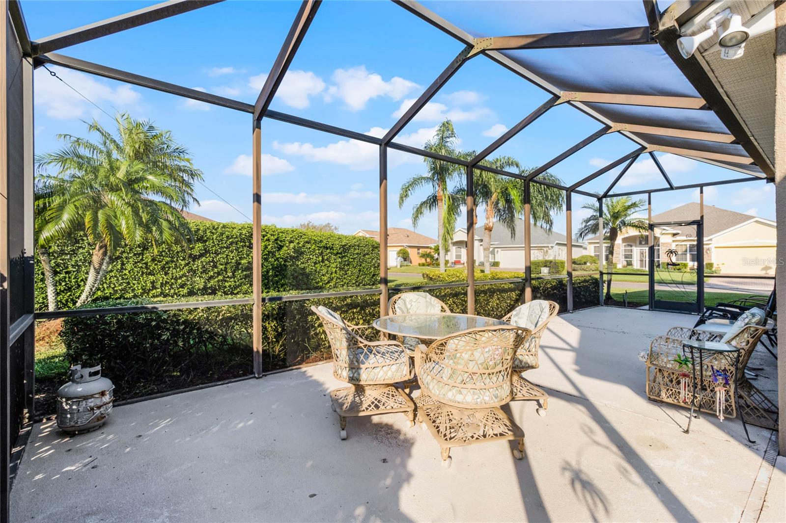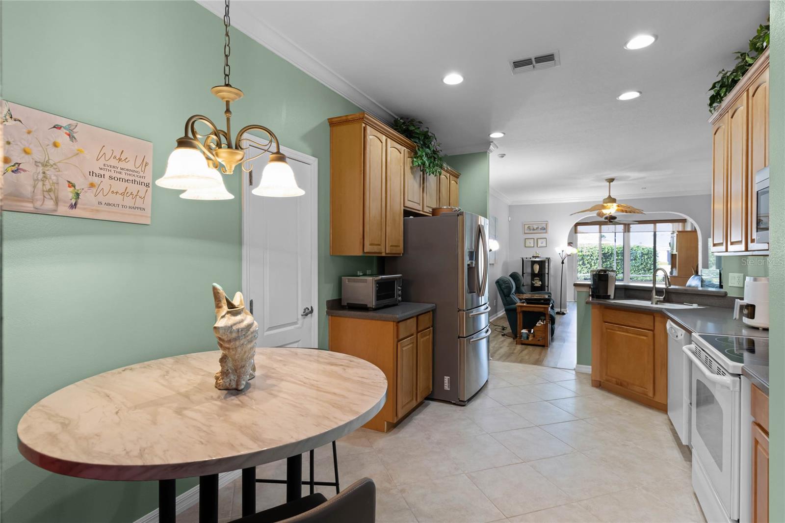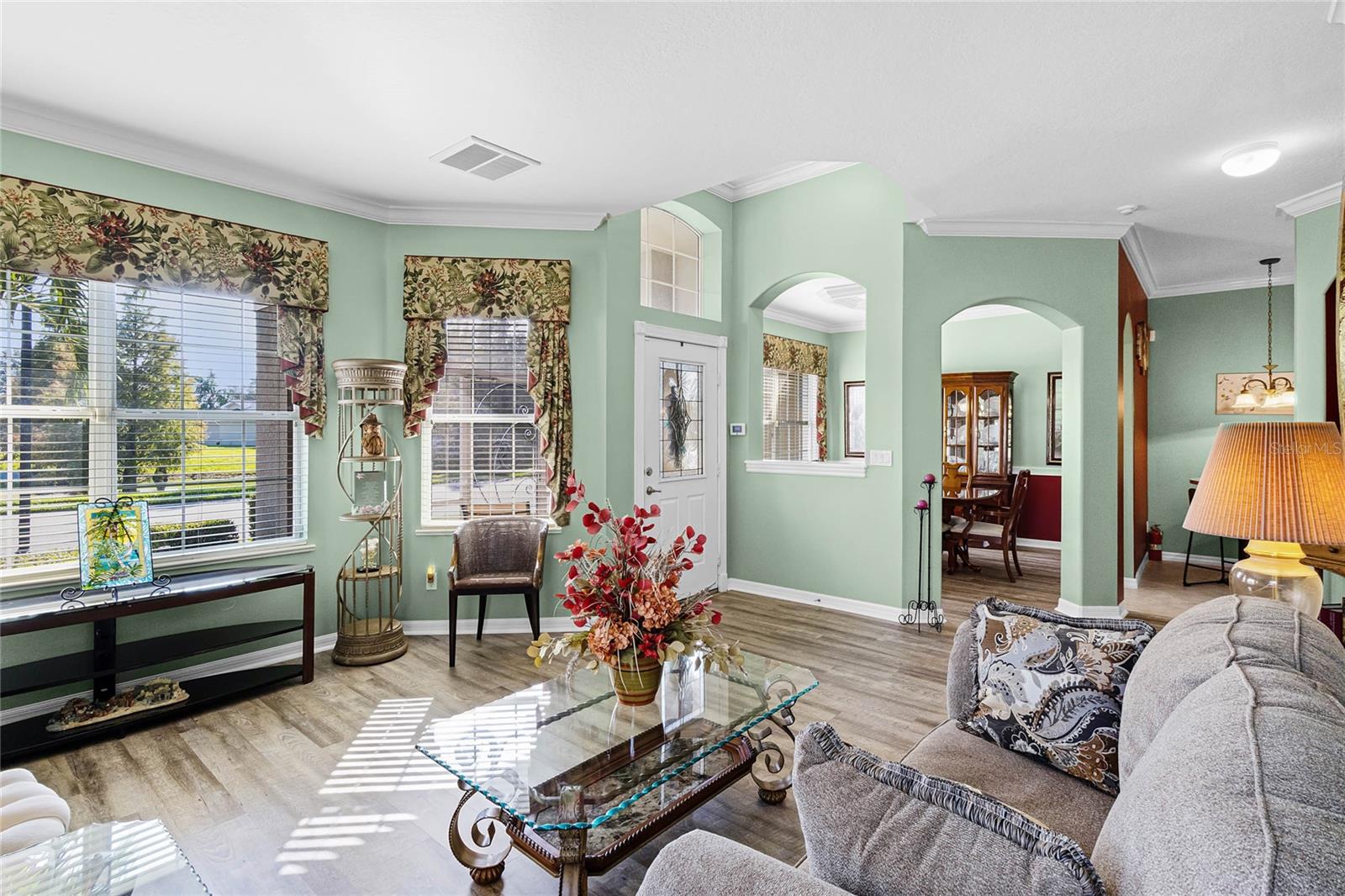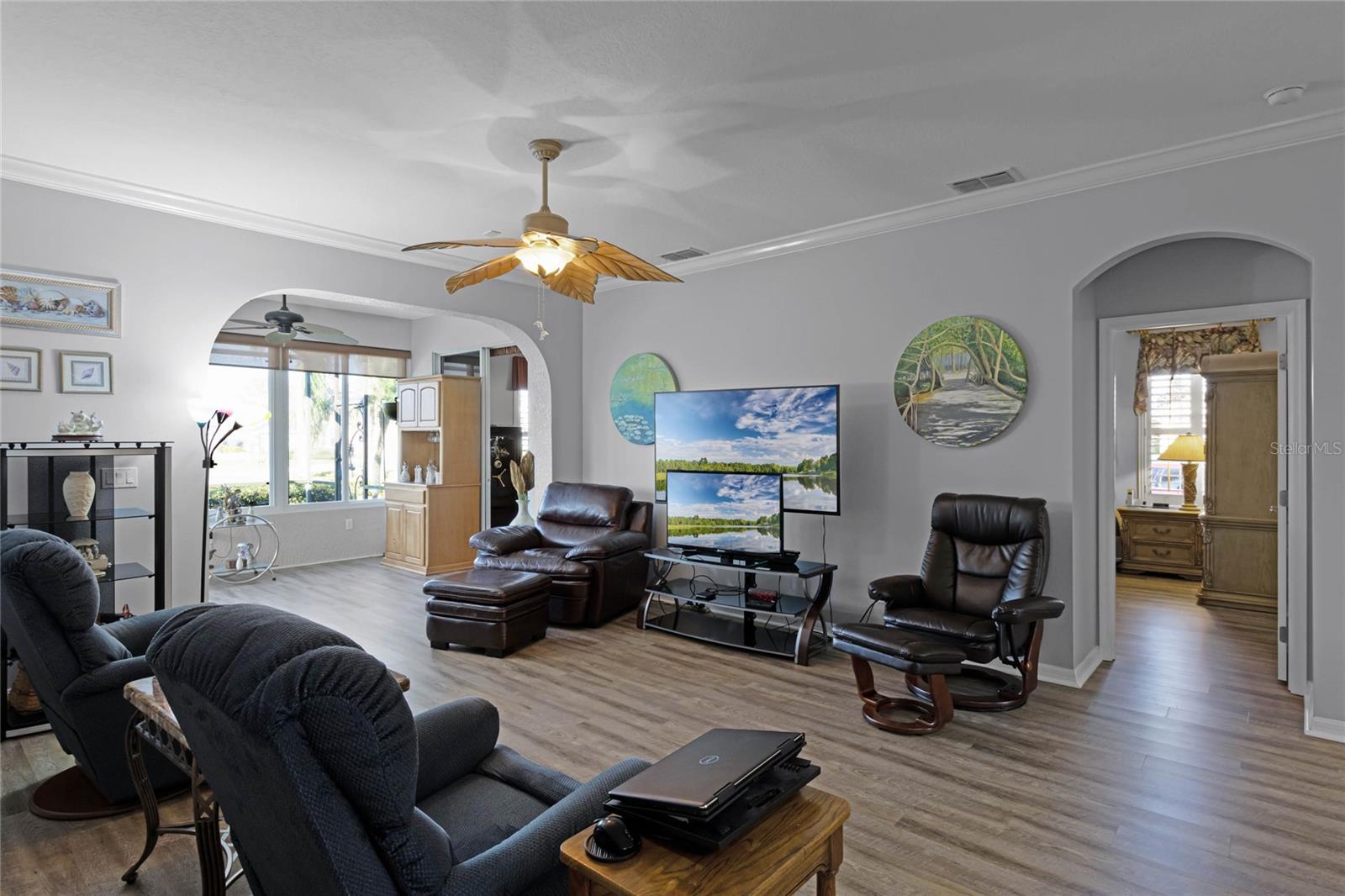 This stunning property is situated on a premium lot, offering picturesque views of the pond. Featuring a highly desirable split-bedroom floor plan, this partially furnished home includes three bedrooms and two baths. As you step inside, you're welcomed by a charming screened-in front porch with a leaded glass door and transom window. The kitchen boasts 42" upper maple wood cabinetry, accented with braided trim, crown molding, and convenient pull-out drawers. Recent updates include a new refrigerator and microwave, along with a closet pantry. Enjoy casual meals at the breakfast bar or in the cozy breakfast nook. The open-concept design seamlessly connects the formal dining room and living room, both of which showcase stunning pond views. The spacious great room is bright and inviting, featuring high ceilings and vinyl plank flooring. Architectural details like arched entryways, crown molding, and decorative niches enhance the home's elegant atmosphere. The four-seasons room, lined with large windows, allows you to enjoy the scenic views year-round. The generously sized primary bedroom suite serves as a private retreat, complete with plantation shutters and a cozy sitting area. Dual walk-in closets with overhead luggage shelves offer ample storage. The primary bathroom features a comfort-height vanity with double sinks, a linen closet, a seated walk-in shower, a water closet, and a luxurious garden tub. For outdoor enjoyment, the expansive screened-in lanai provides a peaceful space to relax. Additional features include a laundry room with a washer, dryer, utility sink, and extra cabinetry, solid surface flooring throughout, a water heater (installed in 2024), an upgraded HVAC system with an Aprilaire electronic filtration system, custom window treatments, an invisible dog fence, and a five-zone irrigation system with an irrigation meter. The home also boasts an architectural shingle roof (installed in 2019), professionally landscaped corner lot, pull-down attic stairs, alarm system, gutters, exterior lighting, paved walkway and driveway, and a two-car garage with shelving and a garage door opener. Residents of Traditions enjoy a wealth of amenities, including a lakefront clubhouse with a dock and boat ramp, heated swimming pool and spa, ballroom, billiards, meeting rooms, library, computer room, craft room, dog park, and courts for tennis, pickleball, basketball, bocce ball, and shuffleboard. The community also offers a fitness center, aerobics studio, and more. Conveniently located near shopping, dining, major routes, and Legoland, this home offers an exceptional lifestyle. The monthly HOA fee covers exterior house painting, cable, internet, lawn service, and clubhouse amenities, ensuring a maintenance-free living experience.