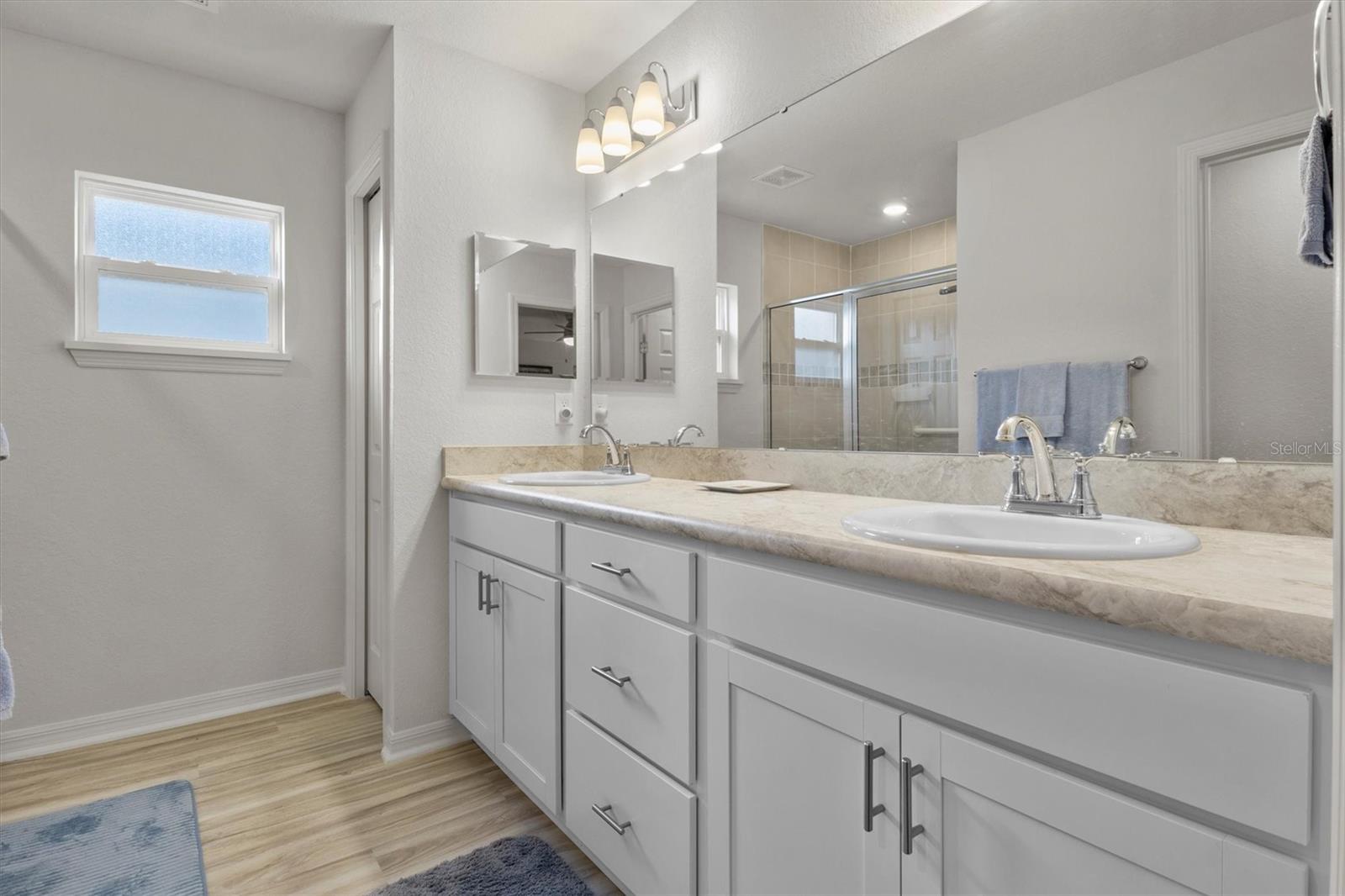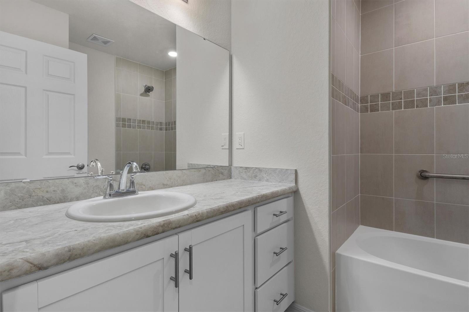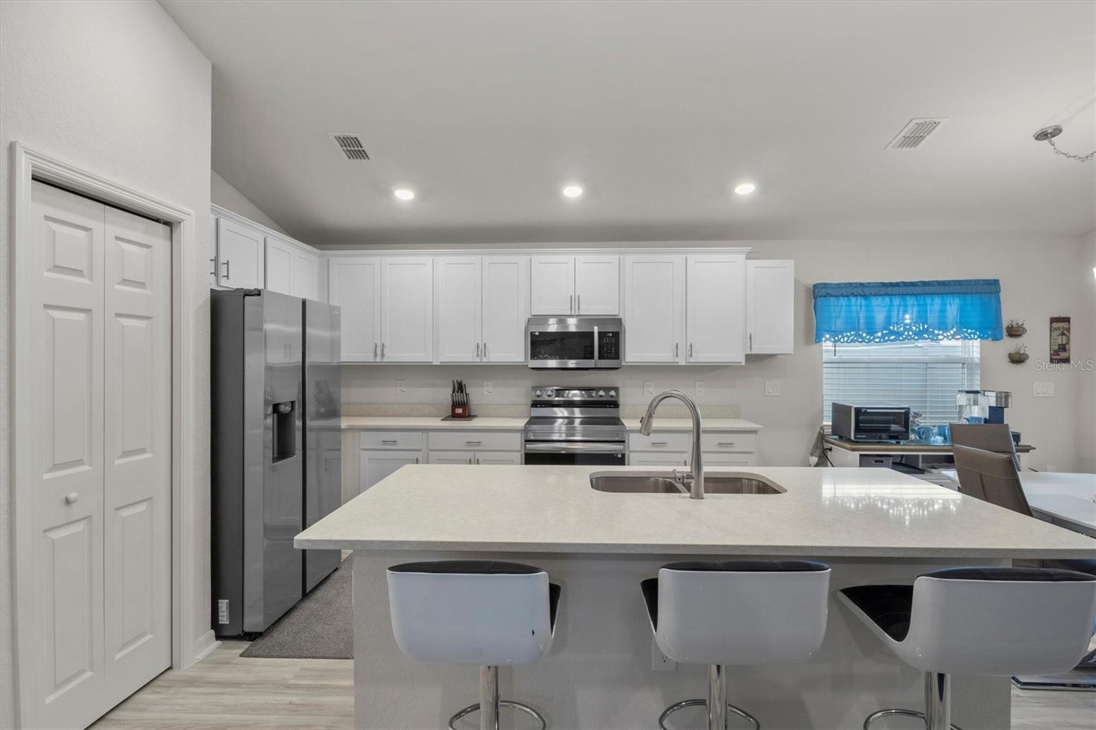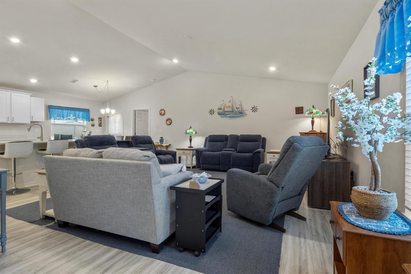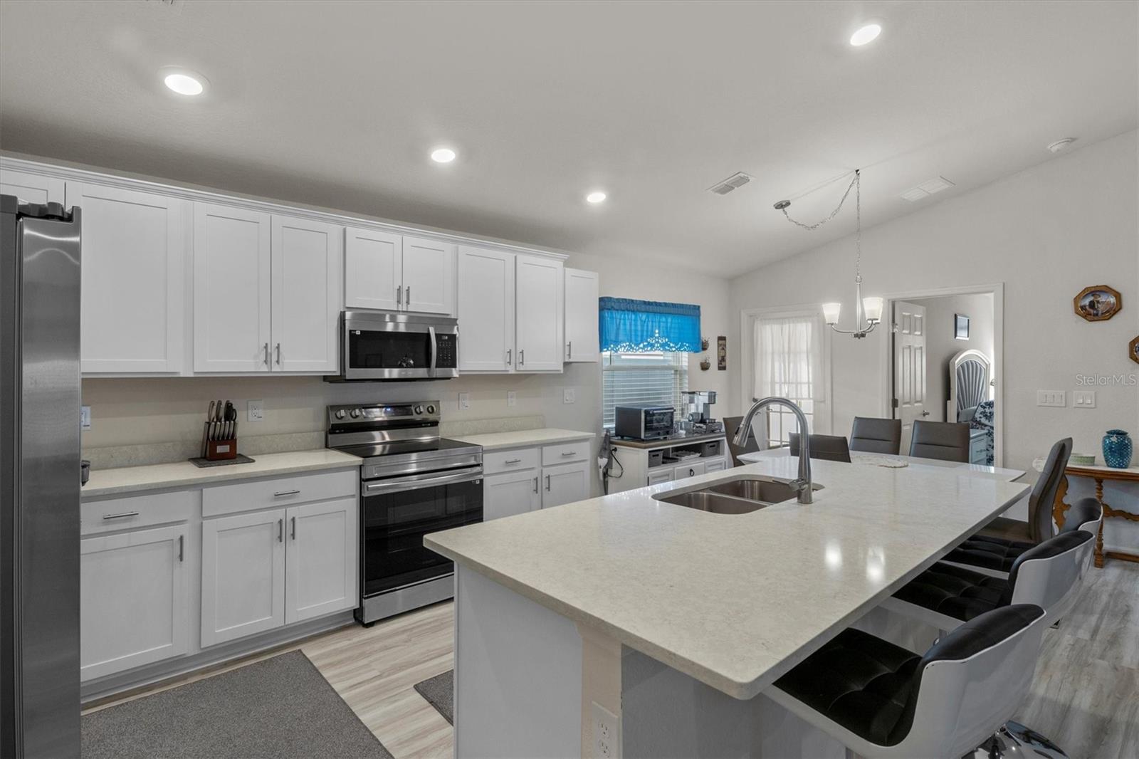 Welcome to 3930 Palazzo Pl, Winter Haven – a beautifully designed 3-bedroom, 2-bathroom home offering 1,553 sq. ft. of comfortable living space, all on one convenient level. The open-concept layout seamlessly connects the kitchen, dining café, and gathering room, creating an inviting space for entertaining and everyday living. The chef’s kitchen features elegant shaker-style white cabinets with crown molding, Silestone countertops, Samsung stainless steel appliances, a pantry, and a spacious island, perfect for meal prep or casual dining. Throughout the main living areas, luxury wood vinyl plank flooring adds warmth and durability, while the bedrooms offer plush, stain-resistant carpet for ultimate comfort. The owner’s suite is a relaxing retreat, complete with a walk-in wardrobe and a private en-suite bath featuring dual vanities, a tiled shower, and a closeted toilet. Step outside to the covered and screened lanai, where you can enjoy the fully fenced backyard in privacy. Additional highlights include a 2-car garage, custom-fit window blinds, architectural shingles, energy-efficient insulation and windows, and a builder’s warranty that transfers with the purchase. Located in the highly desirable Villamar community, residents enjoy access to resort-style amenities, including a swimming pool, playground, scenic walking trails, and a second pool on the way!