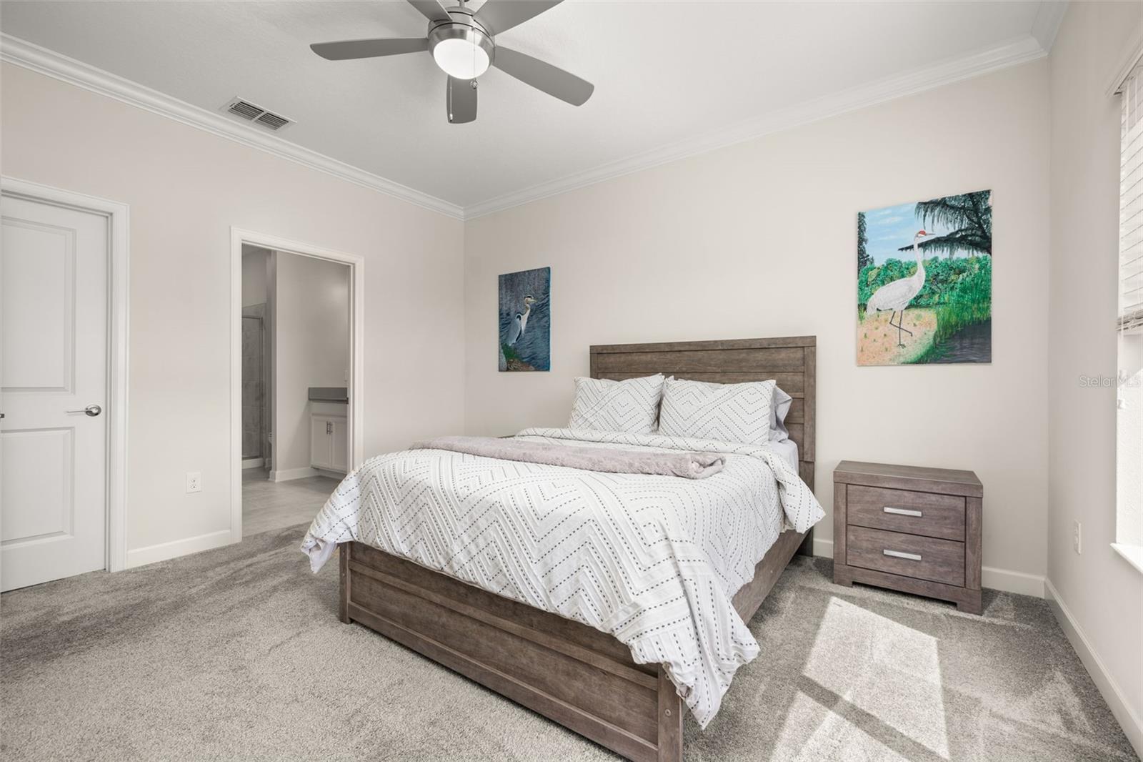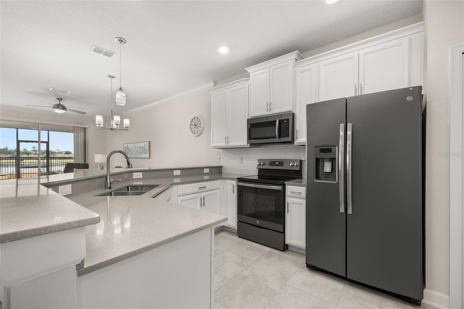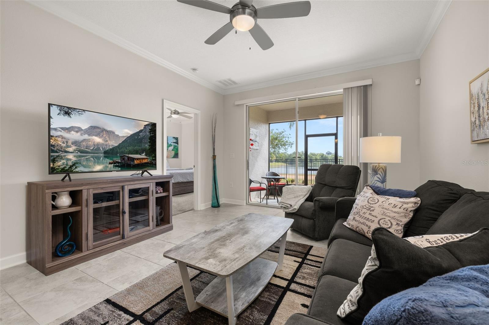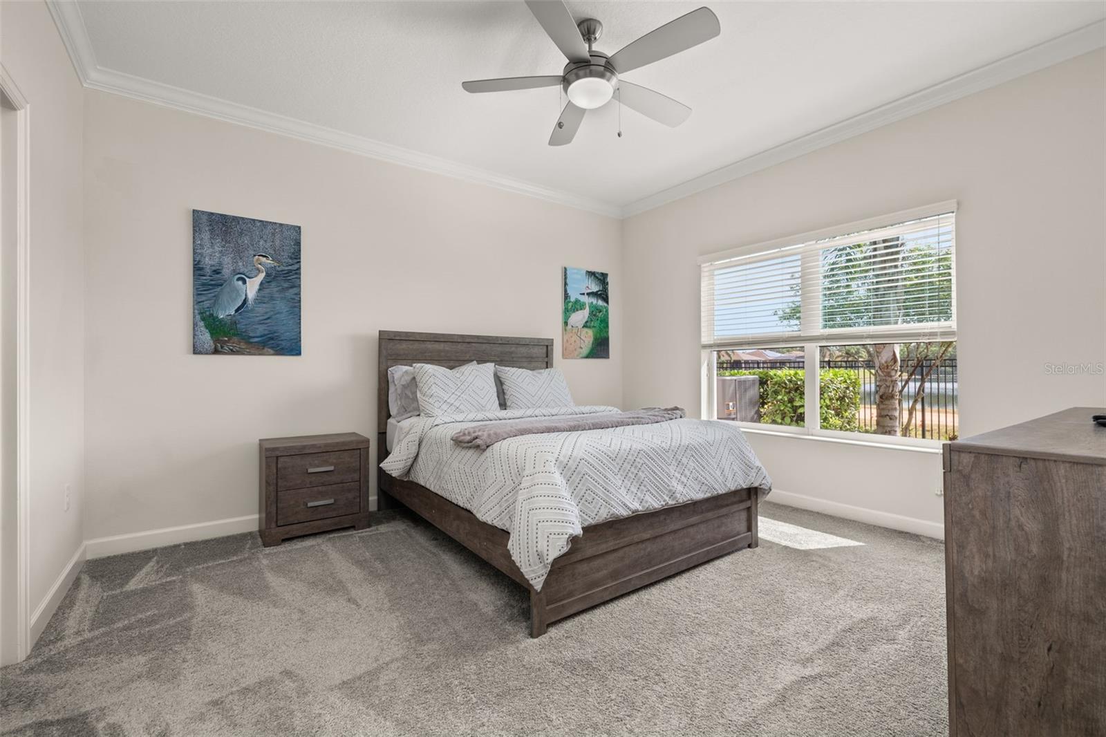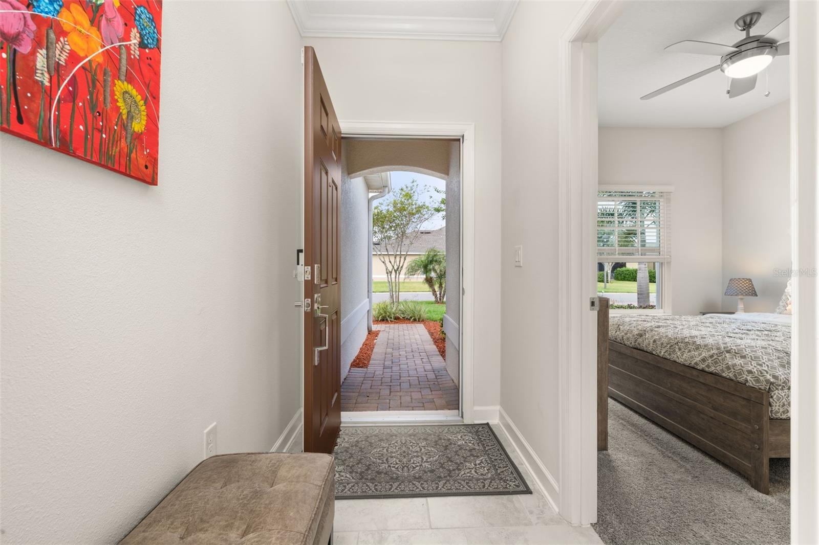 Welcome home to comfort, quality, and tranquility! This move-in ready, beautifully maintained villa sits on a premium waterfront lot, offering peaceful views and a serene ambience. Enjoy quiet mornings and relaxing evenings from the covered, screened lanai overlooking the picturesque setting—your own private outdoor retreat. Inside, you’ll immediately appreciate the warm, inviting finishes, including gray quartz countertops, sleek stainless steel appliances, and tiled floors throughout the main living areas and baths. Crown molding and 9-ft. ceilings elevate the space, while smart-home features—Honeywell thermostat, WiFi-controlled garage door opener, smart lock, and whole-home surge protector—provide modern convenience and peace of mind. The spacious primary suite offers a restful escape with a walk-in closet featuring motion-activated lighting and a luxurious en suite bath with double vanity and walk-in tiled shower. A flexible bonus room is perfect for a home office, craft room, or guest space. This gently lived-in home shows like new, with thoughtful touches such as a dedicated laundry room (washer & dryer included), overhead garage storage, and a freshly painted exterior (2024). Located in a vibrant 55+ gated community, the HOA covers an impressive list of services—including roof maintenance/repairs, exterior paint every 5 years, cable, internet, termite protection, lawn maintenance and fertilization (including shrubs and trees), irrigation repairs, and exterior home insurance. The HOA-provided exterior insurance can significantly lower your personal homeowner’s insurance costs. Enjoy a rich array of amenities: two heated community pools for year round enjoyment, hot tub, sauna, fitness center, tennis and pickleball court, basketball court, billiards, library, dog park, walking trails, a community boat ramp with access to Lake Ruby, and a spacious ballroom ideal for gatherings and events. NO CDD! This villa offers more than a home—it offers a lifestyle. Come see why this community is the perfect place to relax, connect, and enjoy everyday living.