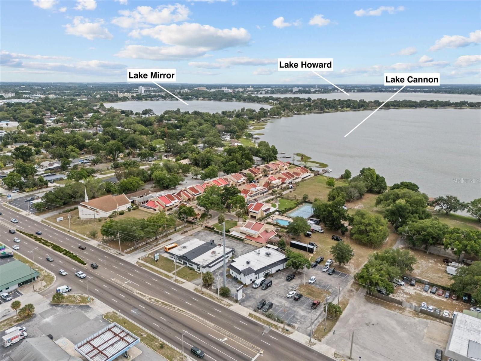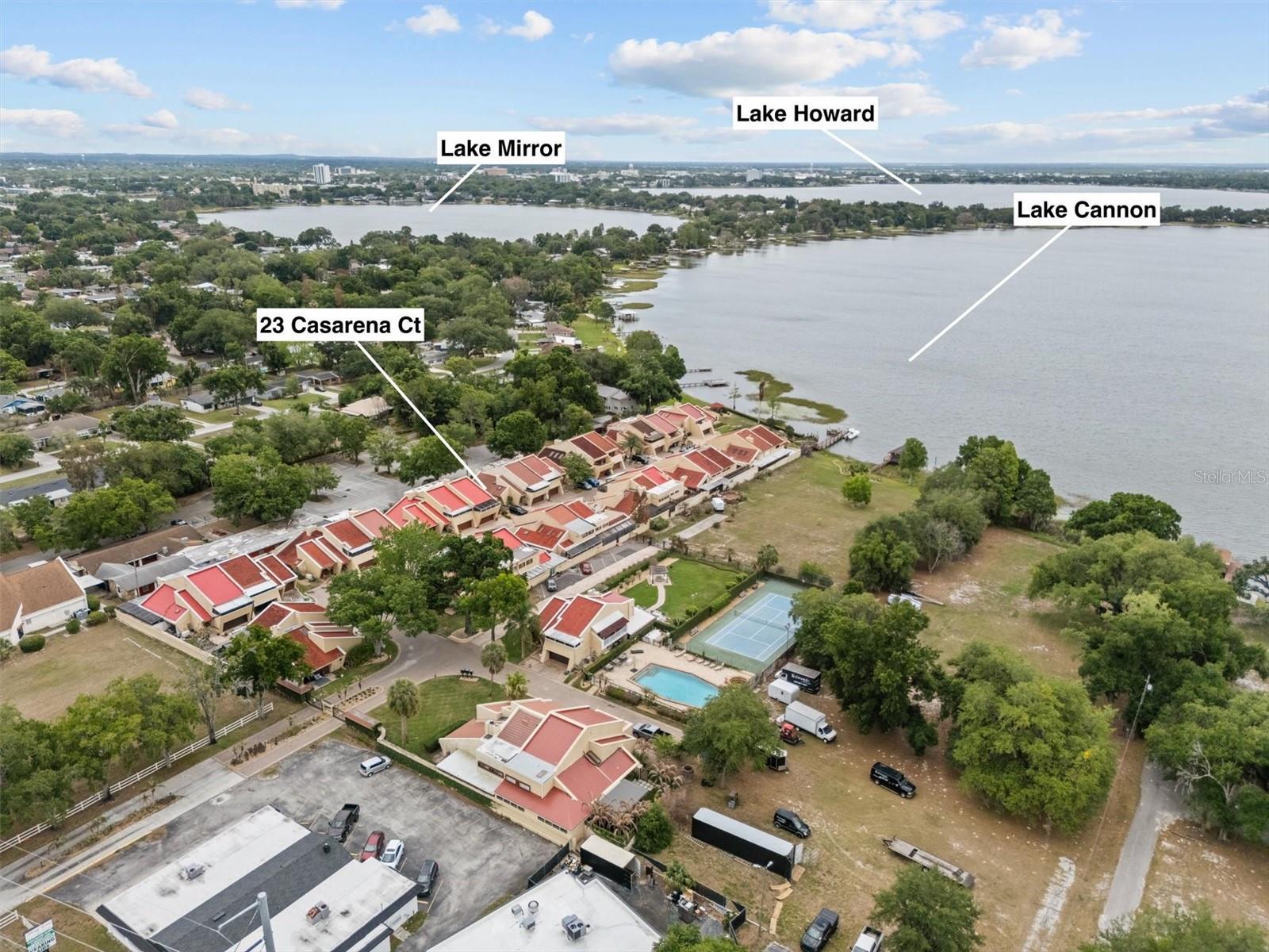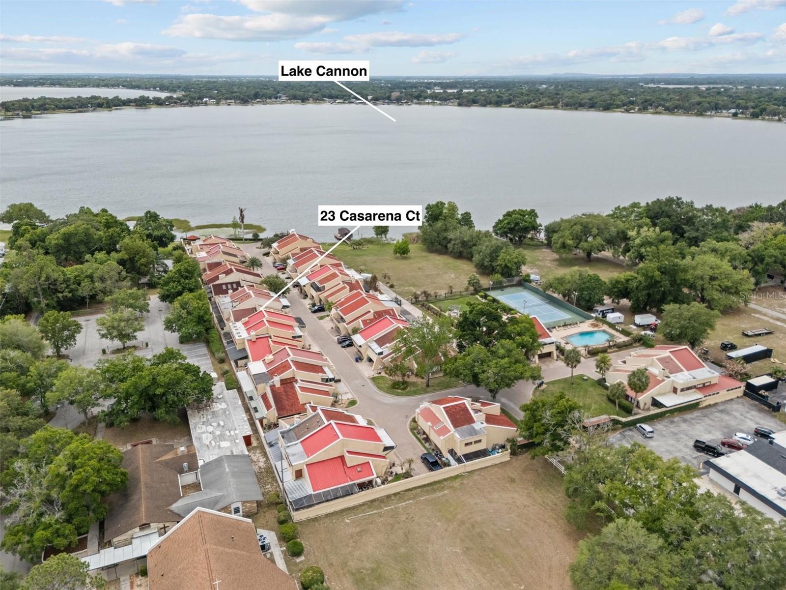 Welcome to 23 Casarena Ct in Winter Haven, located in the gated lakefront community of Casarena on the Lakes on Lake Cannon, part of the Chain of Lakes. This spacious 2BR/2.5BA townhome offers approximately 2,045 sq ft of living space with vaulted ceilings, abundant natural light, and a functional two-story layout. The main level features an open living area with sliding glass doors leading to a private covered patio, plus a well-appointed kitchen with breakfast bar and a convenient half bath. Upstairs, enjoy a versatile loft/bonus space ideal for a home office or additional living area. Both bedrooms offer ensuite bathrooms, including a primary suite with a private screened balcony. Additional highlights include ceramic tile and hardwood flooring, spacious bedrooms, a two-car garage with freshly painted floor, and multiple outdoor spaces including three patios. Recent updates include the ROOF (Aug 2023). Owner is offering a $5,000 credit towards flooring. Residents enjoy resort style amenities: community pool, tennis courts, boat slip, and dock with direct access to Lake Cannon and the Chain of Lakes, perfect for boating, fishing, and waterfront living. Prime location near shopping, dining, and major roadways. Low-maintenance living in a secure, gated community.