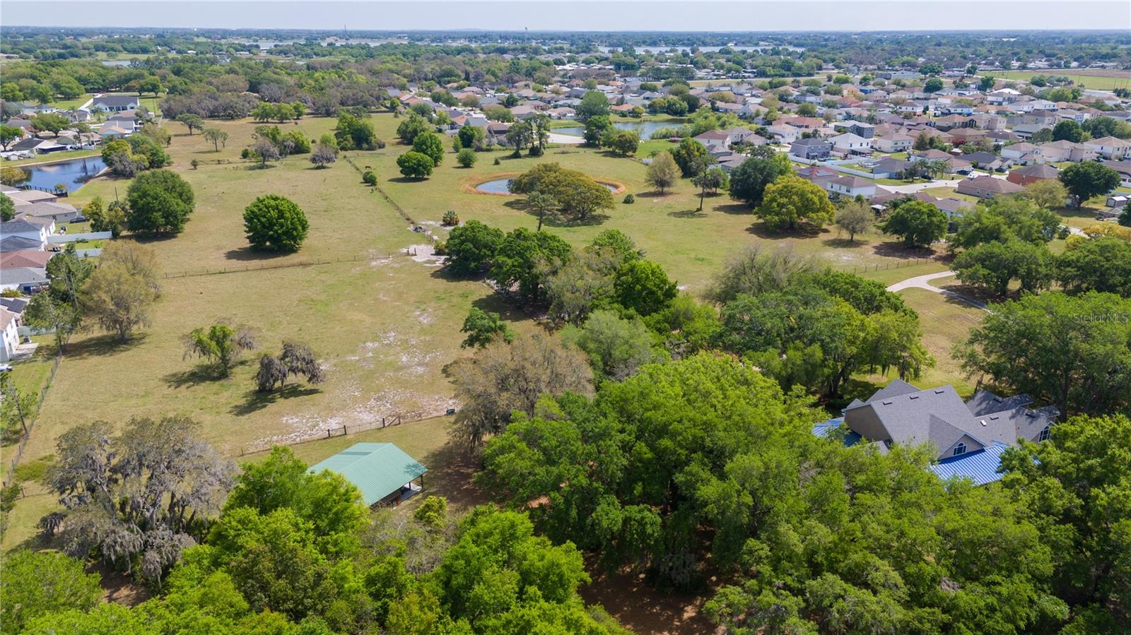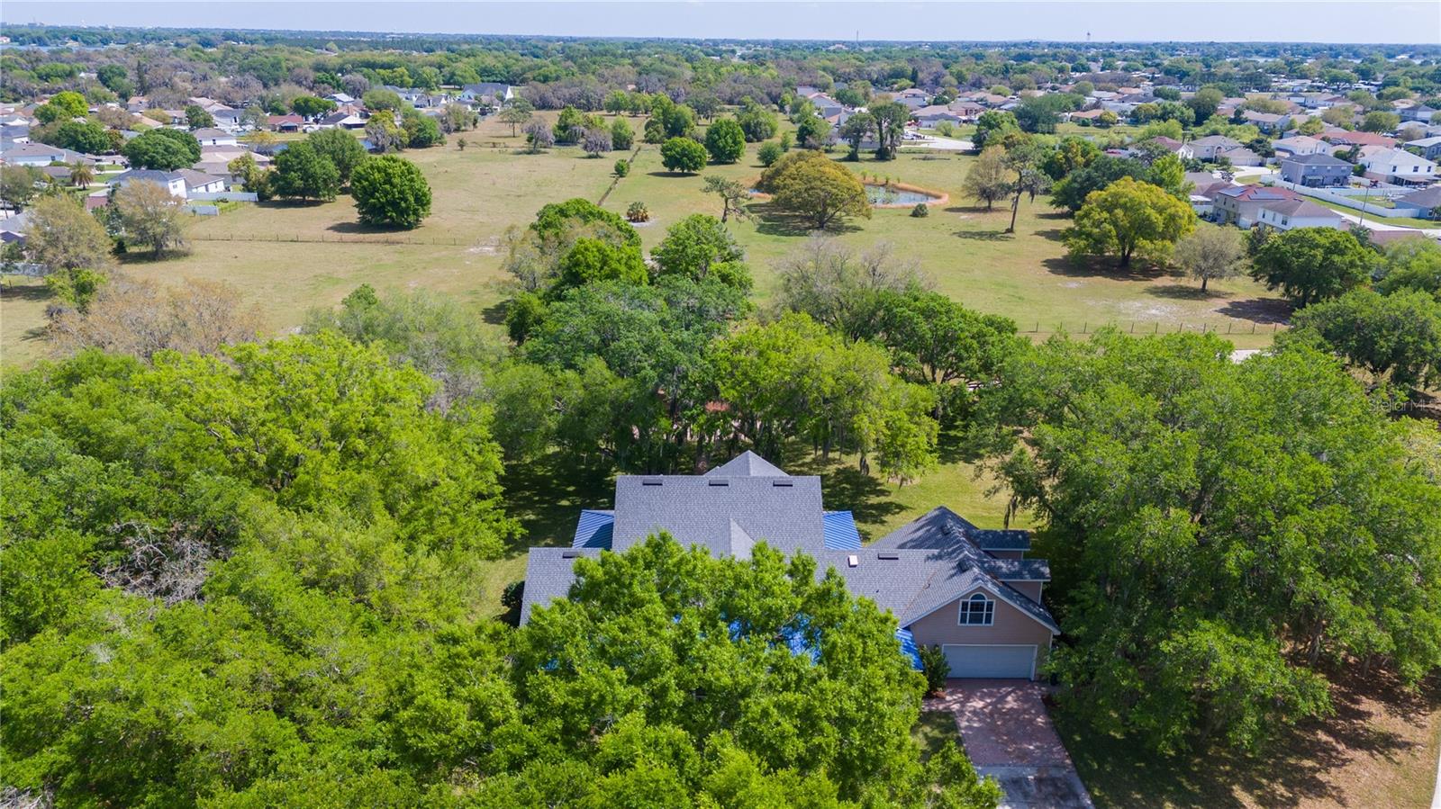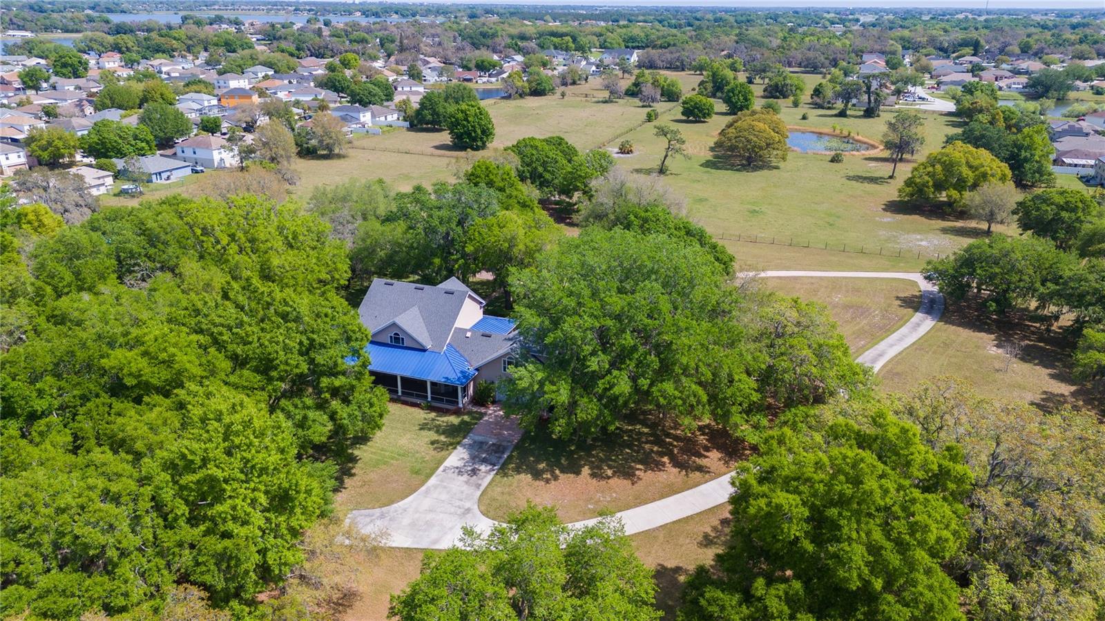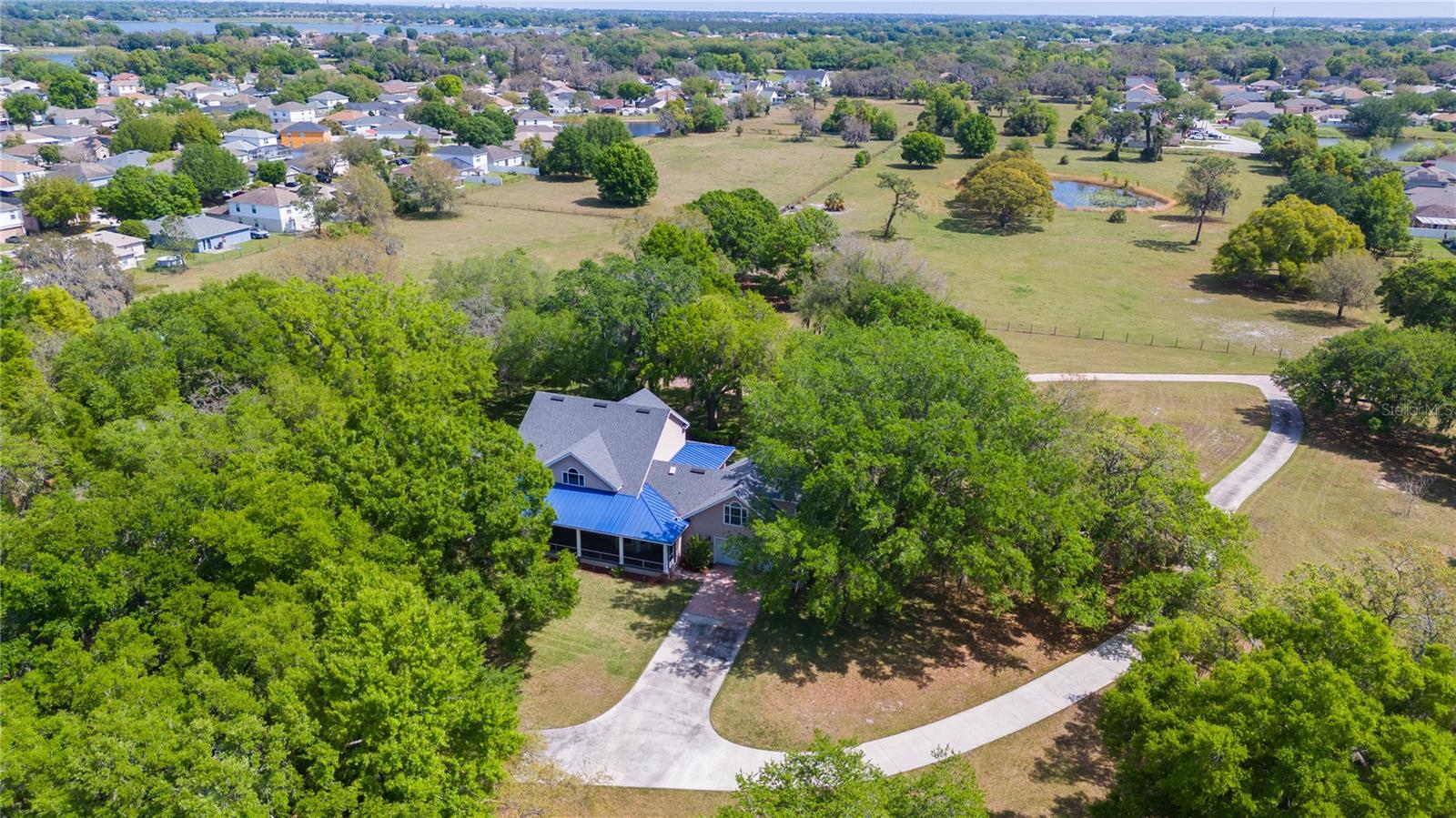 Prepare to be captivated by this enchanting 19-acre estate, a haven tailored for those with a passion for horses and nature! This expansive property boasts a spacious 3-bedroom, 3.5-bathroom home spanning over 3,700 sqft, offering a seamless fusion of opulence and comfort. Nestled amidst serene surroundings, including a tranquil pond and lush forests, this retreat provides a picturesque backdrop for creating cherished family memories. The horse stables add a touch of countryside allure, making it a haven for equestrian enthusiasts. Every aspect of this magnificent home has been meticulously crafted. The grand formal dining room sets the stage for memorable family gatherings, while the living room features soaring vaulted ceilings and custom sliding glass doors that open to the fully screened back porch and manicured backyard. The office is a sanctuary of tranquility, adorned with stained wood paneling and a custom-built storage unit. The expansive master bedroom on the first floor exudes luxury with a high tray ceiling, crown molding, and a lavish master bathroom with a 2-person jetted tub, walk-in shower, dual vanities with granite countertops, and a spacious walk-in closet. The kitchen is a culinary masterpiece, equipped with granite countertops, a gas cooktop, electric warming drawer, built-in oven and microwave, dishwasher, and an island with a sink. Solid wood cabinets are beautifully complemented by custom lighting. The laundry room offers connections for an electric washer and either a gas or electric dryer, along with ample countertop workspace and storage. An oversized 2-car garage provides additional storage space with built-in shelving. Upstairs, two additional bedrooms feature generous closet space, and there's a spacious media/multipurpose room with a ceiling-mounted video projector, motorized 100-inch projection screen, surround sound, and a bar with sink, microwave, and mini-fridge. The property is equipped with two on-demand gas hot water systems, an in-wall vacuum system, and covered front and back porches with wooden swings. The living areas feature architectural shingles replaced in 2021 and 4 HVAC units ensure comfort even in the Florida heat, with two units less than 1 year old. Outside, you'll discover a 48x36 horse barn with 4 stalls and a tack room, along with a 36x39 pole barn with an enclosed tool/storage room. The house is enveloped by majestic oak trees, providing both privacy and shade. Conveniently located just 2 miles from the entrance to the Polk Parkway, with quick access to I-4 for travel to Tampa or Orlando in just 1 hour, this property offers the perfect blend of tranquility and convenience. Lakeland and Winter Haven are each only about 10 minutes away, offering a myriad of shopping and dining options. This property is truly a must-see to fully appreciate its beauty and charm. Best of all, there is no HOA to restrict your lifestyle.