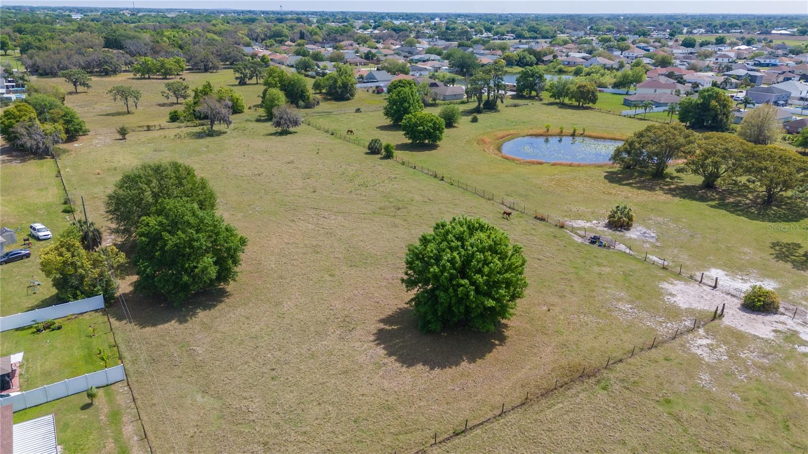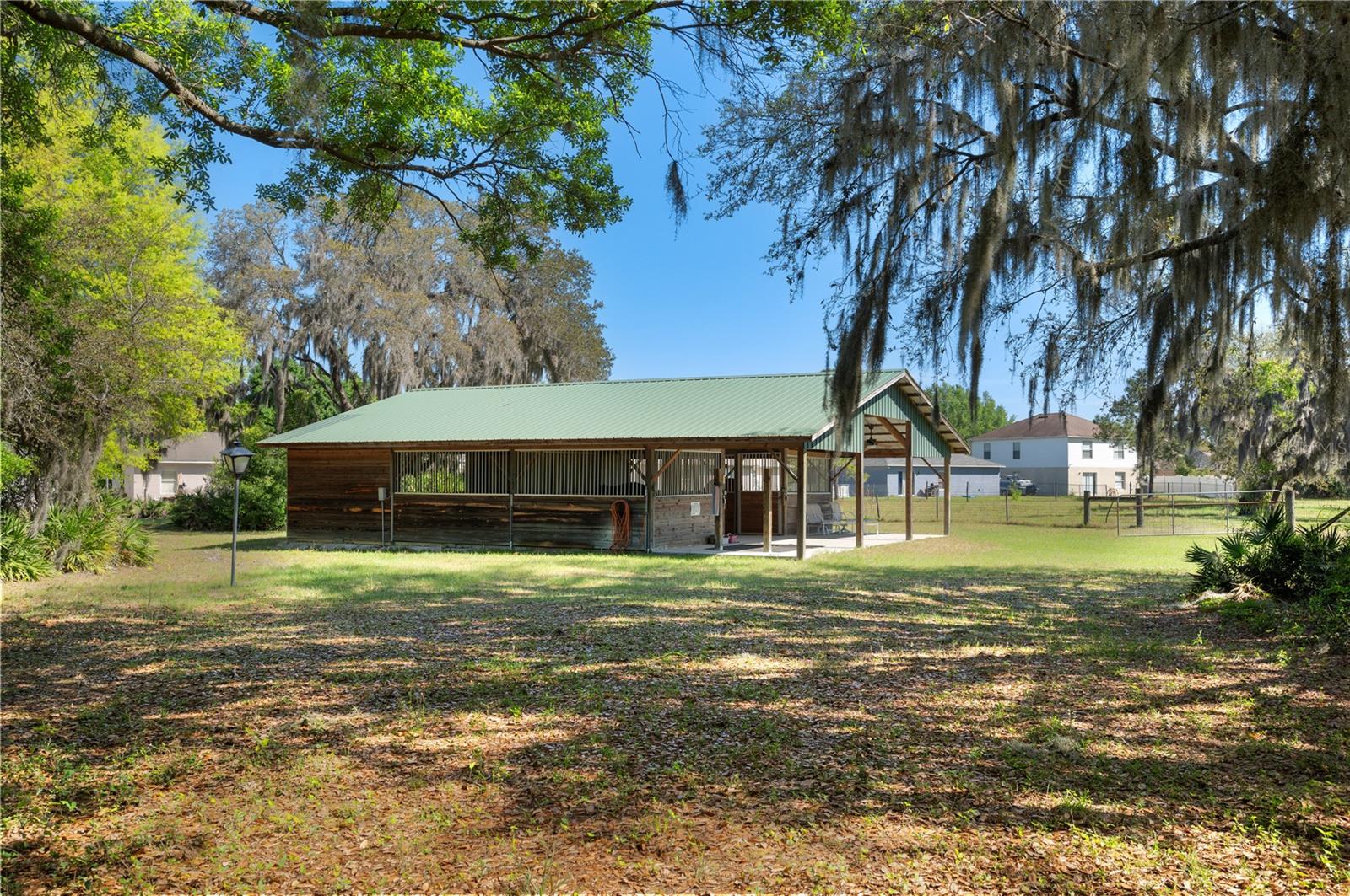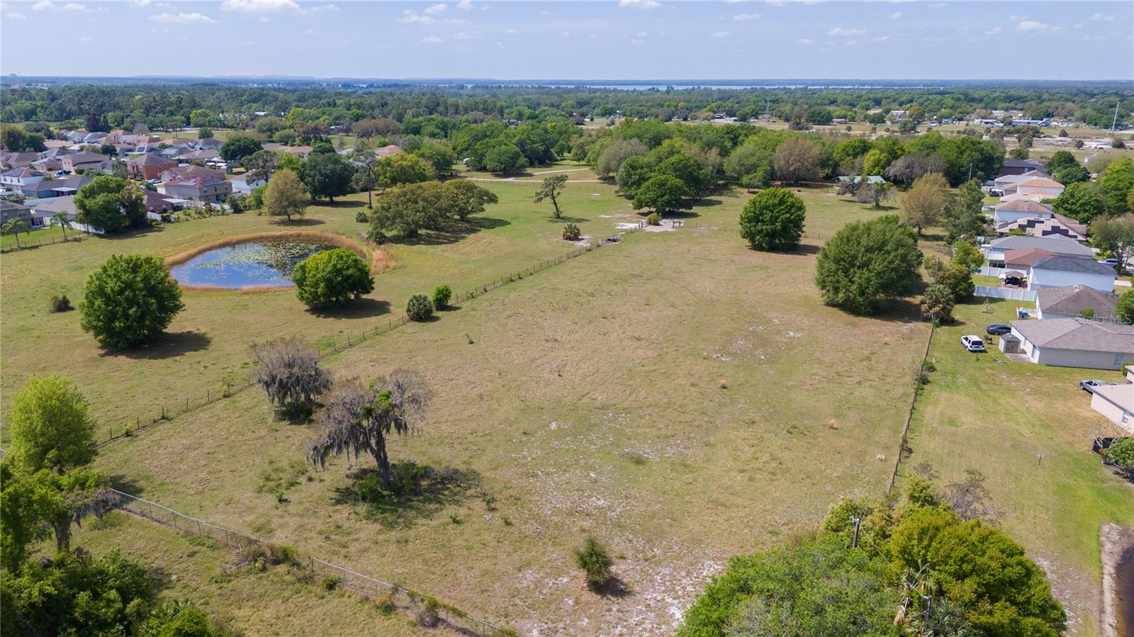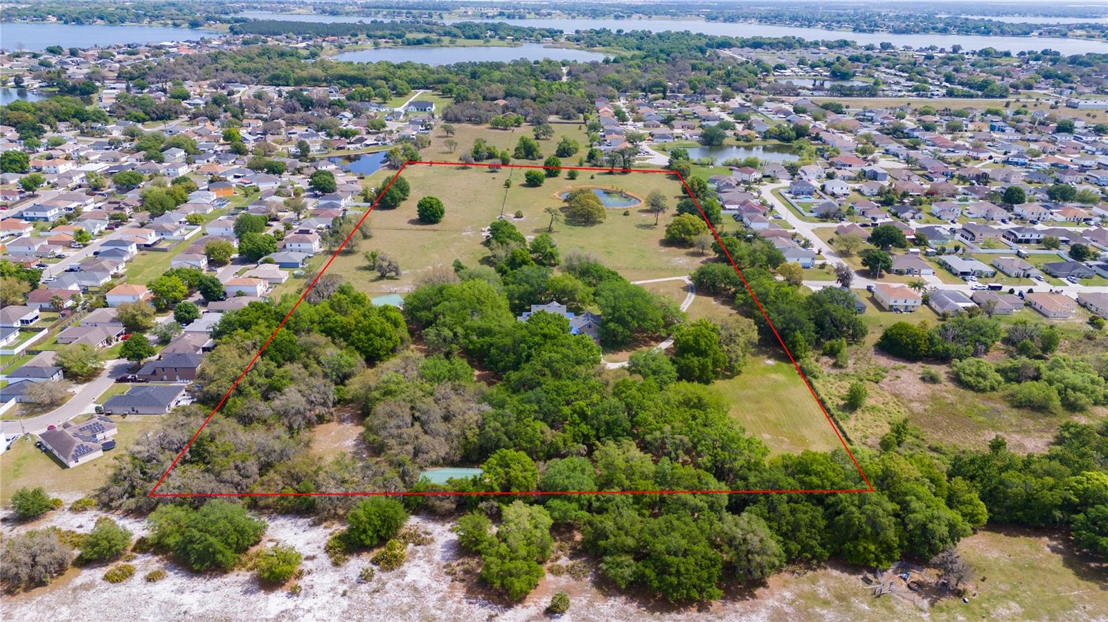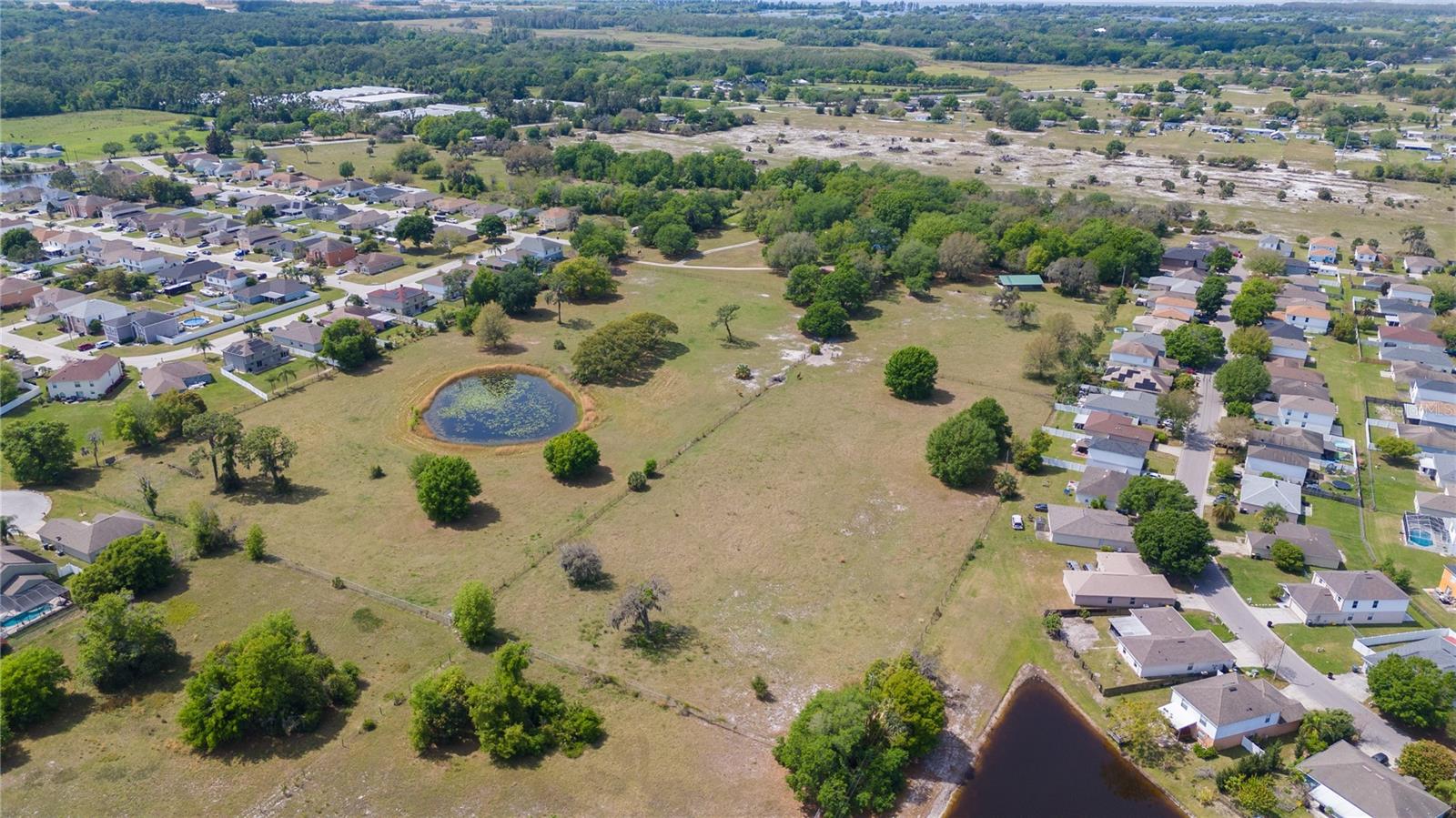 Prepare to be captivated by this enchanting 19-acre estate, a haven tailored for those with a passion for horses and nature! This expansive property boasts a spacious 3-bedroom, 3.5-bathroom home spanning over 3,700 sqft, offering a seamless fusion of opulence and comfort. Nestled amidst serene surroundings, including a tranquil pond and lush forests, this retreat provides a picturesque backdrop for creating cherished family memories. The horse stables add a touch of countryside allure, making it a haven for equestrian enthusiasts. Every aspect of this magnificent home has been meticulously crafted. The grand formal dining room sets the stage for memorable family gatherings, while the living room features soaring vaulted ceilings and custom sliding glass doors that open to the fully screened back porch and manicured backyard. The office is a sanctuary of tranquility, adorned with stained wood paneling and a custom-built storage unit. The expansive master bedroom on the first floor exudes luxury with a high tray ceiling, crown molding, and a lavish master bathroom with a 2-person jetted tub, walk-in shower, dual vanities with granite countertops, and a spacious walk-in closet. The kitchen is a culinary masterpiece, equipped with granite countertops, a gas cooktop, electric warming drawer, built-in oven and microwave, dishwasher, and an island with a sink. Solid wood cabinets are beautifully complemented by custom lighting. The laundry room offers connections for an electric washer and either a gas or electric dryer, along with ample countertop workspace and storage. An oversized 2-car garage provides additional storage space with built-in shelving. Upstairs, two additional bedrooms feature generous closet space, and there's a spacious media/multipurpose room with a ceiling-mounted video projector, motorized 100-inch projection screen, surround sound, and a bar with sink, microwave, and mini-fridge. The property is equipped with two on-demand gas hot water systems, an in-wall vacuum system, and covered front and back porches with wooden swings. The living areas feature architectural shingles replaced in 2021 and 4 HVAC units ensure comfort even in the Florida heat, with two units less than 1 year old. Outside, you'll discover a 48x36 horse barn with 4 stalls and a tack room, along with a 36x39 pole barn with an enclosed tool/storage room. The house is enveloped by majestic oak trees, providing both privacy and shade. Conveniently located just 2 miles from the entrance to the Polk Parkway, with quick access to I-4 for travel to Tampa or Orlando in just 1 hour, this property offers the perfect blend of tranquility and convenience. Lakeland and Winter Haven are each only about 10 minutes away, offering a myriad of shopping and dining options. This property is truly a must-see to fully appreciate its beauty and charm. Best of all, there is no HOA to restrict your lifestyle.