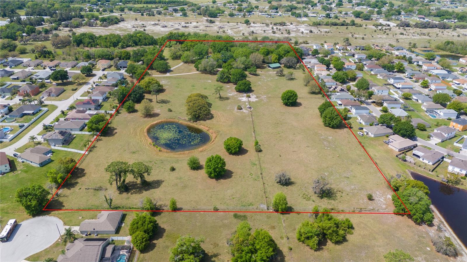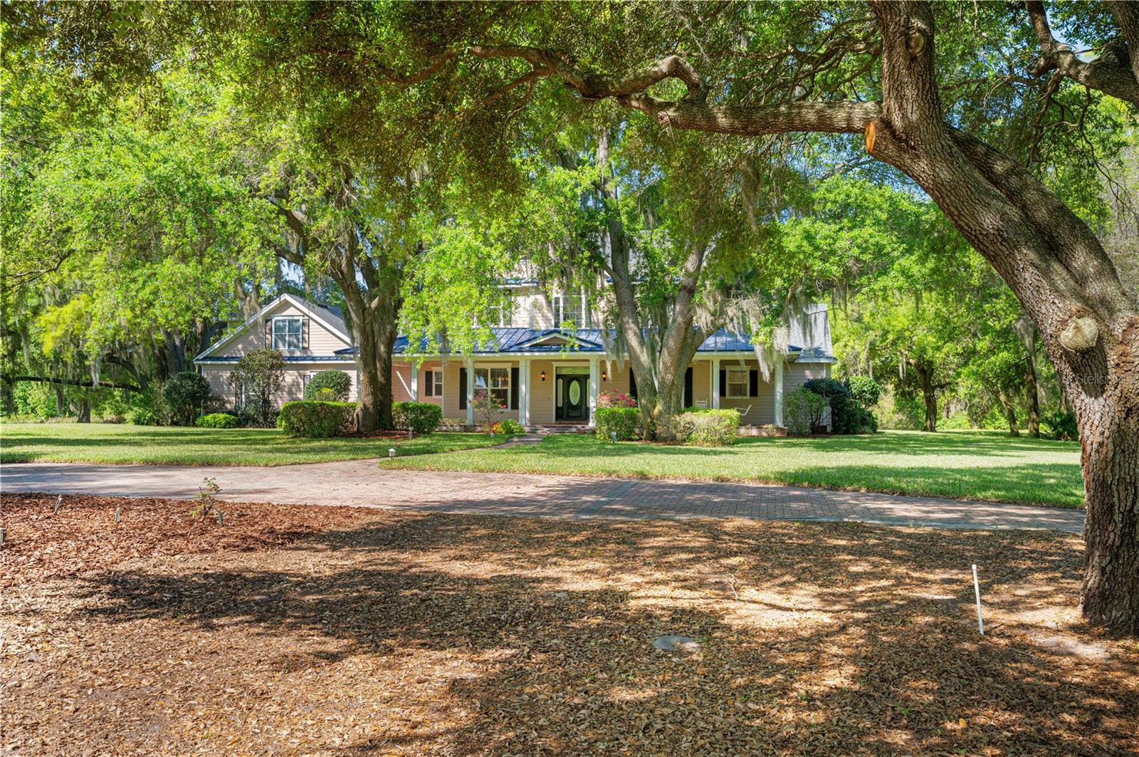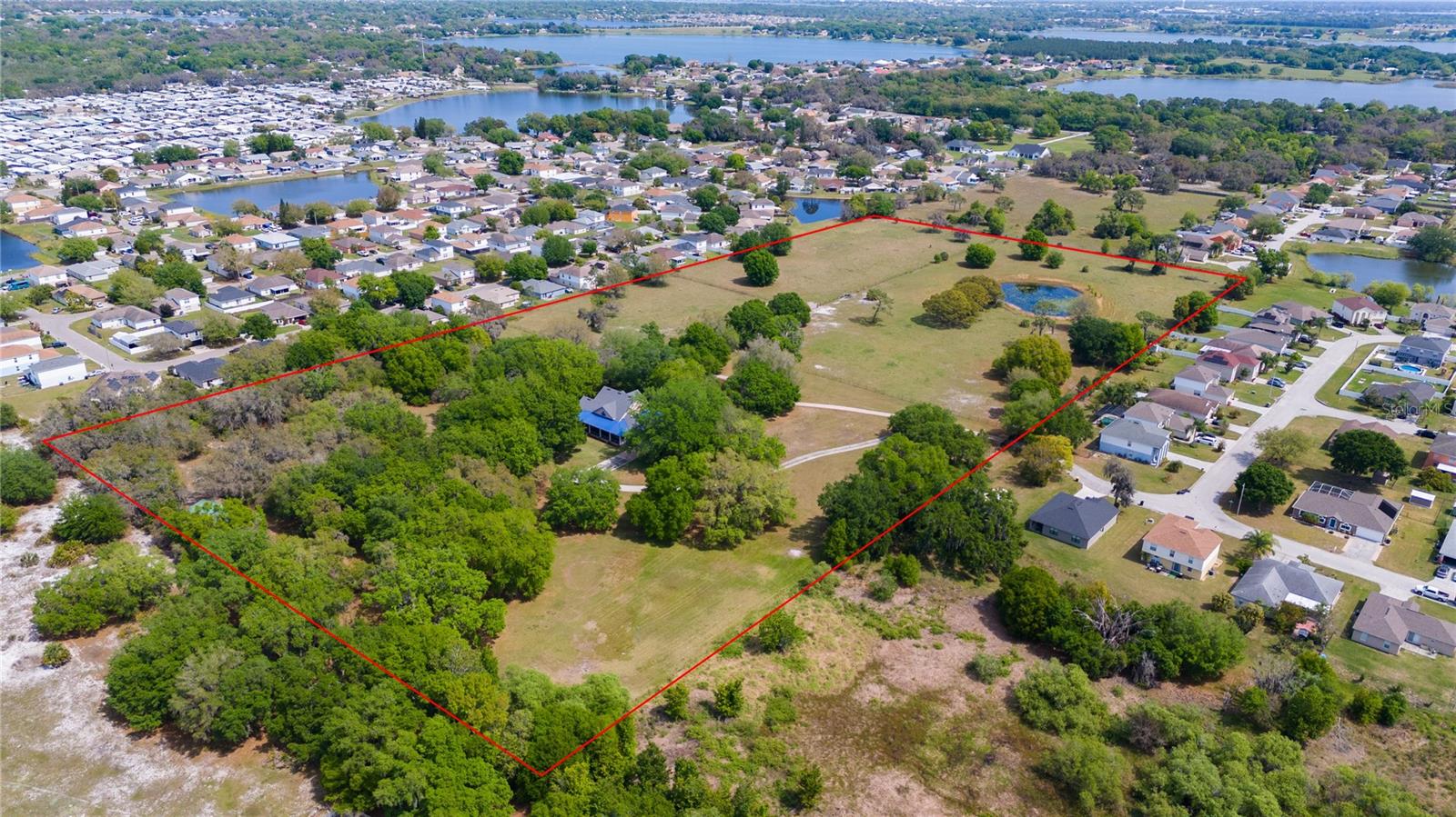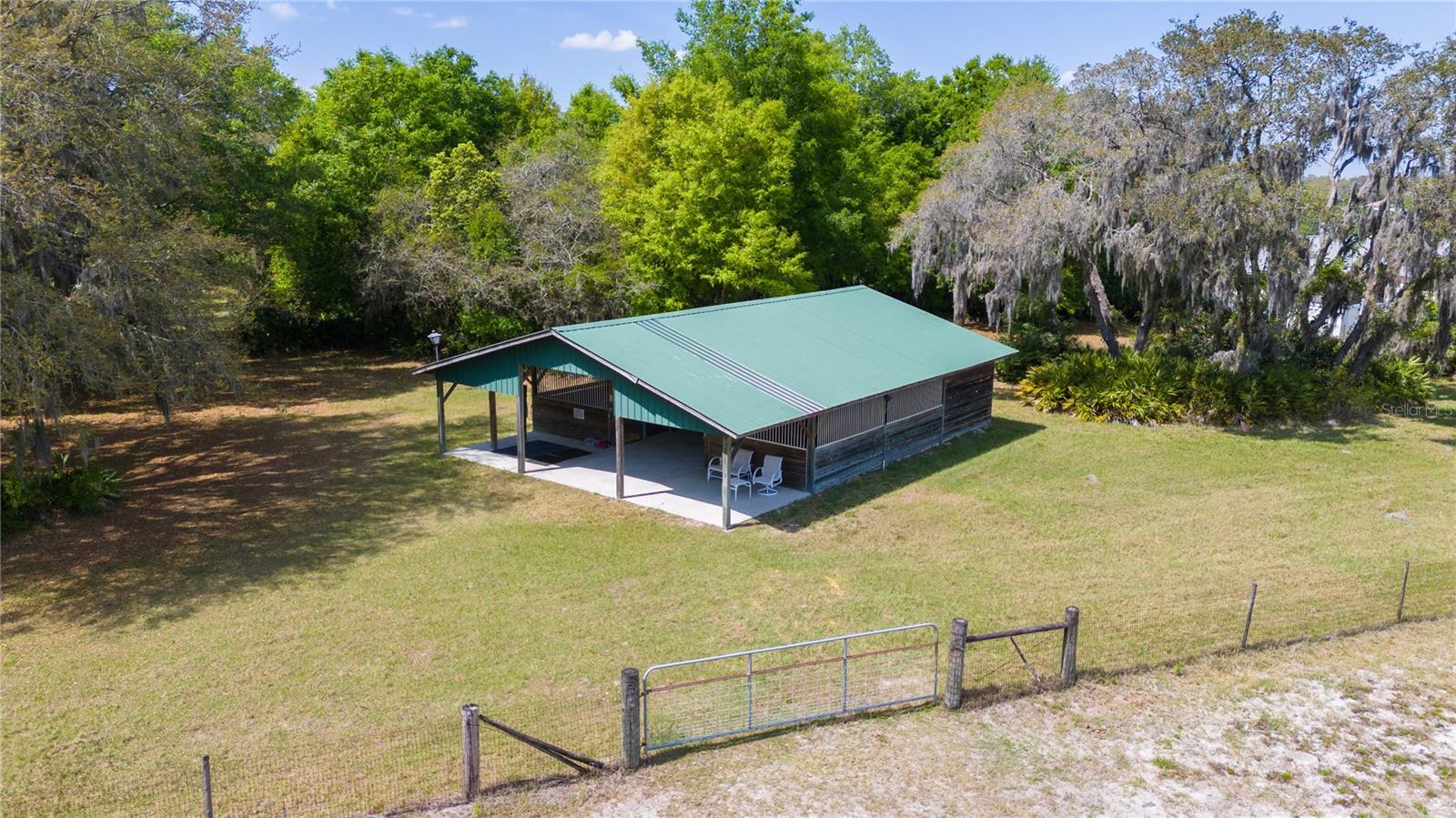 Prepare to be captivated by this enchanting 19-acre estate, a haven tailored for those with a passion for horses and nature! This expansive property boasts a spacious 3-bedroom, 3.5-bathroom home spanning over 3,700 sqft, offering a seamless fusion of opulence and comfort. Nestled amidst serene surroundings, including a tranquil pond and lush forests, this retreat provides a picturesque backdrop for creating cherished family memories. The horse stables add a touch of countryside allure, making it a haven for equestrian enthusiasts. Every aspect of this magnificent home has been meticulously crafted. The grand formal dining room sets the stage for memorable family gatherings, while the living room features soaring vaulted ceilings and custom sliding glass doors that open to the fully screened back porch and manicured backyard. The office is a sanctuary of tranquility, adorned with stained wood paneling and a custom-built storage unit. The expansive master bedroom on the first floor exudes luxury with a high tray ceiling, crown molding, and a lavish master bathroom with a 2-person jetted tub, walk-in shower, dual vanities with granite countertops, and a spacious walk-in closet. The kitchen is a culinary masterpiece, equipped with granite countertops, a gas cooktop, electric warming drawer, built-in oven and microwave, dishwasher, and an island with a sink. Solid wood cabinets are beautifully complemented by custom lighting. The laundry room offers connections for an electric washer and either a gas or electric dryer, along with ample countertop workspace and storage. An oversized 2-car garage provides additional storage space with built-in shelving. Upstairs, two additional bedrooms feature generous closet space, and there's a spacious media/multipurpose room with a ceiling-mounted video projector, motorized 100-inch projection screen, surround sound, and a bar with sink, microwave, and mini-fridge. The property is equipped with two on-demand gas hot water systems, an in-wall vacuum system, and covered front and back porches with wooden swings. The living areas feature architectural shingles replaced in 2021 and 4 HVAC units ensure comfort even in the Florida heat, with two units less than 1 year old. Outside, you'll discover a 48x36 horse barn with 4 stalls and a tack room, along with a 36x39 pole barn with an enclosed tool/storage room. The house is enveloped by majestic oak trees, providing both privacy and shade. Conveniently located just 2 miles from the entrance to the Polk Parkway, with quick access to I-4 for travel to Tampa or Orlando in just 1 hour, this property offers the perfect blend of tranquility and convenience. Lakeland and Winter Haven are each only about 10 minutes away, offering a myriad of shopping and dining options. This property is truly a must-see to fully appreciate its beauty and charm. Best of all, there is no HOA to restrict your lifestyle.