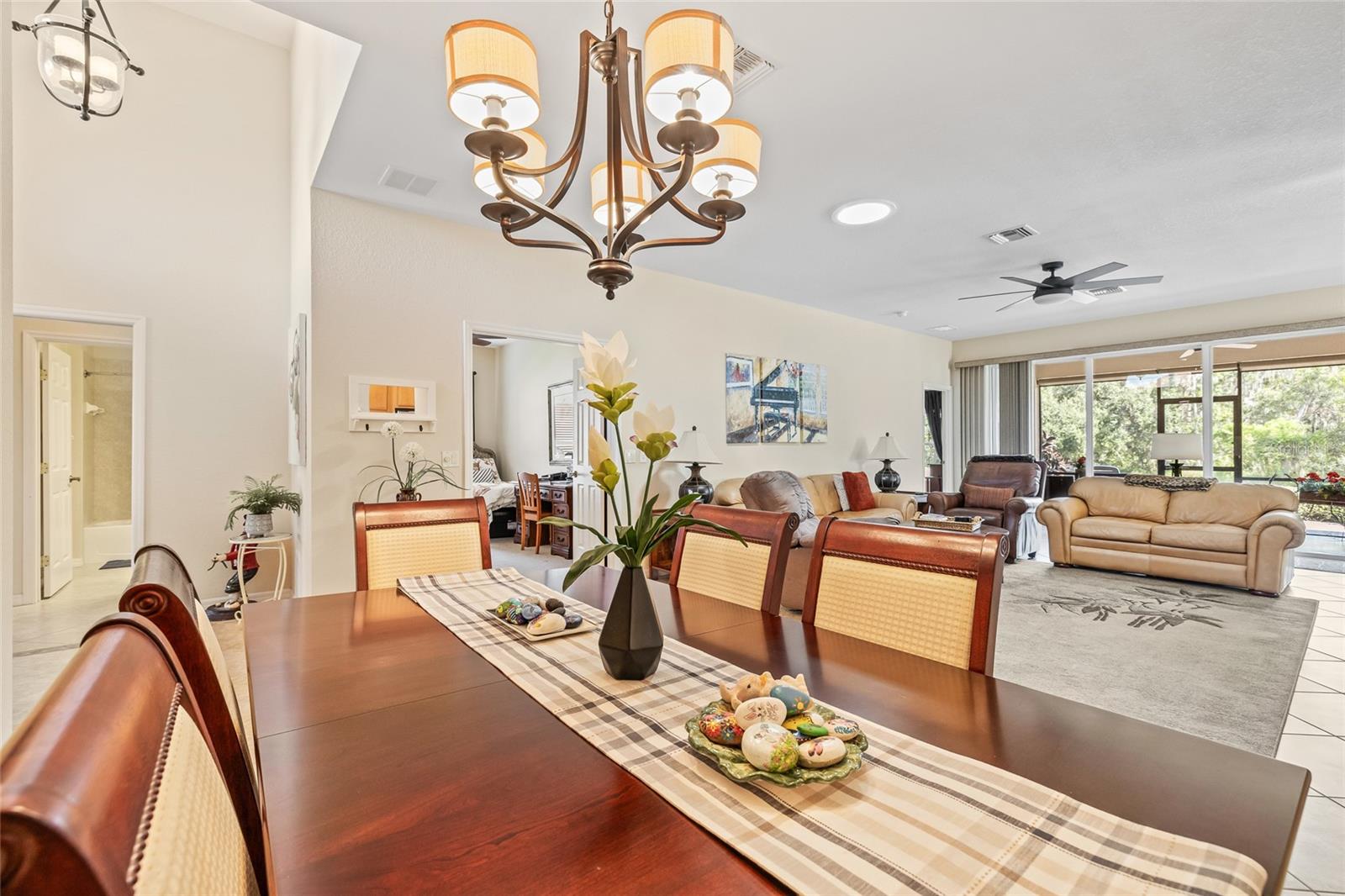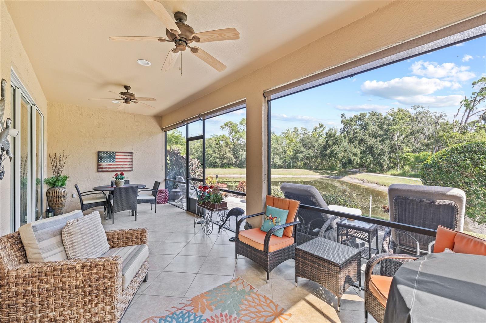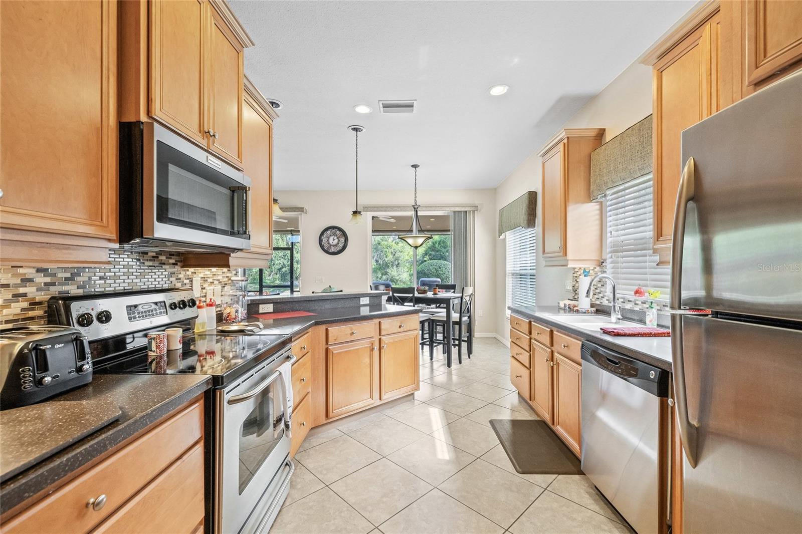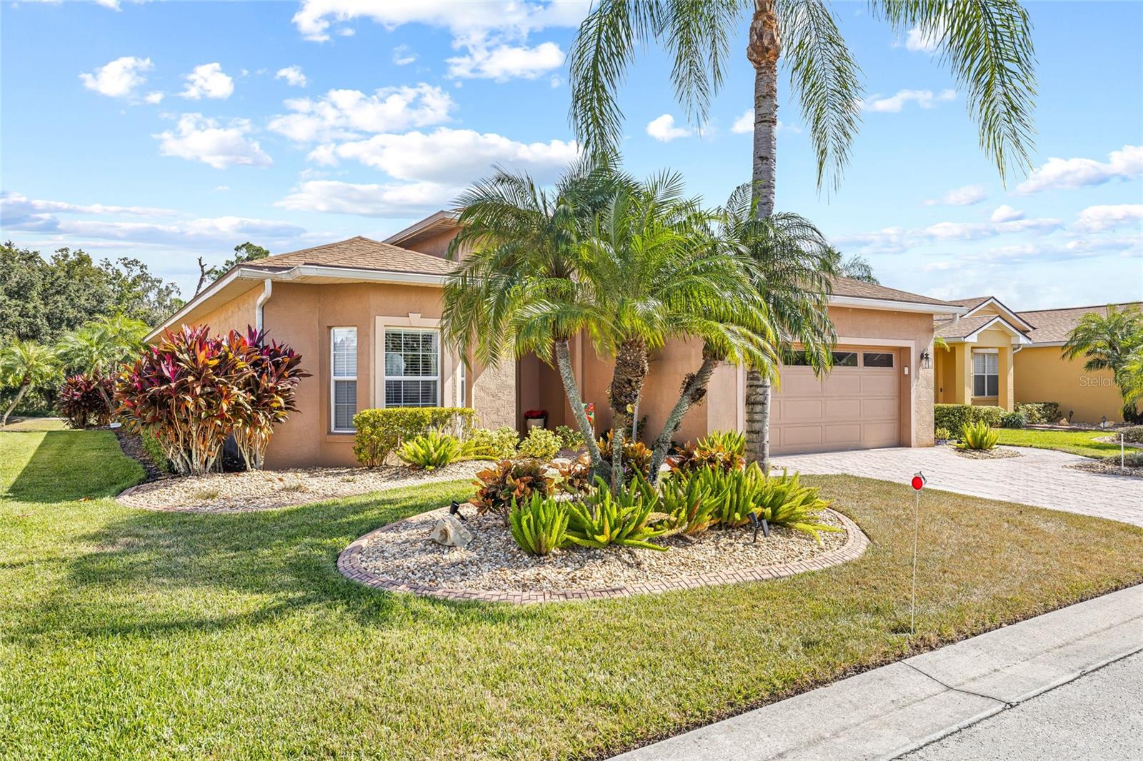 Welcome to the luxurious 55+ golf course community of Lake Ashton! The home is the Biscayne floor plan, consisting of 3 bedrooms and 2 baths and a 2 car garage. The home and garage are accessible with electronic entry for ease. This home has been a winter retreat and only lived in a few months per year. Beautifully installed ceramic tile throughout and carpet in the bedrooms with 9' ceilings create such volume to the space. This home has stainless appliances and solid countertops to compliment the solid wood cabinetry giving it overall elegant feel and spaciousness. The breakfast nook looks into the main living space as well as out to the pond and nature preserve through one of the two 8' sliders giving perfect tranquility to peaceful mornings. No backyard neighbors!! Expansive primary bedroom with soaking tub and dual walk in closets make for the perfect retreat. Home is fully furnished with golf cart in the garage and all items are negotiable with purchase. Come see all that the Lake Ashton community has to offer.