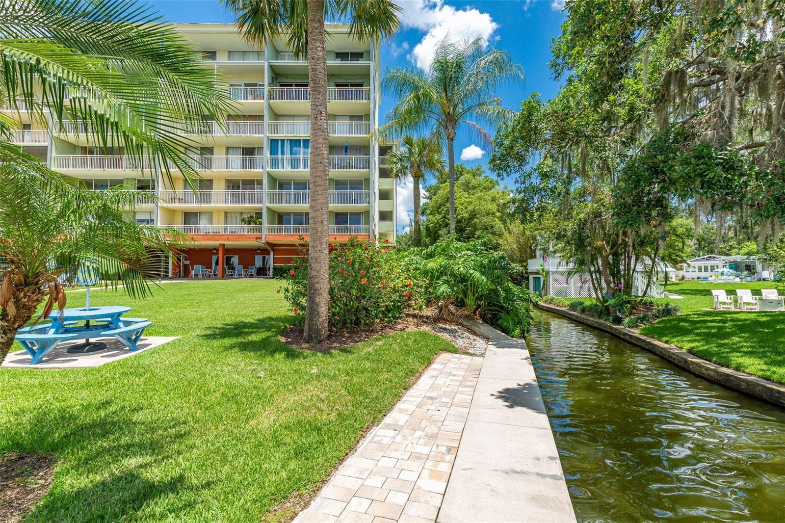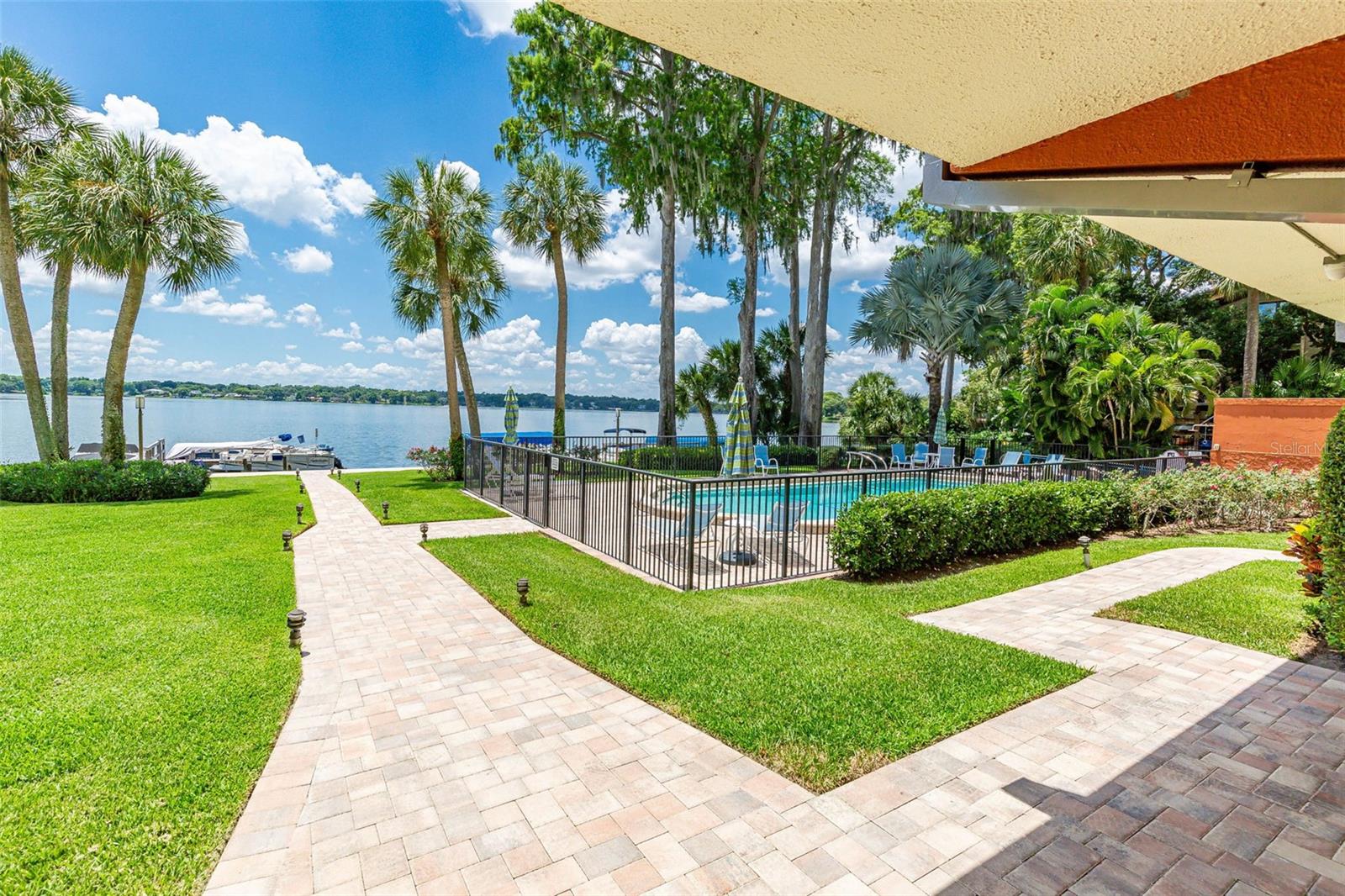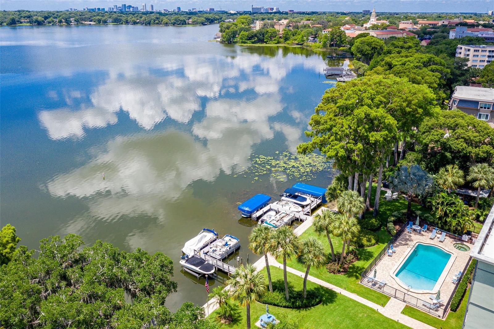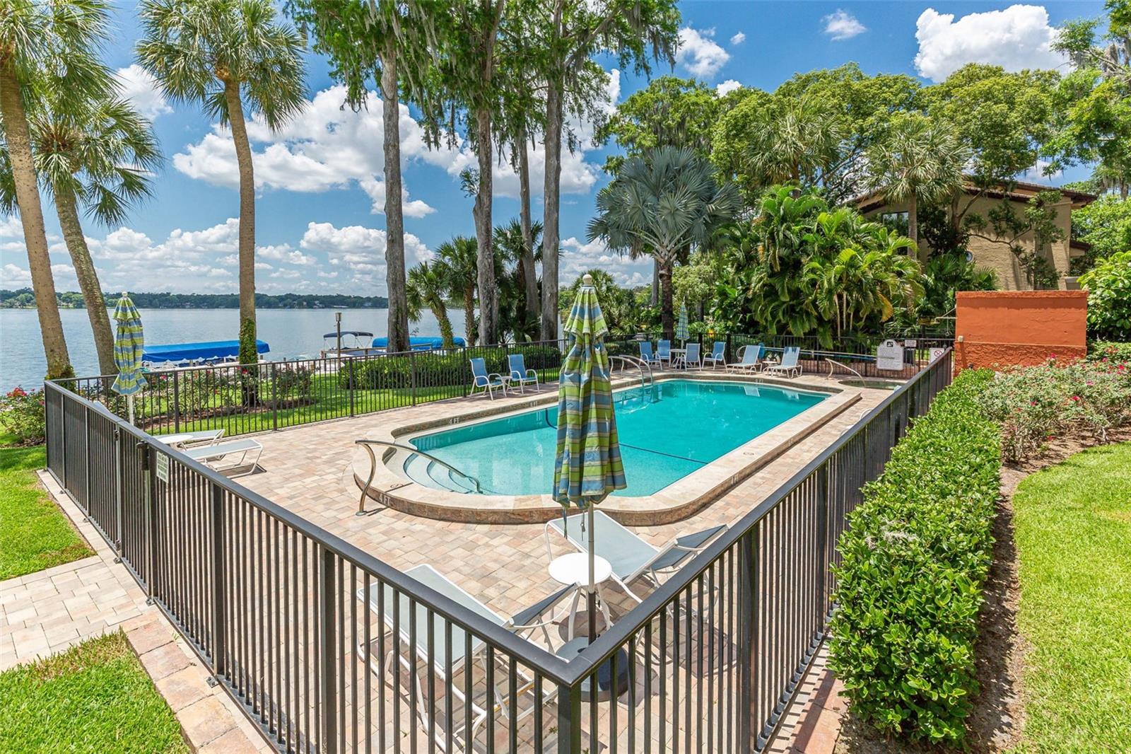 LAKEFRONT COMPLEX IN THE HEART OF WINTER PARK! This wonderful community is perfectly located on Lake Virgina less than a mile from Park Avenue in Winter Park. Situated on the Fern Canal and seen from the 246 square foot screened in porch with new sliding glass doors. Two bedrooms and updated baths, December 2023-New hardwood floors in the dining room and kitchen, New carpet in the living room and both bedrooms, Interior repainted, linen and a coat closets and an interior laundry with a stackable washer and dryer. The kitchen has Granite Counters, Nice stone backsplash, New Refrigerator, Double oven, Microwave and a large double stainless steele sink. For the dog lovers there is a gated pet area on the canal side of the building. Big bonus is a one bedroom guest suite that can be reserved and rented by the night. Amenities include Lake Access to Lake Virgina, Community Pool, Dock, (Boat Slips available via waiting list HOA Approval) Fitness Center, Ground floor covered parking 1 assigned space, recently updated Recreation room with kitchen, outdoor gas grill, a fire pit, steam and sauna rooms and a storage rack for kayak, canoes or surf board PLUS included is the Water, Trash,City Sewer, inside monthly Pest Control and Spectrum Internet. Just down the street is Dinky Dock which is a public boat ramp on Lake Virginia and access to the entire Chain of Lakes.Walking distance to outstanding restaurants, shoppes, Museums, Central Park, the Sunrail Station and Rollins College.