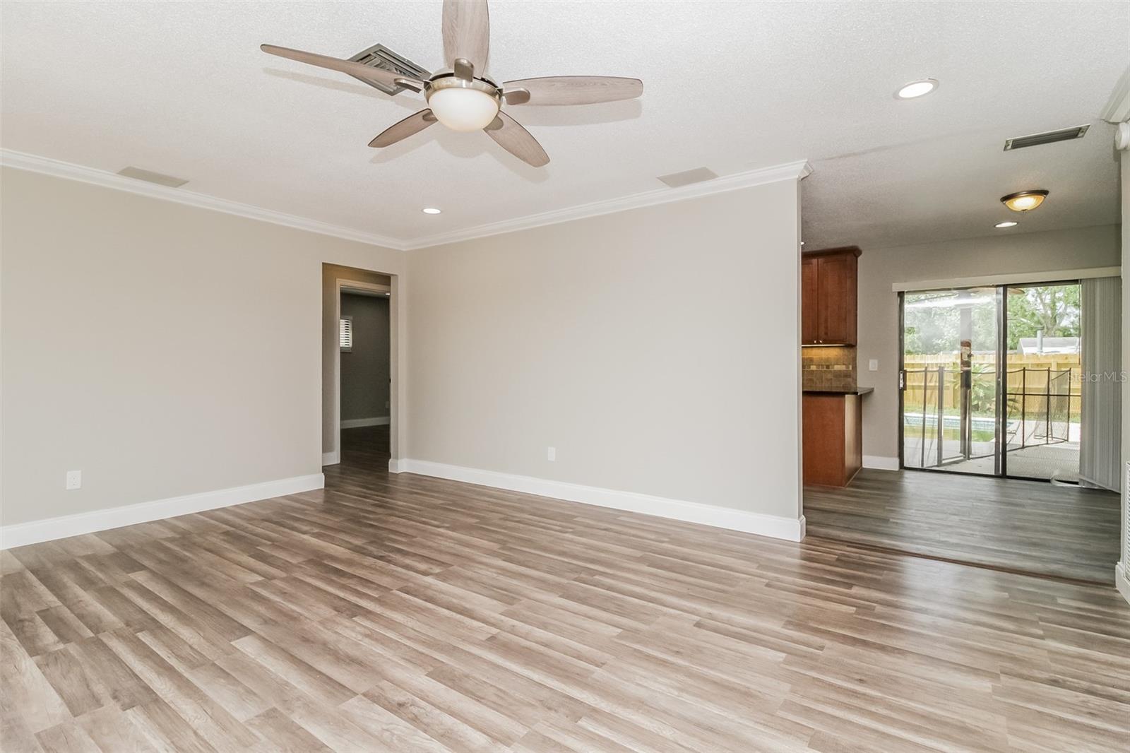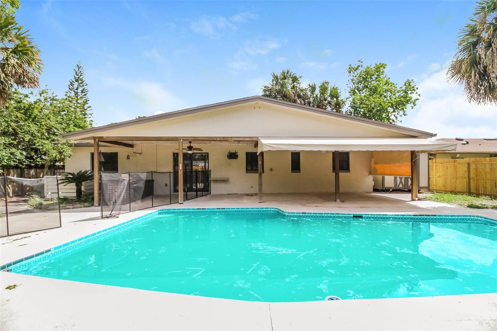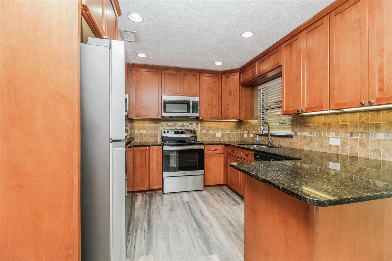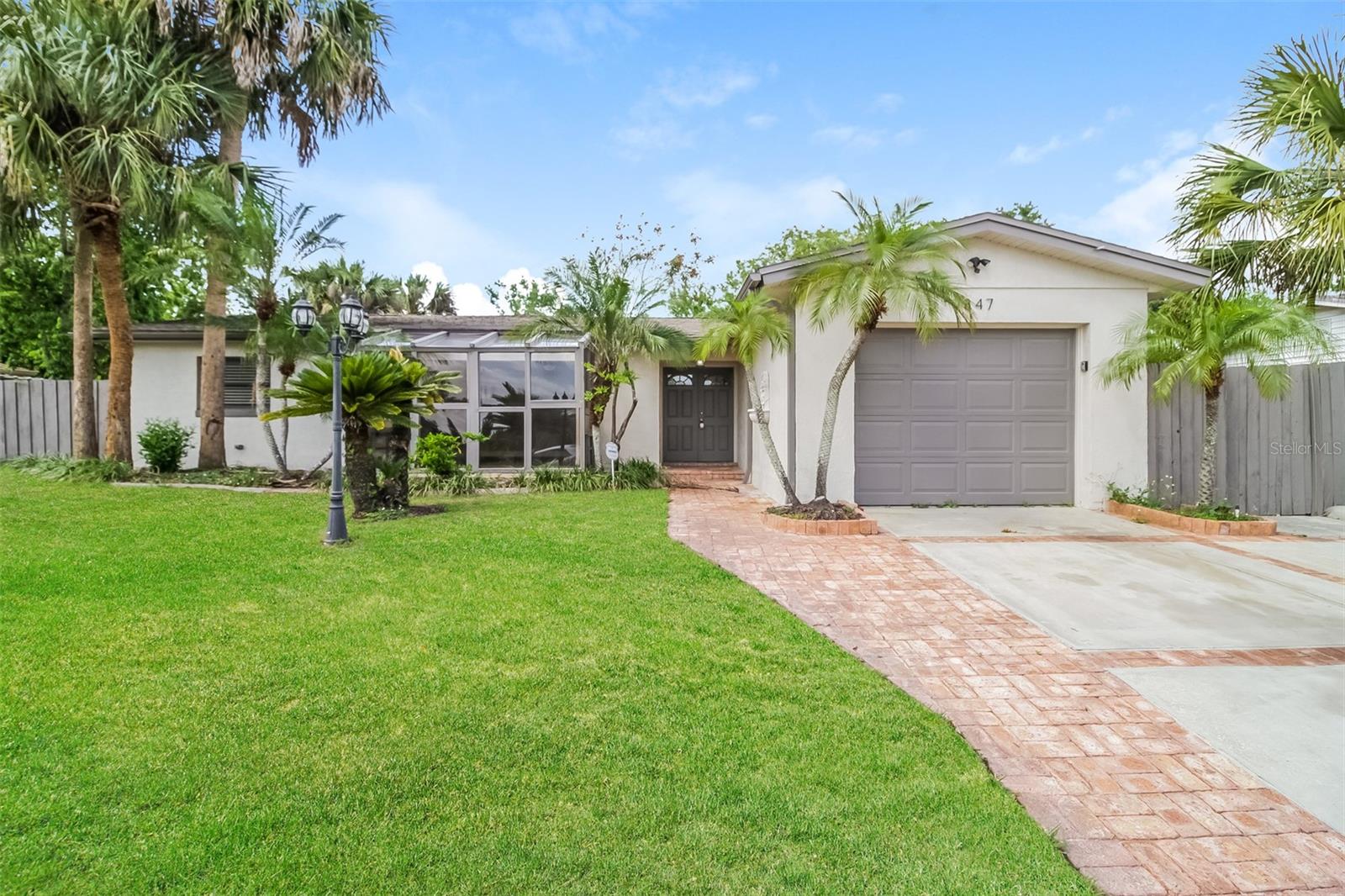 This charming 3-bedroom, 2-bath home features a thoughtful split layout, placing the master suite on one side and two additional bedrooms on the other. Inside, you'll appreciate the stylish vinyl flooring and a spacious living area illuminated by natural light from the enclosed sunroom. The kitchen showcases dark granite countertops, a sleek stone backsplash, and ample cabinet storage. The master suite is a private retreat, complete with a full bath and a secluded patio. Step outside to an exceptional outdoor space ideal for entertaining, featuring a large pool, covered patio, built-in grill, and plenty of room to relax and unwind.