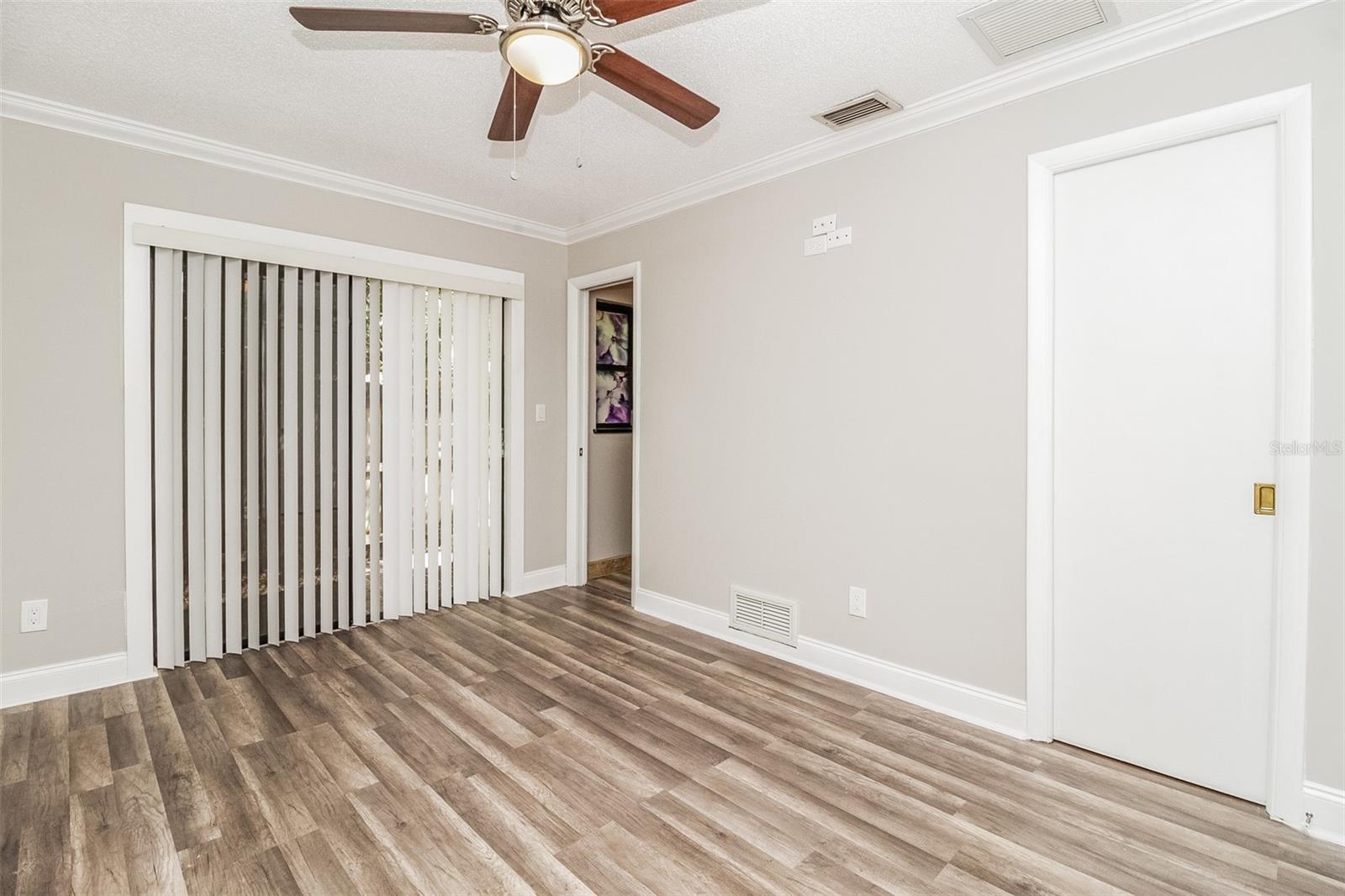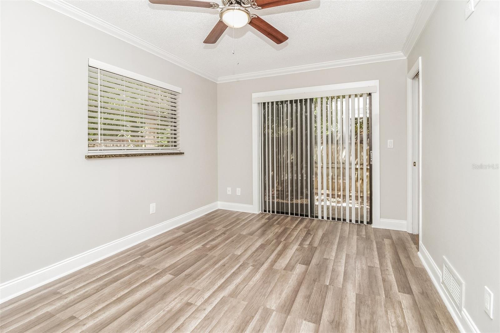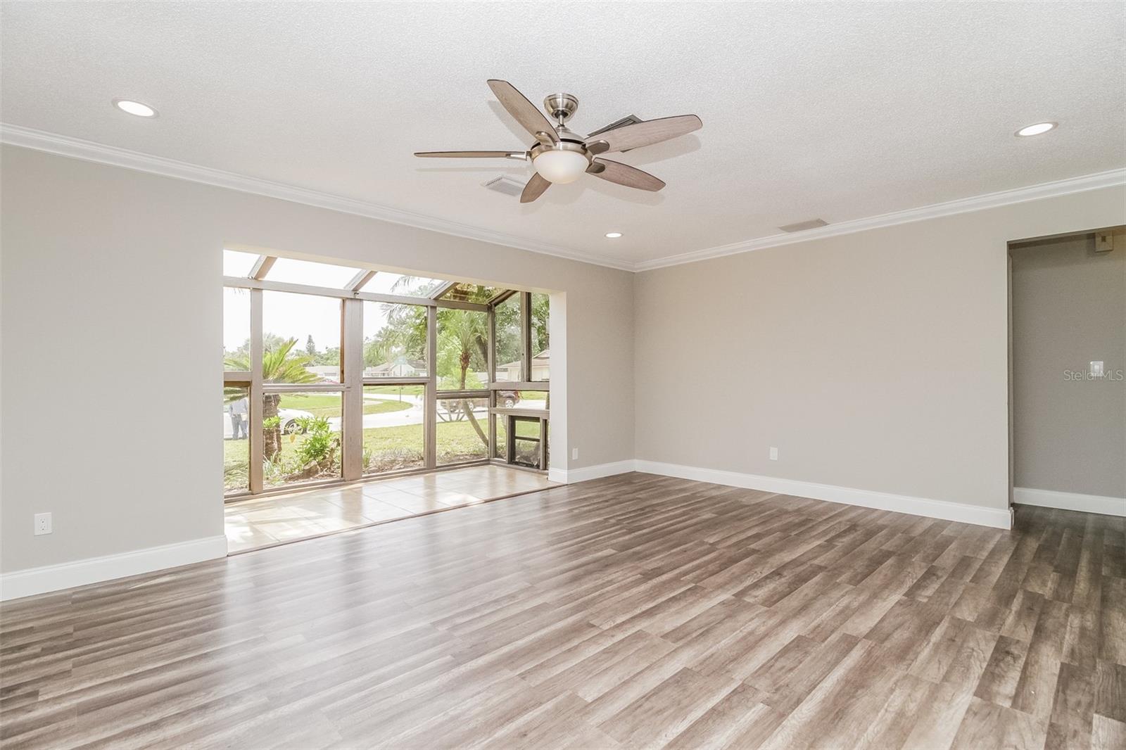 This charming 3-bedroom, 2-bath home features a thoughtful split layout, placing the master suite on one side and two additional bedrooms on the other. Inside, you'll appreciate the stylish vinyl flooring and a spacious living area illuminated by natural light from the enclosed sunroom. The kitchen showcases dark granite countertops, a sleek stone backsplash, and ample cabinet storage. The master suite is a private retreat, complete with a full bath and a secluded patio. Step outside to an exceptional outdoor space ideal for entertaining, featuring a large pool, covered patio, built-in grill, and plenty of room to relax and unwind.
