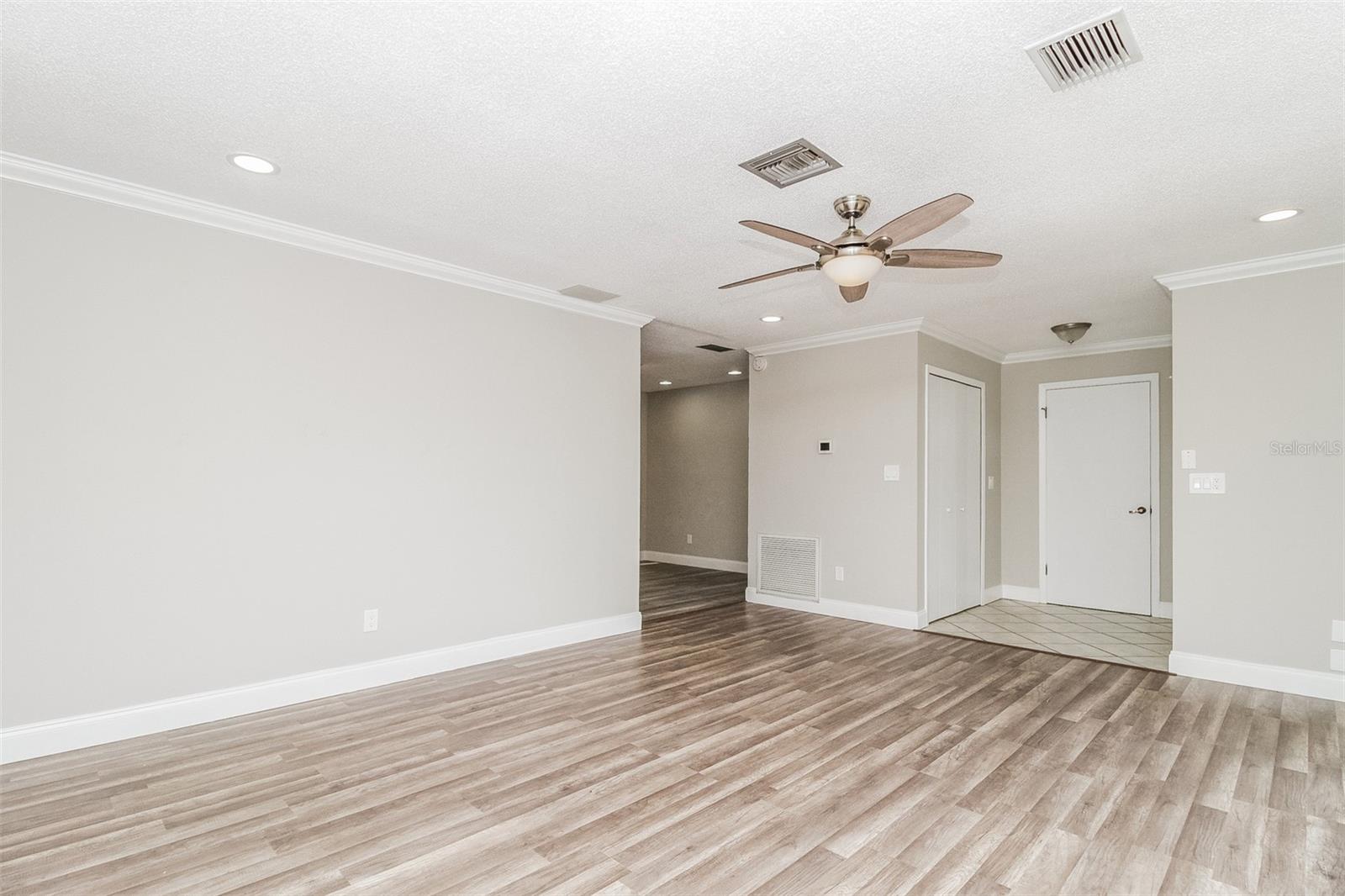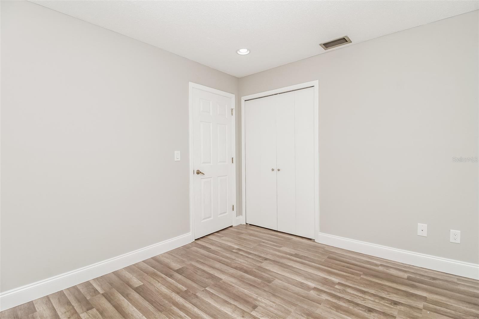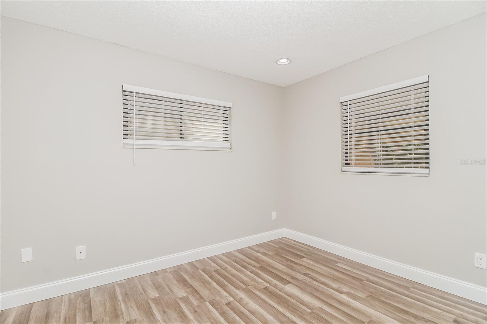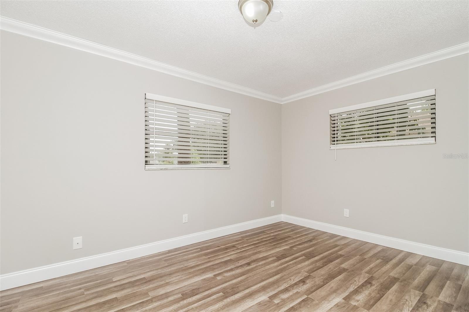 This charming 3-bedroom, 2-bath home features a thoughtful split layout, placing the master suite on one side and two additional bedrooms on the other. Inside, you'll appreciate the stylish vinyl flooring and a spacious living area illuminated by natural light from the enclosed sunroom. The kitchen showcases dark granite countertops, a sleek stone backsplash, and ample cabinet storage. The master suite is a private retreat, complete with a full bath and a secluded patio. Step outside to an exceptional outdoor space ideal for entertaining, featuring a large pool, covered patio, built-in grill, and plenty of room to relax and unwind.