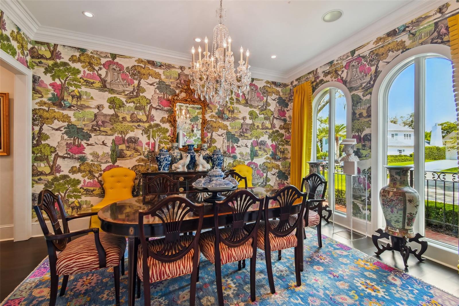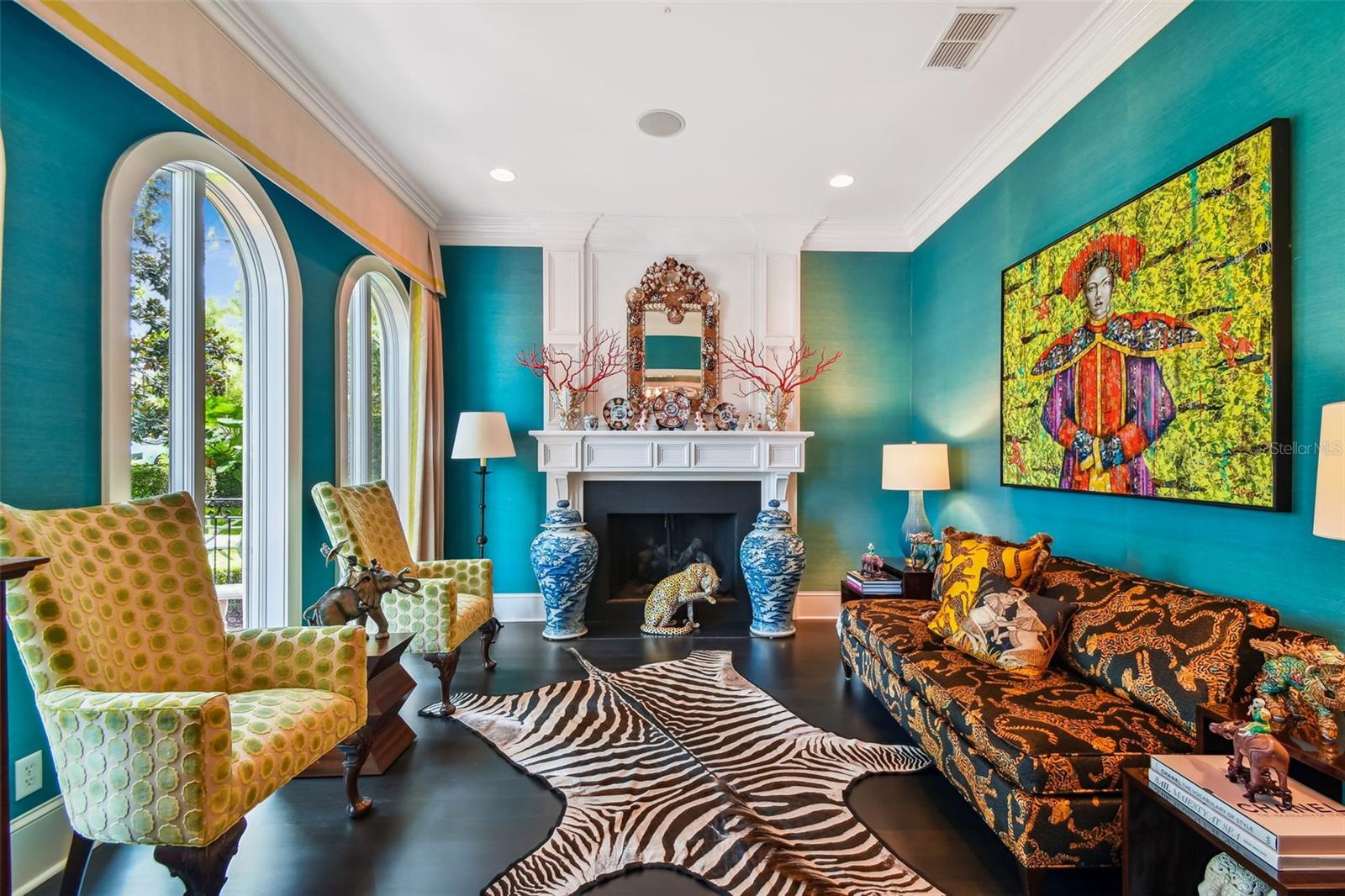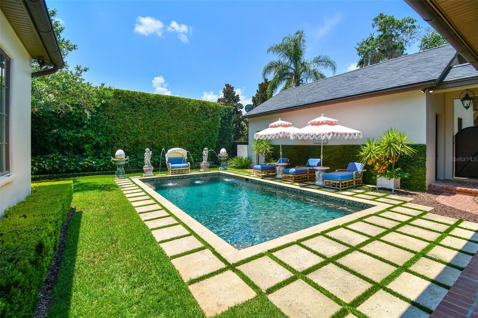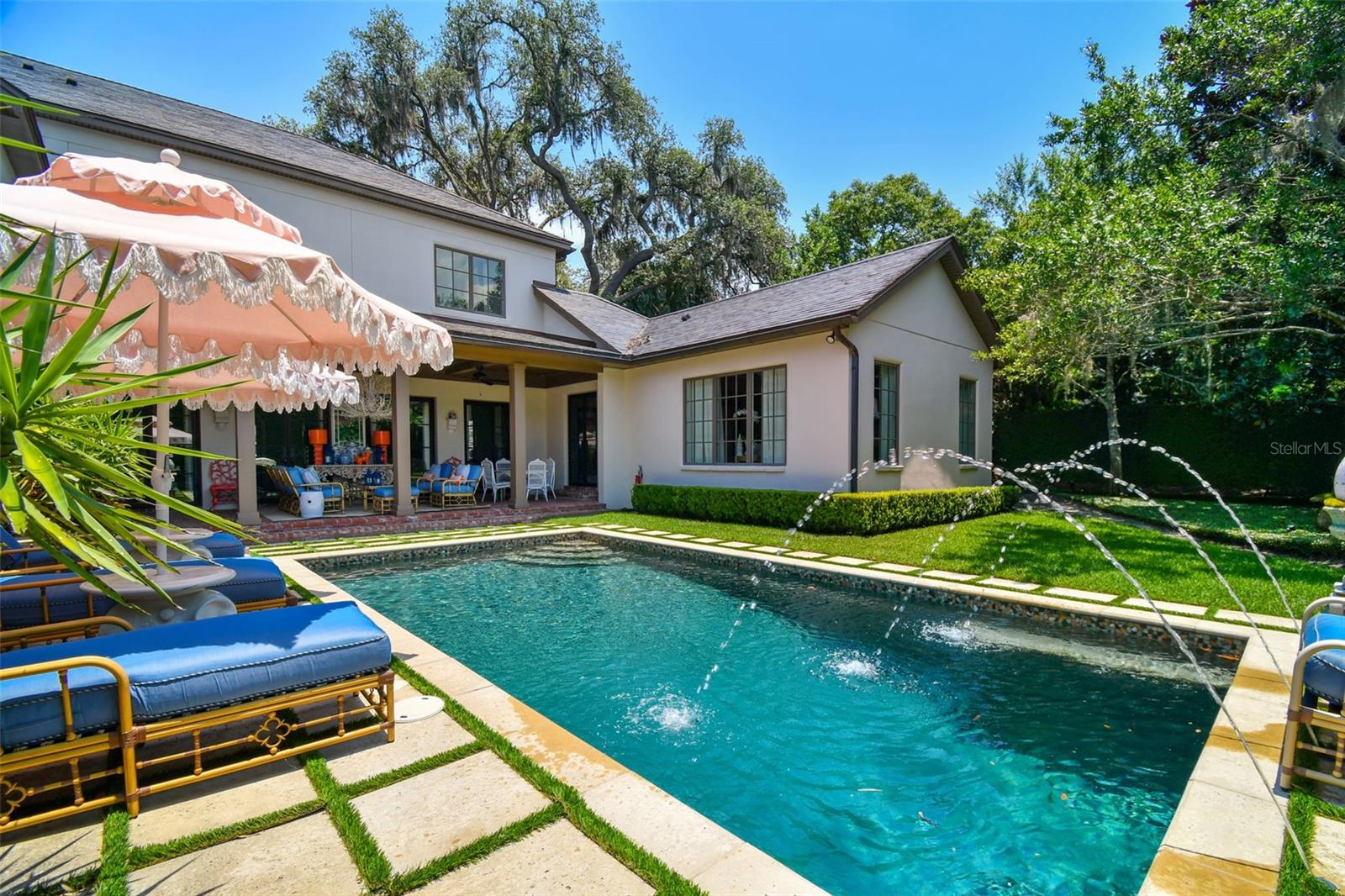 Gorgeous Winter Park home beautifully curated with designer details and recently featured in June’s “Orange Appeal” and was the 2022 Mystery Home Tour selected by Council of 101 for the Orlando Museum of Art. This elegant transitional French Provincial residence is located on a large, elevated corner lot in a quiet and secluded area in the Via’s of Winter Park. This designer home has been significantly enhanced inside and out by the current owner and is in “brand new condition.” The home features 5,100 square feet of living space and 800+ square feet of outdoor space with 5 bedrooms, 5 bathrooms, 1 half bathroom, 3 car garage, pool, patio, outdoor shower and professionally landscaped yard and lighting. Upon entry, you are welcomed through the exquisite foyer where you instantly notice the craftsmanship and expert care that went into the custom carpentry and crown molding details throughout. To the left of the foyer is an elegant and intimate parlor with grass cloth wallpaper, a gas vented fireplace and built-in bookshelves. To the right of the foyer is the formal dining room with beautiful hand painted wallpaper and an adjacent butler’s pantry. Past the foyer you are led to a spacious and grand formal living room with lacquered walls and 6 new French iron doors that flow out to a covered brick porch and picturesque back yard & pool. Designed with entertainment in mind, the adjoining chef’s kitchen includes newly painted custom cabinetry, a Sub-Zero/Wolf appliance package, a grand center island and a walk-in pantry. Built in desk and casual dining area all open to the adjoining beamed ceiling family room with gas vented fireplace and additional French doors that lead to street side patio with new awnings. First floor master retreat overlooks the pool & yard and features 14-foot wood beam vaulted ceilings. The oversized master bath with double custom lacquered vanities made in Palm Beach, mosaic marble shower and a Waterworks free standing tub, brushed brass fixtures, and walk in closet. The second-floor features nine-foot ceilings with four bedrooms (one which was converted to a beautiful women’s dressing room) and four ensuite bathrooms, covered balcony adjoining two bedrooms, two built in desks and bookshelves for office/study time and large media room with big screen tv and wet-bar. There are also two laundry rooms, one upstairs and one downstairs. Attic space inside the home and inside the garage. Recent upgrades include new slate roof/swooped decorative copper roof with chimney caps, complete chimney rebuild, nine new iron French doors, new ebony-stained oak hardwood floors, lacquered walls, newly renovated master bath and two ensuite baths. This home offers boat access to the Winter Park chain of lakes and is within short distance of the Winter Park Racquet Club. It’s also a bike ride away and a short drive to the Interlachen Country Club and Park Avenue shopping and dining district. The property is zoned for Dommerich Elementary, Maitland Middle School, and Winter Park High School.