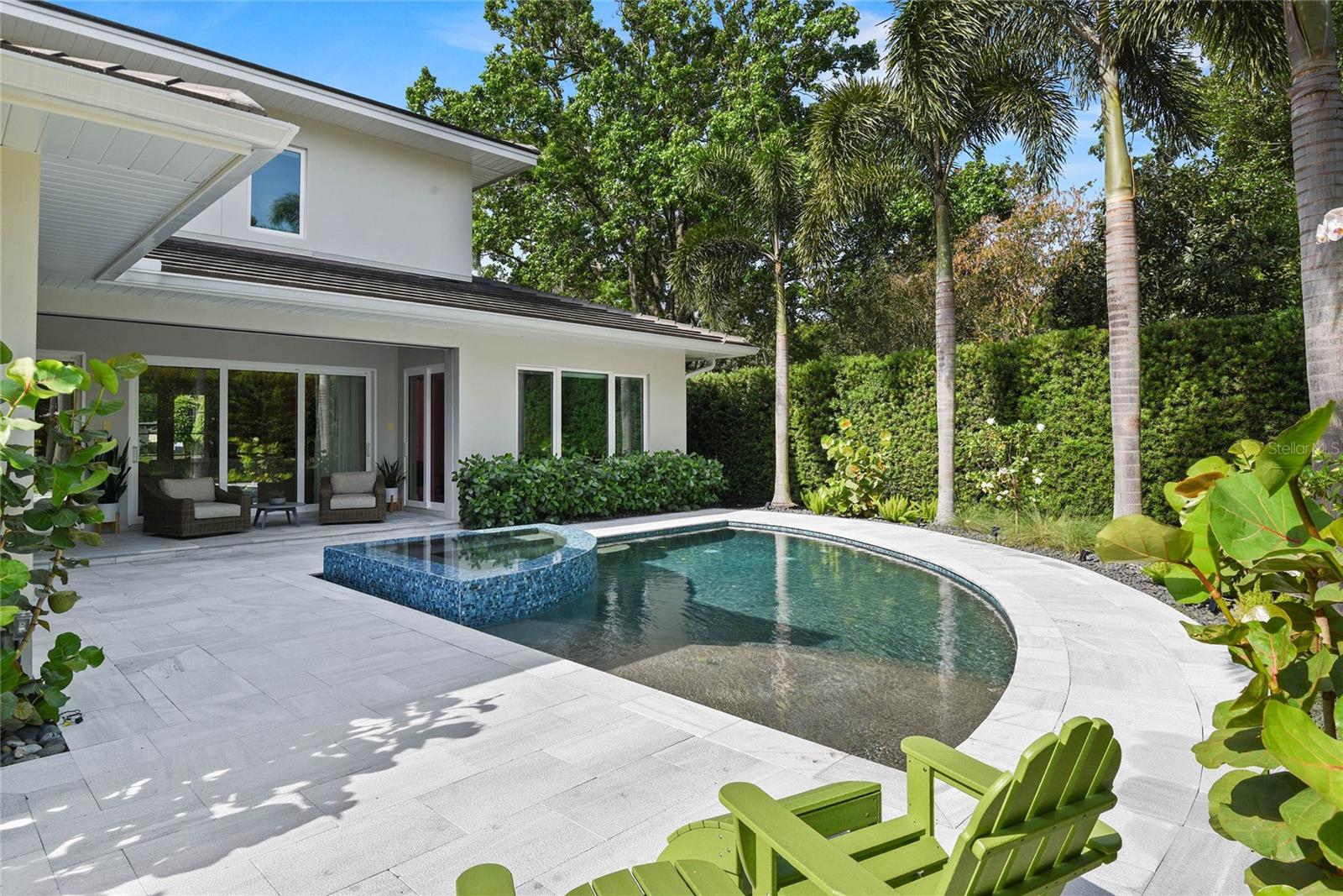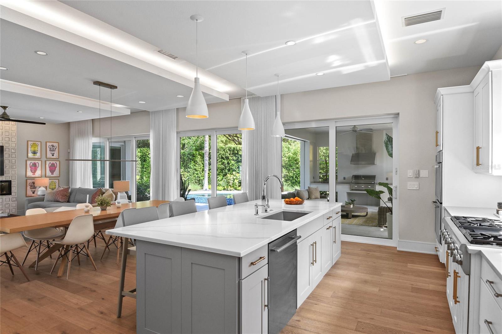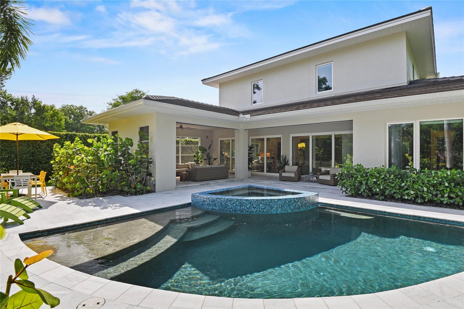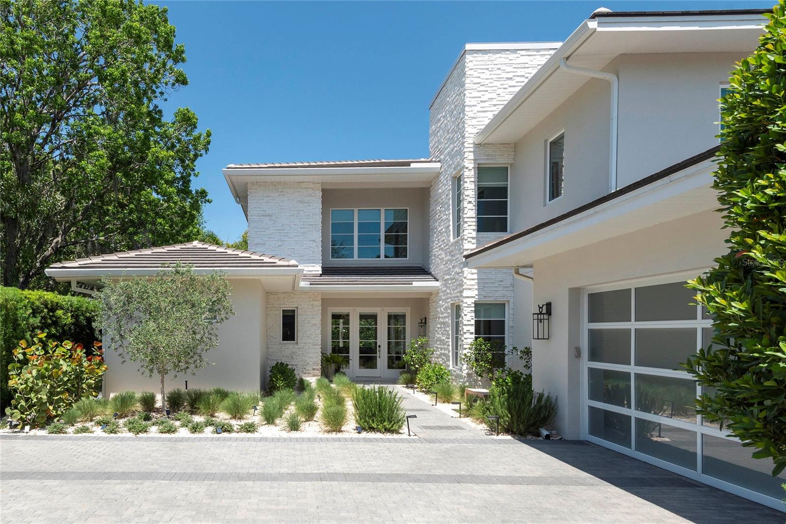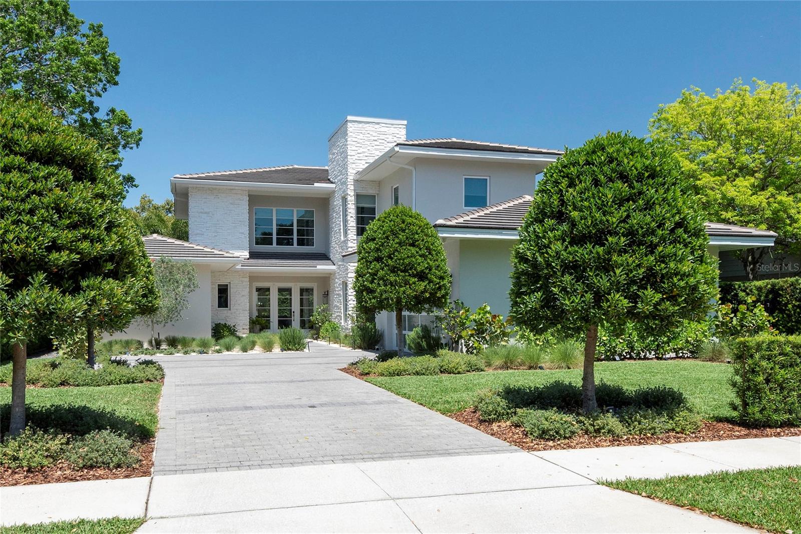 Welcome to a one-of-a-kind, custom-designed residence offering the perfect blend of modern sophistication, thoughtful functionality, and resort-style amenities. Designed by Origins Residential Design and meticulously constructed by Native Homes, this 5-bedroom, 5.5-bathroom showplace is located in one of Winter Park’s most sought-after neighborhoods—just minutes from Park Avenue, Baldwin Park, and top-rated schools. This exceptional home was built in 2019 and features a flexible, open-concept layout that exudes comfort and luxury. The spacious main living areas are drenched in natural light and designed for seamless entertaining and everyday ease. The split-bedroom floorplan offers five generously sized en-suite bedrooms, each with its own private bath—no shared walls between any bedrooms ensure total peace and privacy for all. Two bedrooms are located on the first floor, including the lavish downstairs primary suite with a spa-inspired bathroom featuring a soaking tub, oversized dual vanities, frameless glass shower, and an enormous custom-designed walk-in closet. The heart of the home is the chef’s dream kitchen, masterfully laid out with distinct zones for cooking and gathering. Highlights include a gas cooktop, Thermador appliances, huge quartz-topped island, 42” cabinets, a cozy coffee and juicing nook, an oversized walk-in pantry, and a striking design that marries stainless steel with warm brass accents. Just off the kitchen, a separate beverage zone includes a built-in wine fridge, making entertaining effortless. No detail has been overlooked—from the White Oak hardwood flooring and marble inlay floors, to the suspended ceilings, solid Shaker-style interior doors, 7” milled baseboards, and designer light fixtures throughout. Modern conveniences include pre-wired surround sound, recessed lighting, dimmable lighting with frameless switch plates, custom framed mirrors, new Kohler bath fixtures, and a whole-house water filtration system. Restoration Hardware sheer drapes ($20K), remote-operated Shade Store treatments Enjoy seamless indoor-outdoor living in the resort-style backyard retreat. The ultra high-end, zero-edge saltwater pool and spa feature Aqua Pearl interior finish, glass mosaics, and are fully smartphone-controlled, including lighting, jets, and both gas spa and pool heaters. Entertain under the covered outdoor patio complete with an Artisan grill, new neutral-toned accent walls, and outdoor kitchen—all surrounded by sandblasted Carrara marble pavers, remote-controlled vanishing screens, and a full privacy fence with Podocarpus hedge. Extensive professional landscaping includes fresh sod, tilled and leveled topsoil, blooming flower bushes, and river rock side paths. The backyard also features new turf, a dedicated dog run, and completely upgraded irrigation for optimal efficiency. Oversized 2-car garage, tile roof, gutter guards, security system with cameras, new washer/dryer, and professional landscaping with upgraded irrigation. Quiet zone near hospitals, attracting medical professionals. Electrical lines to be buried within few months and very strong internet. Minutes to Baldwin Park, Park Avenue, restaurants, shopping, Wellness Center, and scenic trails. Zoned for top-rated Winter Park schools (Brookshire, Glenridge, Winter Park High) and near private schools- Lake Highland Prep, Park Maitland, Geneva School and more