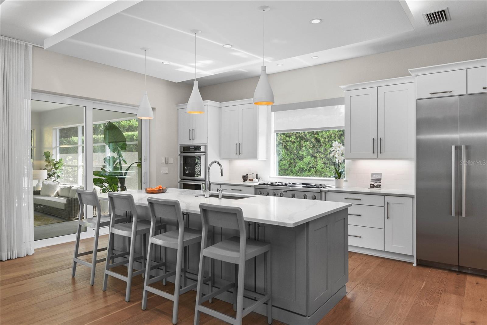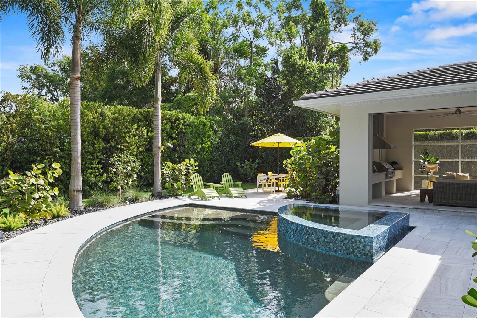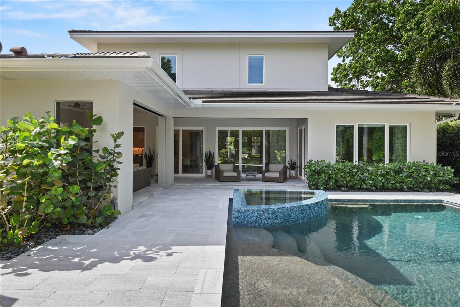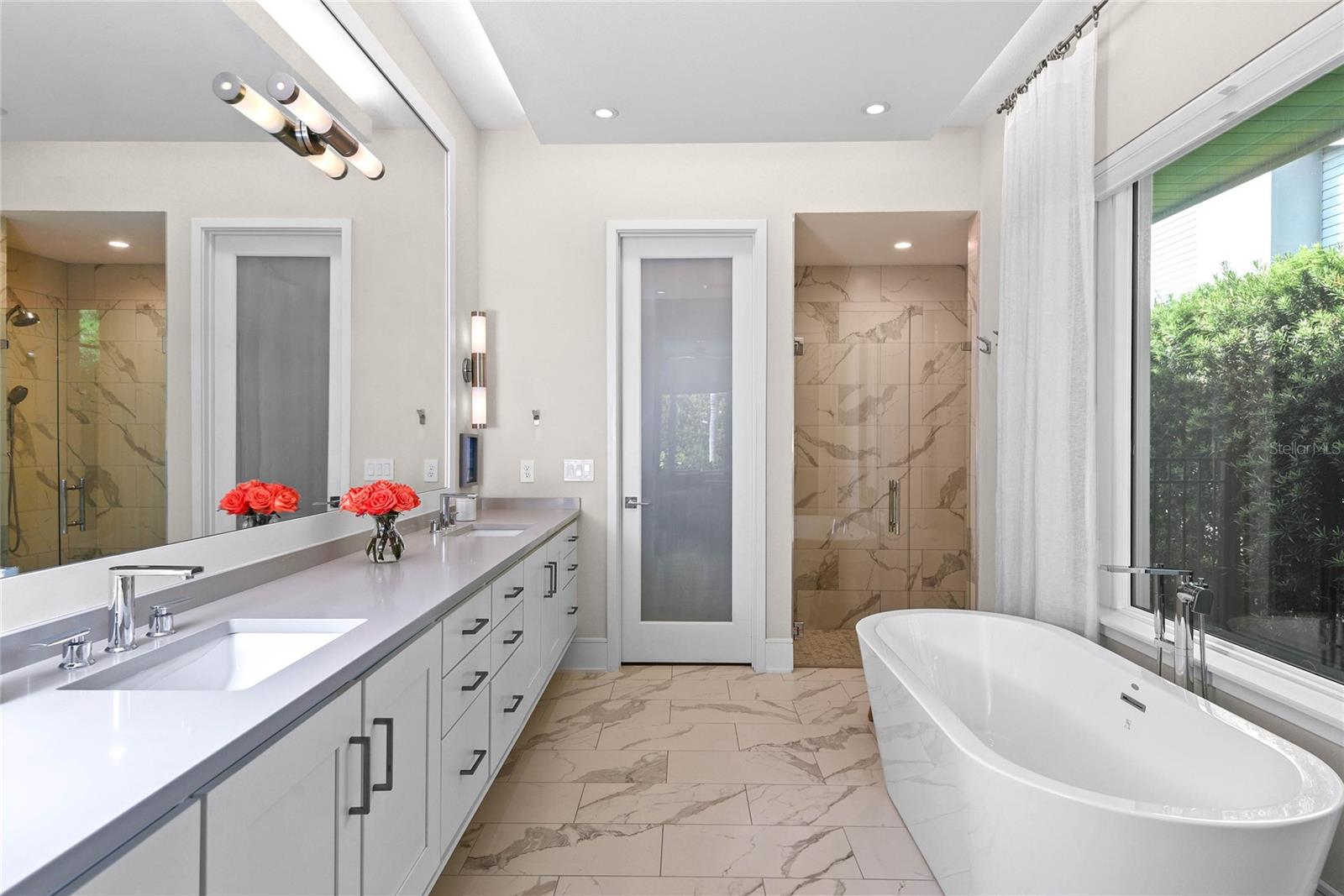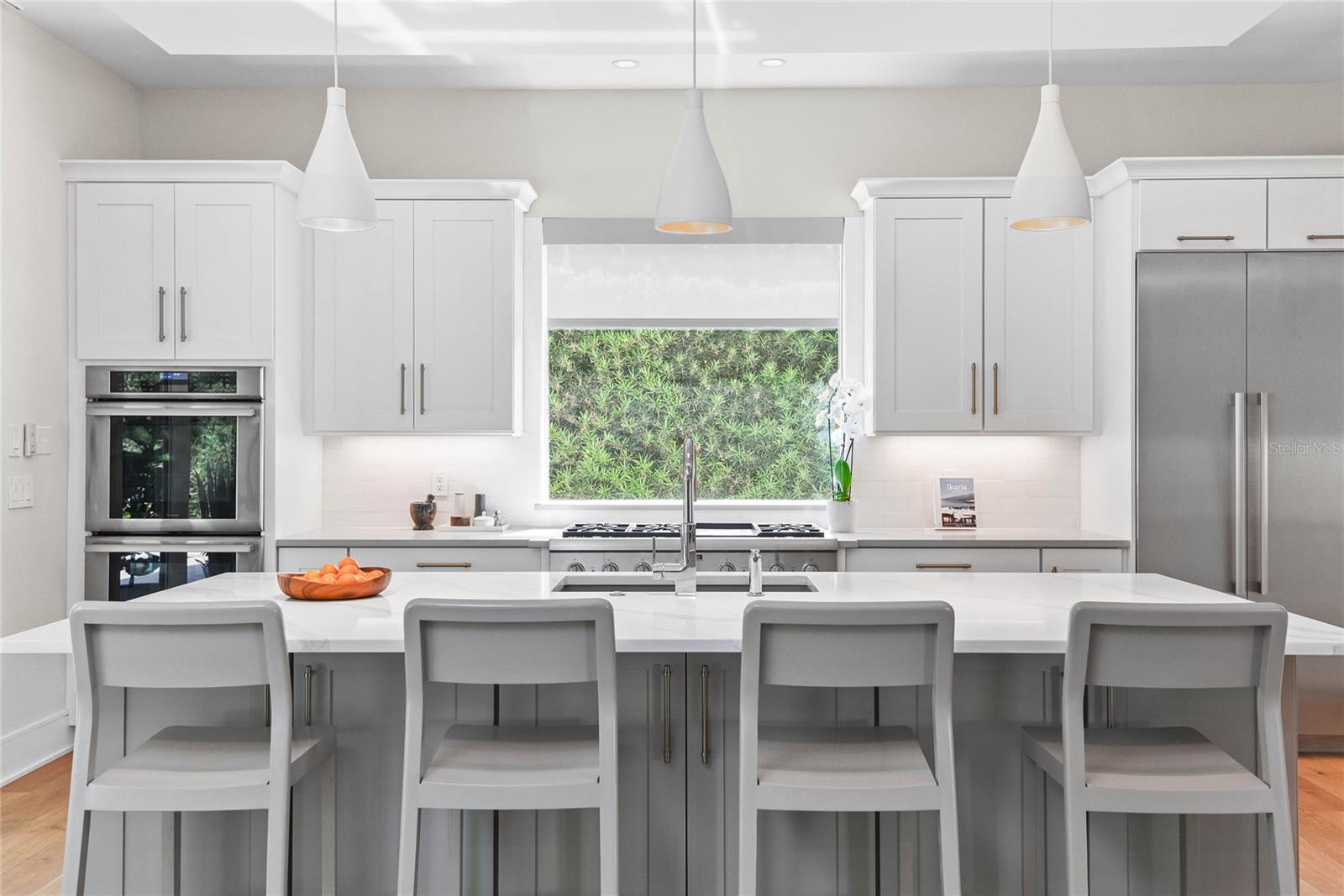 Welcome to a one-of-a-kind, custom-designed residence offering the perfect blend of modern sophistication, thoughtful functionality, and resort-style amenities. Designed by Origins Residential Design and meticulously constructed by Native Homes, this 5-bedroom, 5.5-bathroom showplace is located in one of Winter Park’s most sought-after neighborhoods—just minutes from Park Avenue, Baldwin Park, and top-rated schools. This exceptional home was built in 2019 and features a flexible, open-concept layout that exudes comfort and luxury. The spacious main living areas are drenched in natural light and designed for seamless entertaining and everyday ease. The split-bedroom floorplan offers five generously sized en-suite bedrooms, each with its own private bath—no shared walls between any bedrooms ensure total peace and privacy for all. Two bedrooms are located on the first floor, including the lavish downstairs primary suite with a spa-inspired bathroom featuring a soaking tub, oversized dual vanities, frameless glass shower, and an enormous custom-designed walk-in closet. The heart of the home is the chef’s dream kitchen, masterfully laid out with distinct zones for cooking and gathering. Highlights include a gas cooktop, Thermador appliances, huge quartz-topped island, 42” cabinets, a cozy coffee and juicing nook, an oversized walk-in pantry, and a striking design that marries stainless steel with warm brass accents. Just off the kitchen, a separate beverage zone includes a built-in wine fridge, making entertaining effortless. No detail has been overlooked—from the White Oak hardwood flooring and marble inlay floors, to the suspended ceilings, solid Shaker-style interior doors, 7” milled baseboards, and designer light fixtures throughout. Modern conveniences include pre-wired surround sound, recessed lighting, dimmable lighting with frameless switch plates, custom framed mirrors, new Kohler bath fixtures, and a whole-house water filtration system. Restoration Hardware sheer drapes ($20K), remote-operated Shade Store treatments Enjoy seamless indoor-outdoor living in the resort-style backyard retreat. The ultra high-end, zero-edge saltwater pool and spa feature Aqua Pearl interior finish, glass mosaics, and are fully smartphone-controlled, including lighting, jets, and both gas spa and pool heaters. Entertain under the covered outdoor patio complete with an Artisan grill, new neutral-toned accent walls, and outdoor kitchen—all surrounded by sandblasted Carrara marble pavers, remote-controlled vanishing screens, and a full privacy fence with Podocarpus hedge. Extensive professional landscaping includes fresh sod, tilled and leveled topsoil, blooming flower bushes, and river rock side paths. The backyard also features new turf, a dedicated dog run, and completely upgraded irrigation for optimal efficiency. Oversized 2-car garage, tile roof, gutter guards, security system with cameras, new washer/dryer, and professional landscaping with upgraded irrigation. Quiet zone near hospitals, attracting medical professionals. Electrical lines to be buried within few months and very strong internet. Minutes to Baldwin Park, Park Avenue, restaurants, shopping, Wellness Center, and scenic trails. Zoned for top-rated Winter Park schools (Brookshire, Glenridge, Winter Park High) and near private schools- Lake Highland Prep, Park Maitland, Geneva School and more