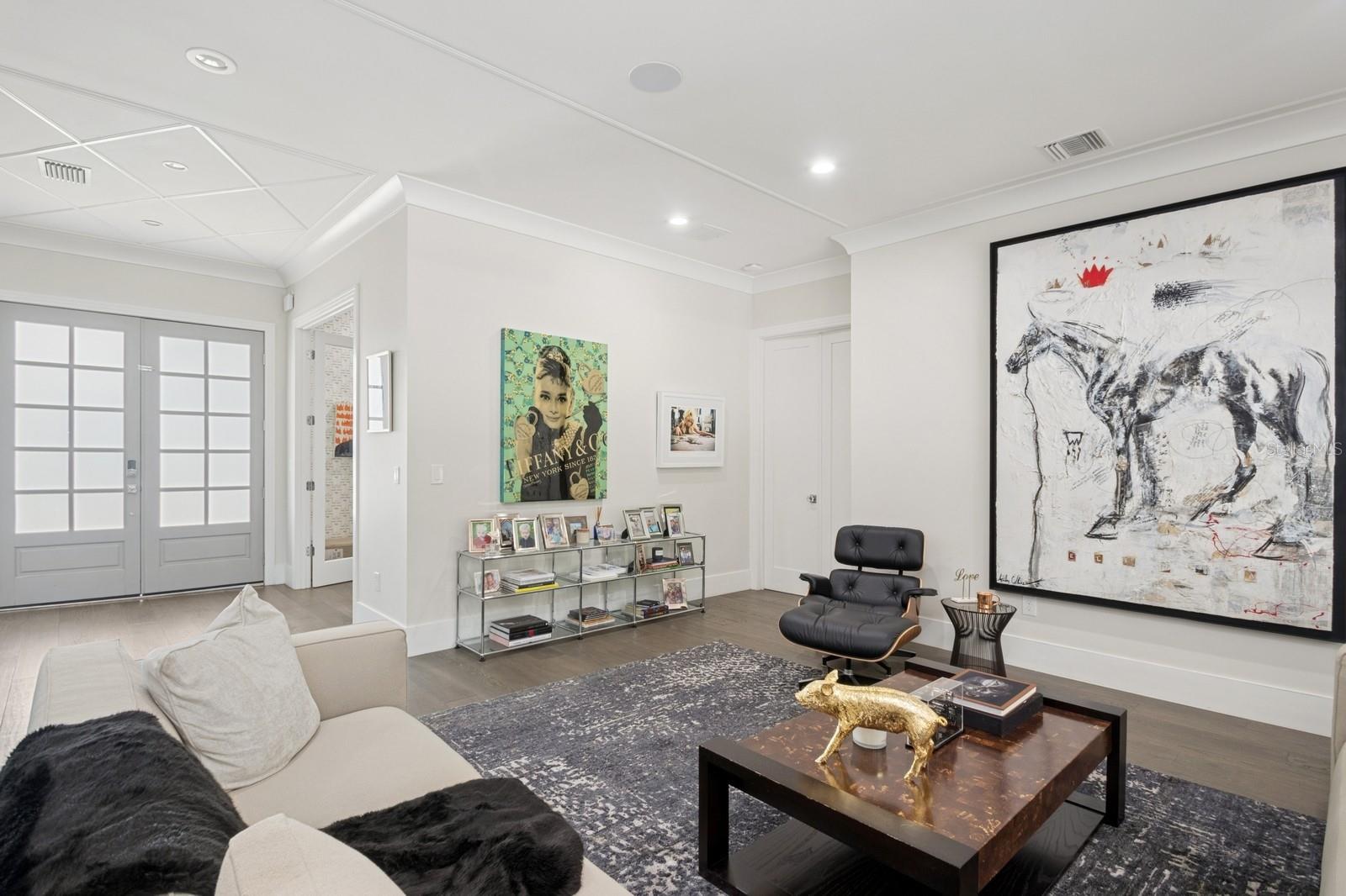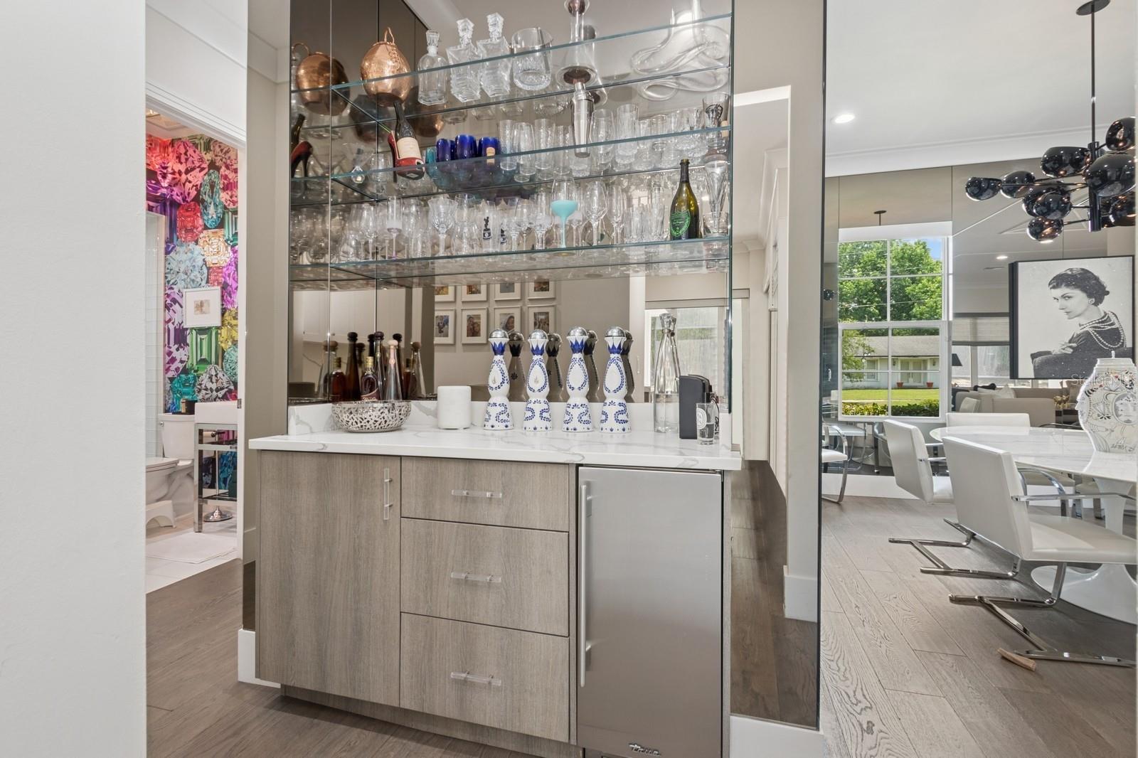 One of the most coveted neighborhoods in all of Winter Park! This custom-built 5-bedroom, 5.5-bath residence was completed in 2017 and first sold in 2018. Lovingly maintained by the original owner and elevated with high-end designer finishes, the home showcases the impeccable vision of renowned designer Ted Maines, who reimagined much of the interior with timeless sophistication. Perfectly positioned on a prime over-sized corner lot, the home blends transitional architecture with modern elegance. Sunlight fills the open layout through expansive sliding doors, creating effortless indoor-outdoor flow. The main living area seamlessly connects a formal living room and spacious dining area to the gourmet kitchen, complete with custom cabinetry, Carrara marble surfaces, and Sub-Zero and Wolf appliances. A cozy family room with fireplace provides a relaxed yet stylish gathering space. The private downstairs primary suite opens directly to the lanai, saltwater pool and features a spa-style bath. A secondary ground floor bedroom is perfect for guests or multigenerational living. Upstairs, enjoy a spacious loft with custom bar, leading to a versatile media room. Three additional en-suite bedrooms complete the second level. Recent enhancements include a full-house generator, a newly added semi-circular driveway that enhances curb appeal and functionality, and three newer A/C units with re-engineered, high-efficiency ductwork to ensure optimal climate control throughout the home. The outdoor living space is equally impressive, offering a saltwater heated pool and spa with cascading waterfall, elegant stone decking, ambient lighting, and a covered summer kitchen—ideal for year-round entertaining. A rare 3-car garage completes this exceptional home. All just moments from the shops, dining, and charm of downtown Winter Park.