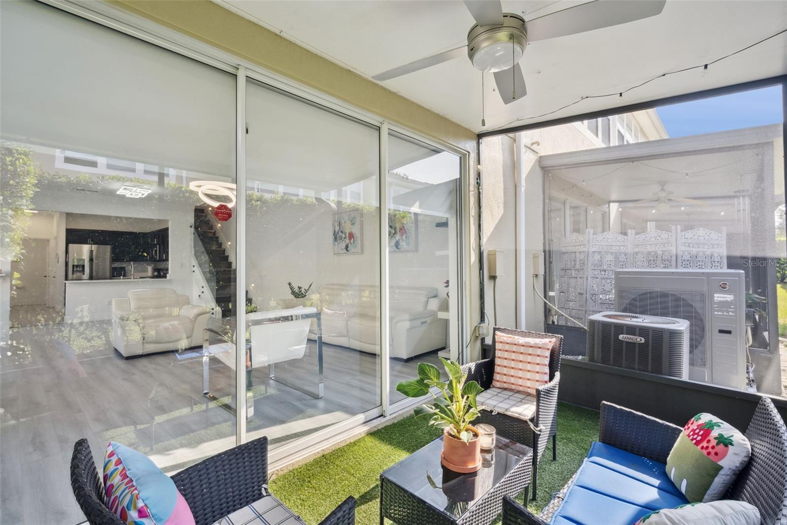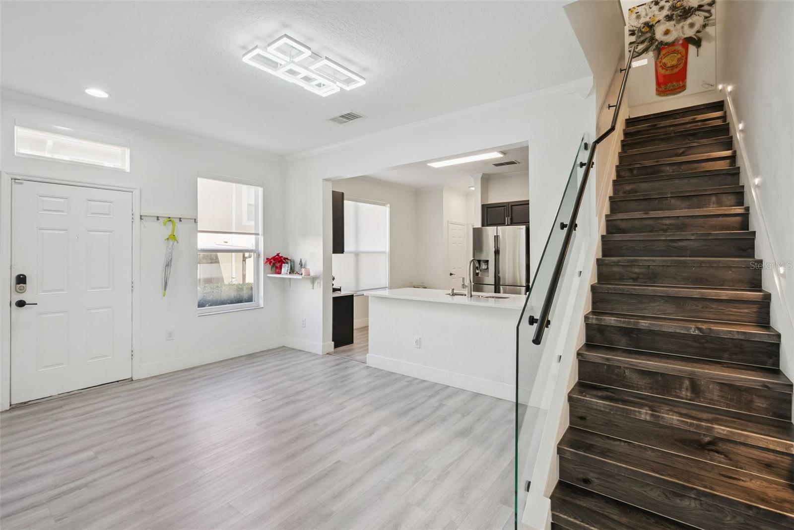 Welcome to this beautifully upgraded corner townhome located in the desirable gated community of VISTAS AT LAKE HOWELL in Winter Park, Seminole County. This spacious residence offers 1,682 sq ft under air (2,861 sq ft total), built in 2004, with 3 bedrooms and 2.5 baths, and is perfectly positioned on a corner lot for added privacy and natural light. From the moment you enter, you’ll notice the thoughtful upgrades and clean, modern aesthetic throughout the home. The first floor features durable and elegant luxury vinyl flooring, soft neutral tones, crown molding, and an open-concept layout that flows beautifully for everyday living and entertaining. The open kitchen is equipped with stainless steel appliances, generous cabinetry, and a convenient coffee or wine station. Three large sliding glass doors bring in abundant natural light and open to a covered and screened patio, creating a seamless indoor-outdoor living experience. The sliding door shades on the first floor are motorized for convenience and comfort. The staircase is a true design feature, showcasing custom glass panels with modern style railings and integrated wall lighting that elegantly guides you to the second level. Upstairs, you’ll find all three bedrooms, including a spacious primary suite with a large glass shower and granite countertops. The additional bedrooms are generously sized and ideal for family, guests, or a home office. All windows feature custom trim. The community offers 24-hour gated privacy, beautifully maintained surroundings, and is located within top-rated Seminole County schools, all with a remarkably low HOA fee. 2019 Roof. Ideally located in one of Central Florida’s most sought-after areas, this townhome combines design, comfort, privacy, and location , making it a truly exceptional opportunity. Schedule your private showing today.