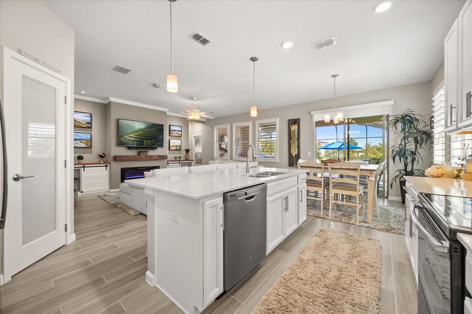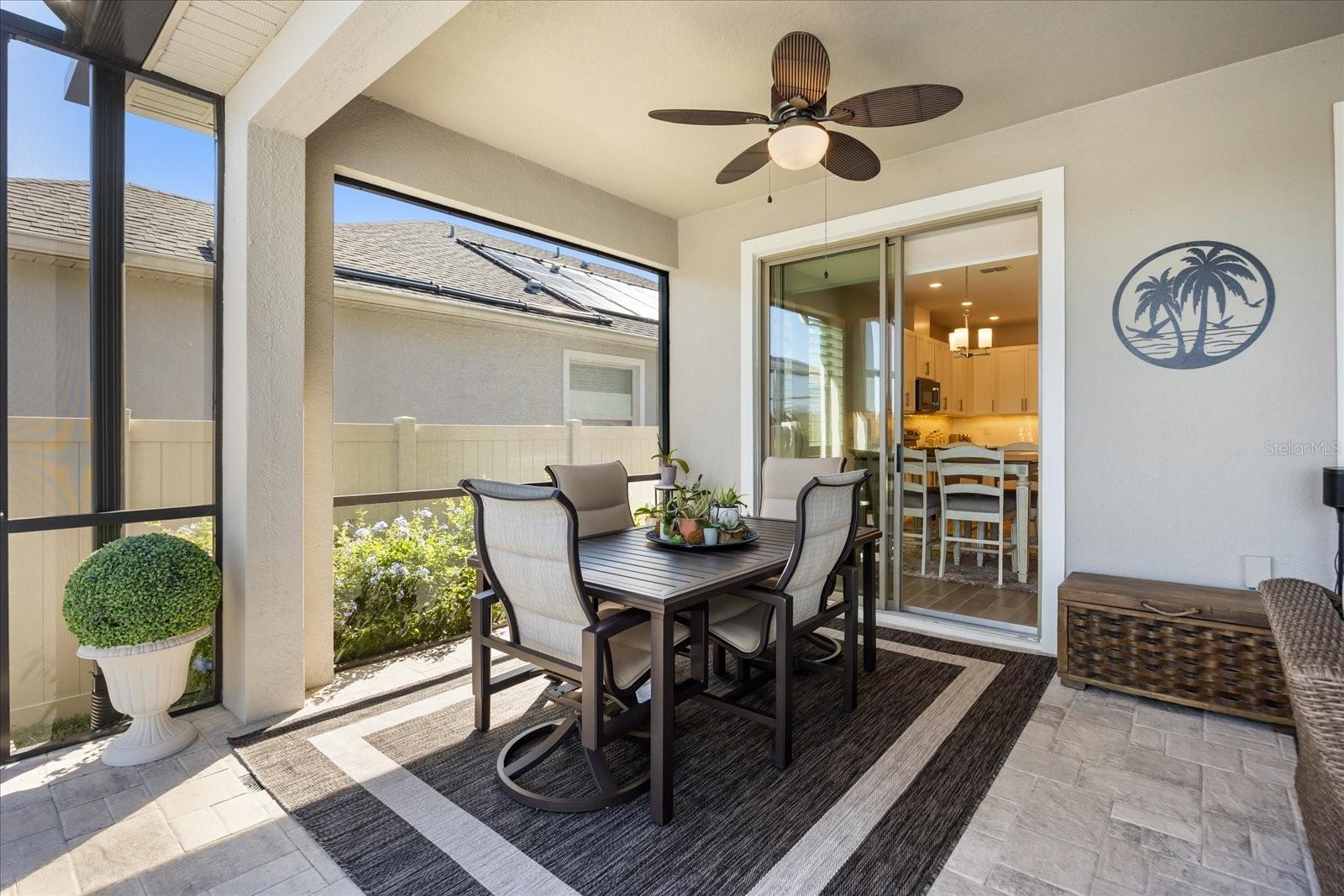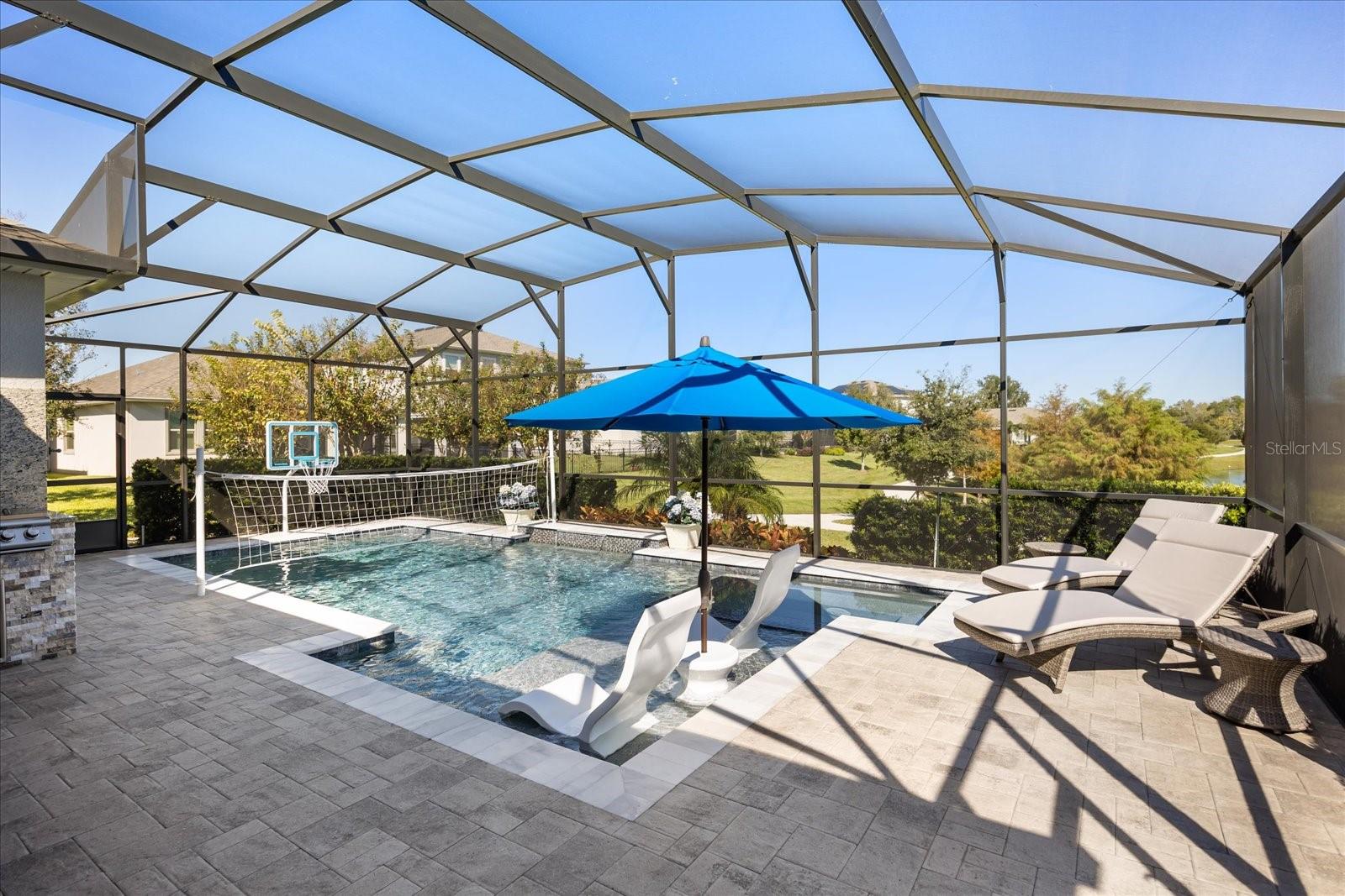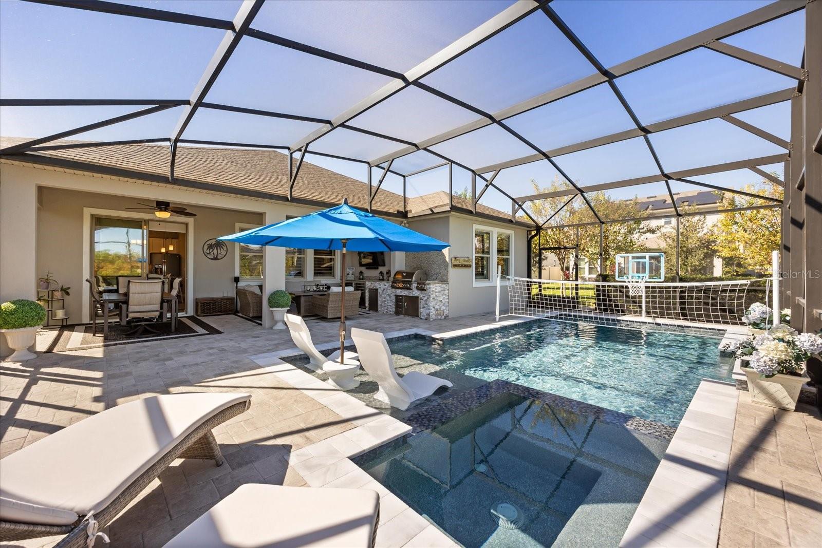 Welcome to your dream home! This meticulously maintained residence boasts many updates that enhance both functionality and appeal, perfect for those who appreciate quality and style. The home features gorgeous curb appeal, enhanced by lush landscaping, wired landscape lighting, and serene pond views. A charming covered front porch greets you with elegant lighting and freshly cleaned and sealed paver stone flooring. The back porch has been extended and showcases a custom outdoor kitchen with beautiful granite counters, two refrigerators, and a premium Blaze stainless gas grill equipped with additional burners, a rotisserie, and ample lighting. The outdoor space is ideal for entertaining, overlooking a screened, saltwater sports pool complete with a volleyball and basketball hoop, a sandbar area, and a heated spa. This property includes a fully paid-off solar panel system, resulting in an incredibly low electric bill of $48/month, contributing to both savings and environmental sustainability. Additionally, the home is equipped with an active termite bond from Massey and Rampart security system for your peace of mind. Step inside to discover a beautifully appointed interior featuring wood tile flooring throughout, eliminating the need for carpet. The neutral paint creates a calm ambiance complemented by recessed lighting and plantation shutters throughout. The primary bedroom is spacious with a tray ceiling, leading to a luxurious En Suite featuring double vanities with white quartz counters, solid wood cabinets, a private water closet, a tiled shower with a frameless glass enclosure, a soaking tub, and an expansive walk-in closet. The kitchen is a chef’s delight with black GE stainless appliances, a hooded microwave, 42" solid wood cabinets, white quarts countertops, a subway backsplash, under-counter lighting, and a stylish frosted glass pantry door. The living room features elegant crown molding, custom cabinetry with barn doors, and an electric fireplace complete with a wood mantel — perfect for cozy evenings. There's updated lighting and Dan fans throughout home too. This split floor plan includes four thoughtfully designed bedrooms, with custom closet systems in every room. Bedroom two is currently set up with custom wood office furniture that can be removed if desired. The laundry room offers convenience with a tabletop for folding, cabinets for storage, and a hanging area for garments. The garage enhances functionality with epoxy flooring, built-in cabinets, a Craftsman tool box, hanging shelving, a Westinghouse 7500 dual fuel generator with a plug, and a smart garage door opener. A small fenced area on the side of the home houses a shed for lawn equipment and hidden pool equipment, making this home a perfect blend of beauty, practicality, and comfort. This home is a rare find that combines luxury, modern amenities, and a stunning outdoor living experience. Don’t miss out on this opportunity to make this exquisite property your own! All you need to do is hire the movers!!