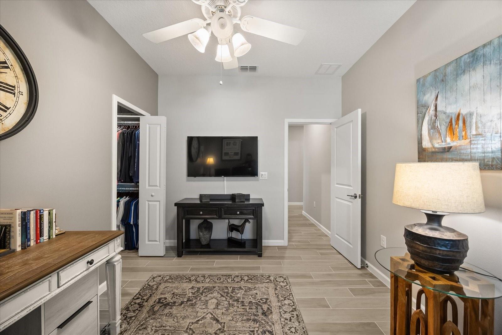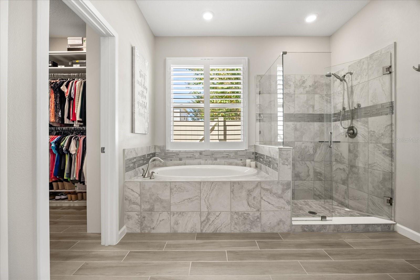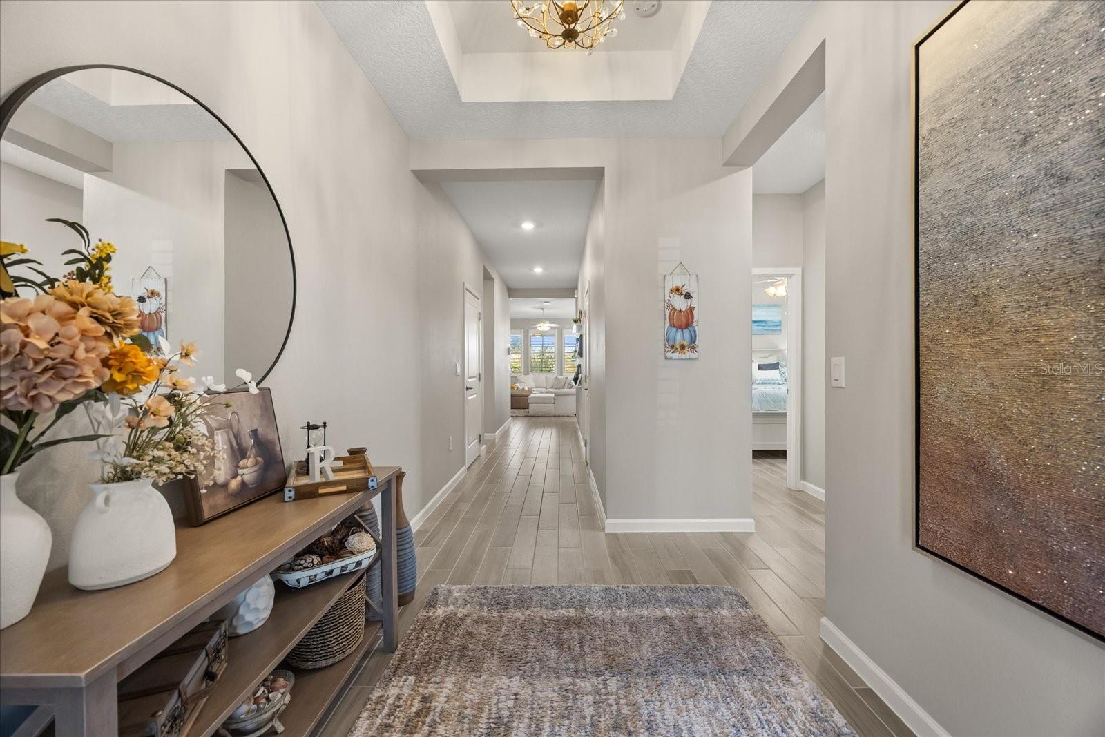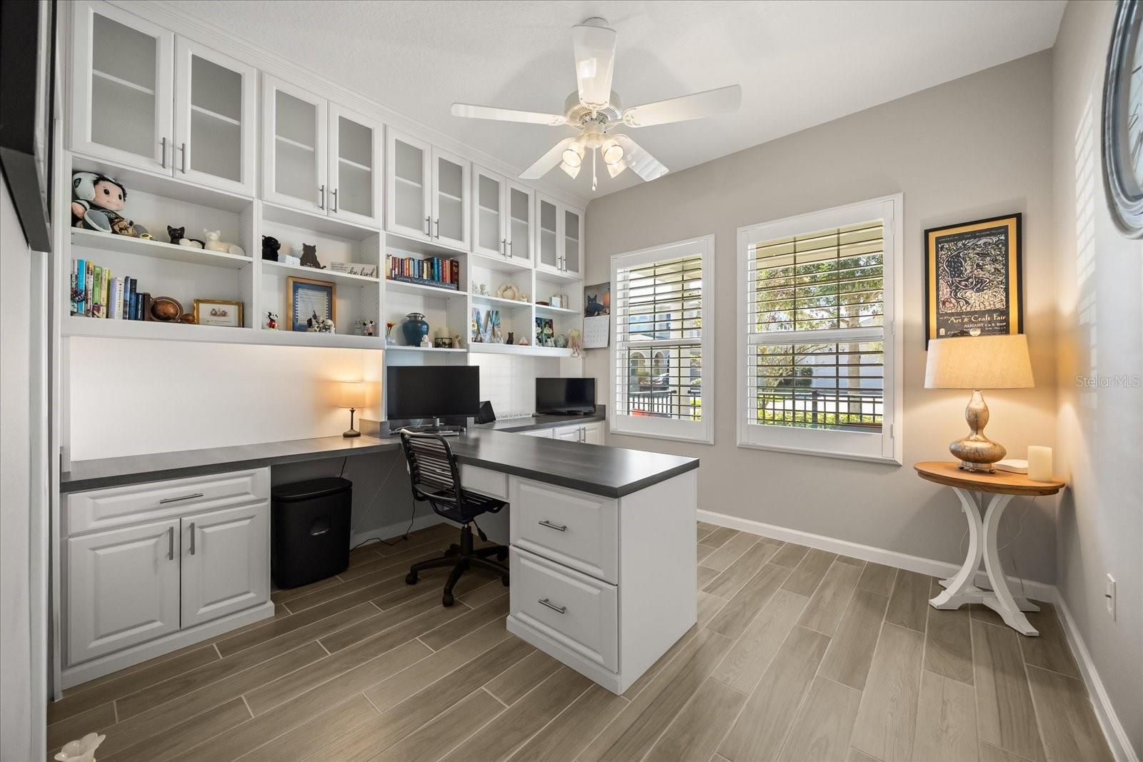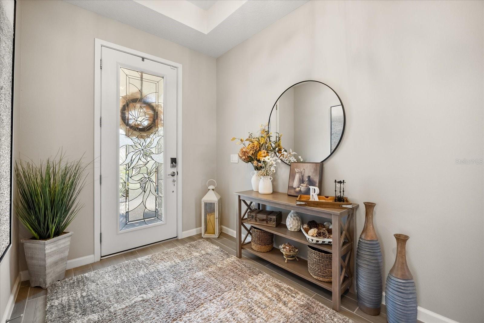 Welcome to your dream home! This meticulously maintained residence boasts many updates that enhance both functionality and appeal, perfect for those who appreciate quality and style. The home features gorgeous curb appeal, enhanced by lush landscaping, wired landscape lighting, and serene pond views. A charming covered front porch greets you with elegant lighting and freshly cleaned and sealed paver stone flooring. The back porch has been extended and showcases a custom outdoor kitchen with beautiful granite counters, two refrigerators, and a premium Blaze stainless gas grill equipped with additional burners, a rotisserie, and ample lighting. The outdoor space is ideal for entertaining, overlooking a screened, saltwater sports pool complete with a volleyball and basketball hoop, a sandbar area, and a heated spa. This property includes a fully paid-off solar panel system, resulting in an incredibly low electric bill of $48/month, contributing to both savings and environmental sustainability. Additionally, the home is equipped with an active termite bond from Massey and Rampart security system for your peace of mind. Step inside to discover a beautifully appointed interior featuring wood tile flooring throughout, eliminating the need for carpet. The neutral paint creates a calm ambiance complemented by recessed lighting and plantation shutters throughout. The primary bedroom is spacious with a tray ceiling, leading to a luxurious En Suite featuring double vanities with white quartz counters, solid wood cabinets, a private water closet, a tiled shower with a frameless glass enclosure, a soaking tub, and an expansive walk-in closet. The kitchen is a chef’s delight with black GE stainless appliances, a hooded microwave, 42" solid wood cabinets, white quarts countertops, a subway backsplash, under-counter lighting, and a stylish frosted glass pantry door. The living room features elegant crown molding, custom cabinetry with barn doors, and an electric fireplace complete with a wood mantel — perfect for cozy evenings. There's updated lighting and Dan fans throughout home too. This split floor plan includes four thoughtfully designed bedrooms, with custom closet systems in every room. Bedroom two is currently set up with custom wood office furniture that can be removed if desired. The laundry room offers convenience with a tabletop for folding, cabinets for storage, and a hanging area for garments. The garage enhances functionality with epoxy flooring, built-in cabinets, a Craftsman tool box, hanging shelving, a Westinghouse 7500 dual fuel generator with a plug, and a smart garage door opener. A small fenced area on the side of the home houses a shed for lawn equipment and hidden pool equipment, making this home a perfect blend of beauty, practicality, and comfort. This home is a rare find that combines luxury, modern amenities, and a stunning outdoor living experience. Don’t miss out on this opportunity to make this exquisite property your own! All you need to do is hire the movers!!