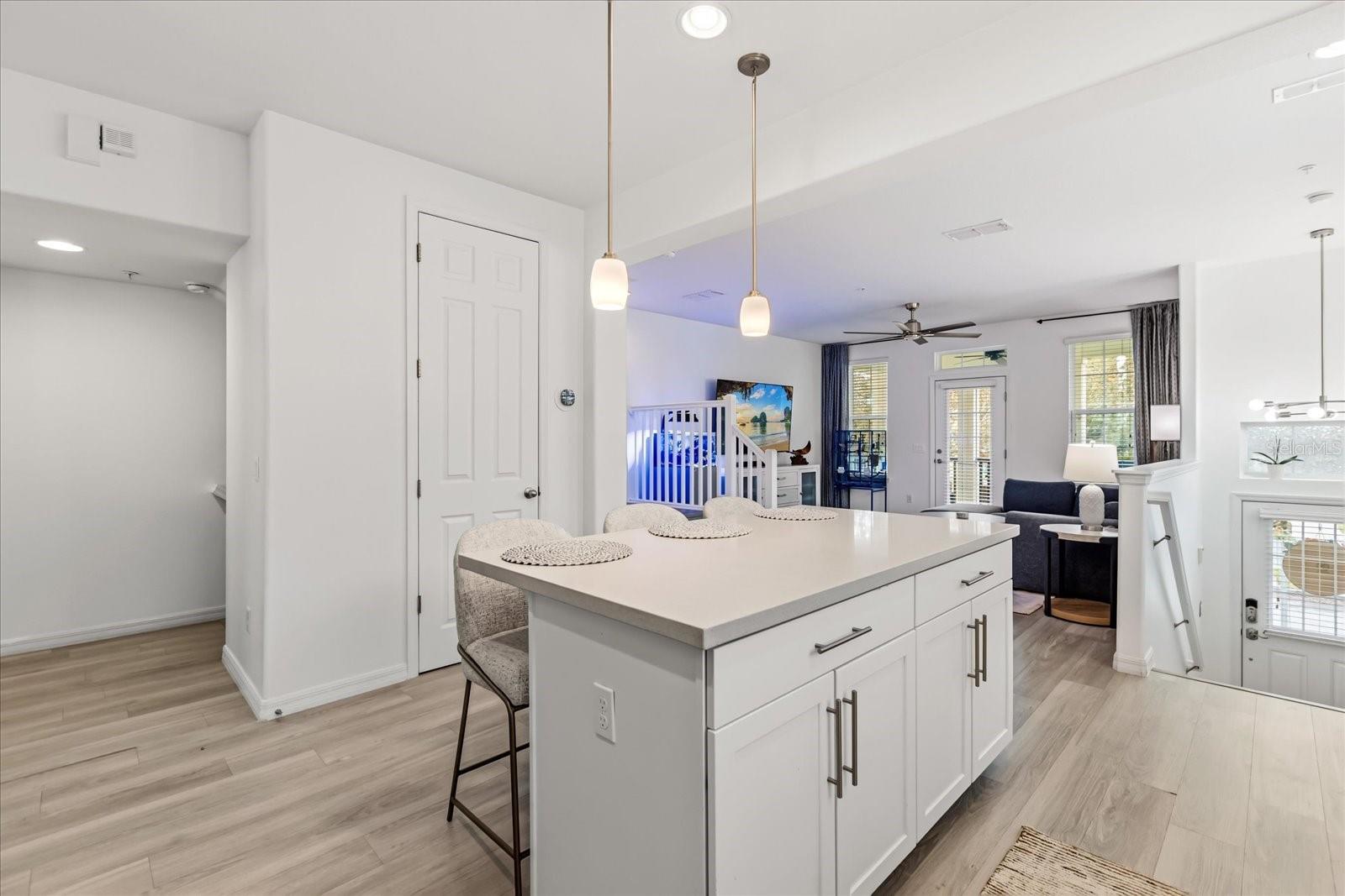 Welcome home to a beautifully updated and well maintained home in the Jesups Landing community of Winter Springs. Located in a highly desirable part of a vibrant community, and close to shopping, dining, major roads and highways, all while feeling remote enough to truly enjoy a virtually maintenance free lifestyle! Offering 4 bedrooms and 3.5 baths, this end unit tri-level townhome has a stately private entrance, lots of living space including a grand kitchen with large island and breakfast bar, quartz countertops, a large pantry, generous living space and a beautiful formal dining area. A half bath on the main living level offers added convenience. This home has THREE private porches/patios - two on the main living level, one is accessible from the living room, one off the dining room and a large covered patio on the first level offering a private entry - perfect for a home office, guests or in-laws! Newer laminate flooring added in 2022 throughout the main living areas and lower level bedroom including stairs. ALL 3.5 bathrooms have been updated with beautiful, custom designs and finishes. The primary bedroom has barn door access to the en suite bath - a decorative and functional space saving solution! Thoughtfully designed with a 2-car garage and mudroom/bag drop just inside! Just a block from the waterfront community pool, clubhouse and fitness center. You will absolutely love living in this lovely community, tucked away from the hustle and bustle while being minutes to everyday conveniences. The Seminole trail is just around the corner, perfect for the biking and fitness enthusiast! A clean, modern, bright, updated home ready for you to move right in!