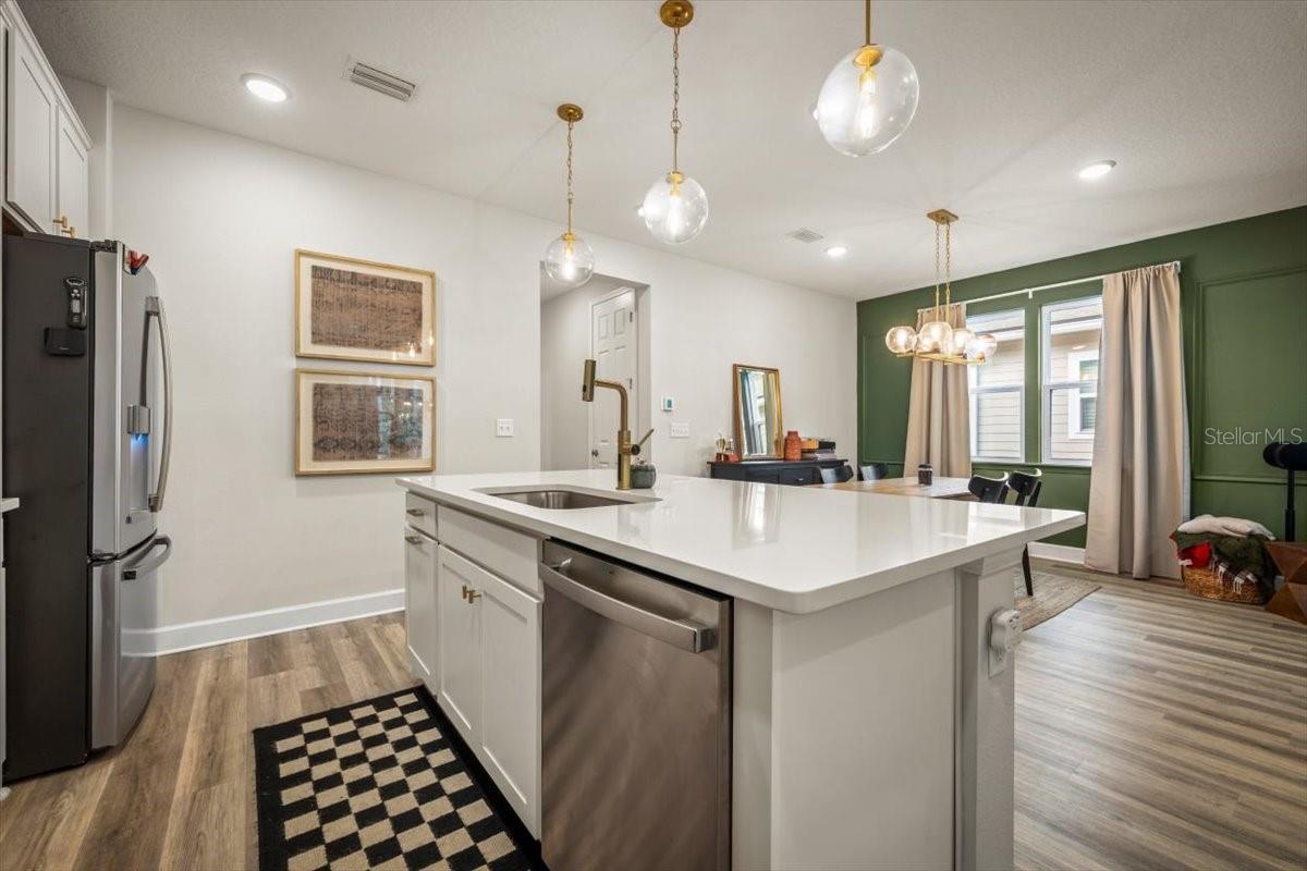 Look no further! Why wait for new construction? Curb appeal galore in this lovely Richmond Atlantic Larimar home in Tributary. The home features 1,878 sq. ft., 4 bedroom/3 full bathrooms and an attached 2-car garage. The open and light-filled living area beautifully combines a gourmet kitchen and great room with views of the conservation area and fully fenced backyard through the sliding doors. Three-way split bedroom plan allows for plenty of privacy. The gourmet cook's kitchen features 42 inch soft close cabinets, dovetail drawers, a five burner gas range with griddle, quartz countertops, large center island, tile backsplash, stainless appliances and a spacious walk in pantry. Luxury vinyl plank floors run throughout much of the home's living spaces. Primary bedroom features a spa like bathroom with double vanity, large stall shower, beautiful decorative tile and large walk-in closet. The 4th bedroom features a large ensuite bathroom. Updated lighting and ceiling fans as well as all appliances stay with the home. Covered lanai allows for outdoor entertaining while enjoying the beautiful conservation area behind the property. Nicely landscaped. Tributary is an impressive new home community near Wildlight. Amenities include a state of the art fitness center, club house, pool, pickle ball , playground and two dog parks. It is a short distance to all of the Jacksonville area's many attractions; Atlantic beaches, boating, local shopping, restaurants and Interstate-95 and Amelia Island. A great commute to points north and south. Make this beautiful home your own! CDD included in total tax amount.