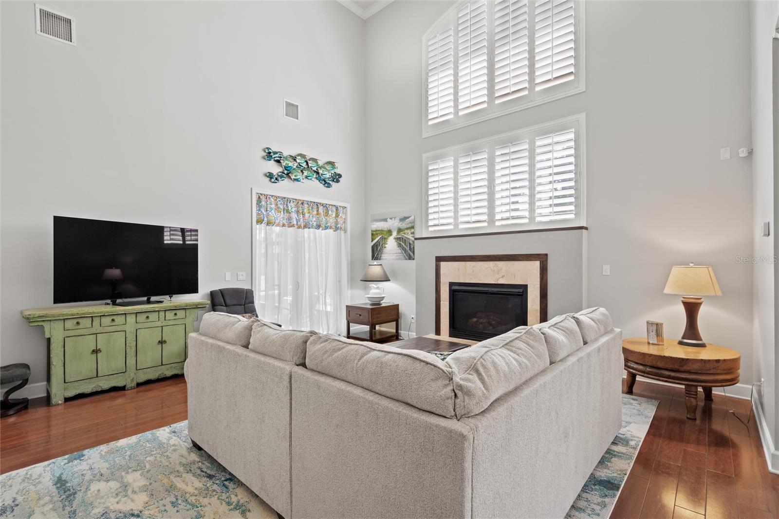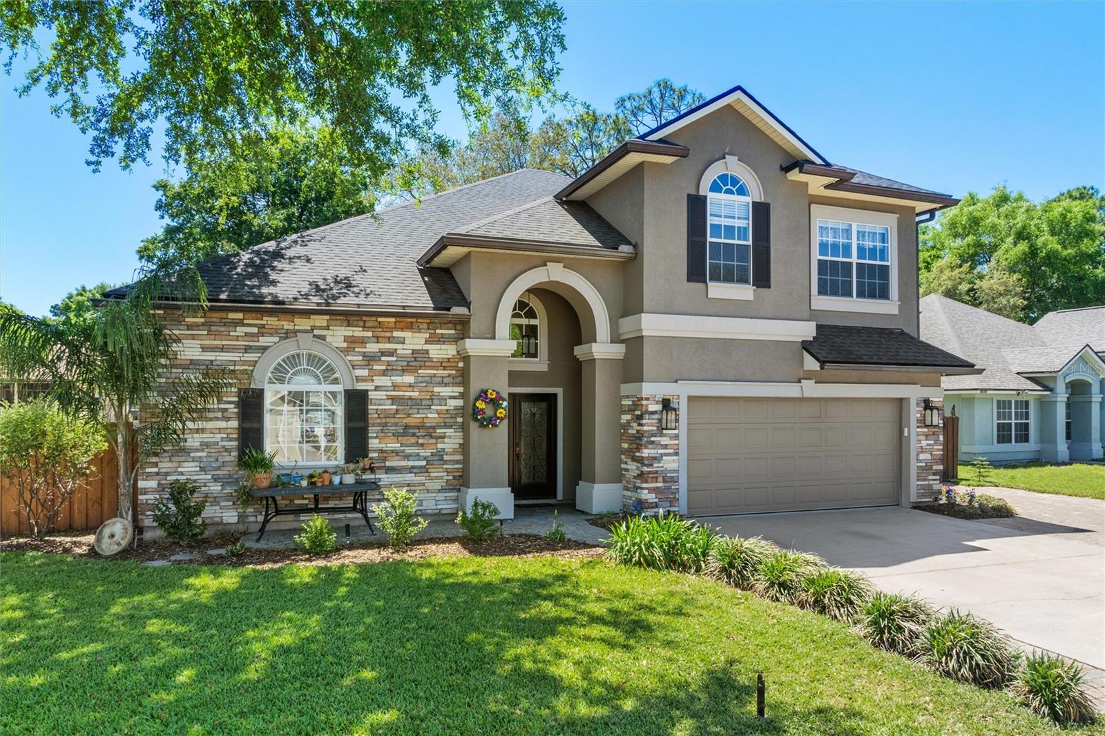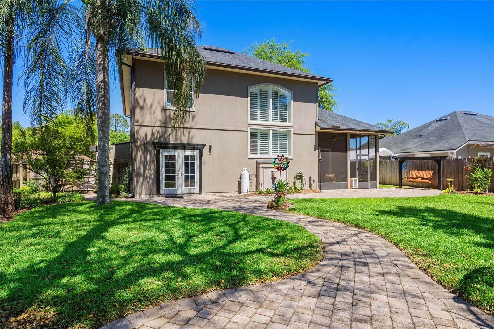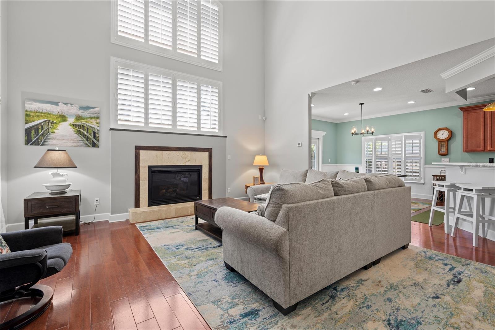 This beautifully updated and immaculately kept 4-bedroom and 2½ bath home with a large, private, fenced back yard in a quiet community less than a mile from shopping, restaurants, and the local high school, is now available. As you enter this gorgeous home, the soaring, 20-foot-tall ceilings of the main living area, cherry hardwood flooring, and crown molding that flows throughout will captivate you. The main living area boasts a gas fireplace and an abundance of natural lighting that permeates the area through the plantation shutters and is comfortably adjacent to the screened rear lanai on one end, and to the dining area and kitchen on the other. The spacious kitchen features quartz countertops, recessed & pendant lighting, a reach-in pantry, a breakfast bar, all stainless-steel appliances-including the oven with convection/ air fryer/grill settings, and is adjacent to the garage, so bringing in those groceries is a breeze! The first floor 16’ X 14’ primary bedroom suite features beautiful luxury vinyl plank flooring, 10’ ceilings, private access to the screened rear lanai, and a walk-in closet. The bright ensuite bath boasts dual decorative sinks in the newer vanity, a jetted garden tub, beautiful custom tiled walk-in shower with dual heads, and a water closet. The other three bedrooms are all large, and all include walk-in closets. The 15’ X 9’ screened lanai is the perfect place to relax while watching the hummingbirds sip nectar in the beautifully landscaped the back yard or enjoy your morning coffee. The fully fenced private backyard includes raised garden beds, citrus trees, numerous fragrant jasmine vines, an outdoor fire ring, and a garden shed for your toys and tools. The new in 2023, washer and dryer stay with your new home and the HOA is just $302/year. Additional features include newer roof (2021), AC compressor (2020), and new in 2023 dishwasher and refrigerator, plantation shutters throughout, the Murphy bed in the upstairs bedroom and the wall safe both convey, security system, 3-zone programmable thermostats, upgraded bathroom vanities with decorative sinks, 5-zone irrigation system, additional paver-lined parking area, and a utility sink and salt-free water softener in the garage (Whew-that’s a LOT!). Enjoy Amelia Island, the beaches or get to Jacksonville’s airport in under 30 minutes. Ask your Realtor® for the virtual walking tour of this home. All measurements are approximate and should be independently verified.