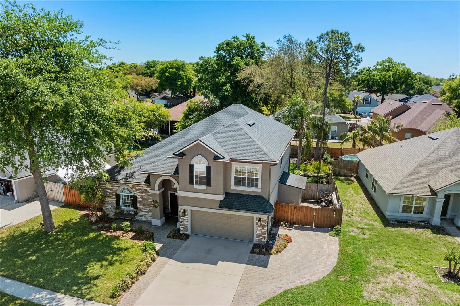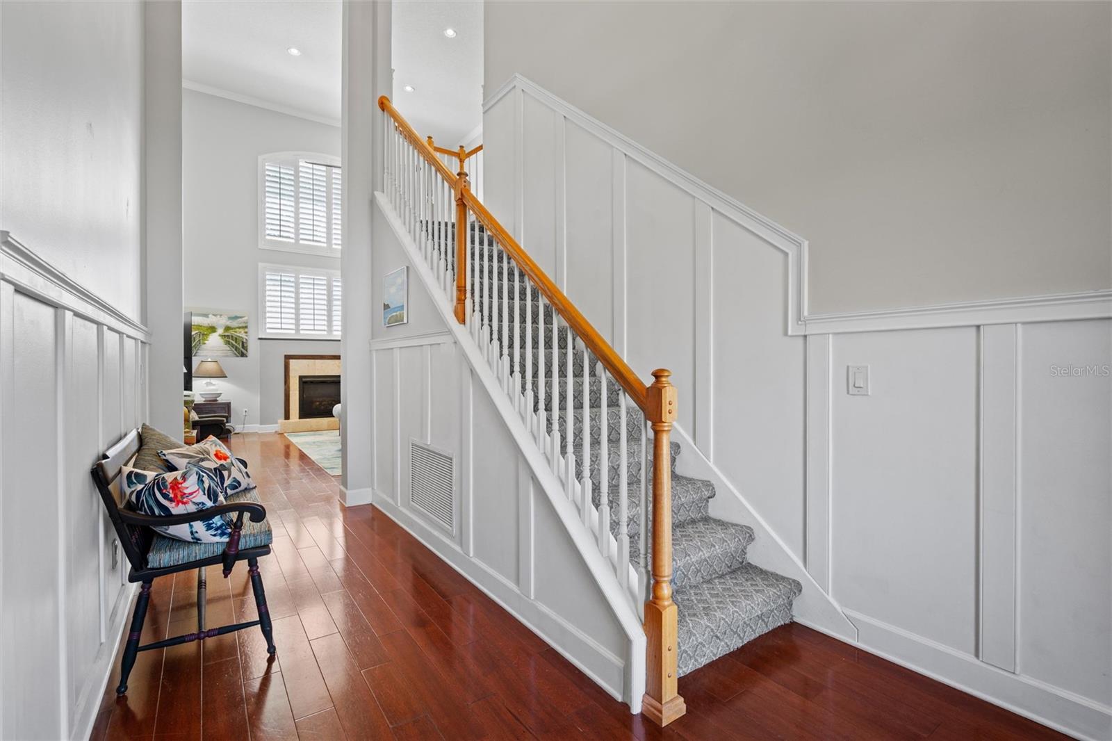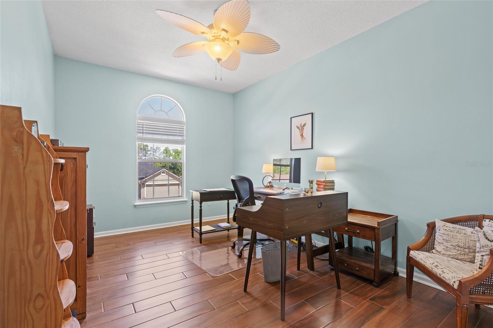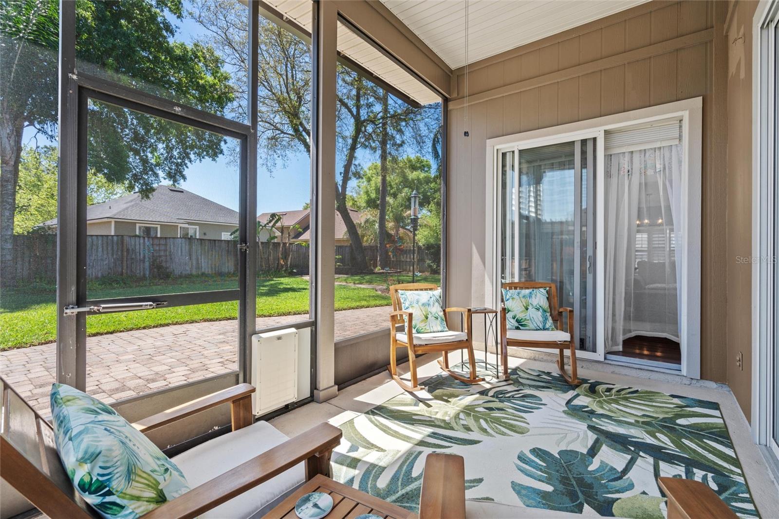 This beautifully updated and immaculately kept 4-bedroom and 2½ bath home with a large, private, fenced back yard in a quiet community less than a mile from shopping, restaurants, and the local high school, is now available. As you enter this gorgeous home, the soaring, 20-foot-tall ceilings of the main living area, cherry hardwood flooring, and crown molding that flows throughout will captivate you. The main living area boasts a gas fireplace and an abundance of natural lighting that permeates the area through the plantation shutters and is comfortably adjacent to the screened rear lanai on one end, and to the dining area and kitchen on the other. The spacious kitchen features quartz countertops, recessed & pendant lighting, a reach-in pantry, a breakfast bar, all stainless-steel appliances-including the oven with convection/ air fryer/grill settings, and is adjacent to the garage, so bringing in those groceries is a breeze! The first floor 16’ X 14’ primary bedroom suite features beautiful luxury vinyl plank flooring, 10’ ceilings, private access to the screened rear lanai, and a walk-in closet. The bright ensuite bath boasts dual decorative sinks in the newer vanity, a jetted garden tub, beautiful custom tiled walk-in shower with dual heads, and a water closet. The other three bedrooms are all large, and all include walk-in closets. The 15’ X 9’ screened lanai is the perfect place to relax while watching the hummingbirds sip nectar in the beautifully landscaped the back yard or enjoy your morning coffee. The fully fenced private backyard includes raised garden beds, citrus trees, numerous fragrant jasmine vines, an outdoor fire ring, and a garden shed for your toys and tools. The new in 2023, washer and dryer stay with your new home and the HOA is just $302/year. Additional features include newer roof (2021), AC compressor (2020), and new in 2023 dishwasher and refrigerator, plantation shutters throughout, the Murphy bed in the upstairs bedroom and the wall safe both convey, security system, 3-zone programmable thermostats, upgraded bathroom vanities with decorative sinks, 5-zone irrigation system, additional paver-lined parking area, and a utility sink and salt-free water softener in the garage (Whew-that’s a LOT!). Enjoy Amelia Island, the beaches or get to Jacksonville’s airport in under 30 minutes. Ask your Realtor® for the virtual walking tour of this home. All measurements are approximate and should be independently verified.