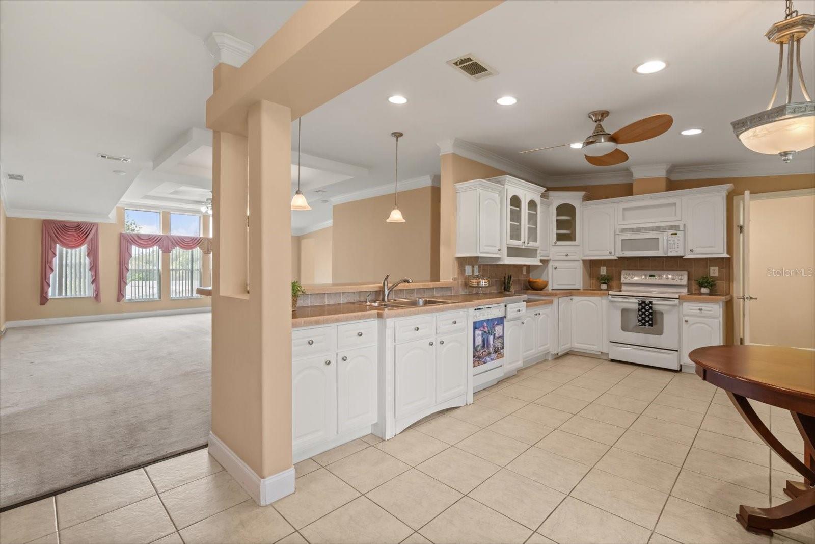 TRIPLE WIDE**NO STEPS**Walk-in Level with Sidewalk. SUBSTANTIAL PRICE IMPROVEMENT! 3/2 Split Plan on quiet cul-de-sac. Over 1900 sq feet of luxury with an enclosed Florida Room, inside laundry plus a spacious screened porch & Golf Cart Garage alongside Double Driveway with Covered Carport. NEW ROOF 1/14/2025, NEW A/C 2022. Coffered/Tray Ceilings in Main Living Area. Crown Molding. Oversized modern kitchen with tons of storage and counter space. Bright, open floorplan is perfect for large family gatherings. Primary suite has 2 large closets, double vanity, dressing area and walk-in shower. 2 guest bedrooms and a tub/shower guest bath. In addition to the Air Conditioned Florida Room, there is a Screened back porch to enjoy as well. Great views on a quiet street. Price has been adjusted below market value for a Triple Wide(will most likely need carpet replacement). Located in Prestigious 55+ Zellwood Golf Community. Reduced Greens fees for Owners.